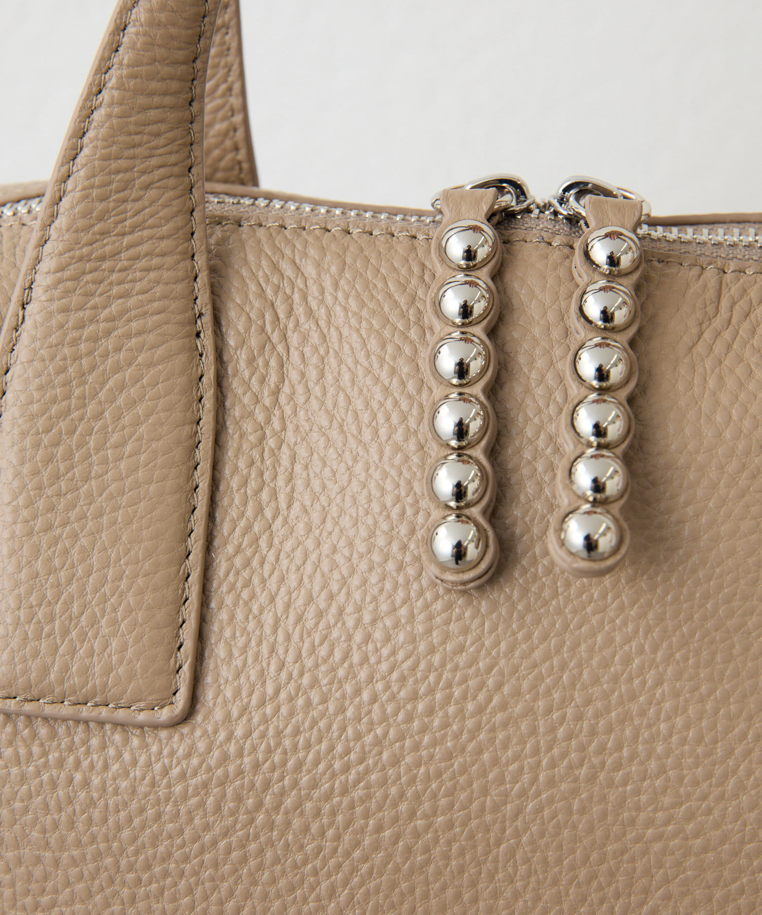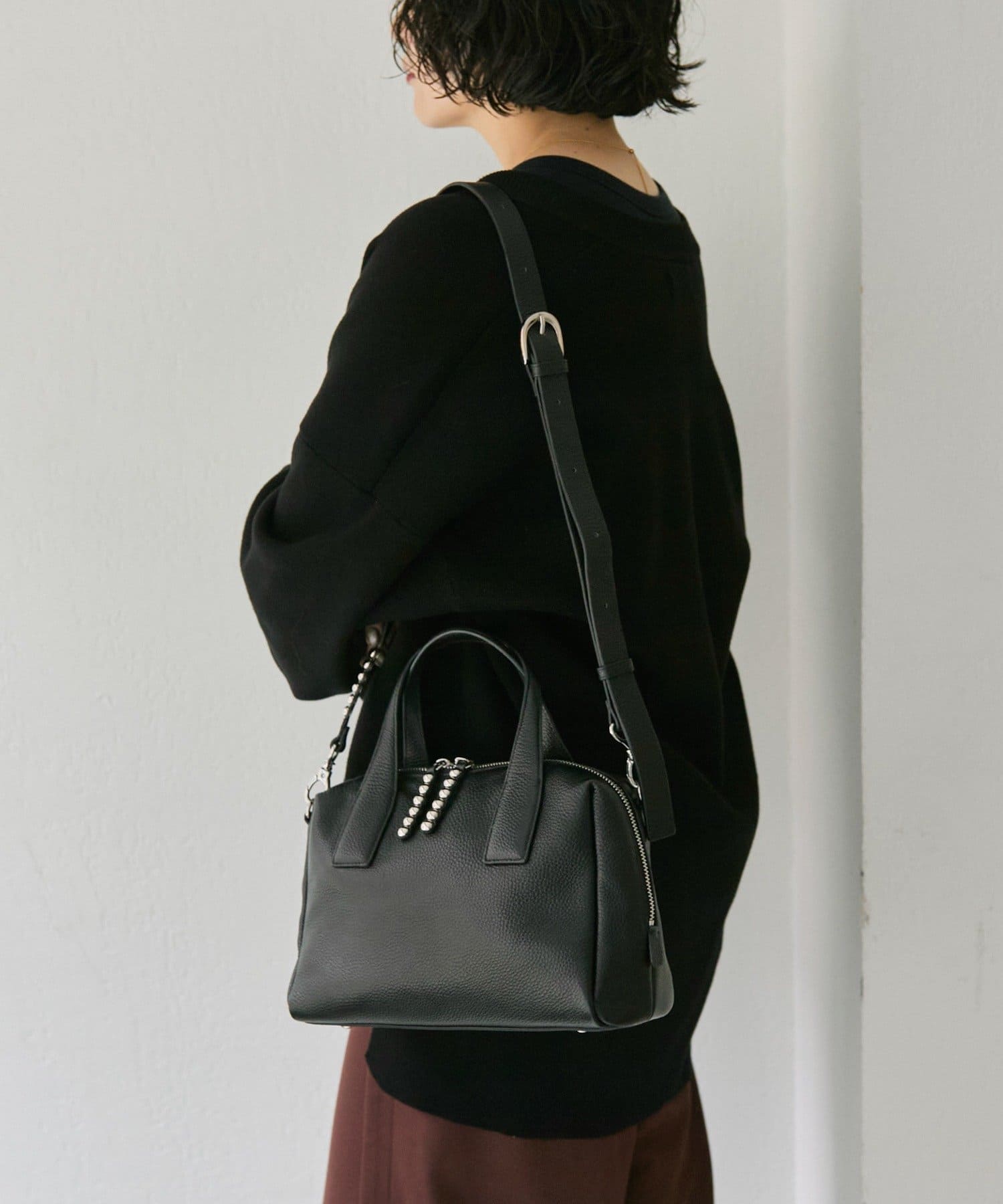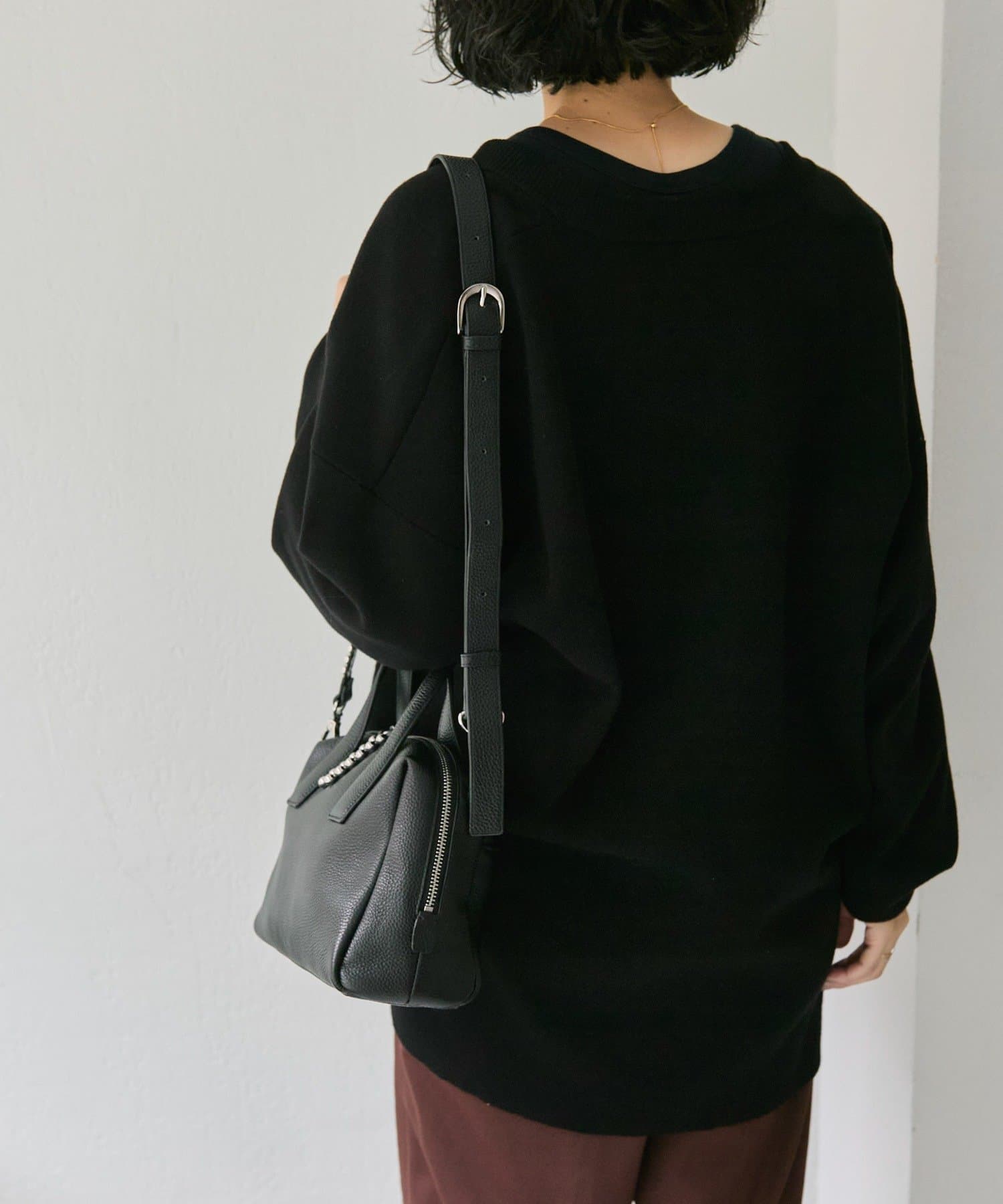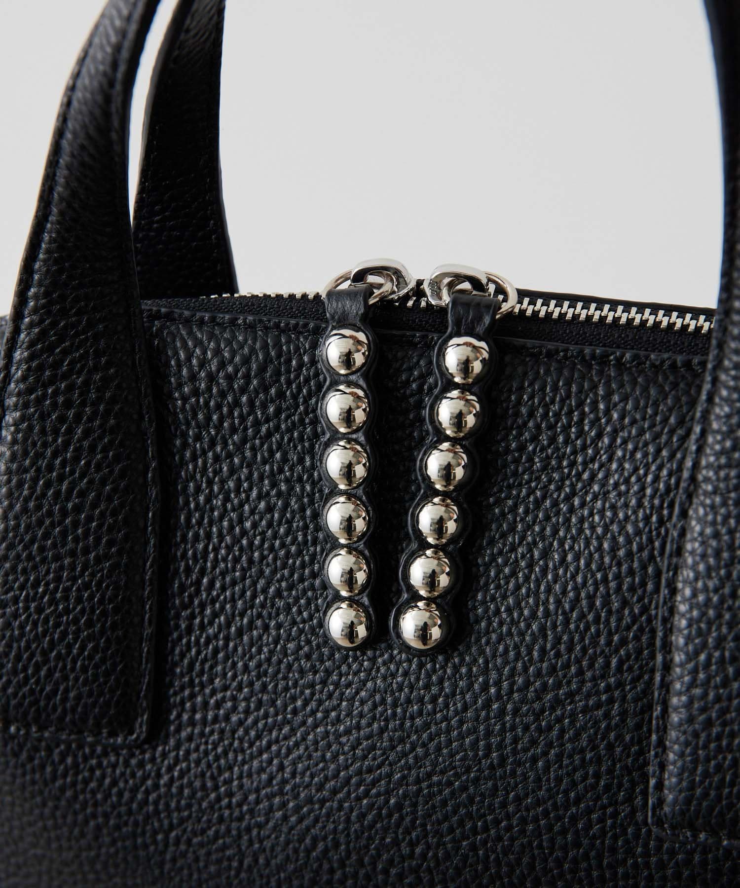 ・本体の引き手や付属のショルダーベルトに施されたスタッズパーツがポイント