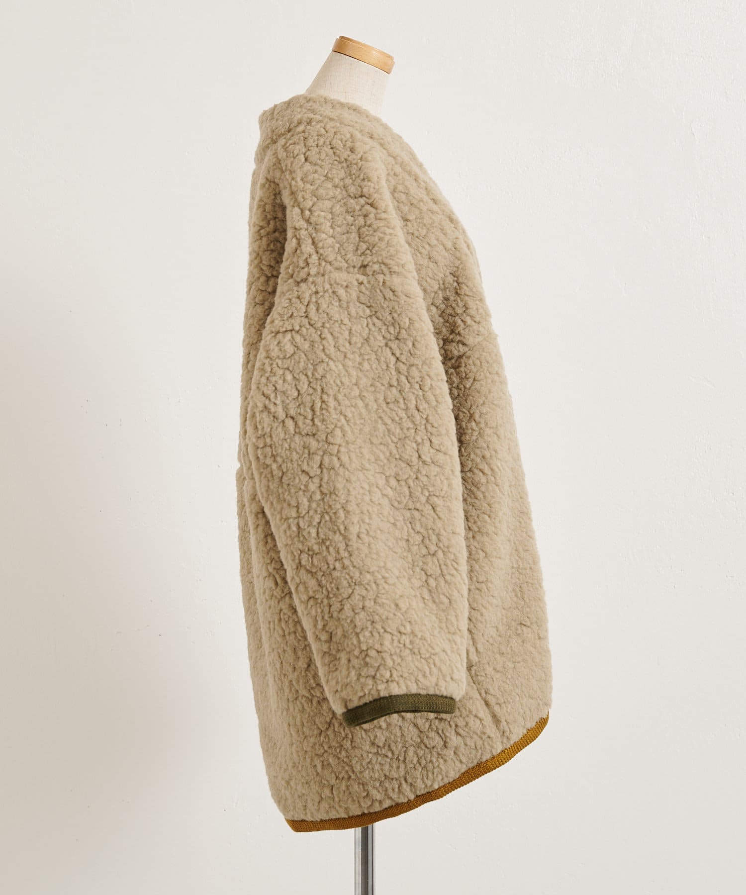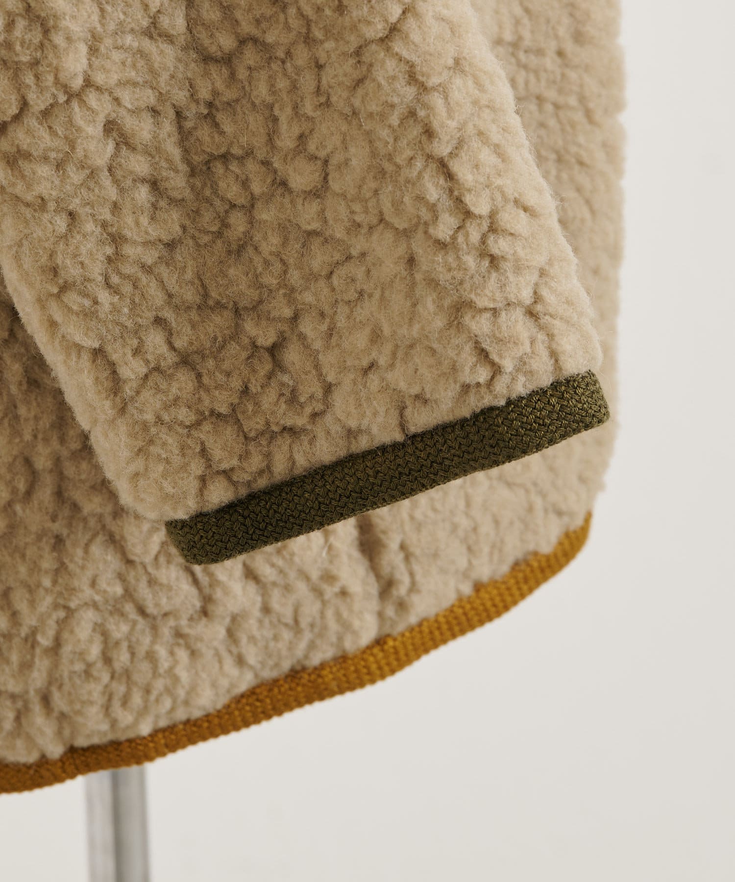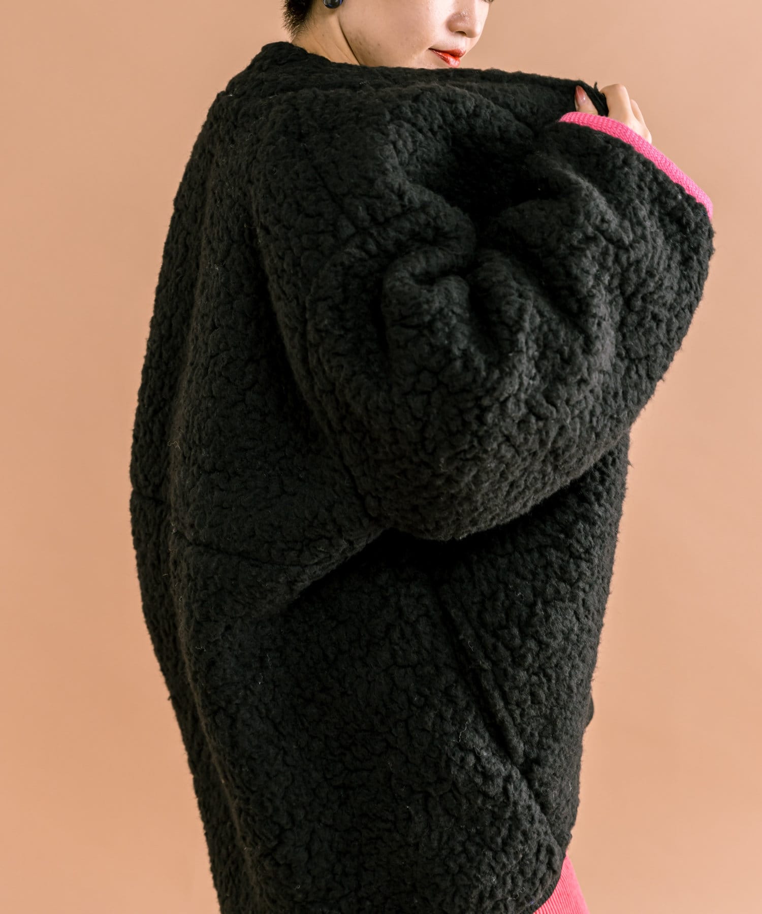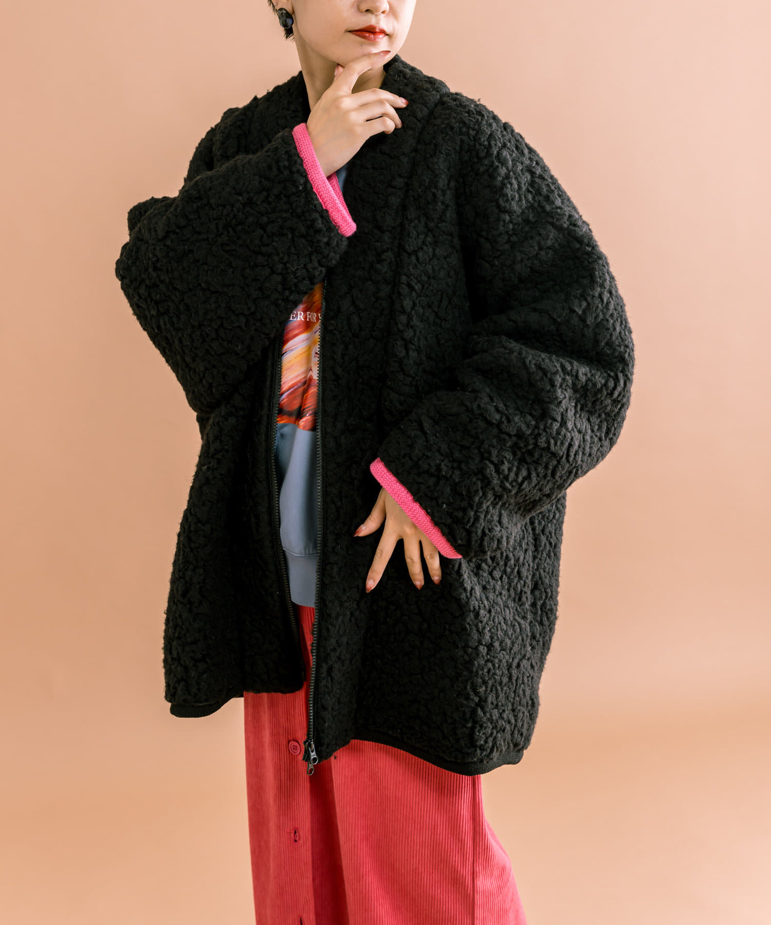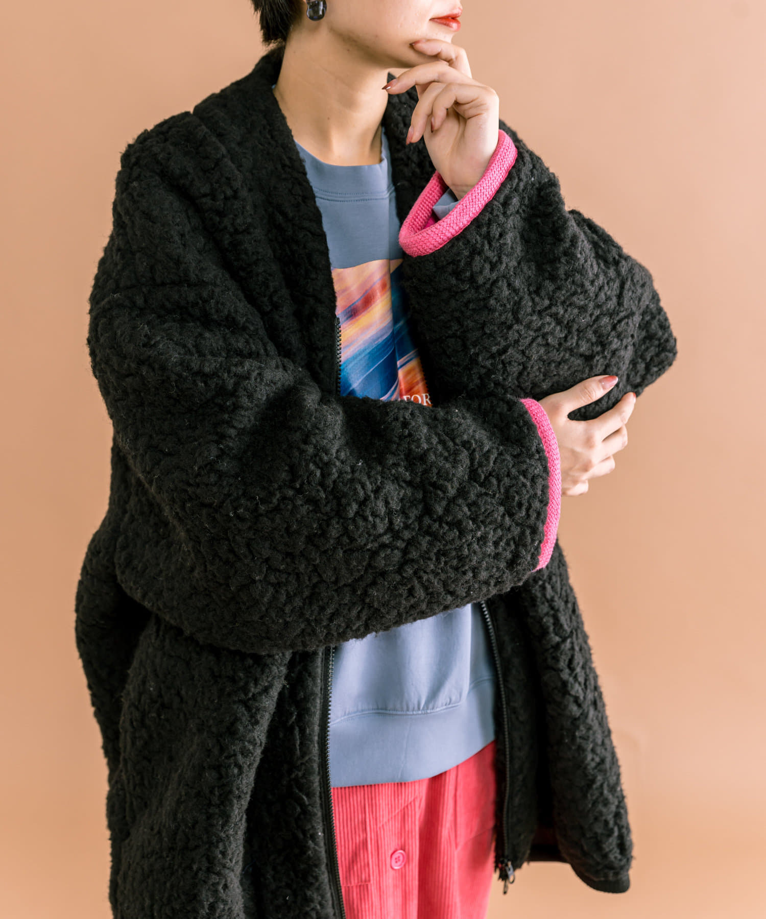 手元・裾部分にアクセントカラーが縁どられている冬らしいヴィンテージ風ボアアウター。