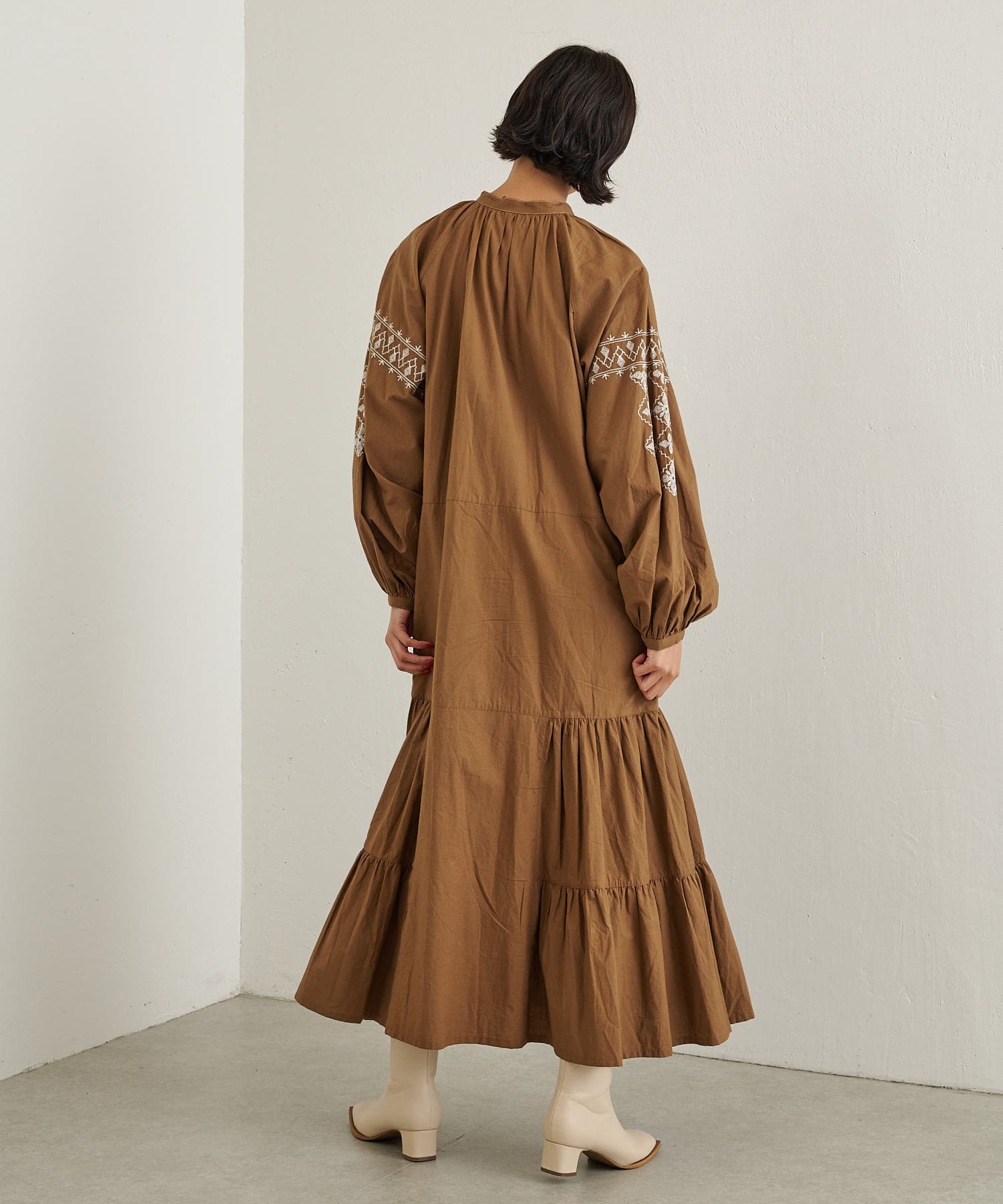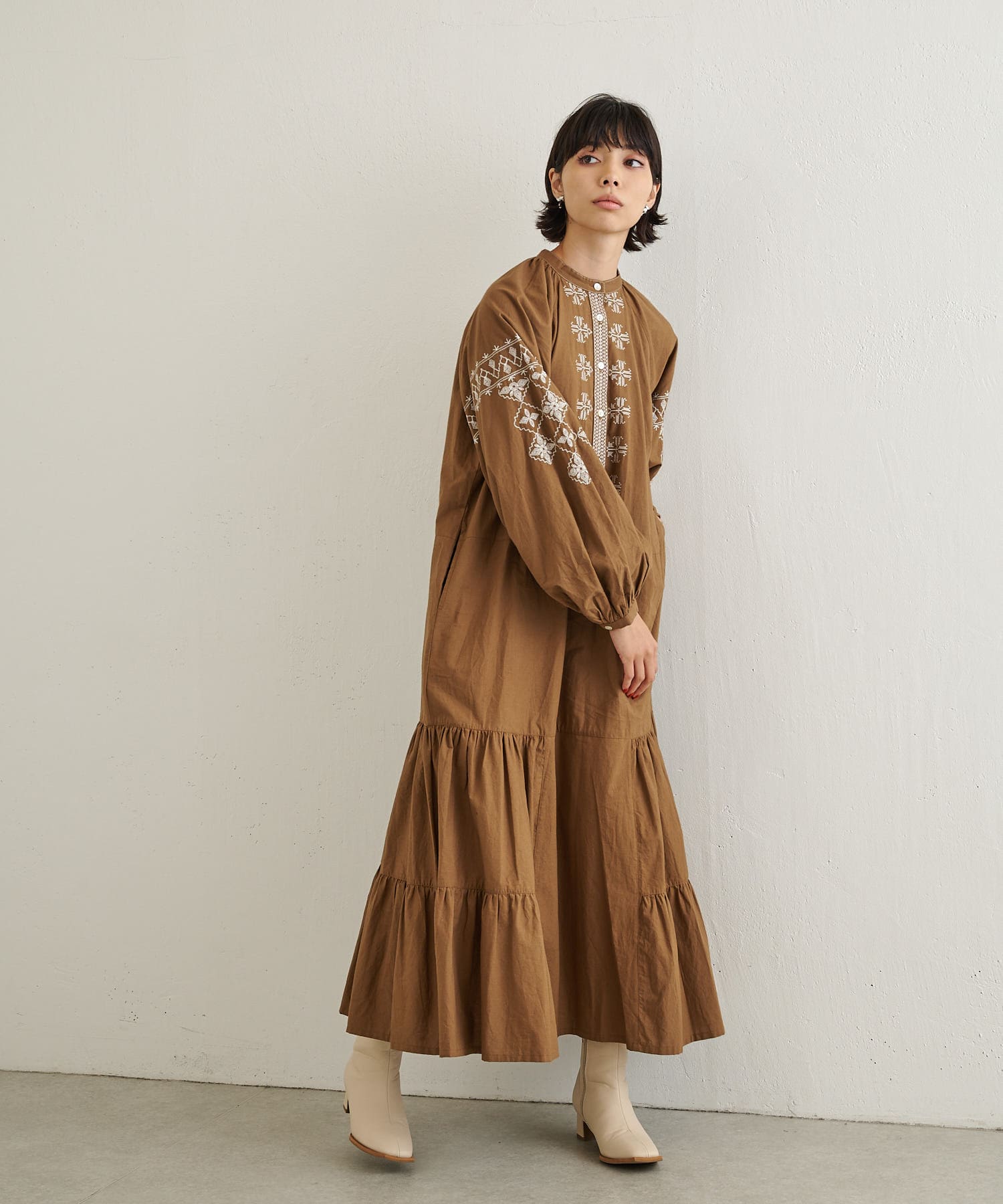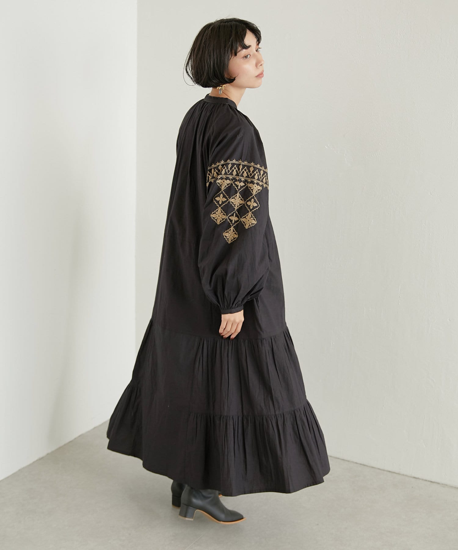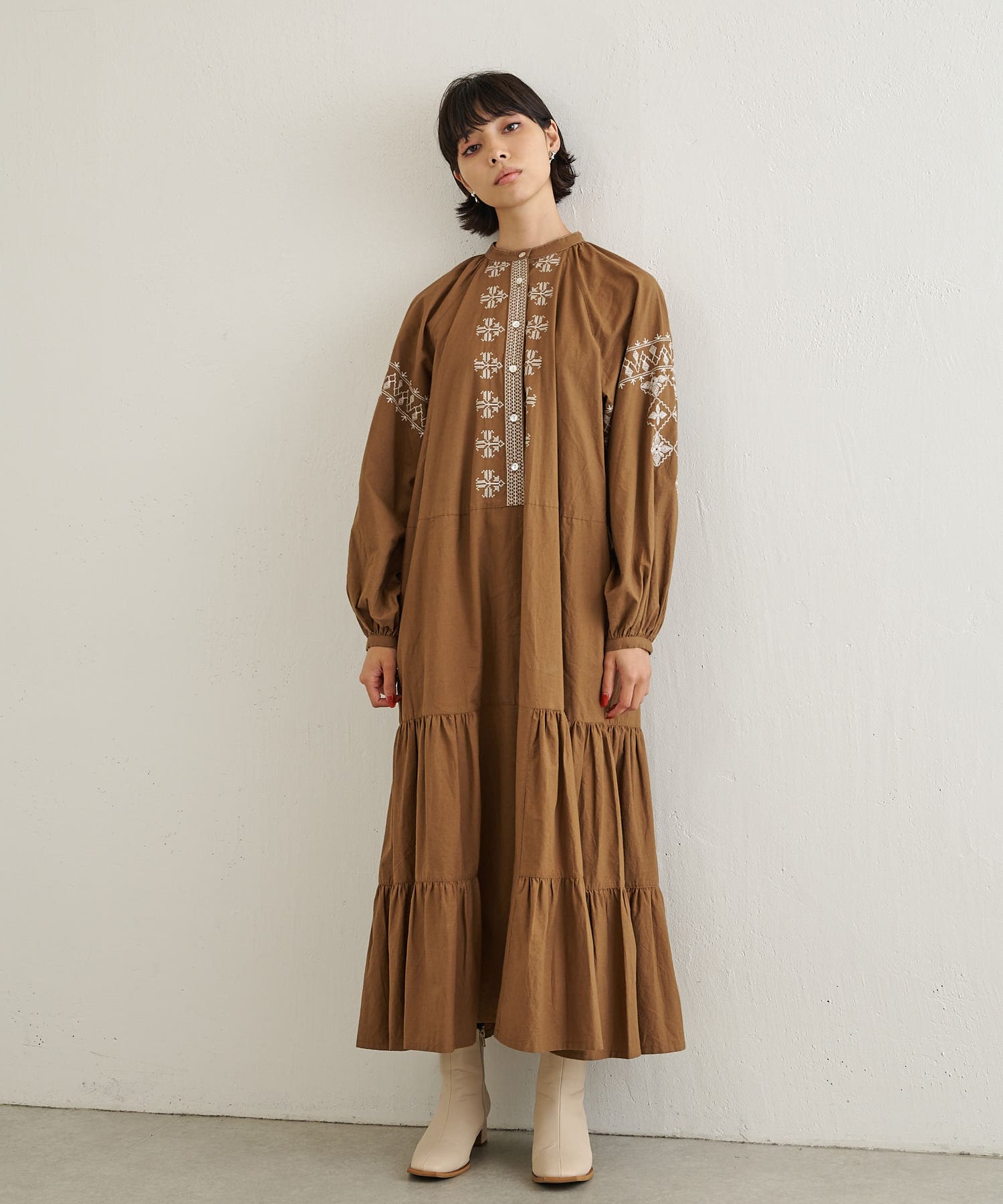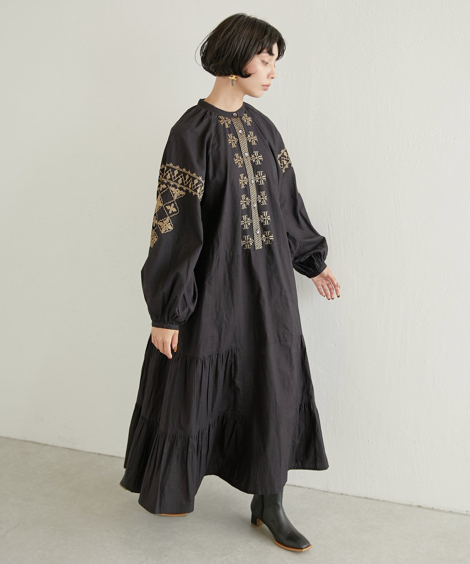 センターと袖回りに細やかな刺繍が施されたおしゃれなロングワンピース。
