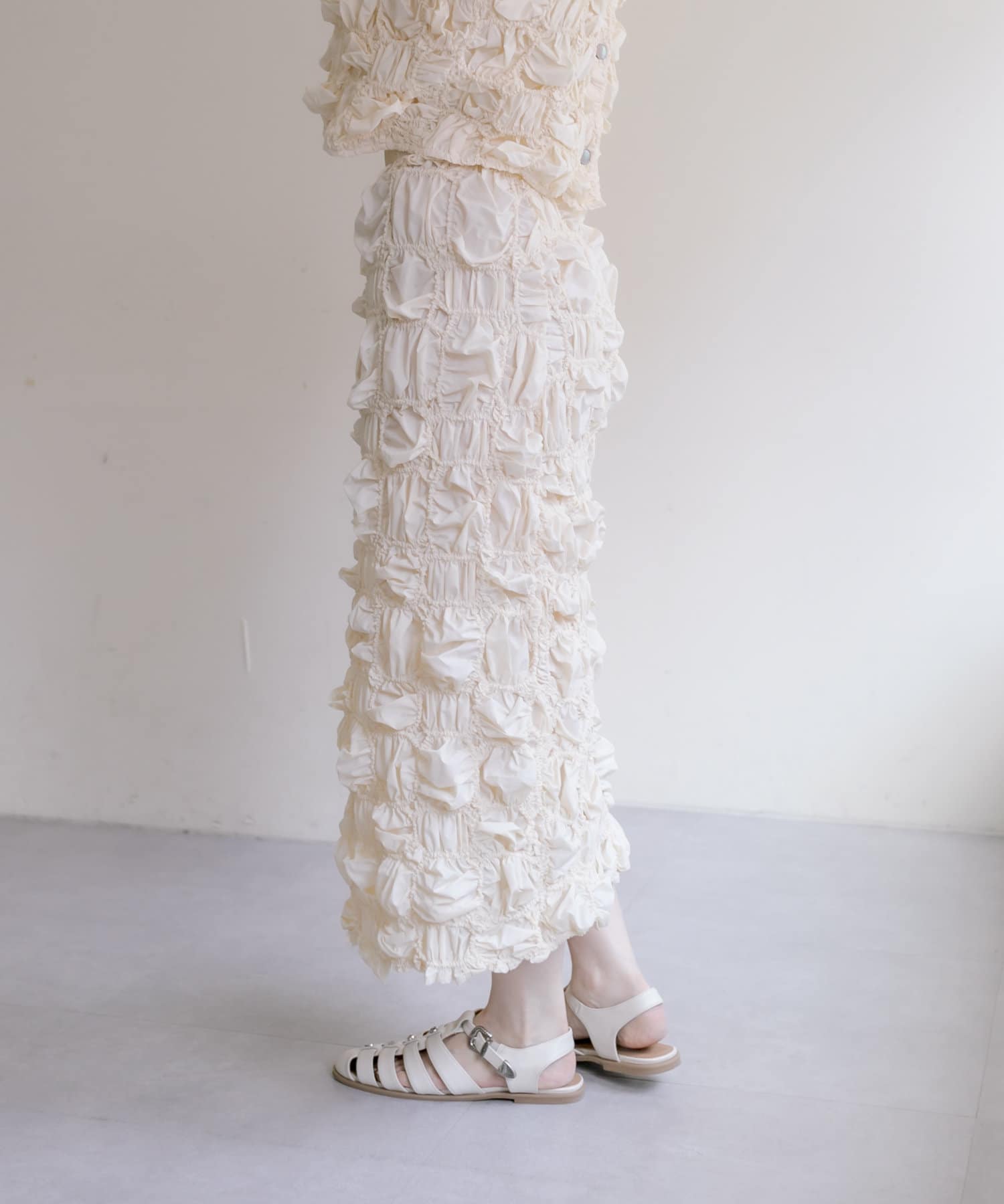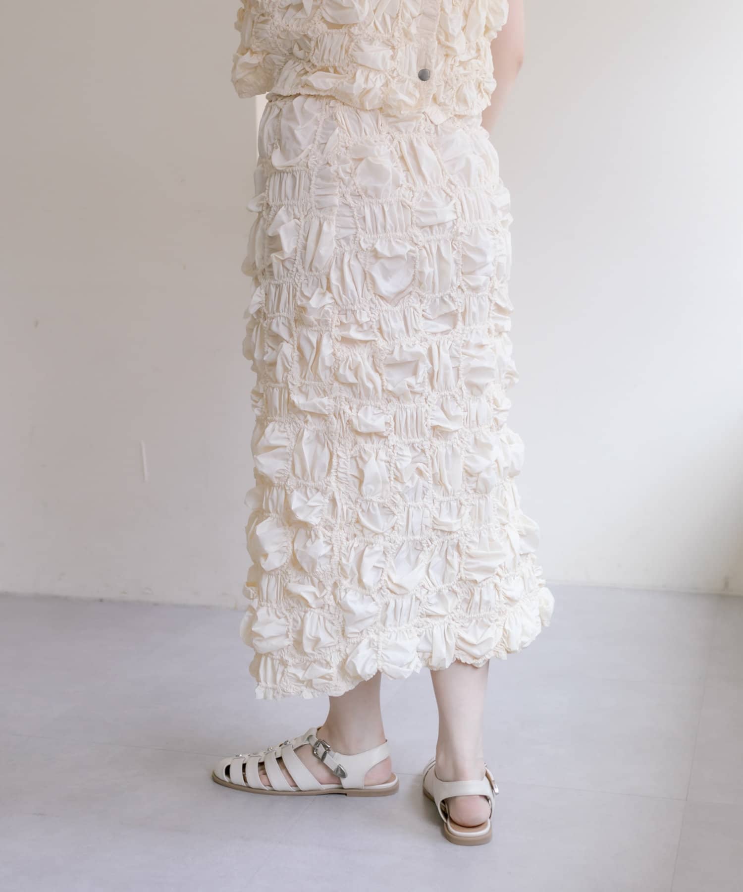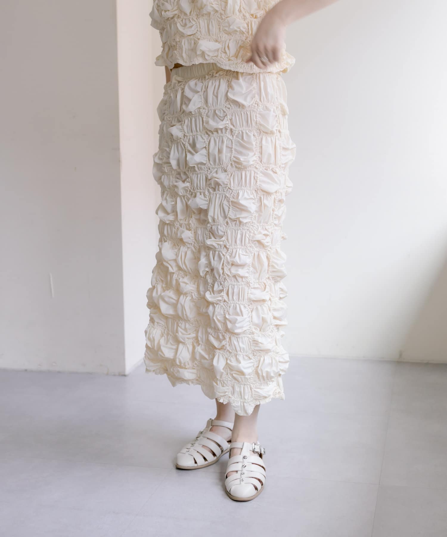 くしゅくしゅとした動きのあるテクスチャーが目を惹くスカート。