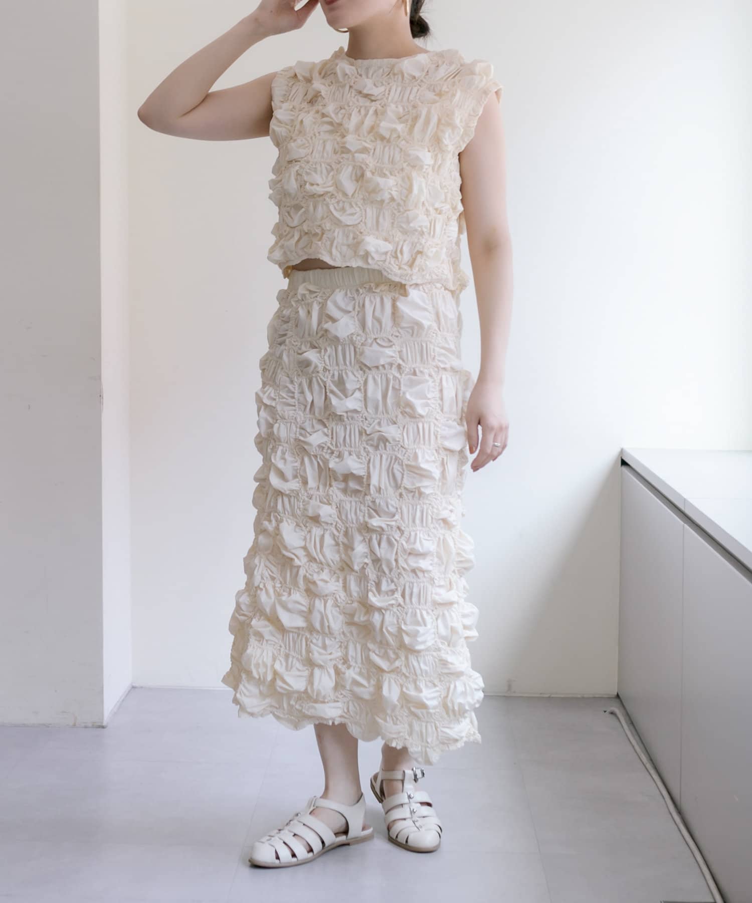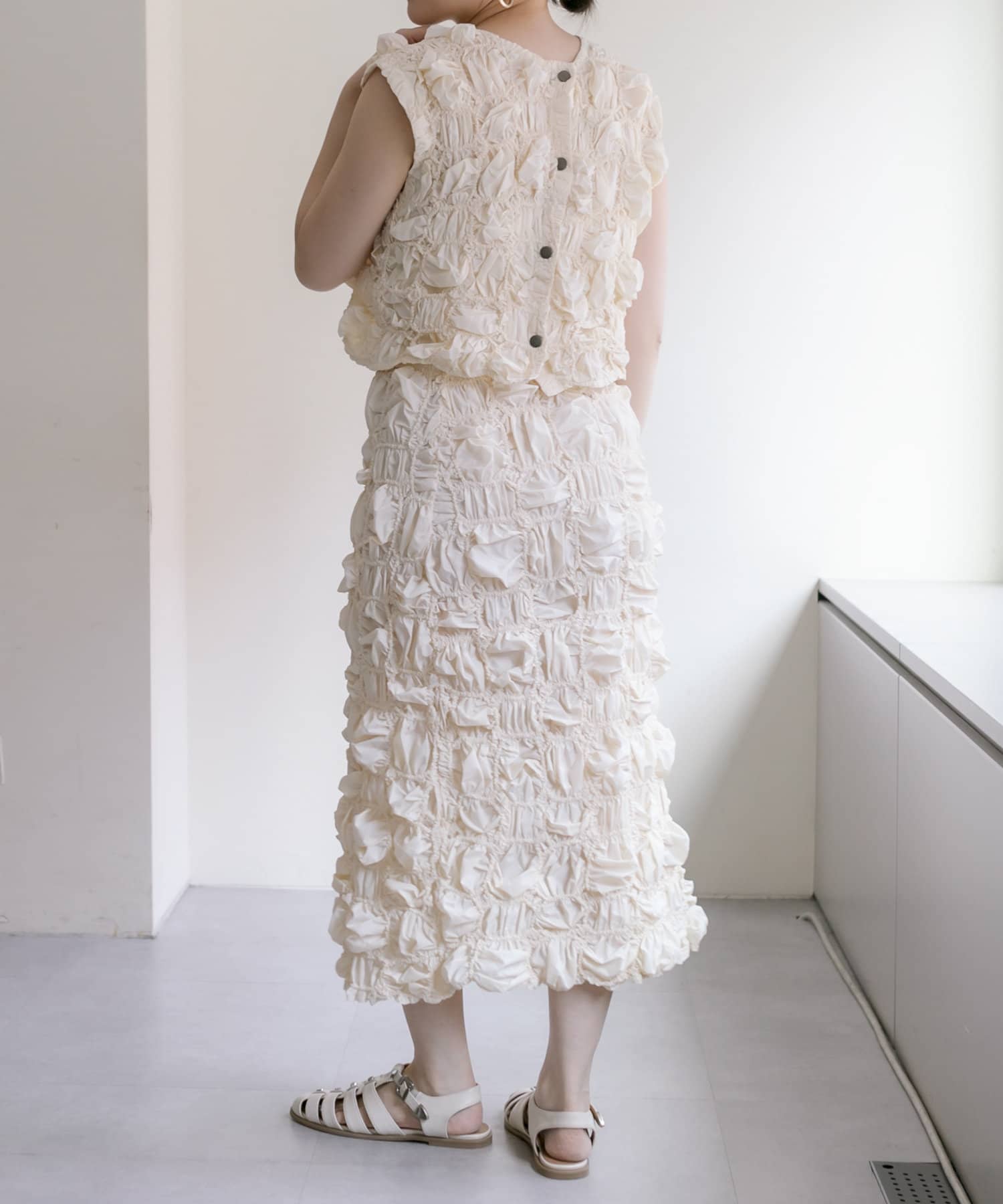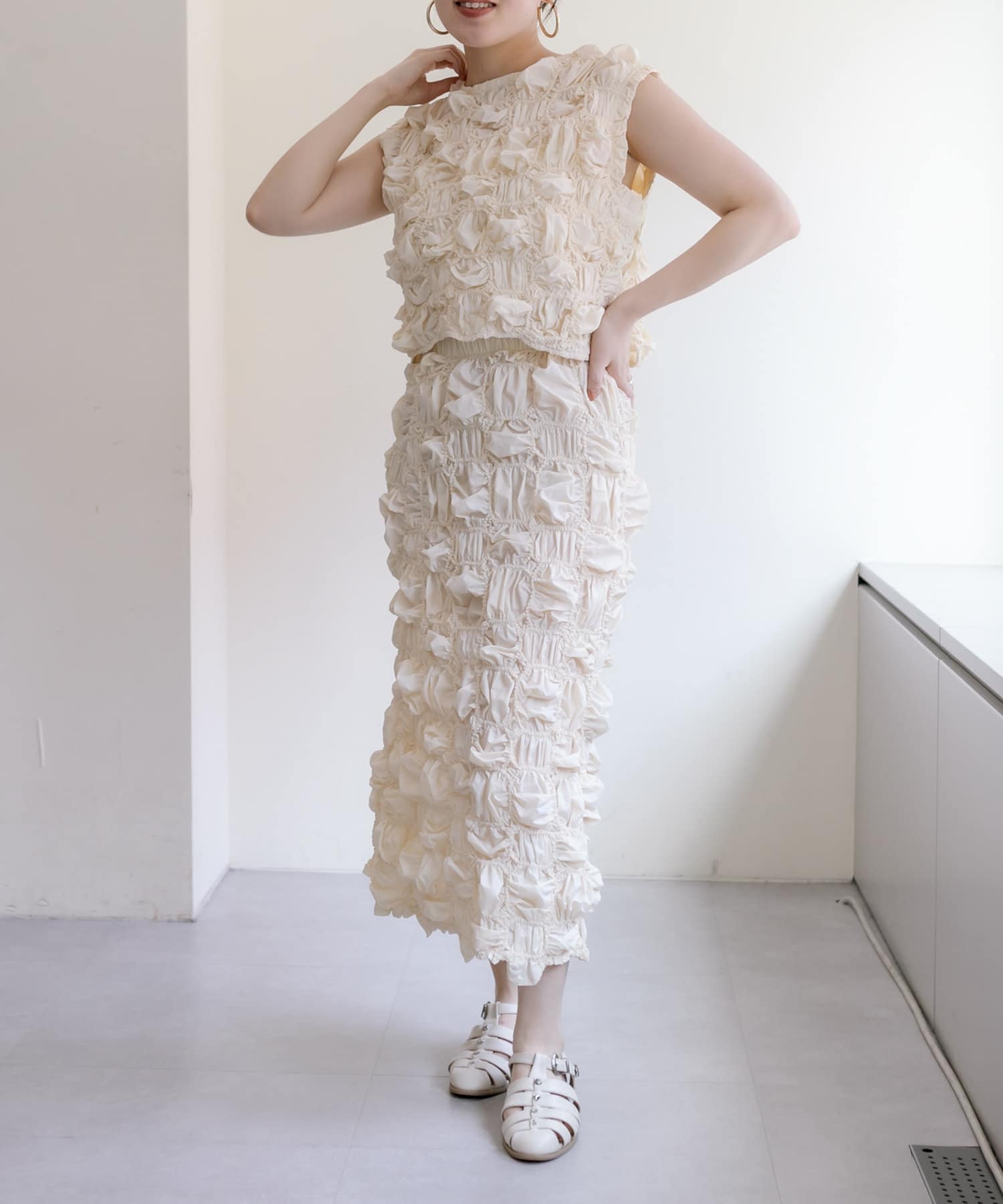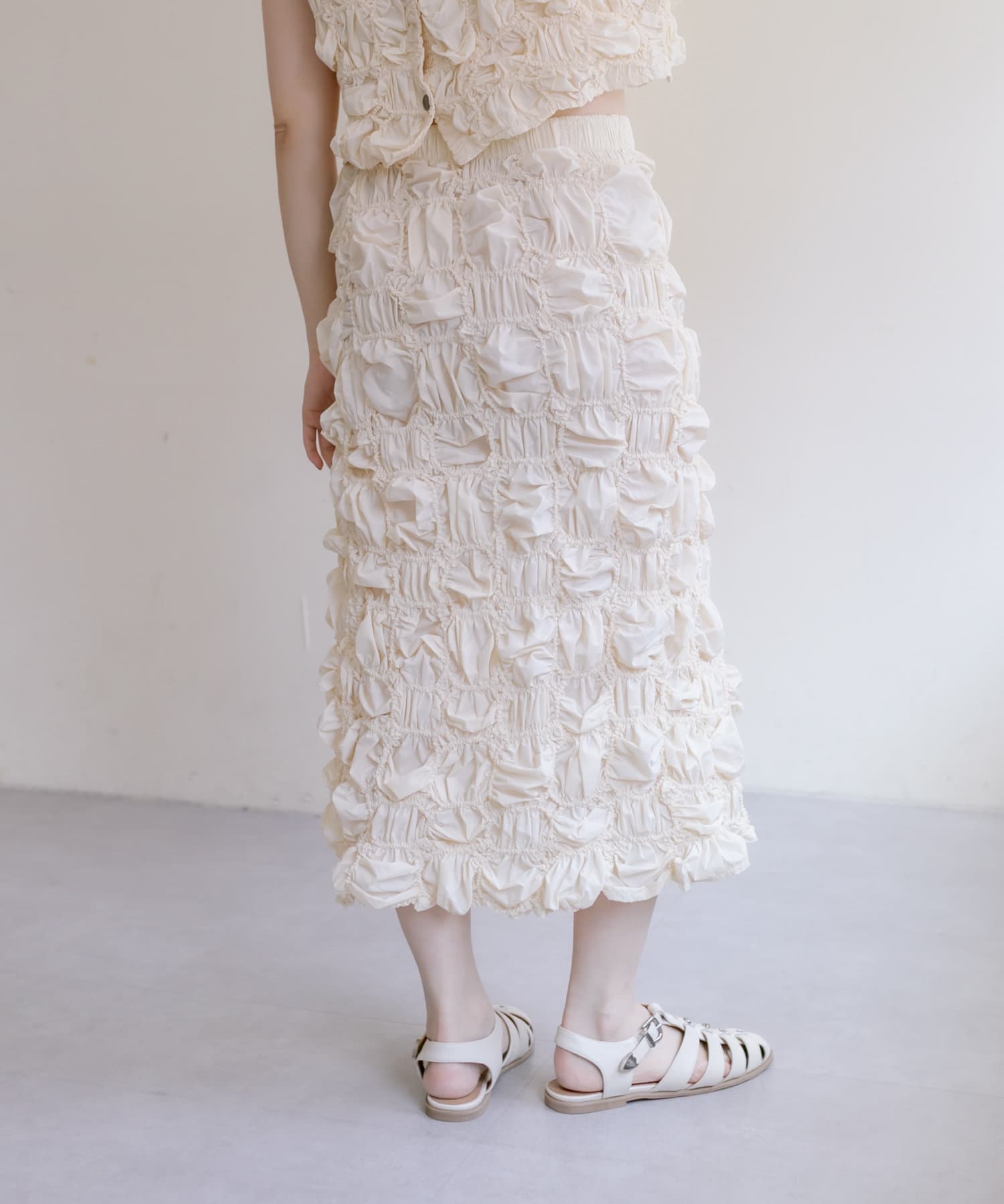 くしゅくしゅとした動きのあるテクスチャーが目を惹くスカート。