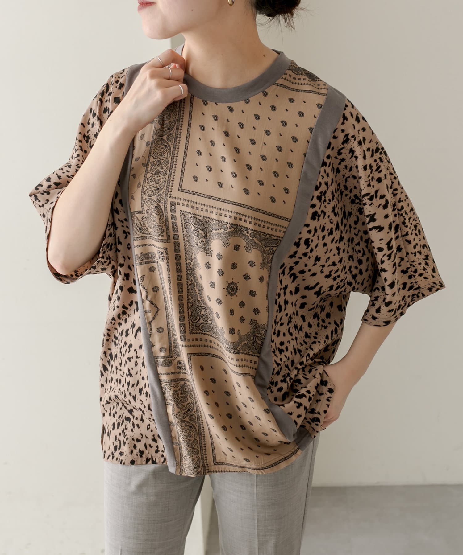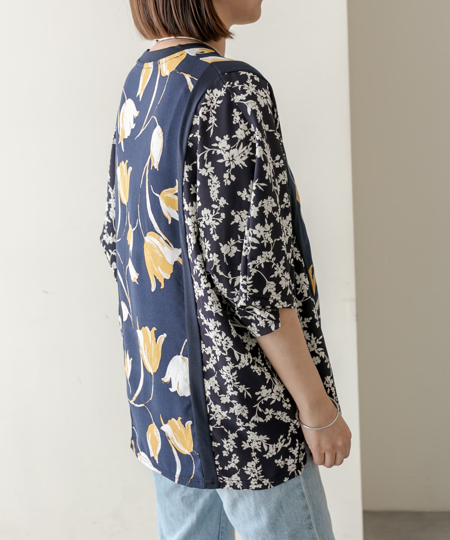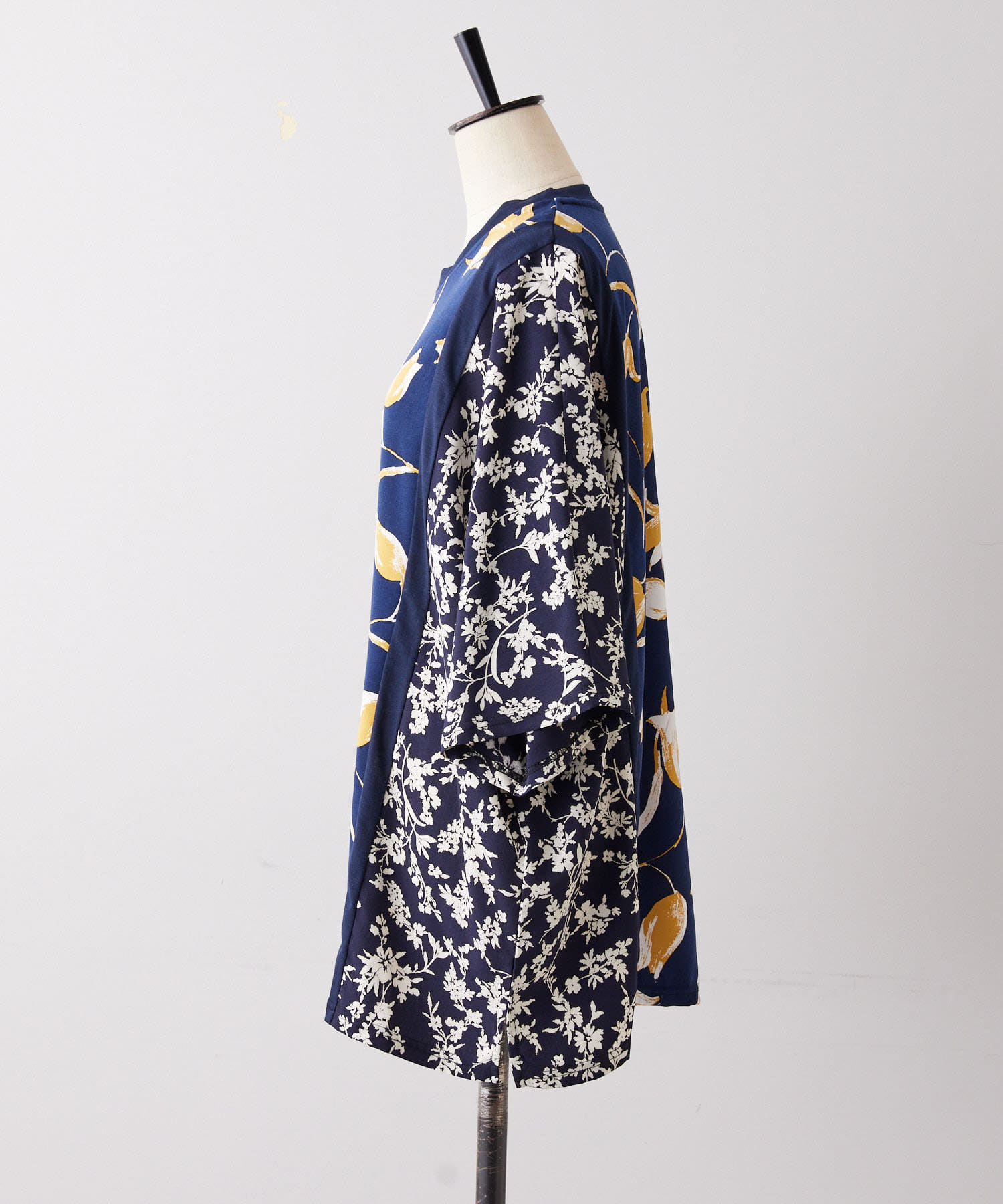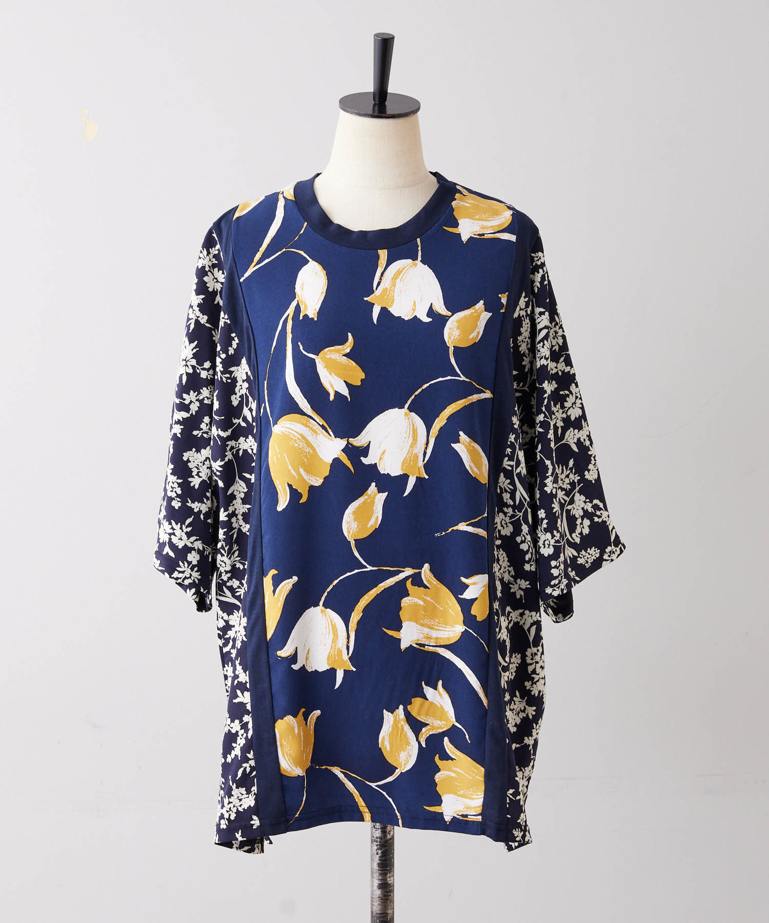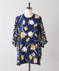 デザイン異なる2種のテキスタイルをドッキングさせたデザイントップス。