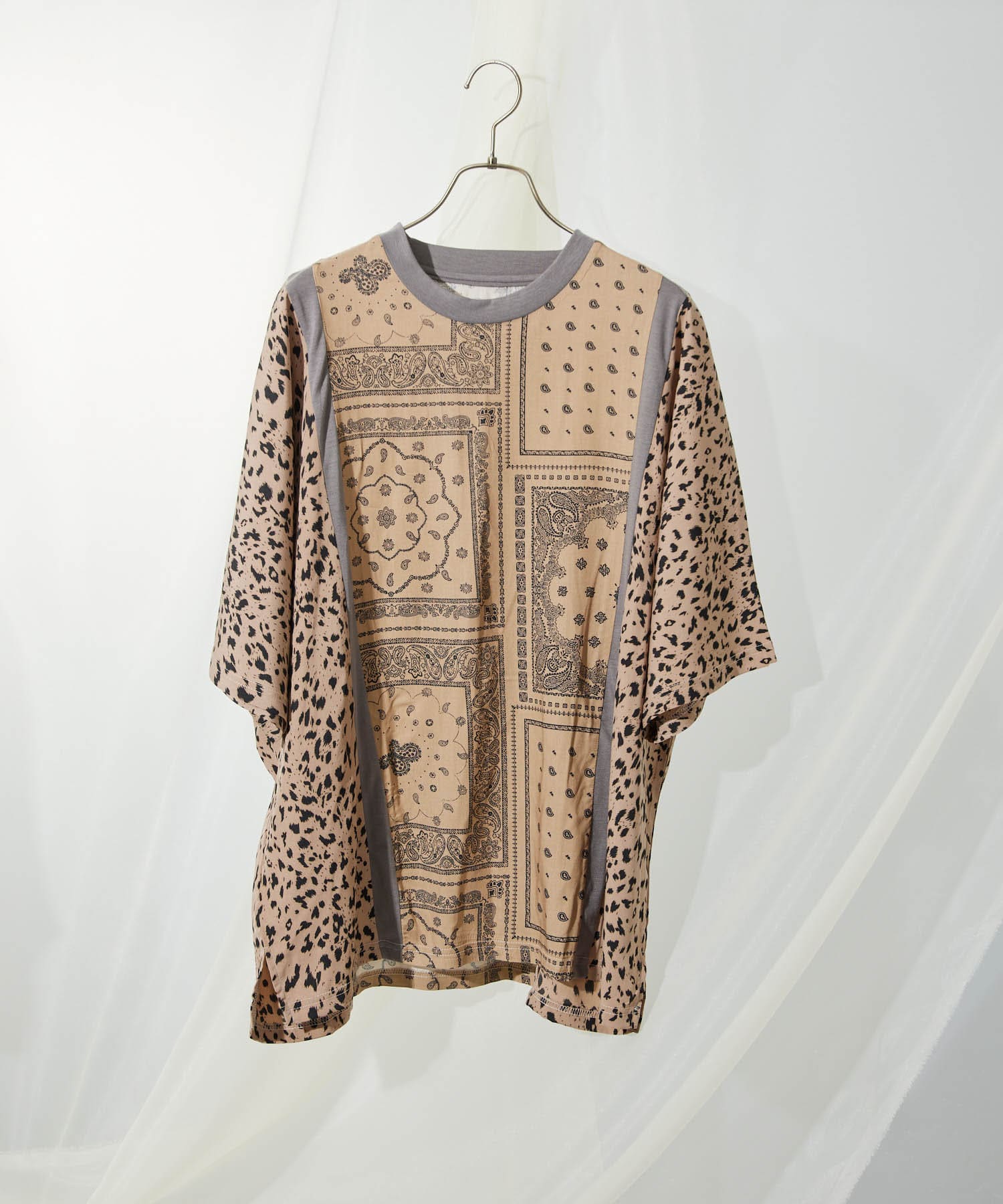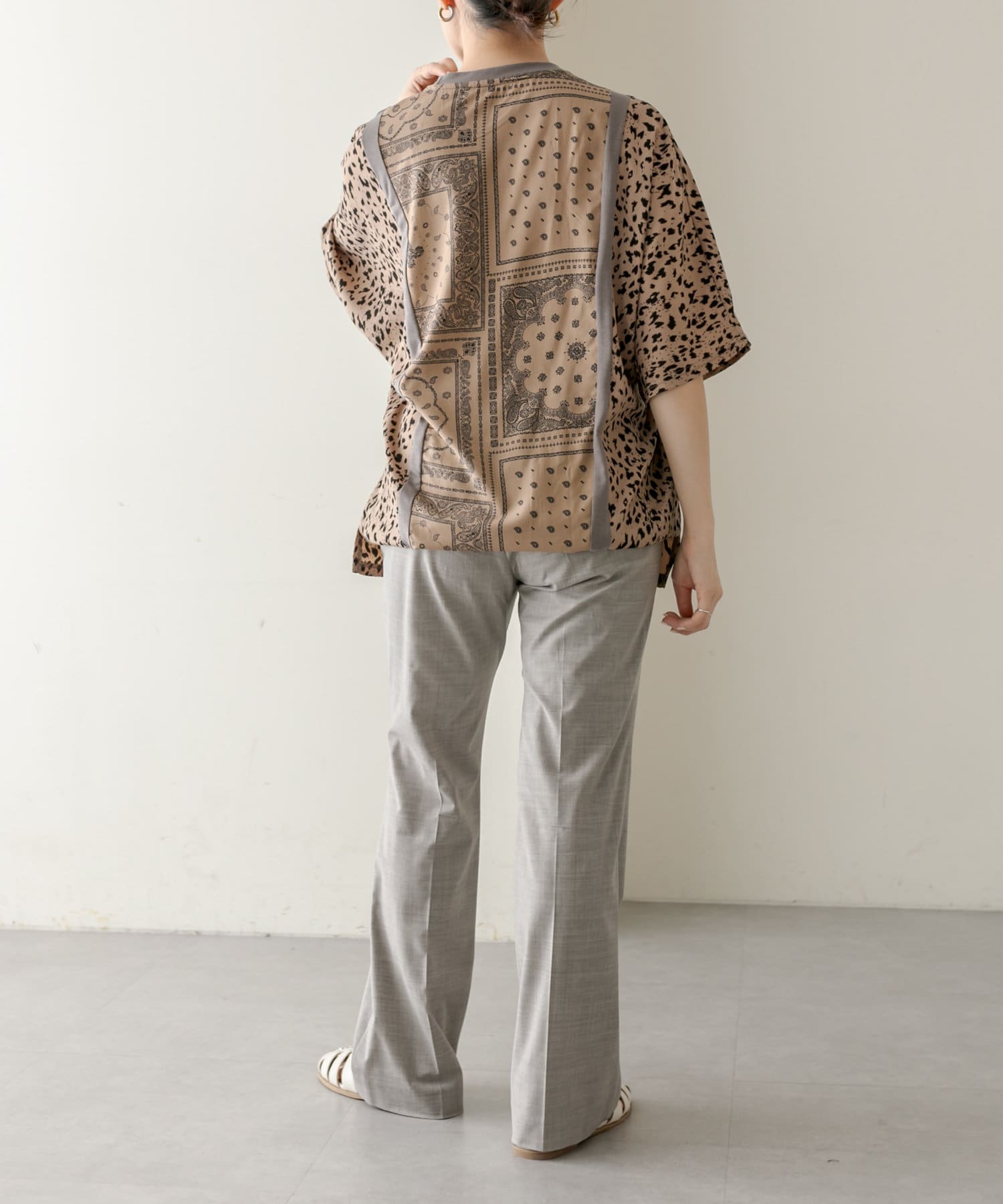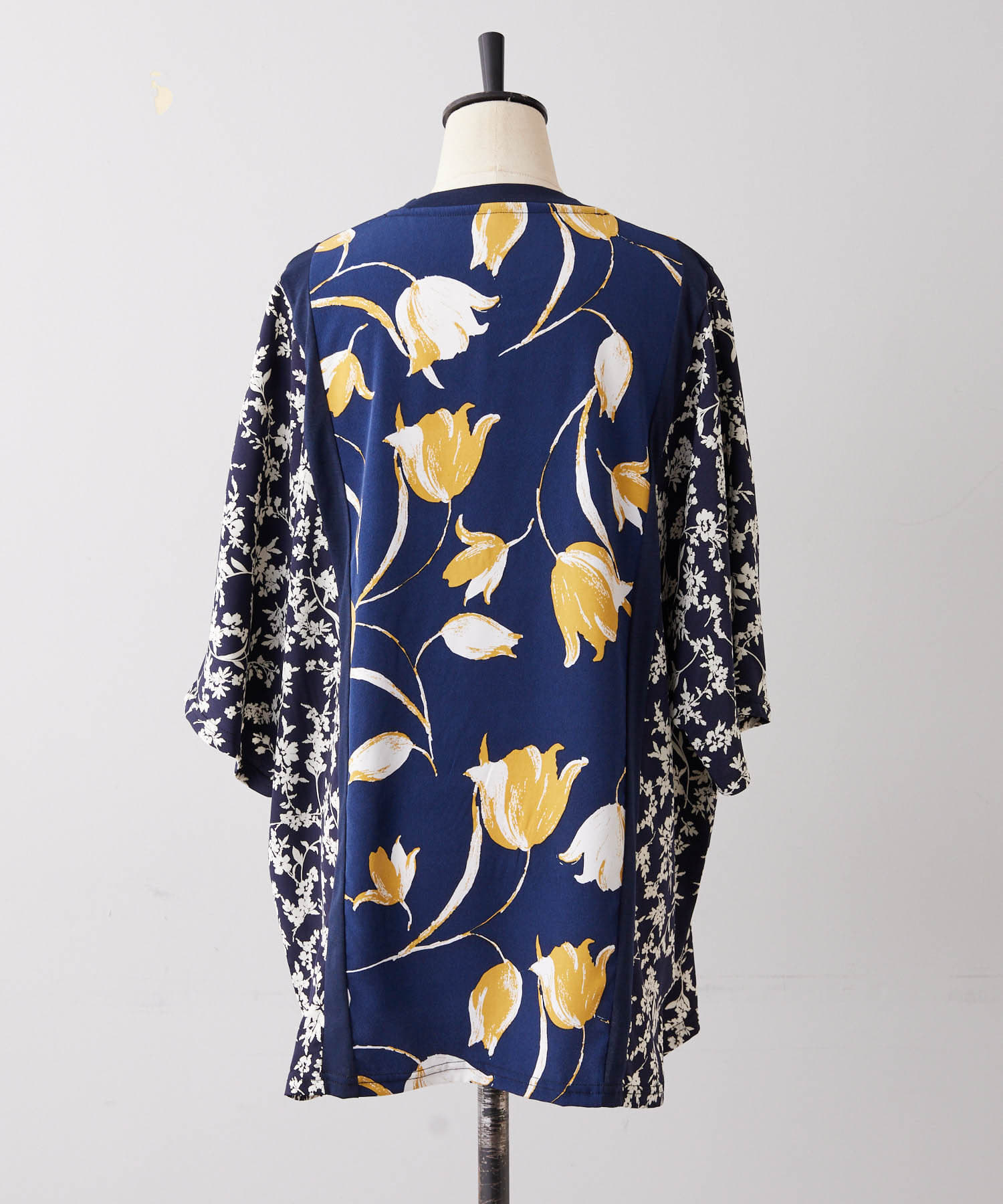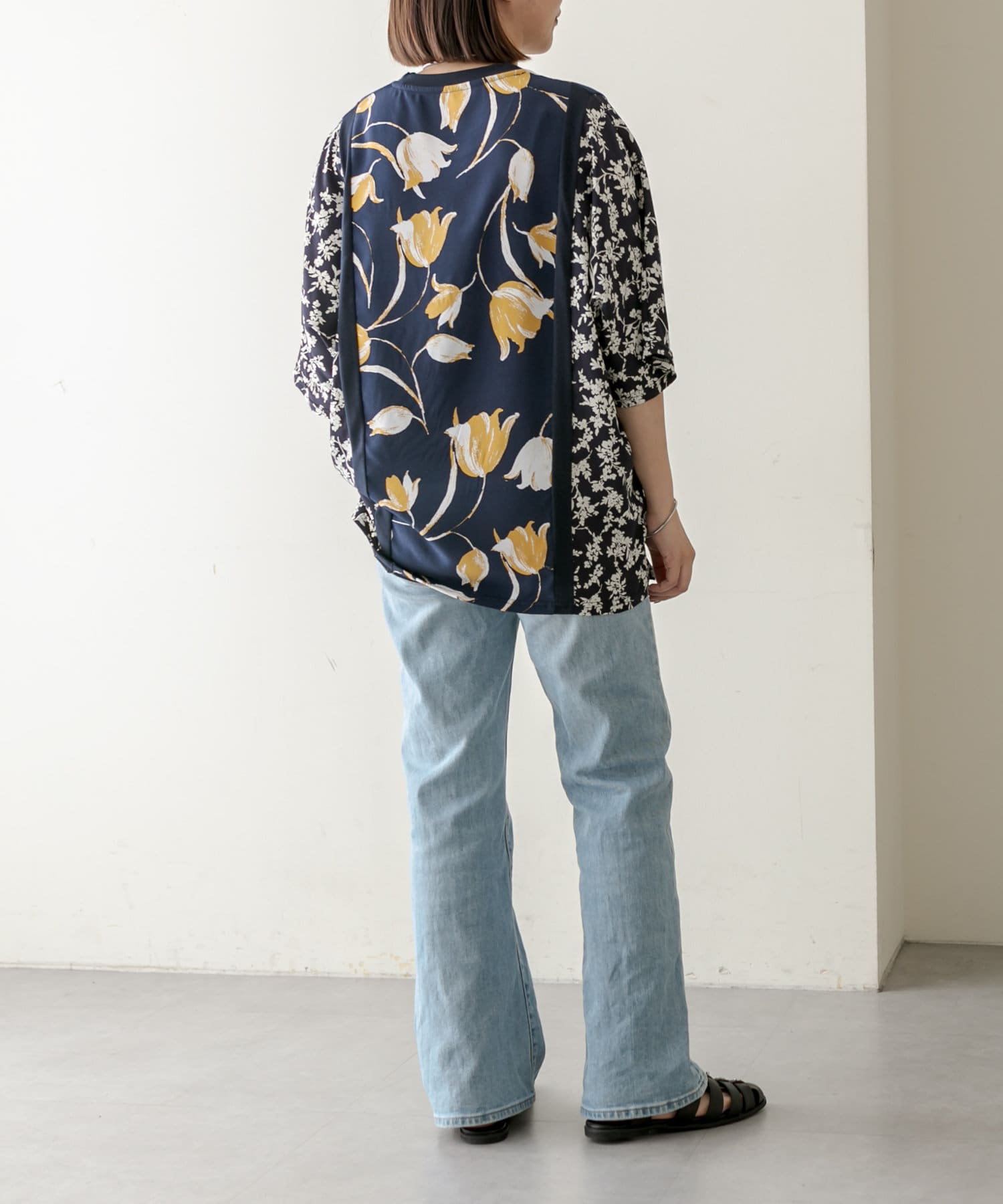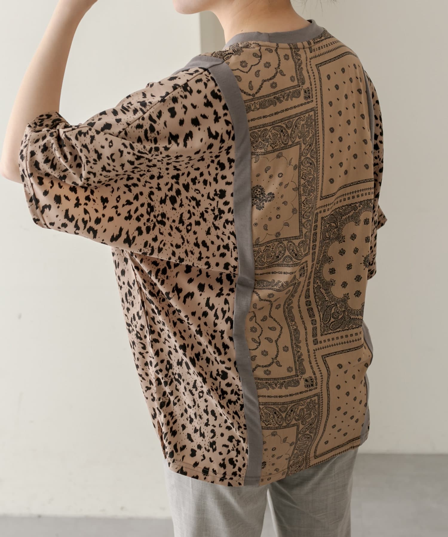 デザイン異なる2種のテキスタイルをドッキングさせたデザイントップス。