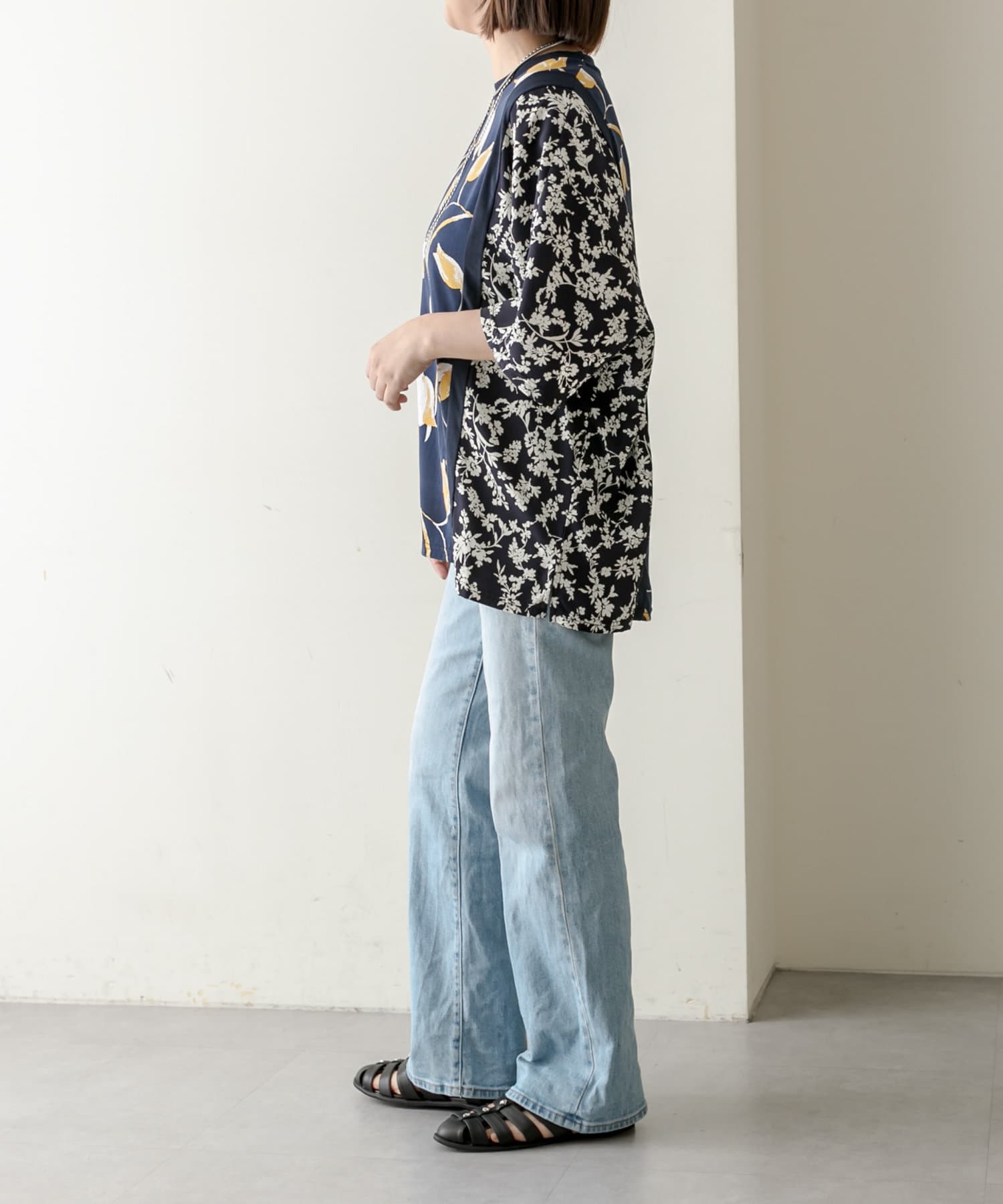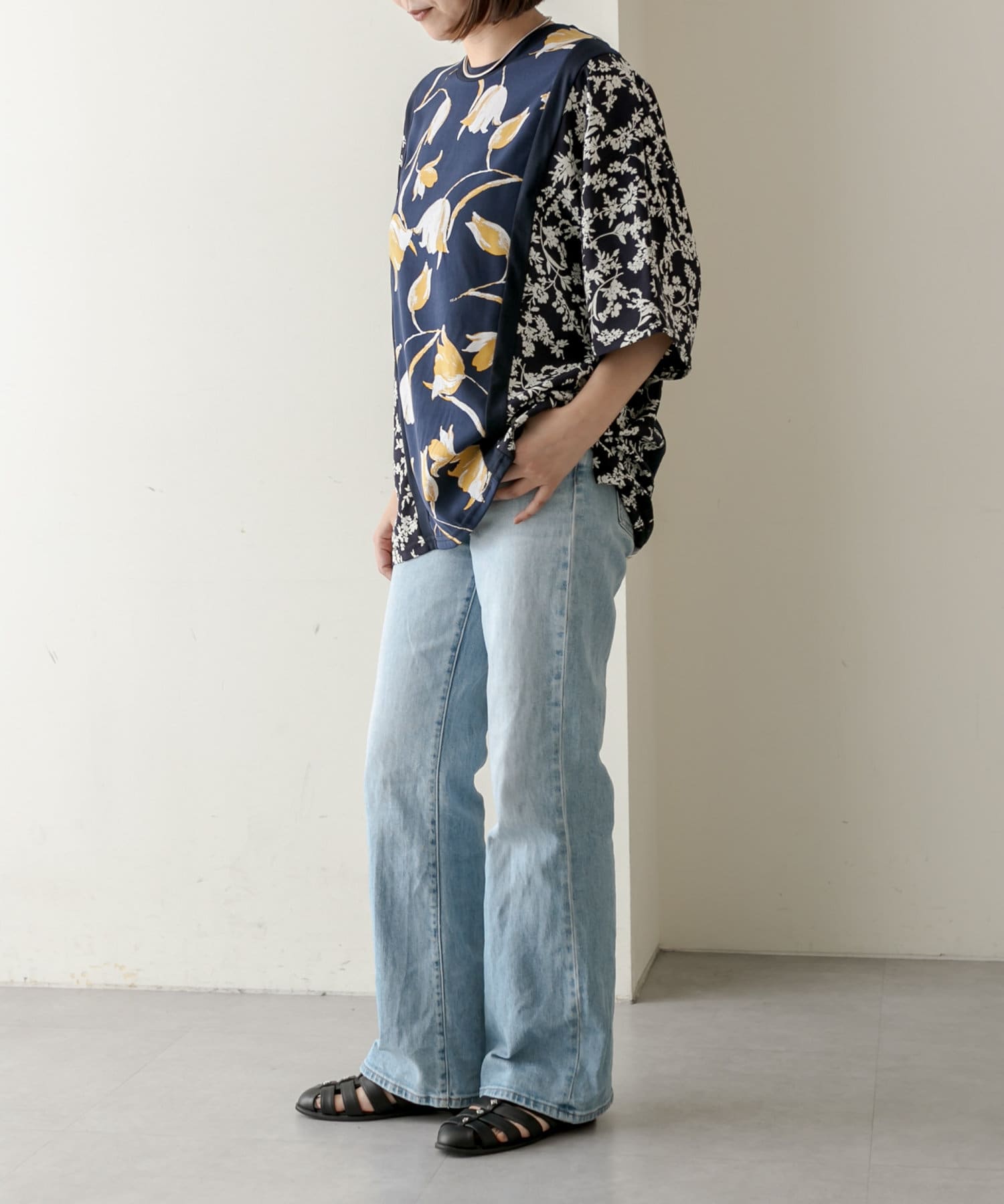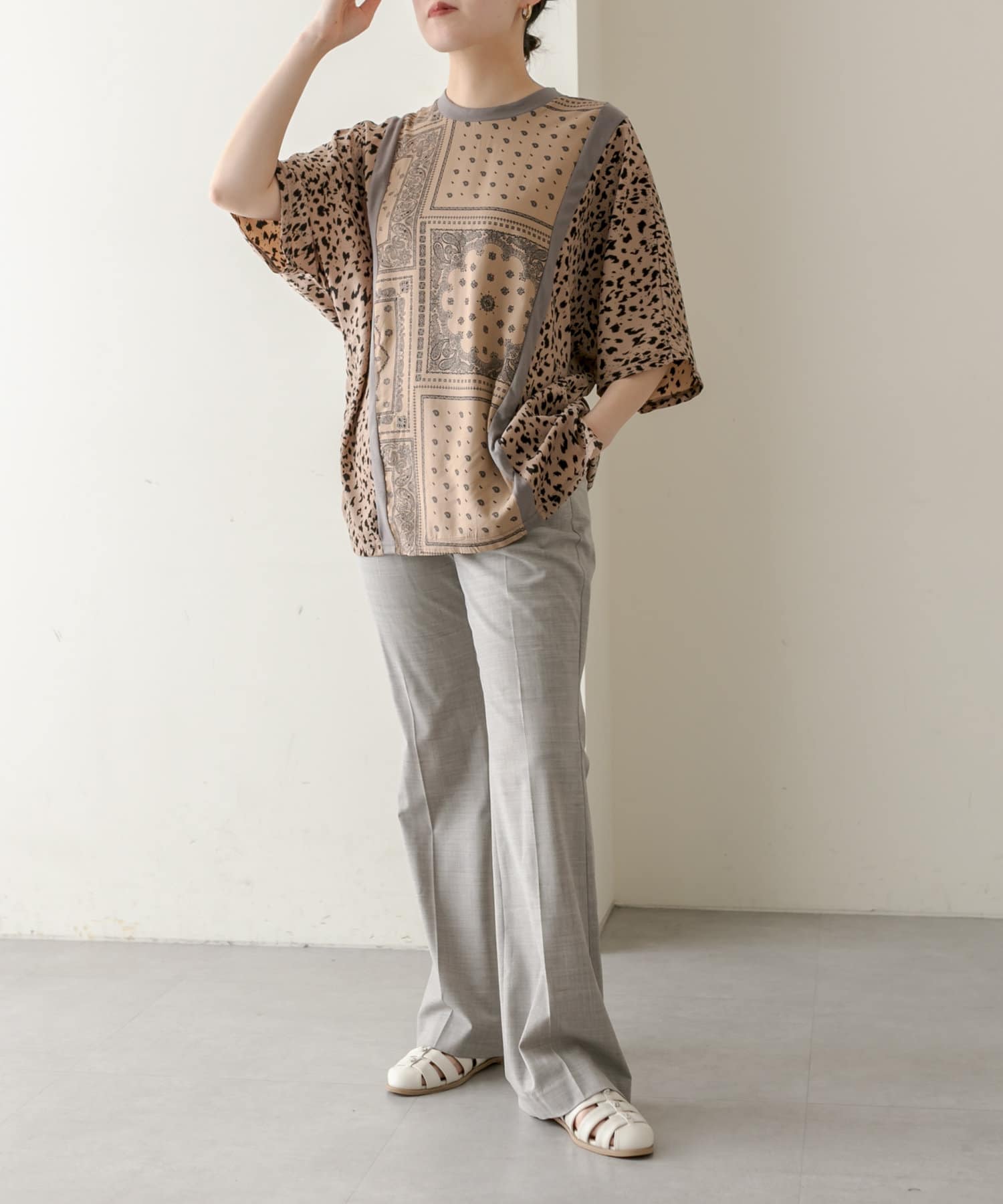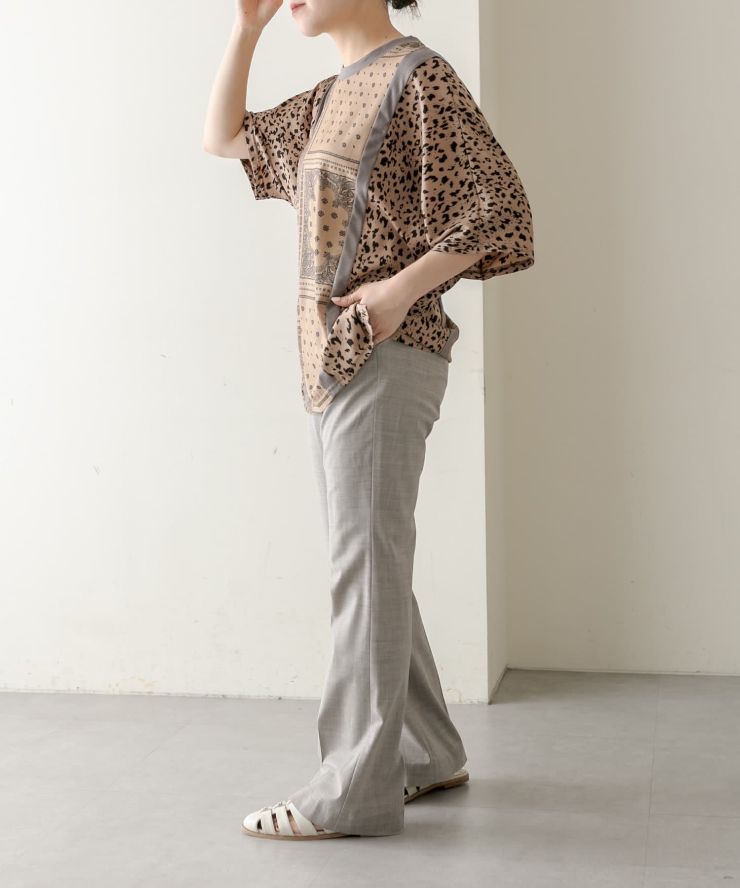デザイン異なる2種のテキスタイルをドッキングさせたデザイントップス。