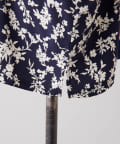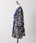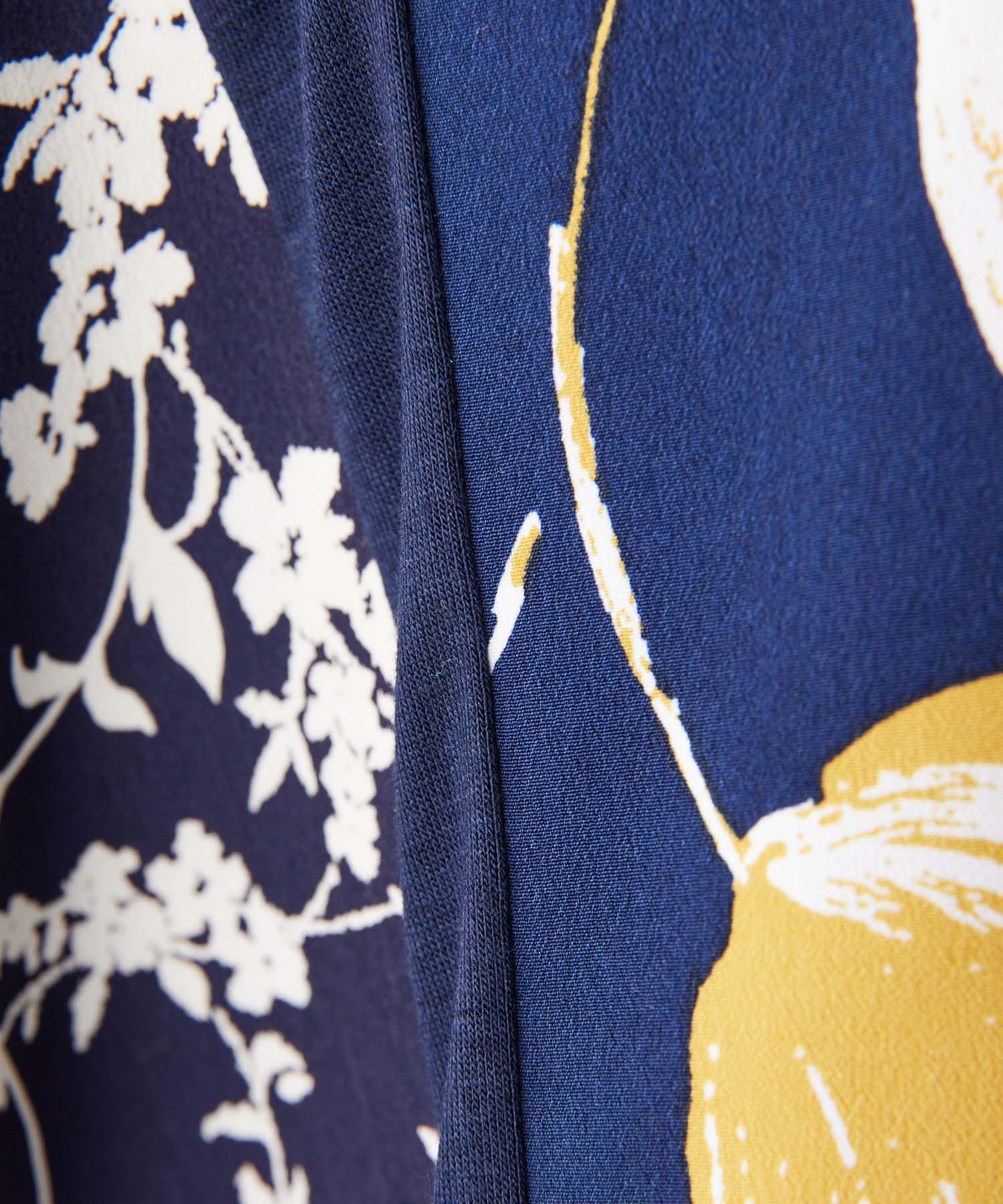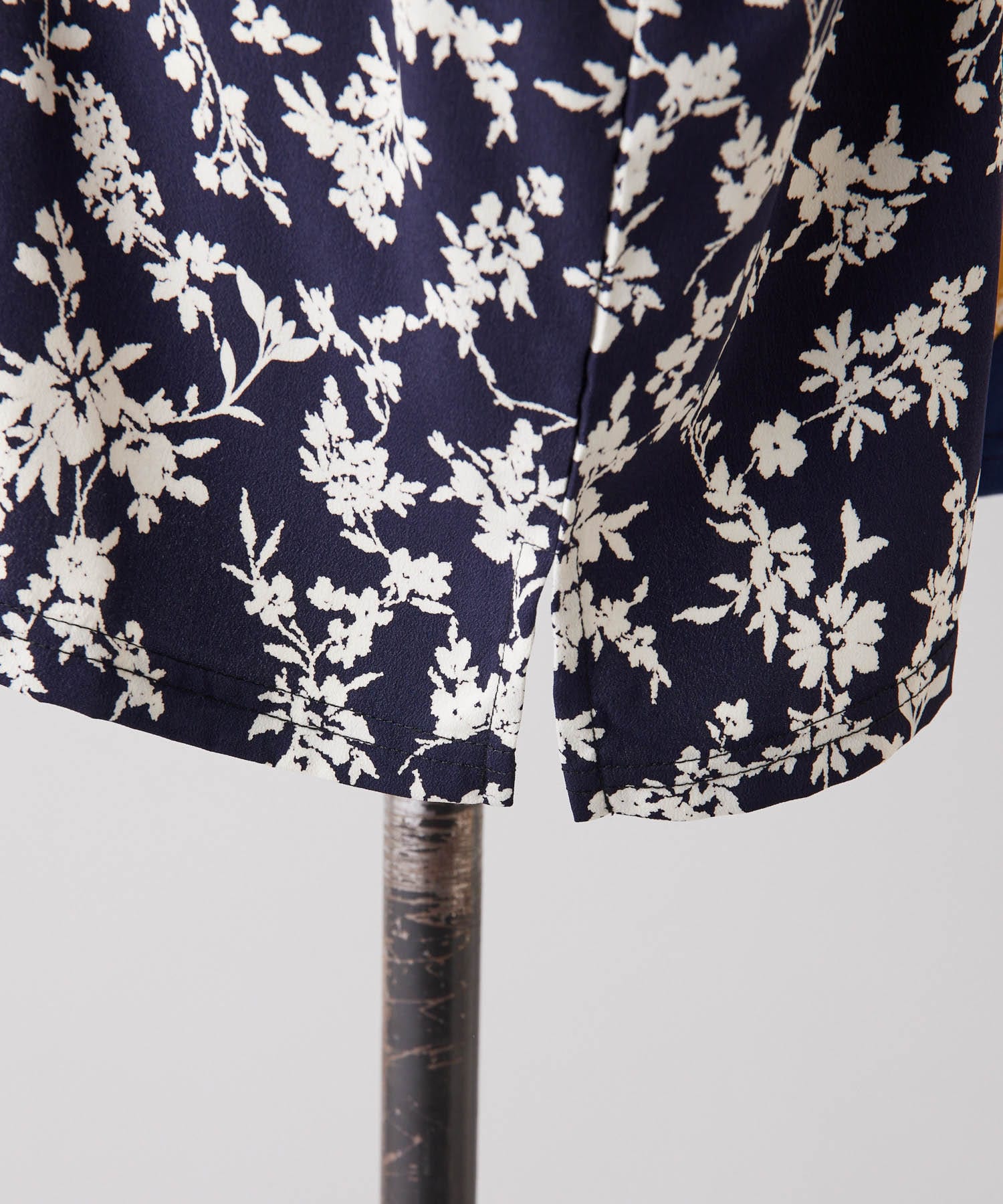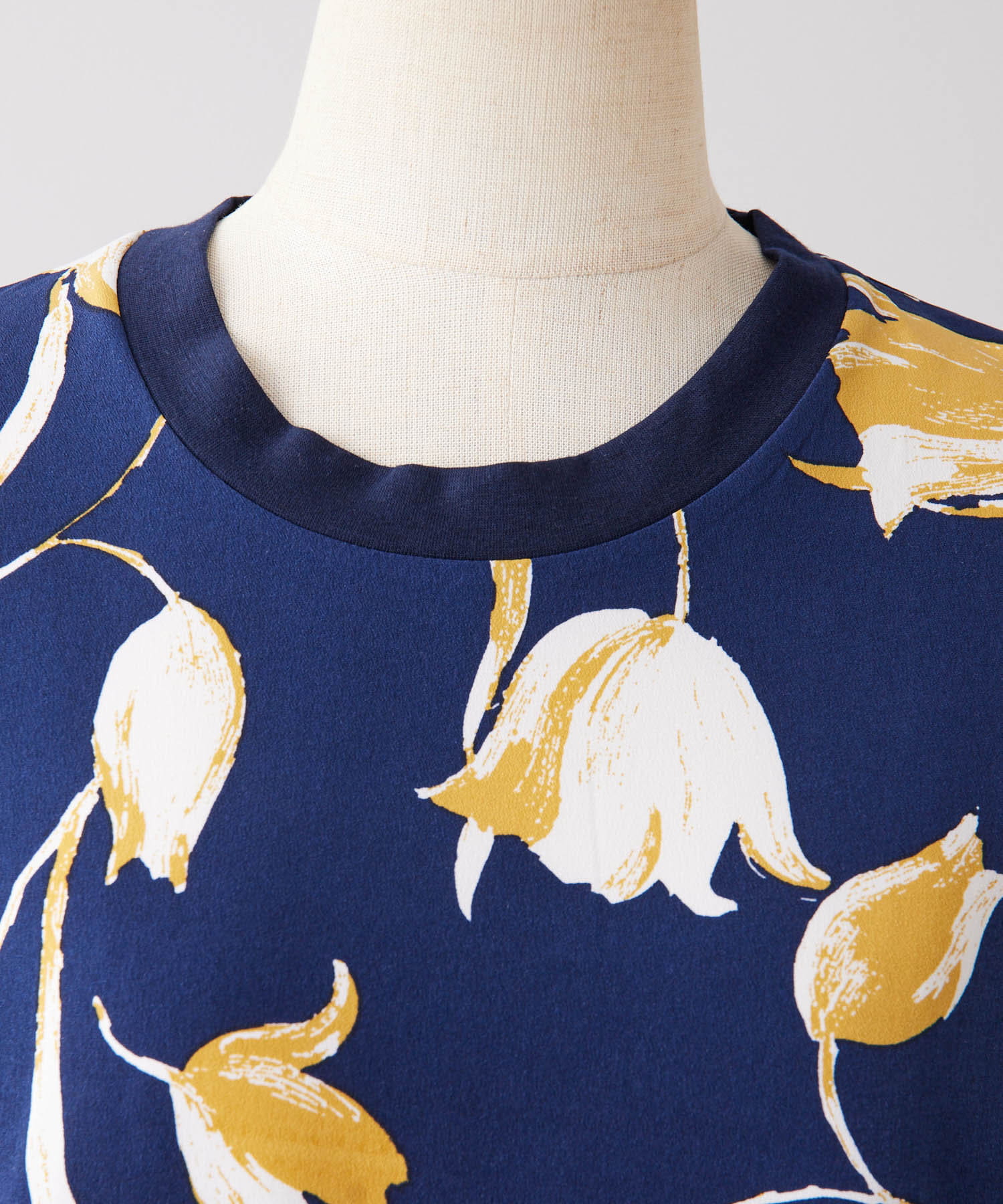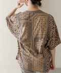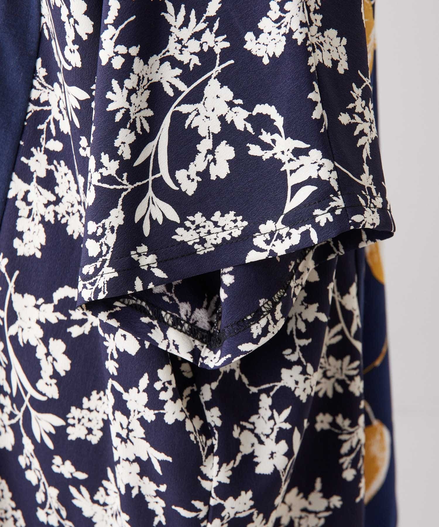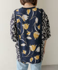 デザイン異なる2種のテキスタイルをドッキングさせたデザイントップス。