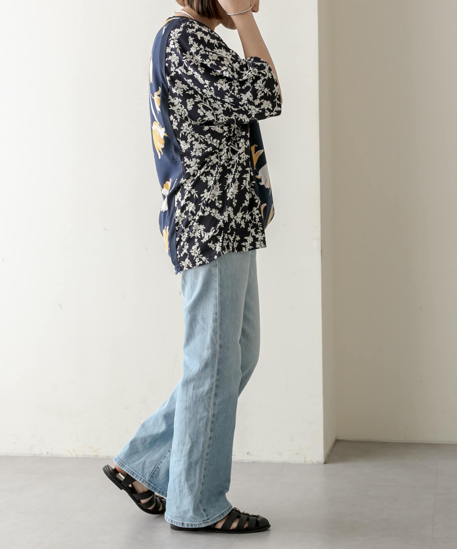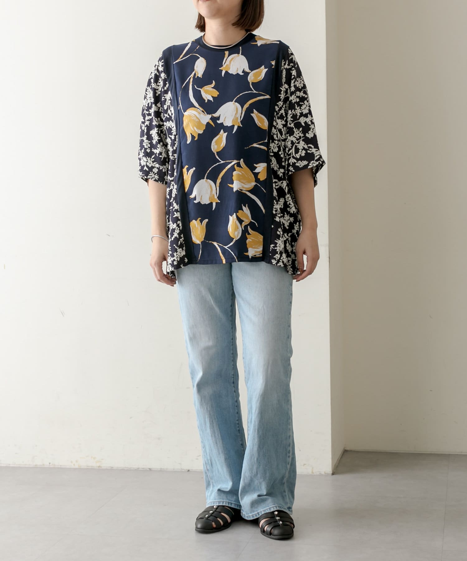 デザイン異なる2種のテキスタイルをドッキングさせたデザイントップス。