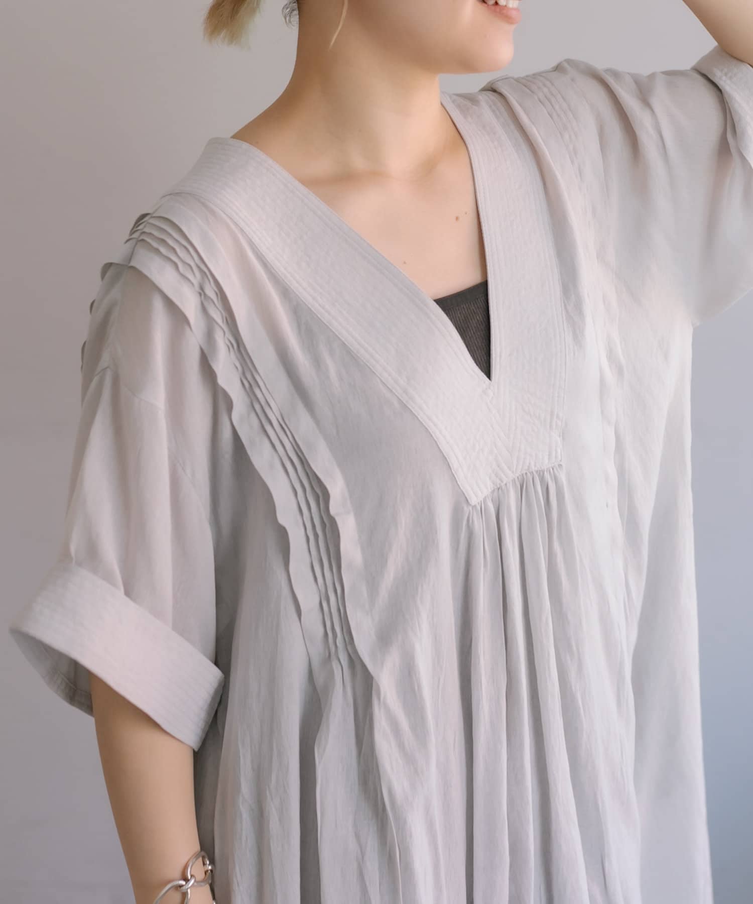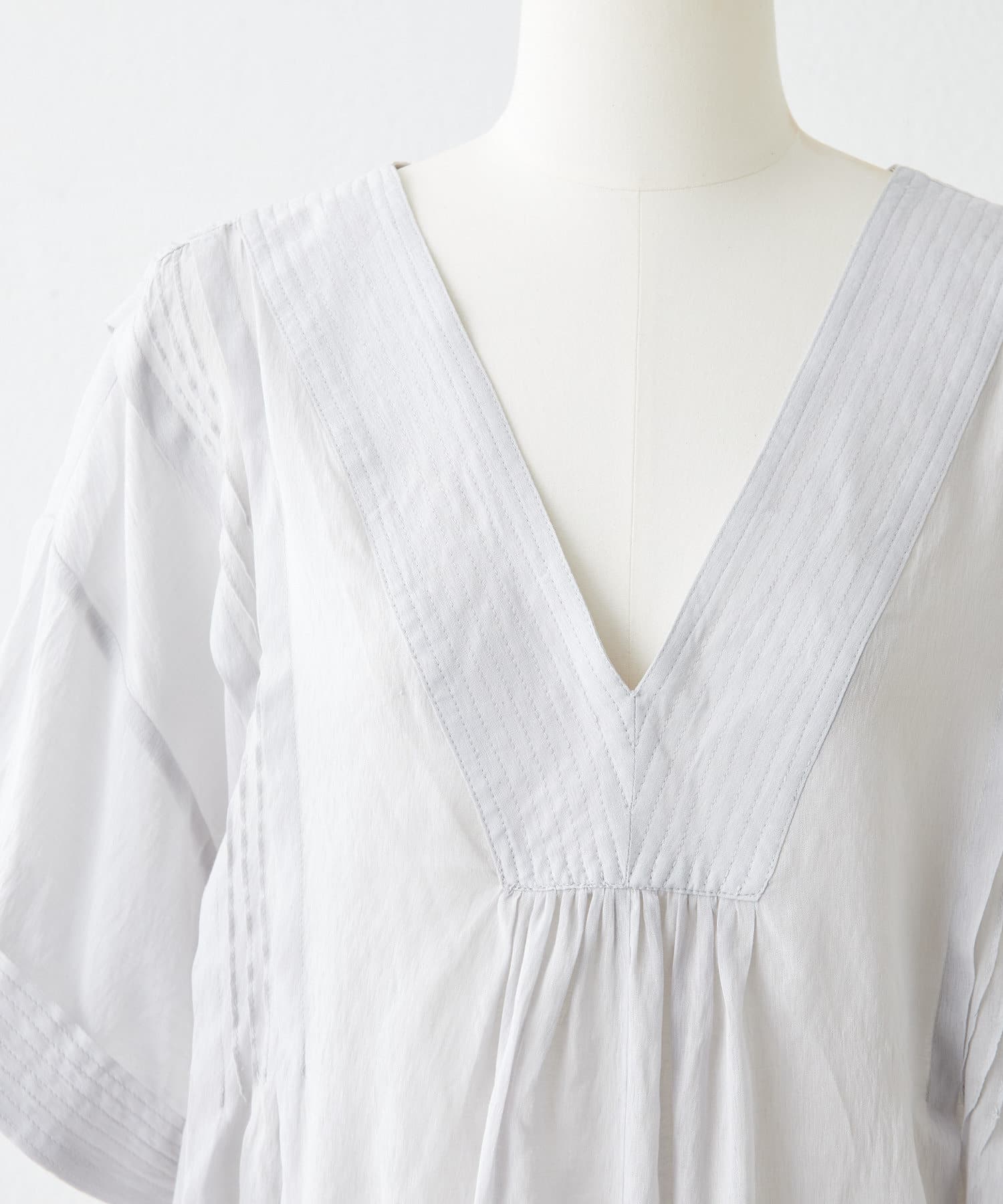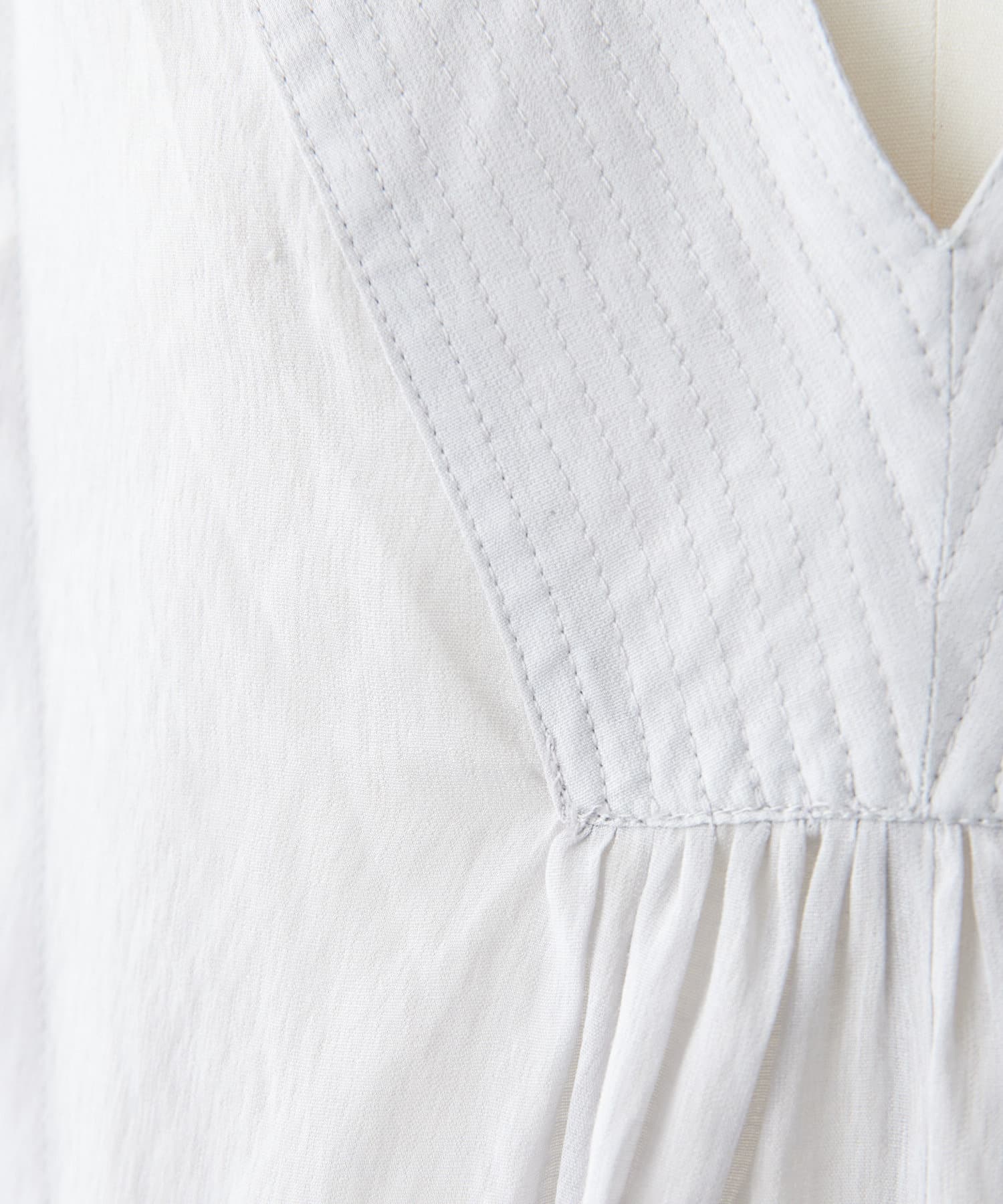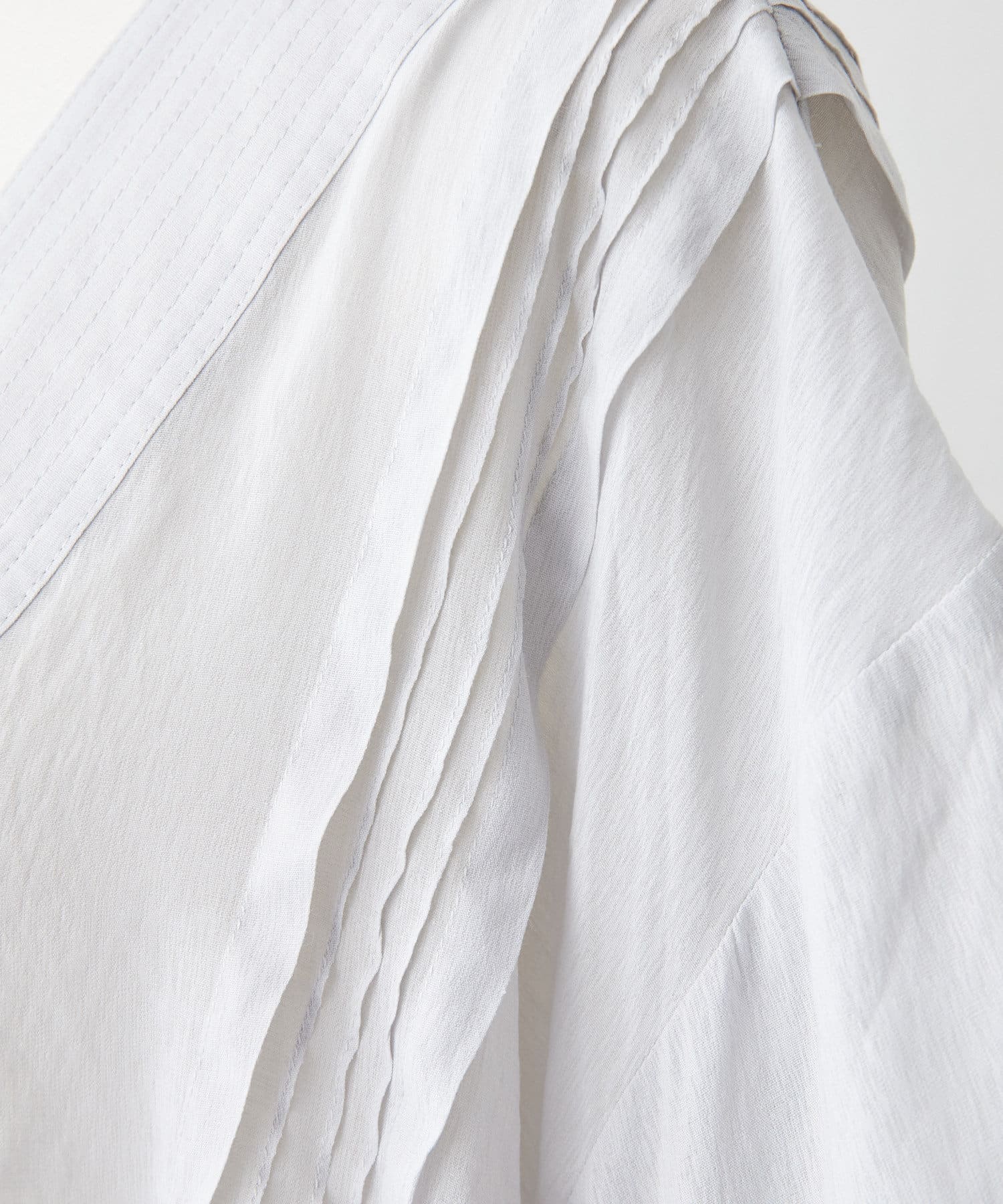 肩線から下に向かって細かなタックが入っていて、さり気ない華やかさのあるデザインです。