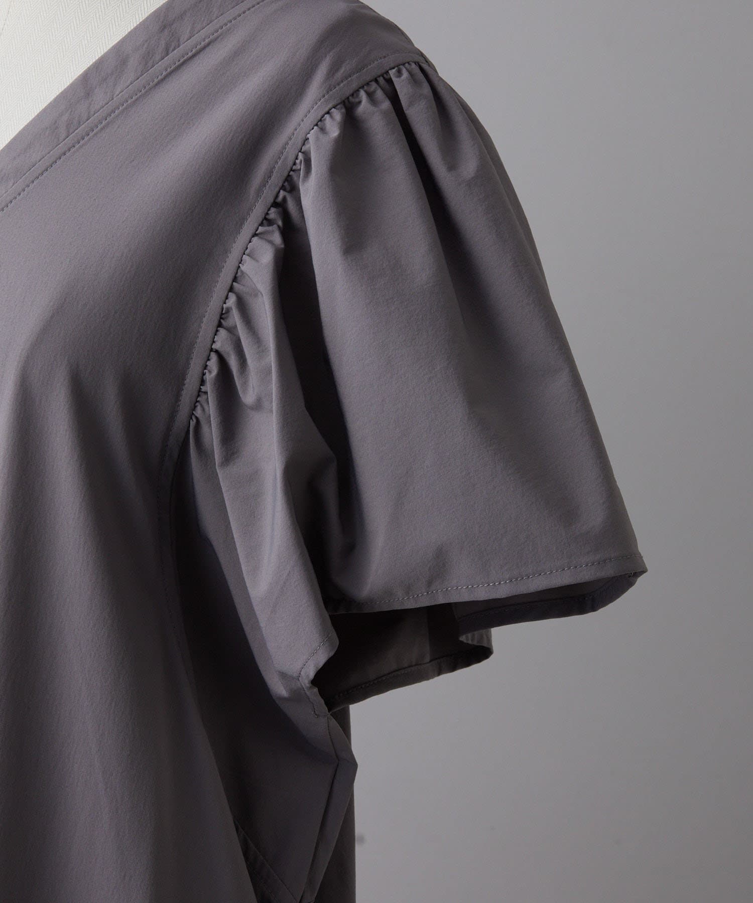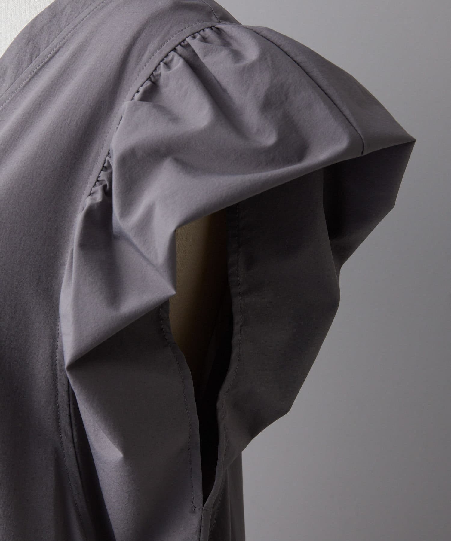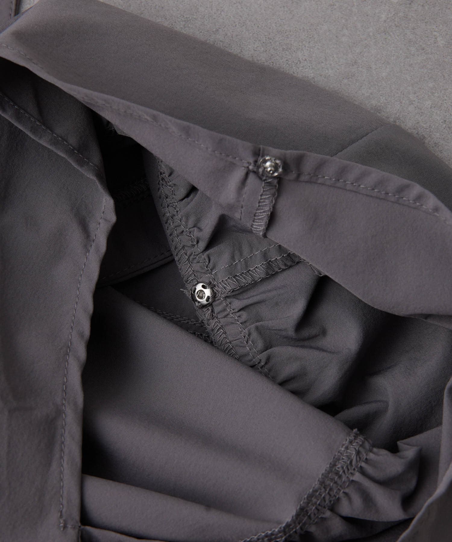 また、ショルダーの端布を内側に入れ込みボタンを留めることでフォルムチェンジも可能です。