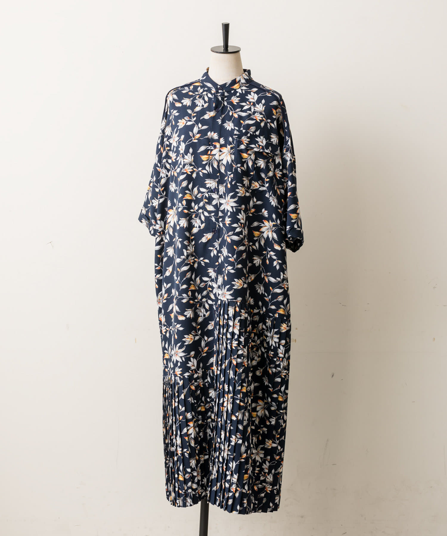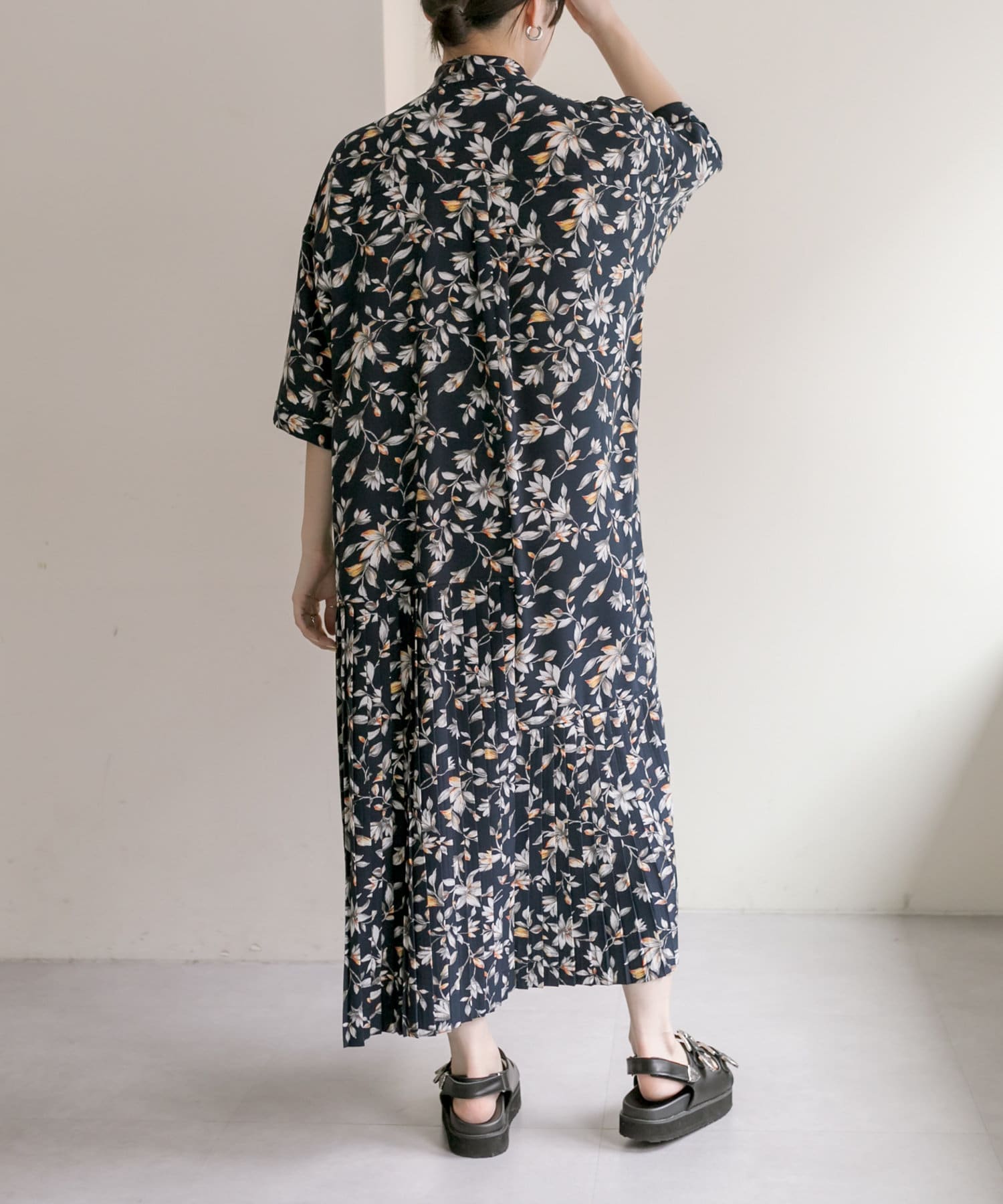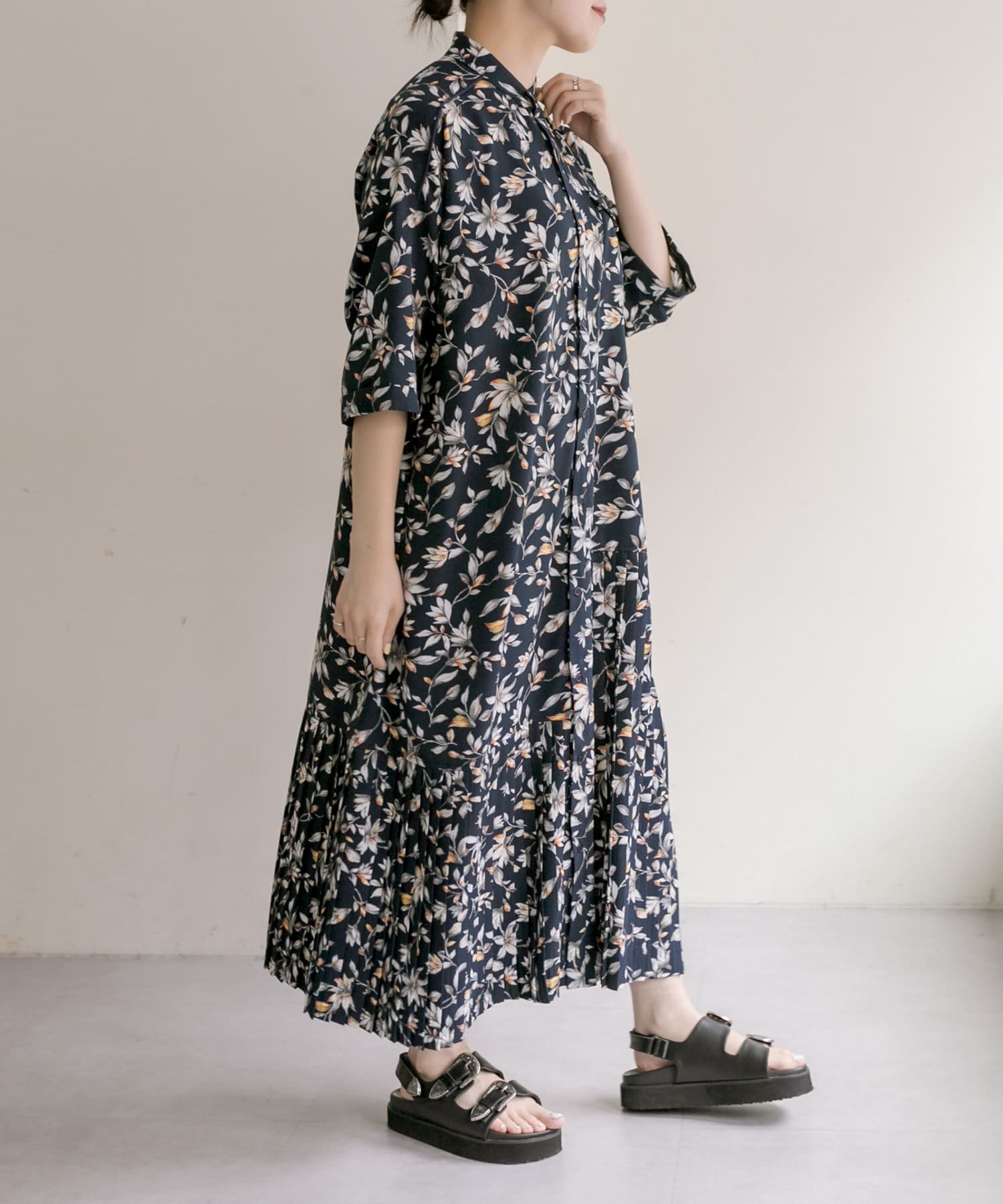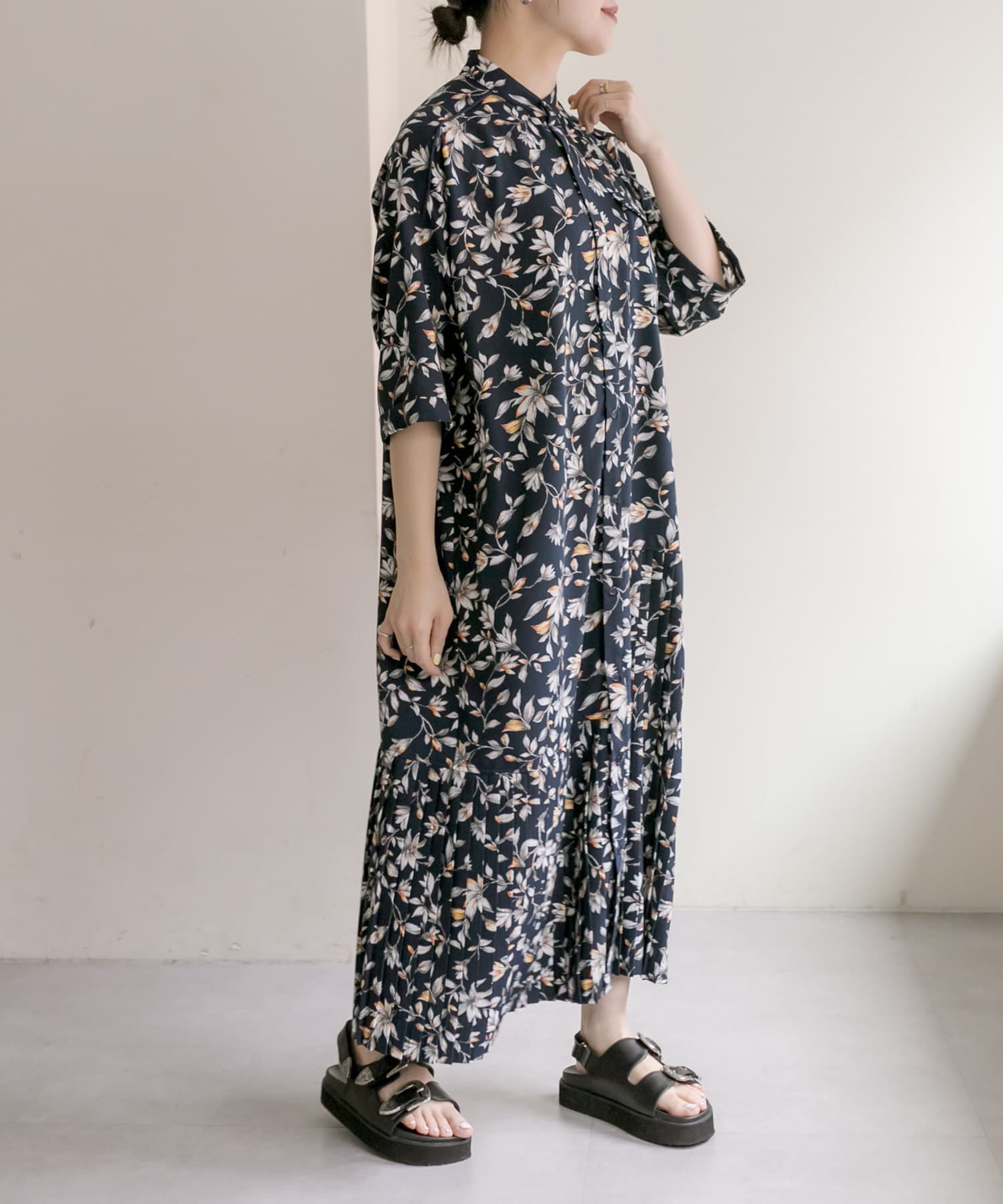 《手洗い可》全骨格◎/-3kg細見え/七分袖アンダープリーツ柄プリントワンピース【SUM1 STYLE】