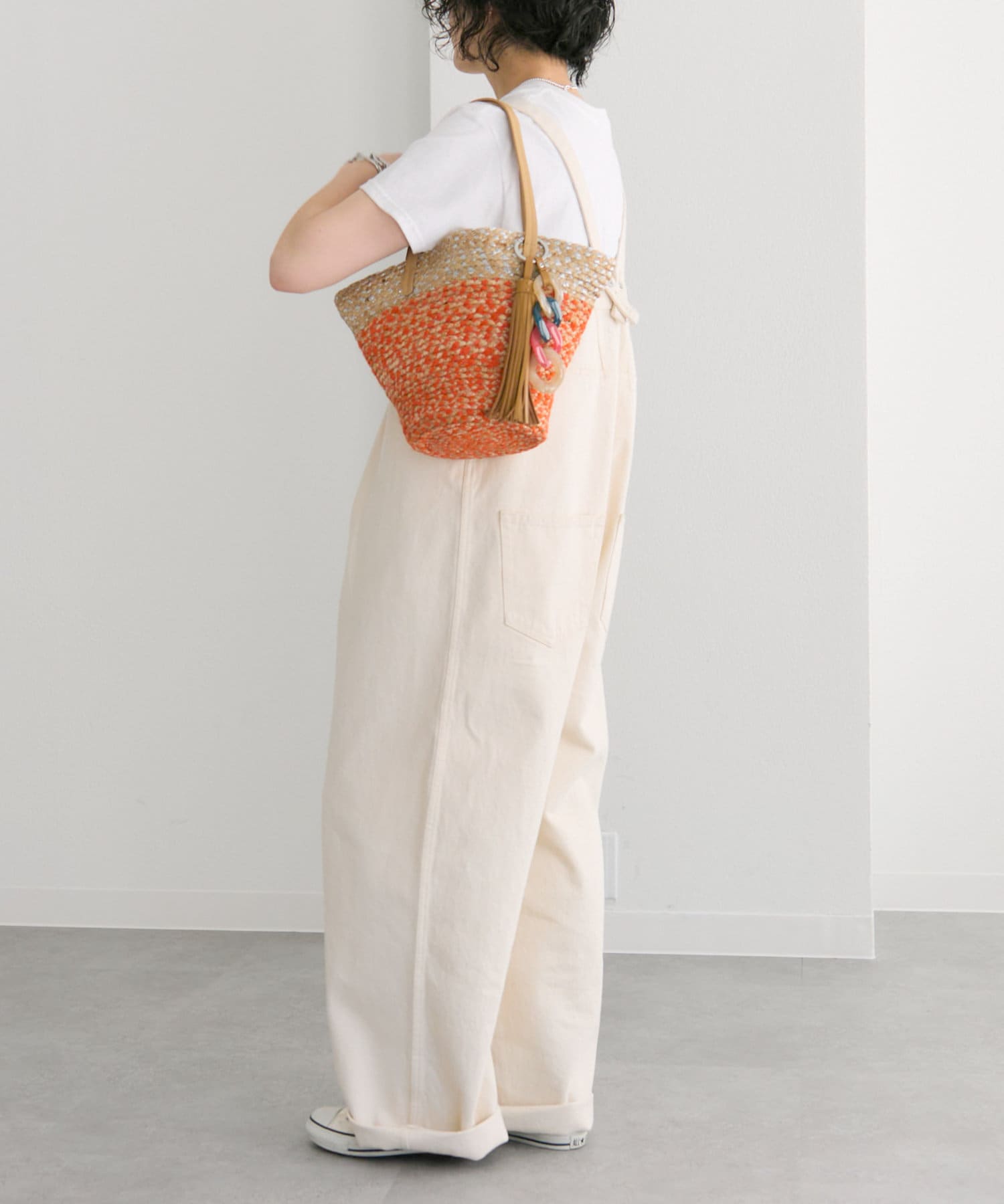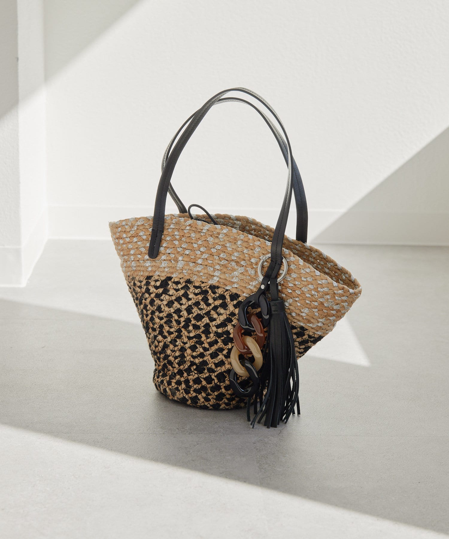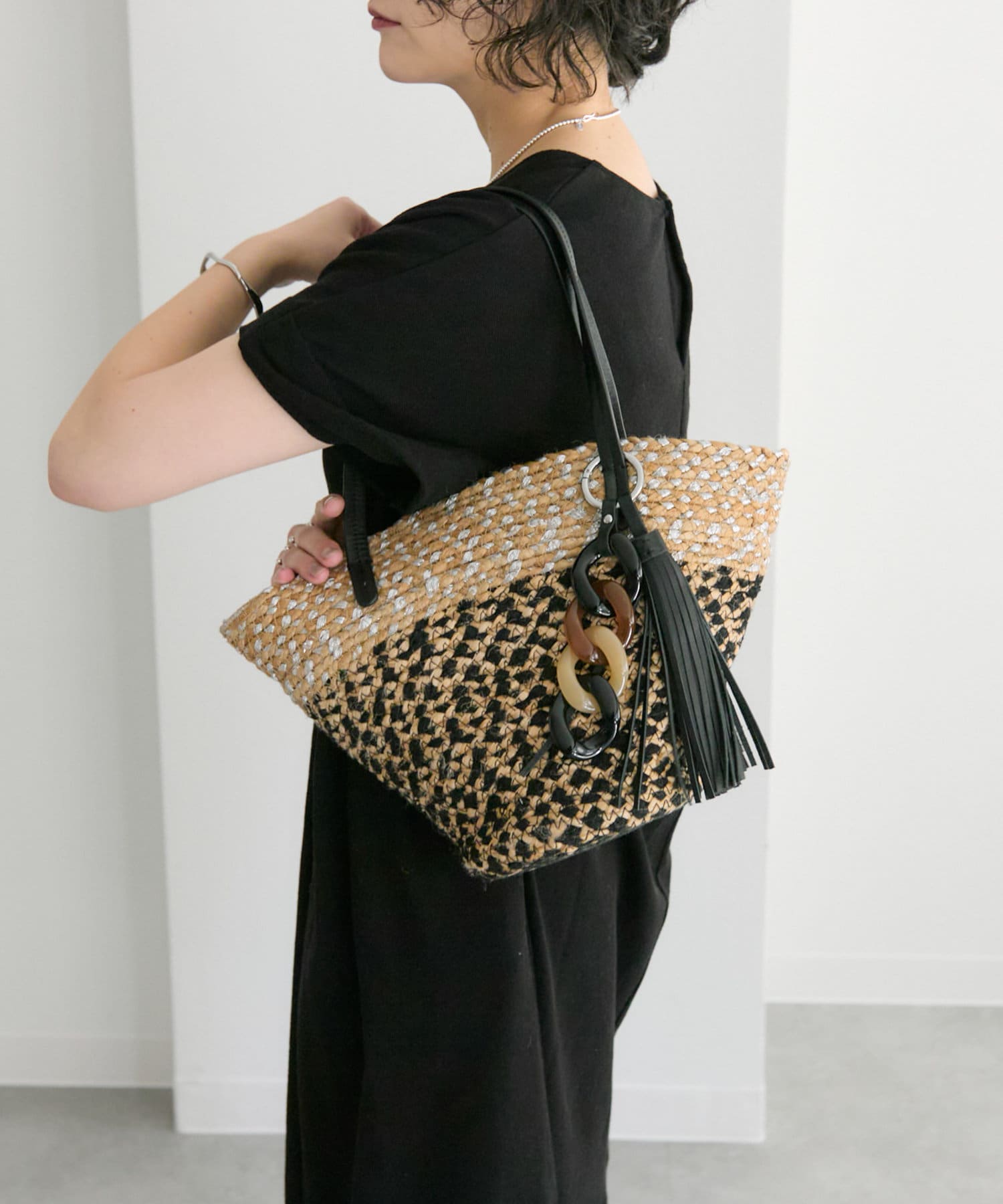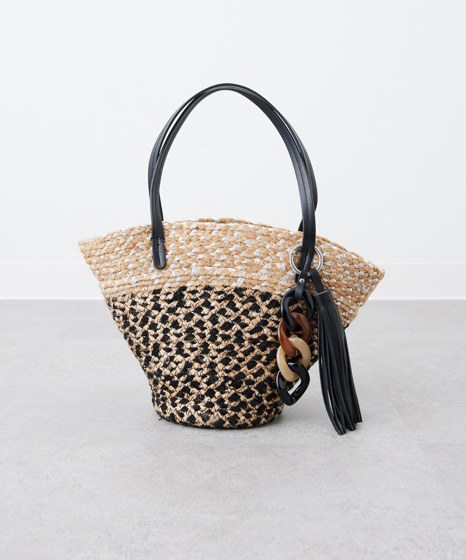 ポイントは大ぶり樹脂とタッセルパーツを使用したバッグチャーム。