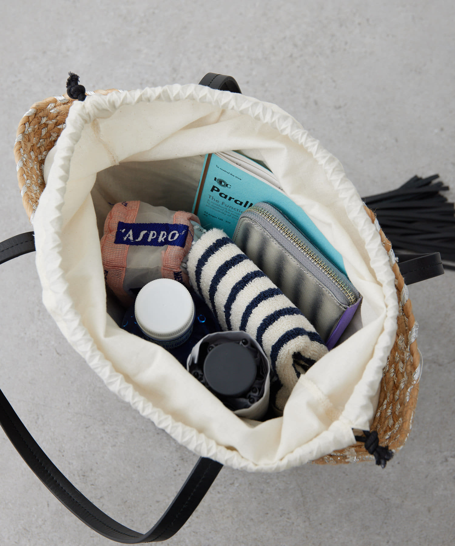 • 開口部には巾着が取り付けられているので荷物が見える心配なし