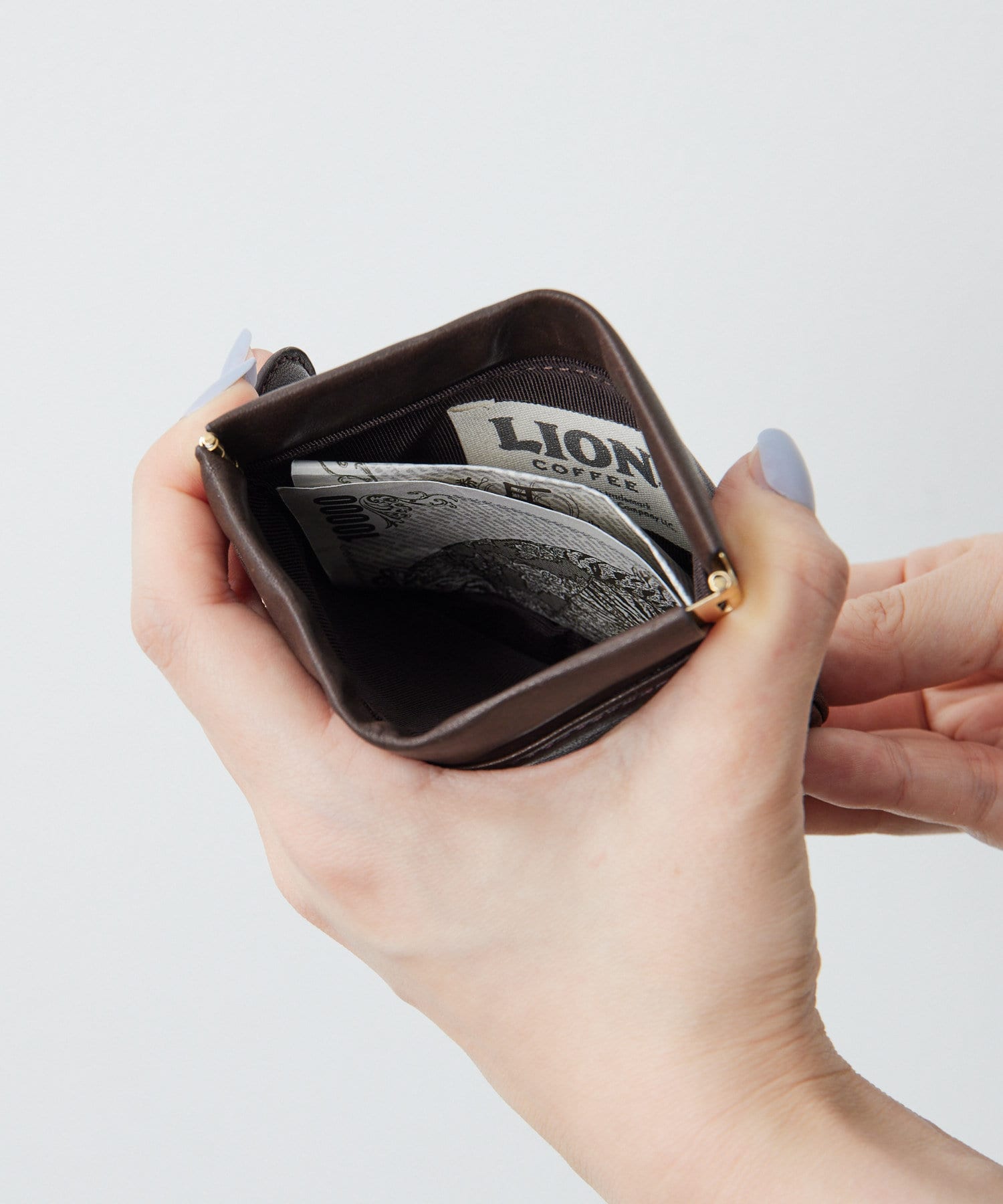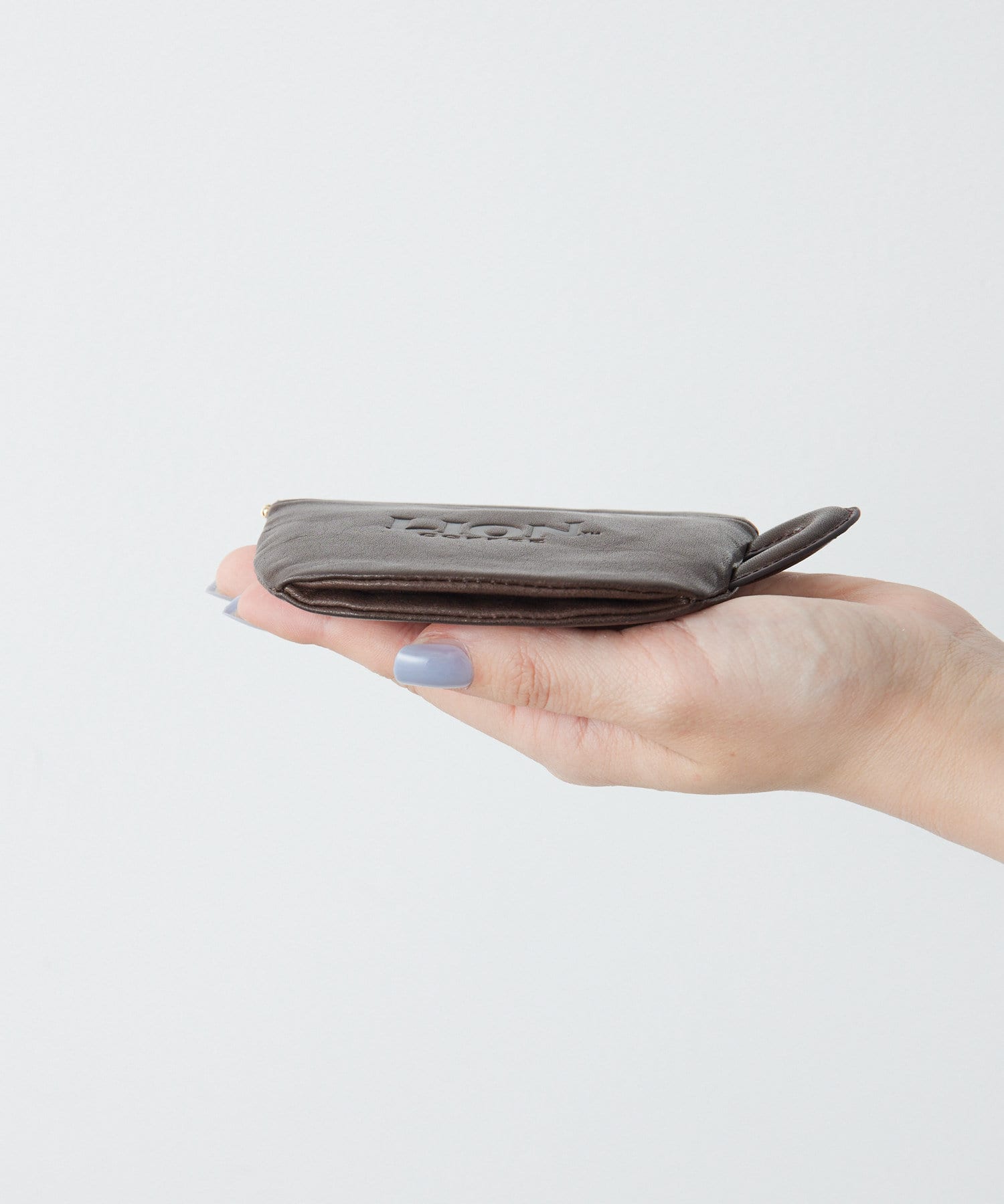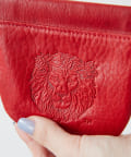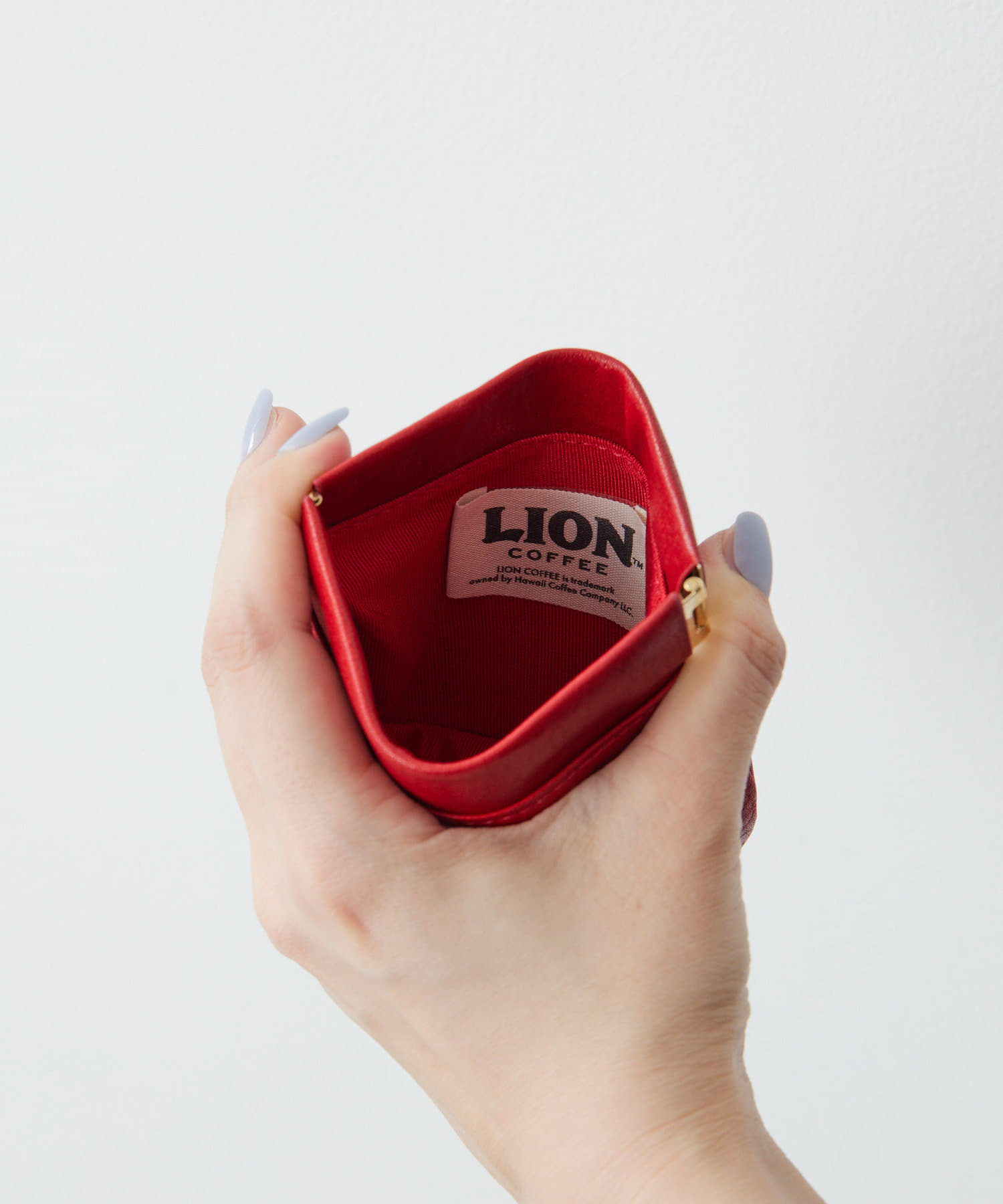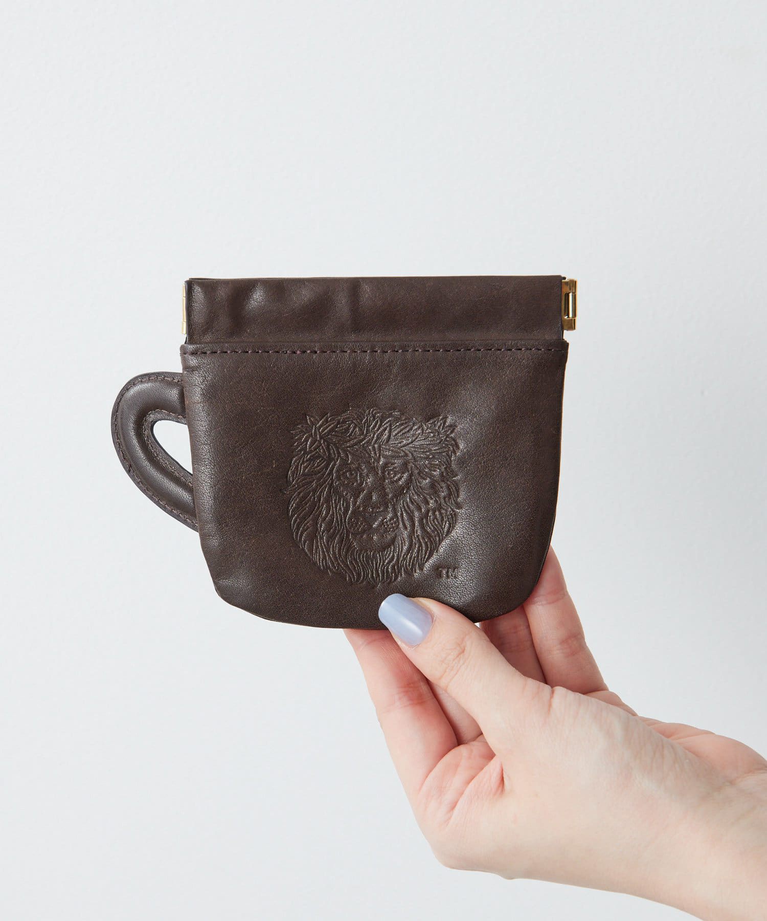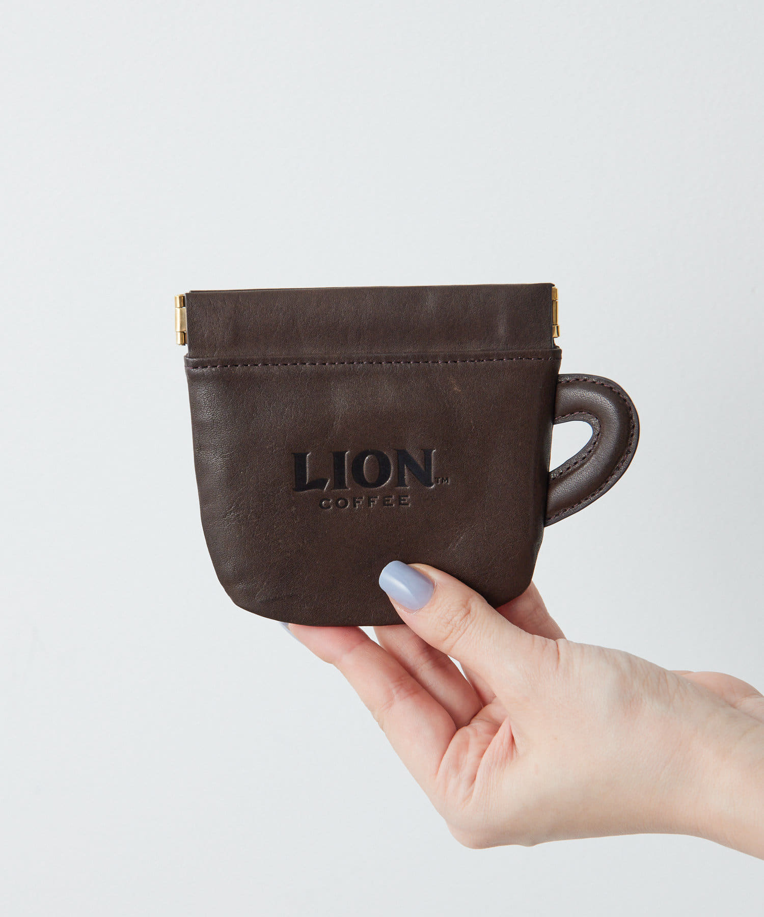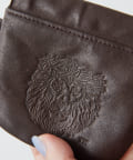 表面にはライオン、背面にはLION COFFEEのロゴが型押しでデザイン。