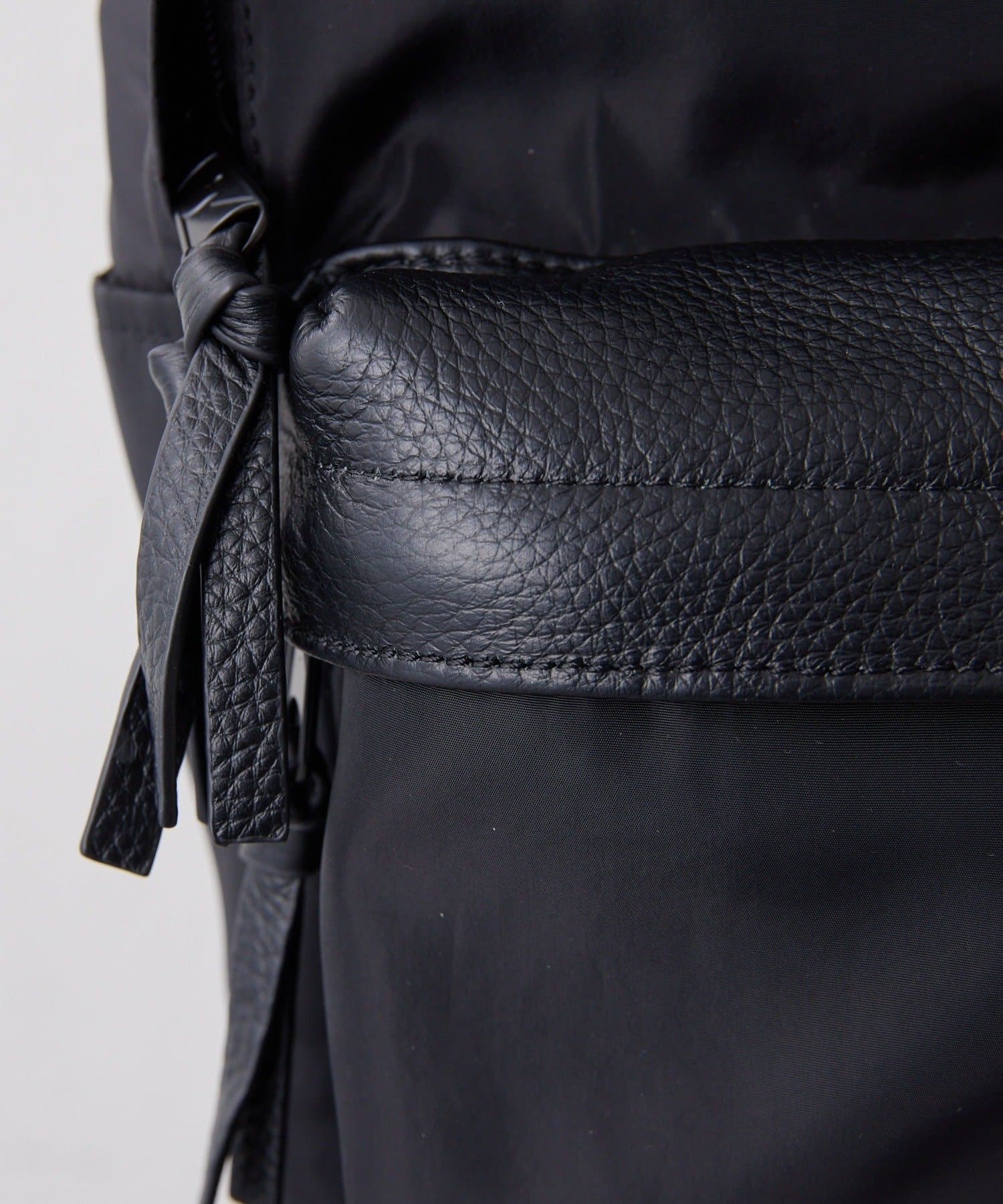 引き手と正面の立体ポケットには本革を使用し高級感もプラス。