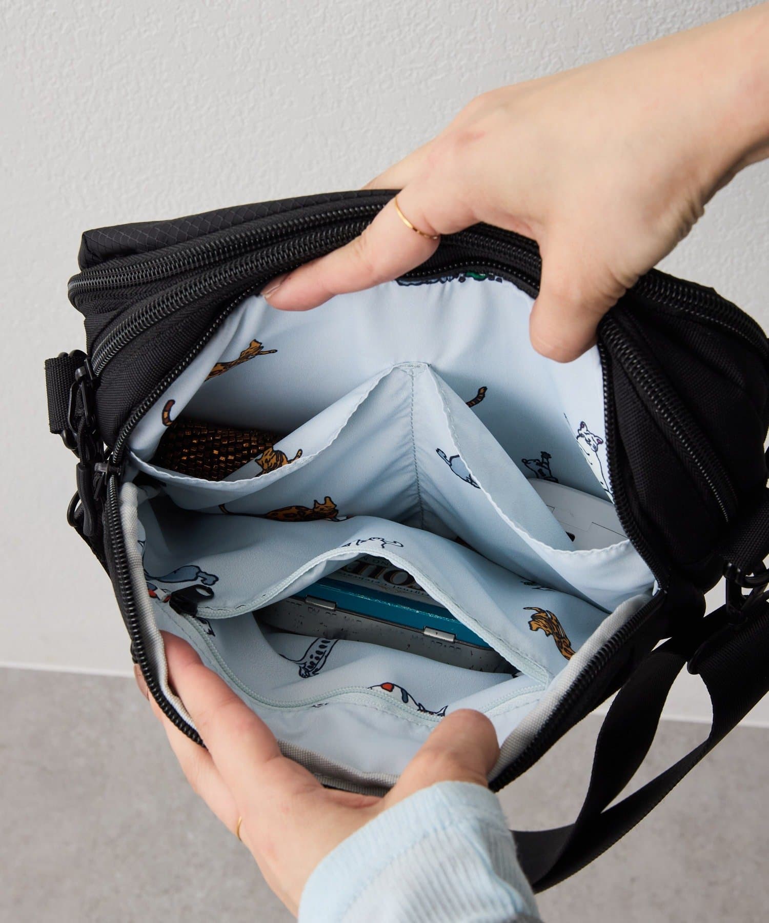 ・中を開けるとそれぞれ犬と猫のプリント生地を使用、裏地もかわいい