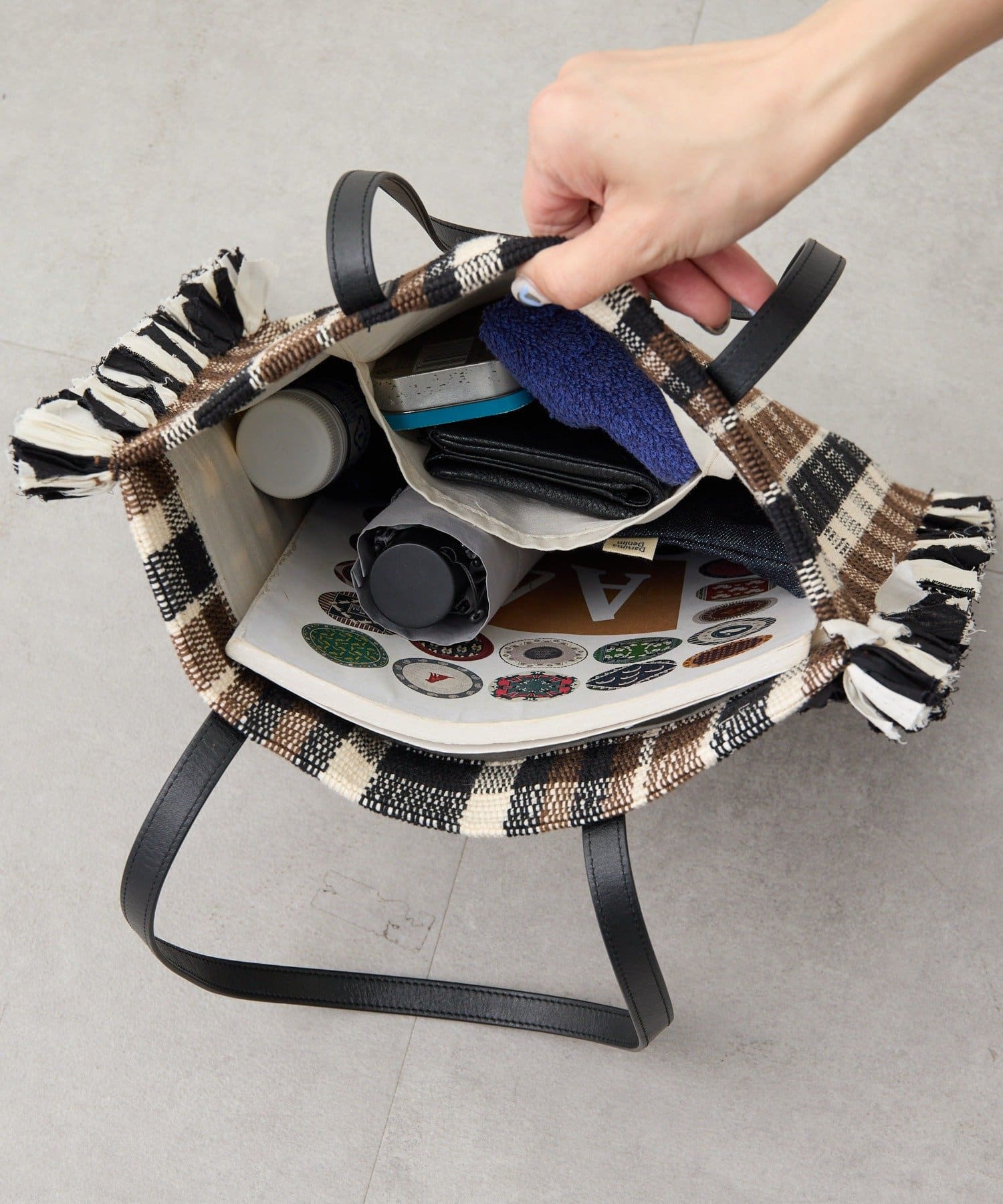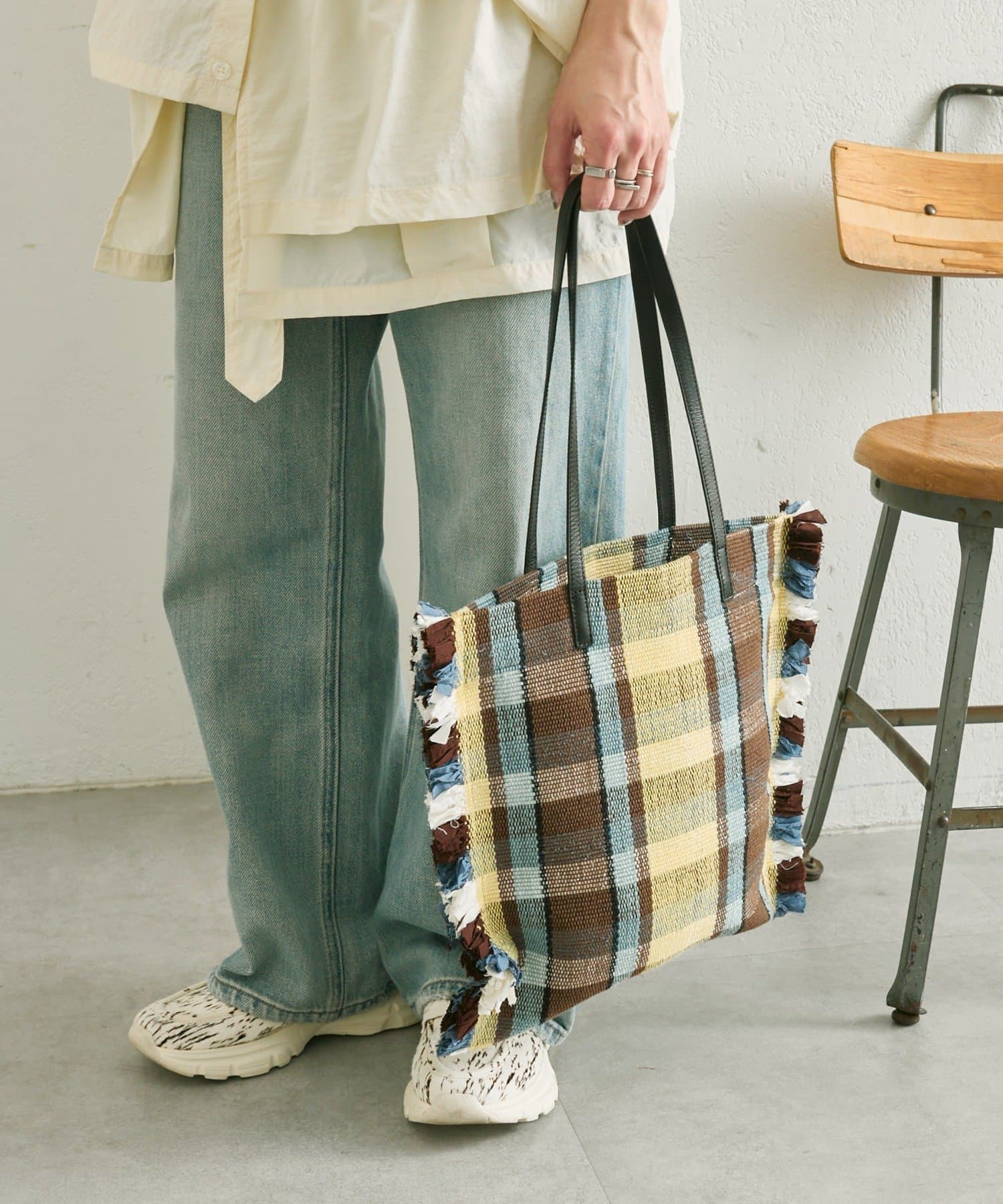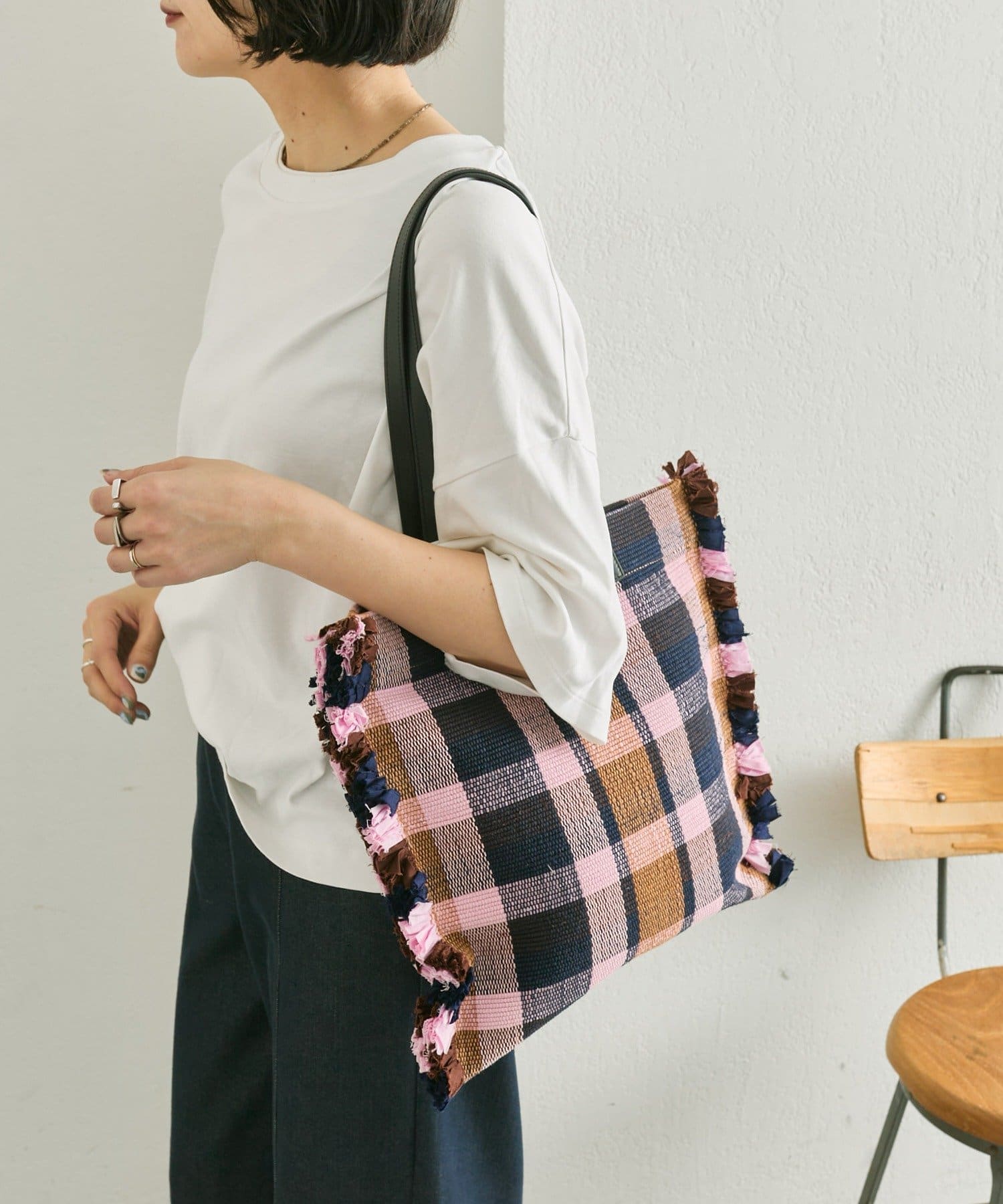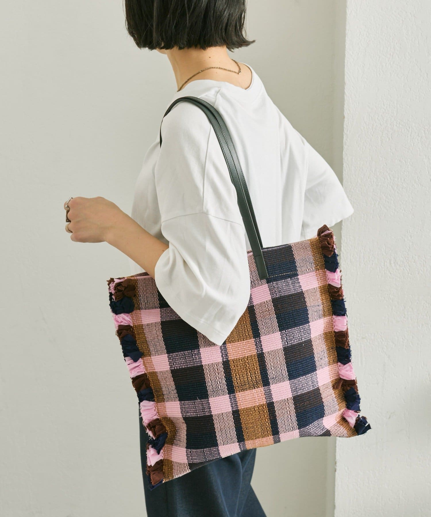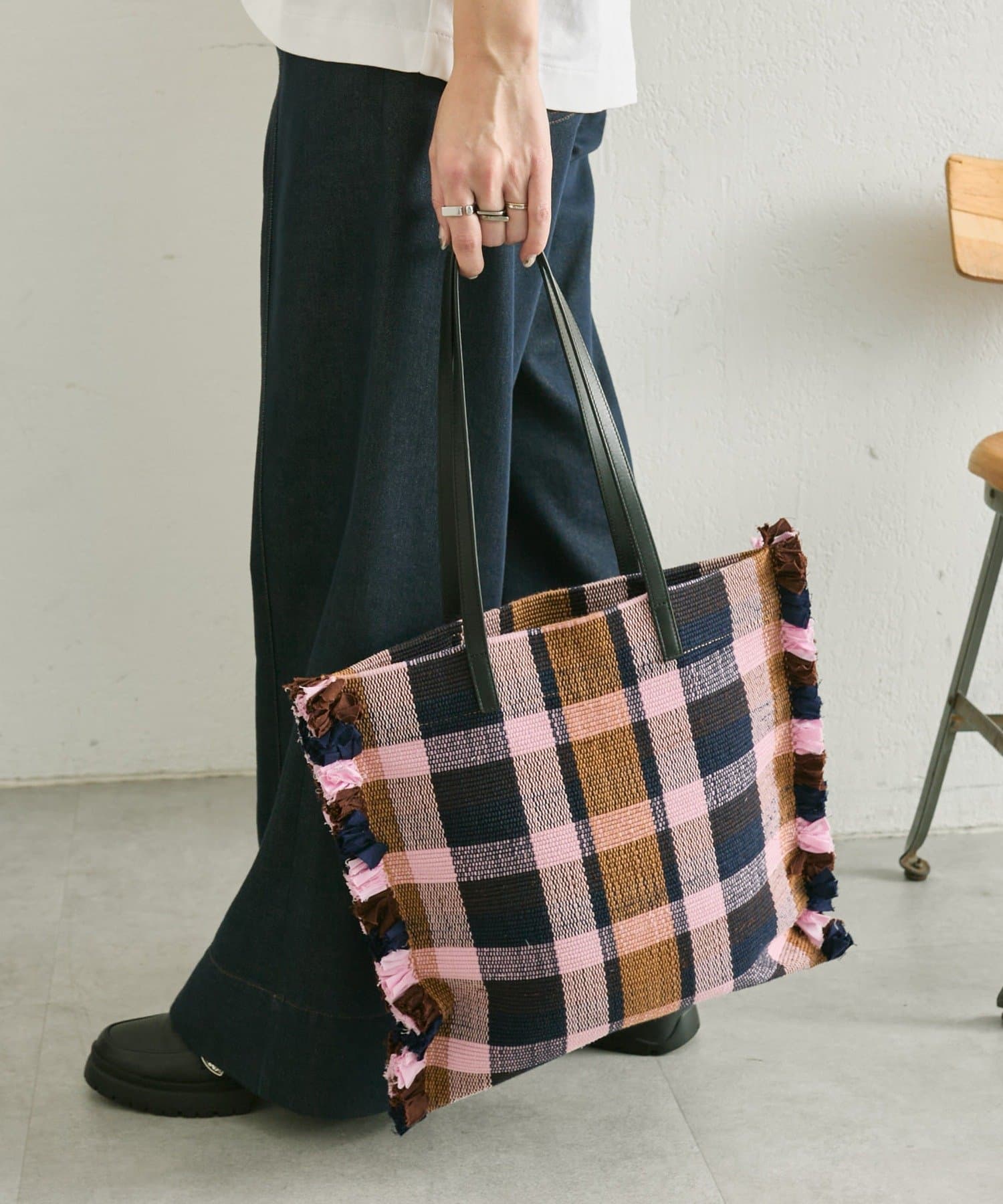 • 一段一段手織り機で織り上げたラグをトートバッグに