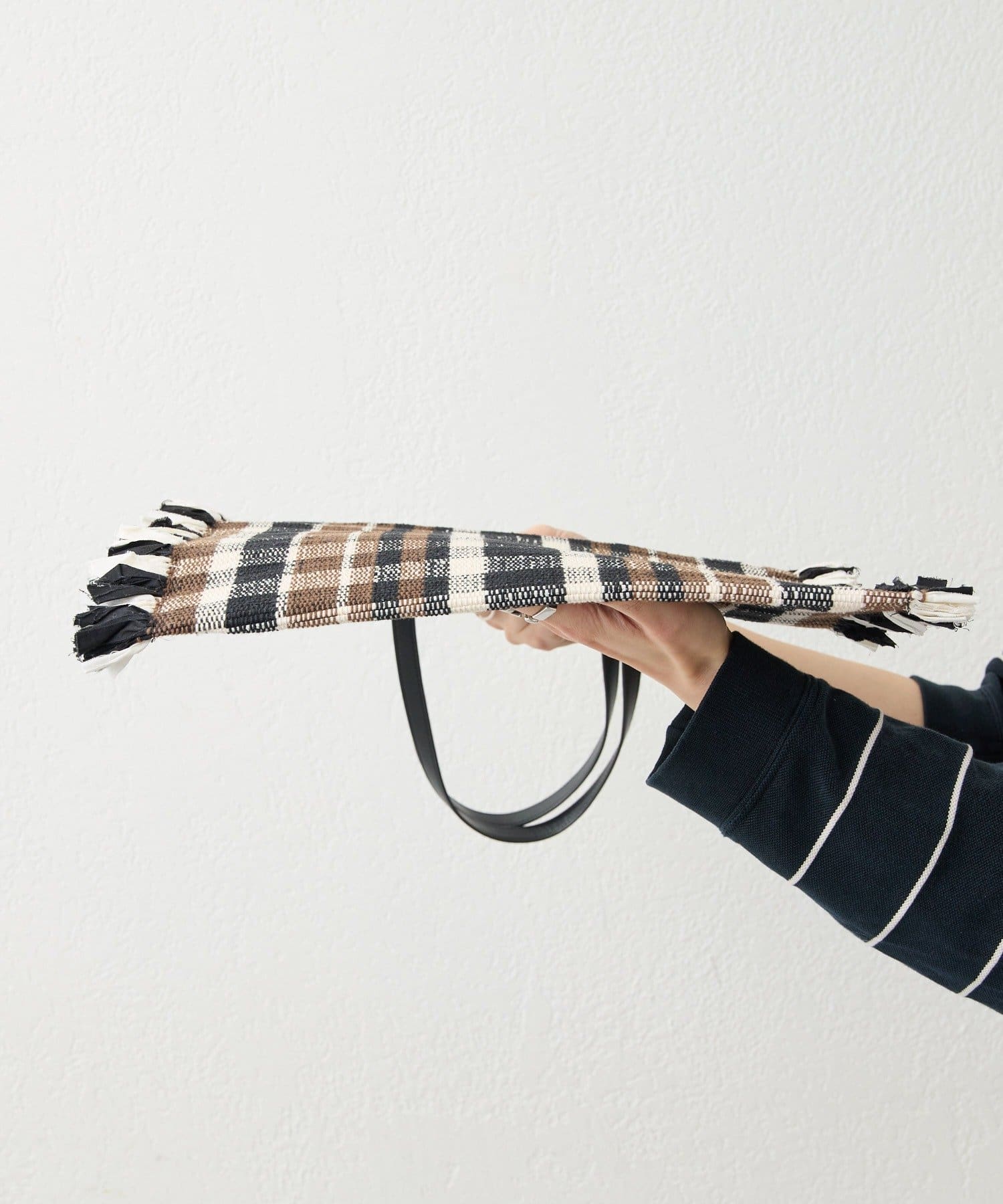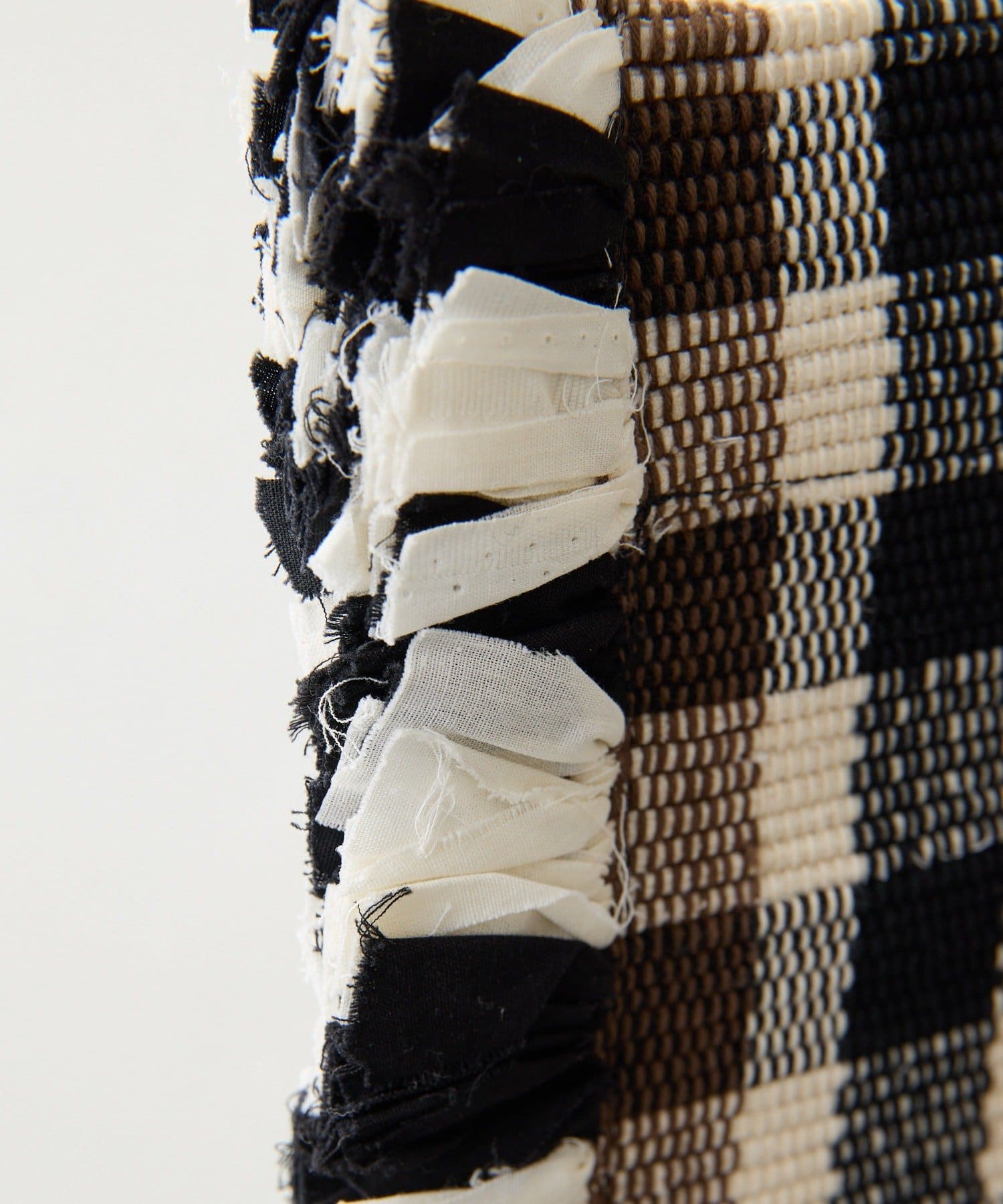 横糸には生地を引き裂いたものを使用し、端の部分は断ち切りのフリンジのデザインに仕上げています。