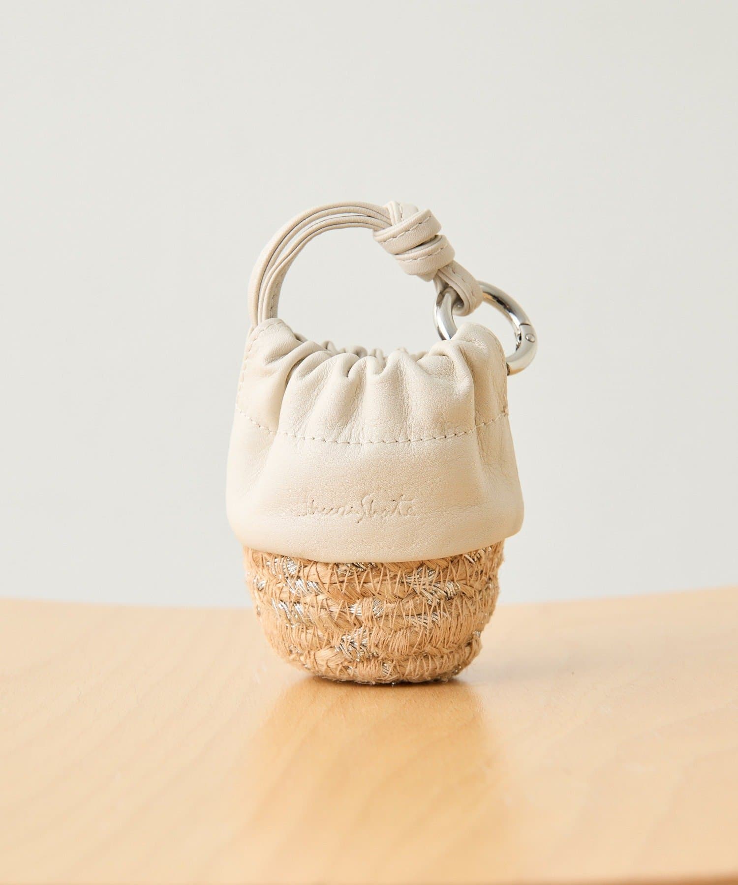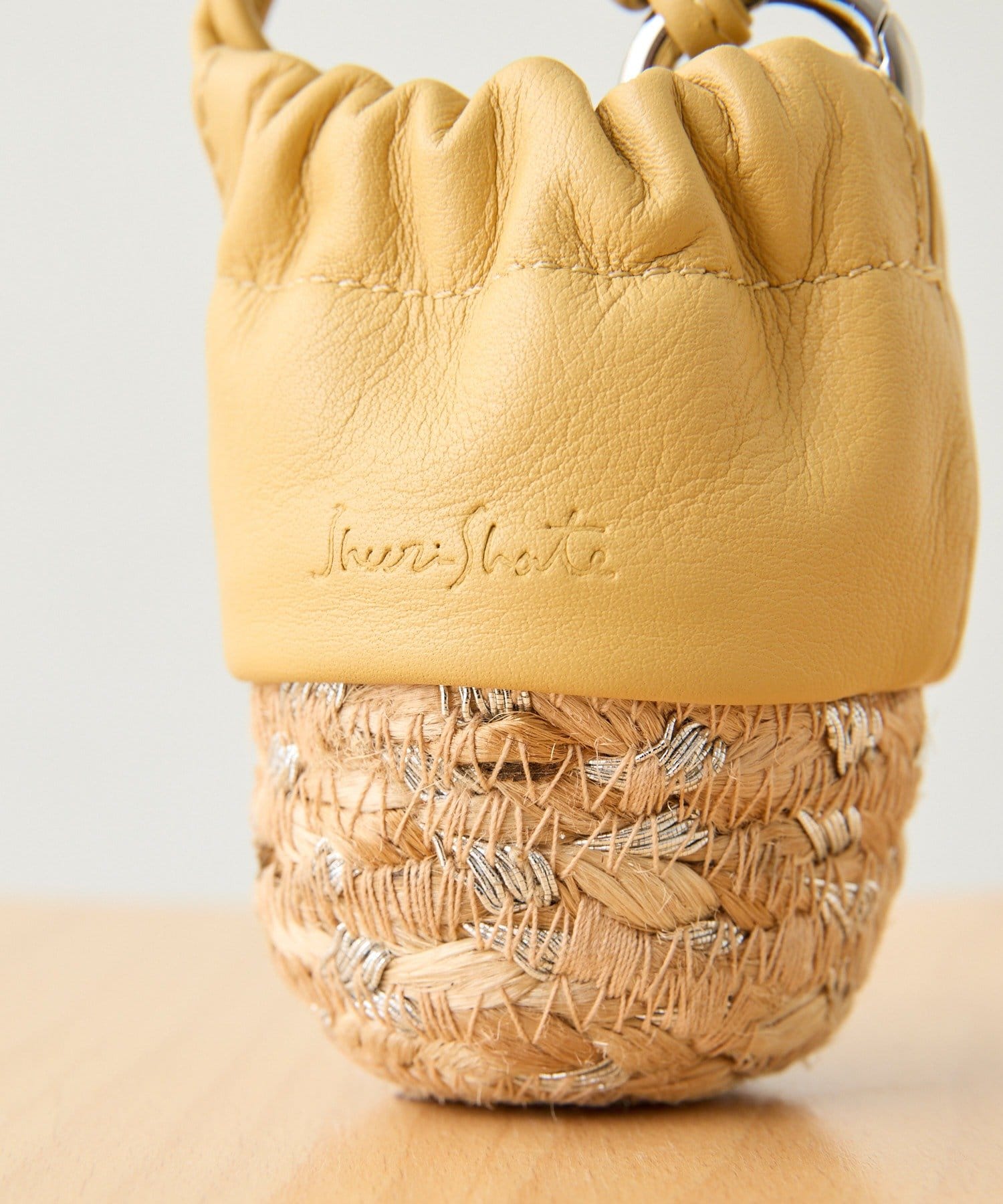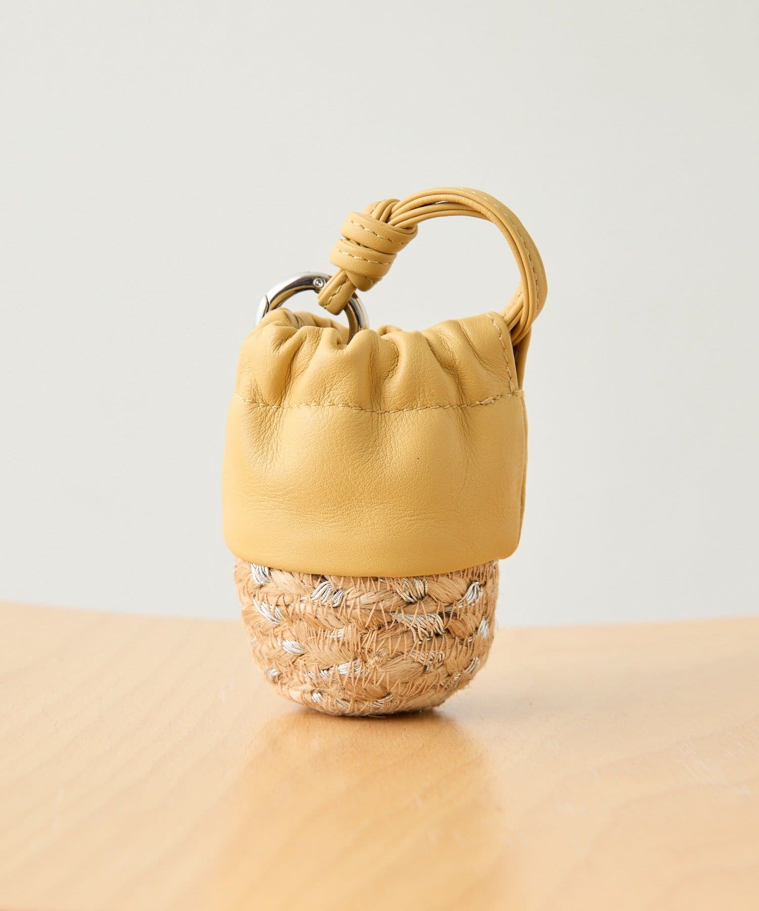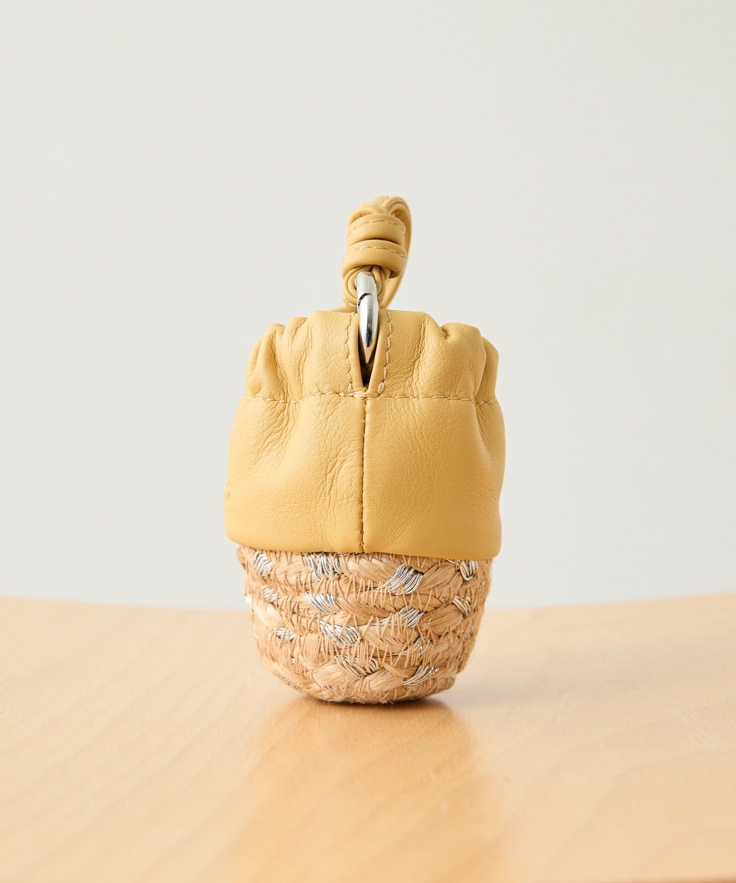 ジュート素材のかごにレザー巾着を組み合わせたデザイン。