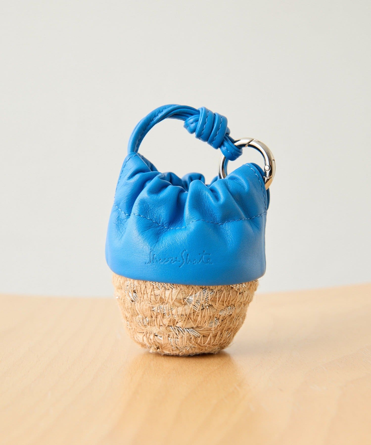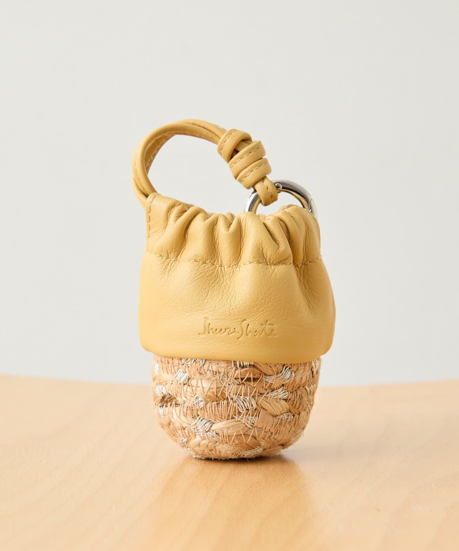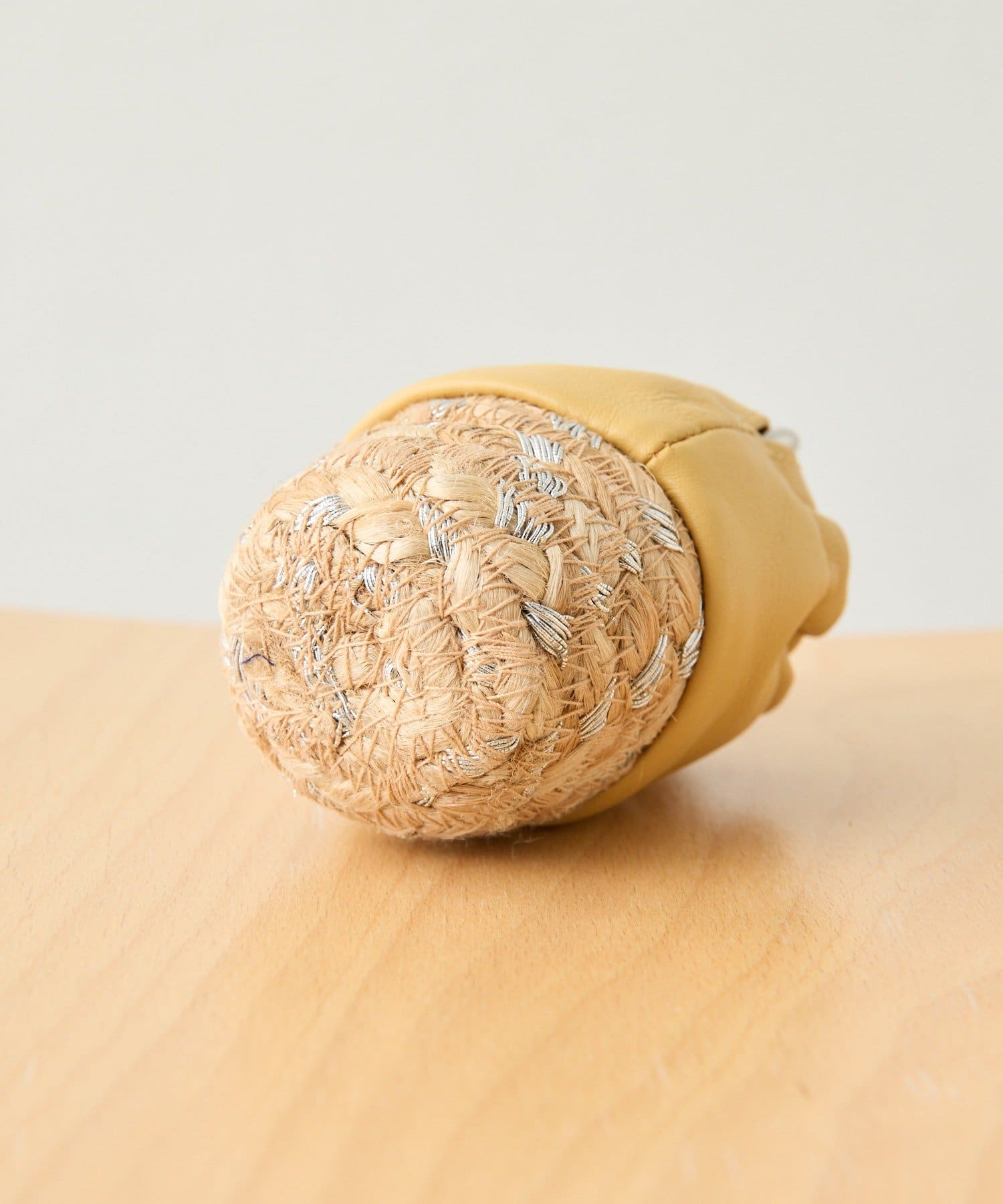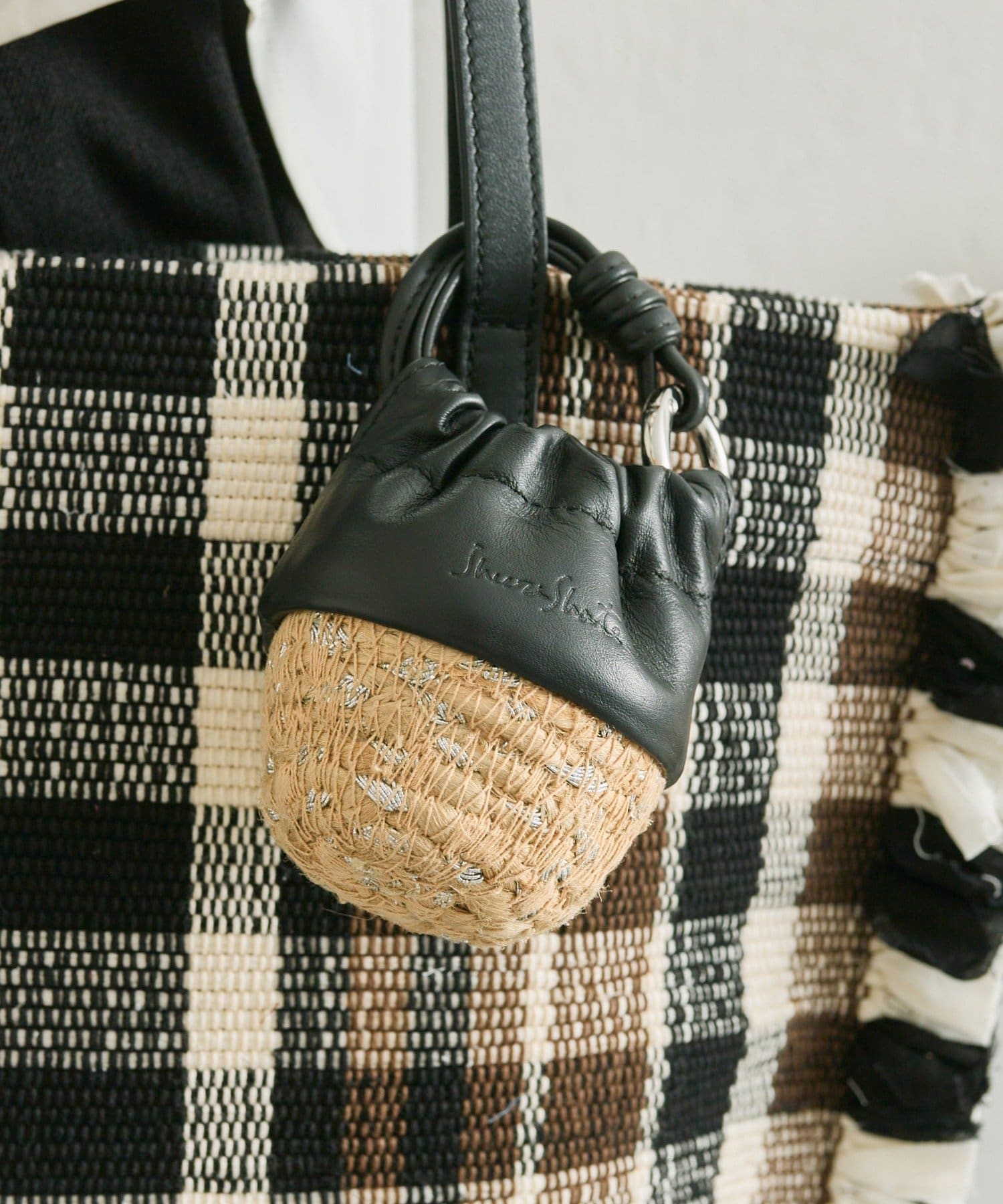 ジュート素材のかごにレザー巾着を組み合わせたデザイン。