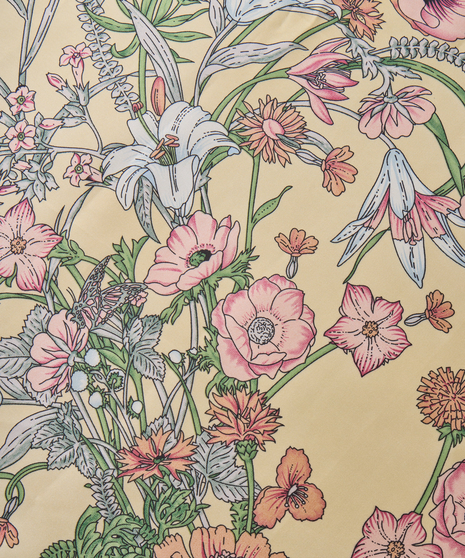 生地が柔らかくて普通にスカーフに使うと気持ちいいです。淡い黄色地の花柄でとても綺麗です。