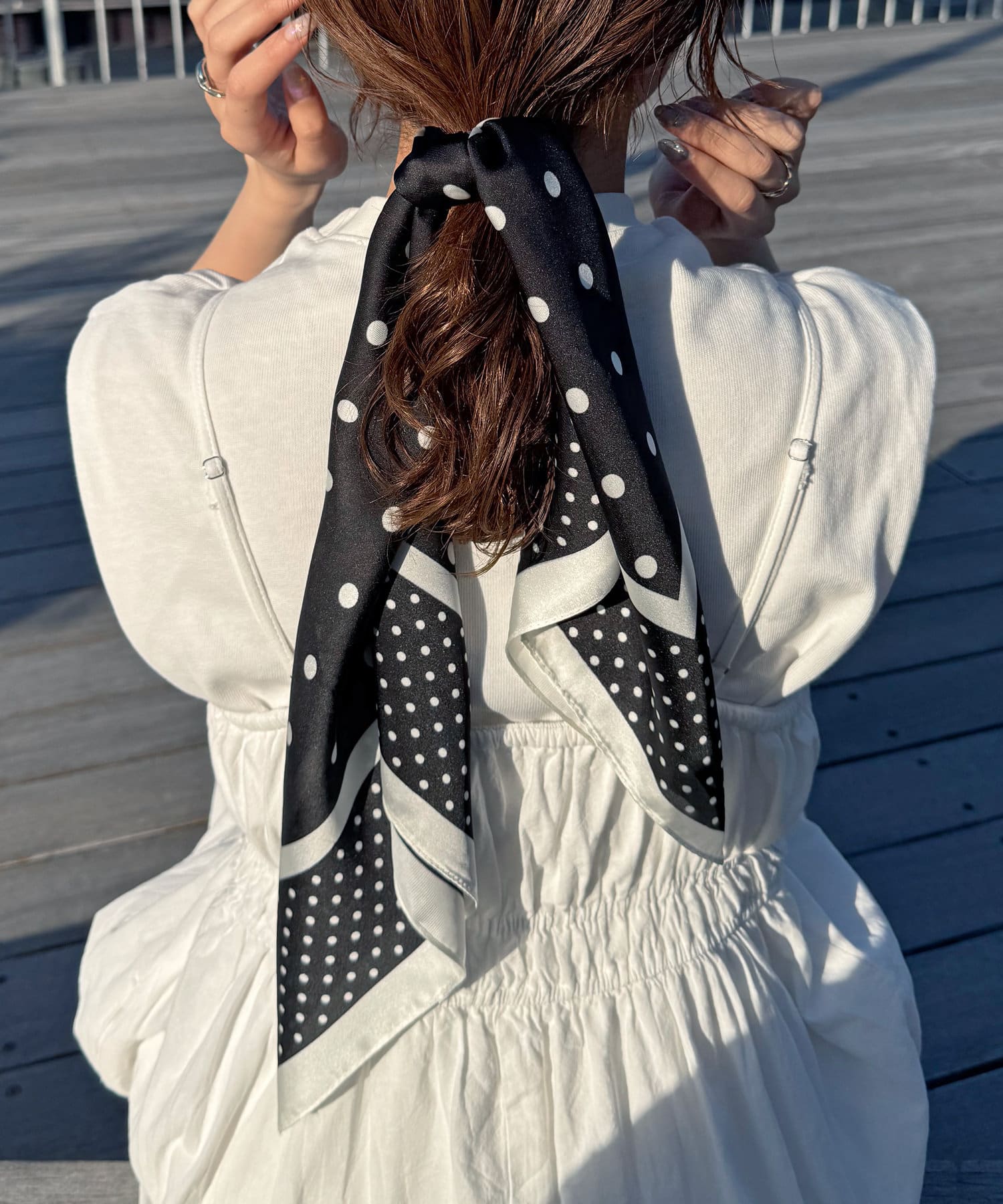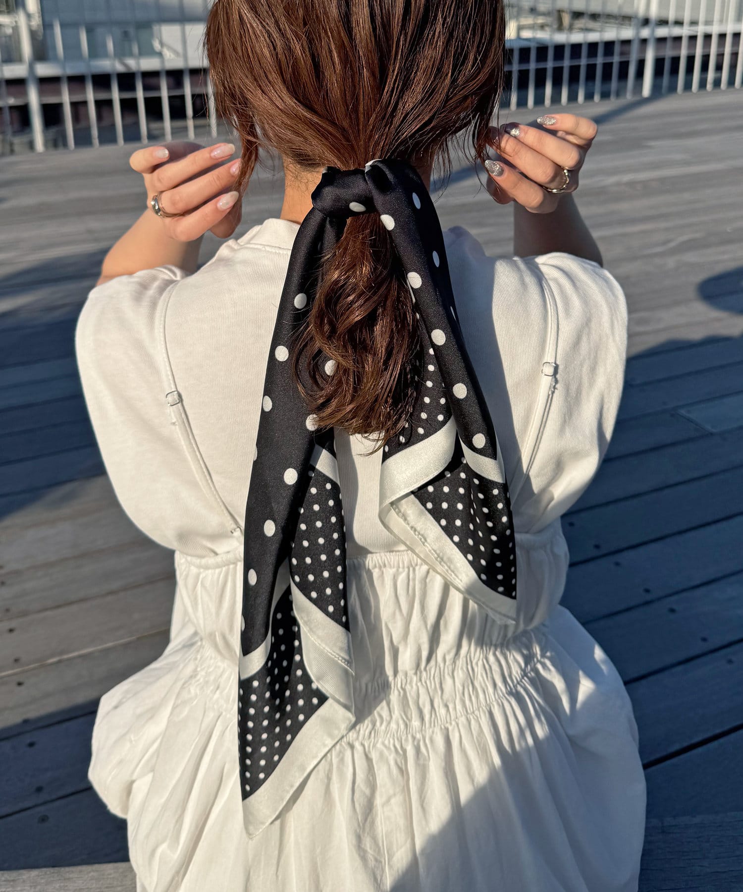 顔周りにはもちろん、バッグに巻いても可愛いです!