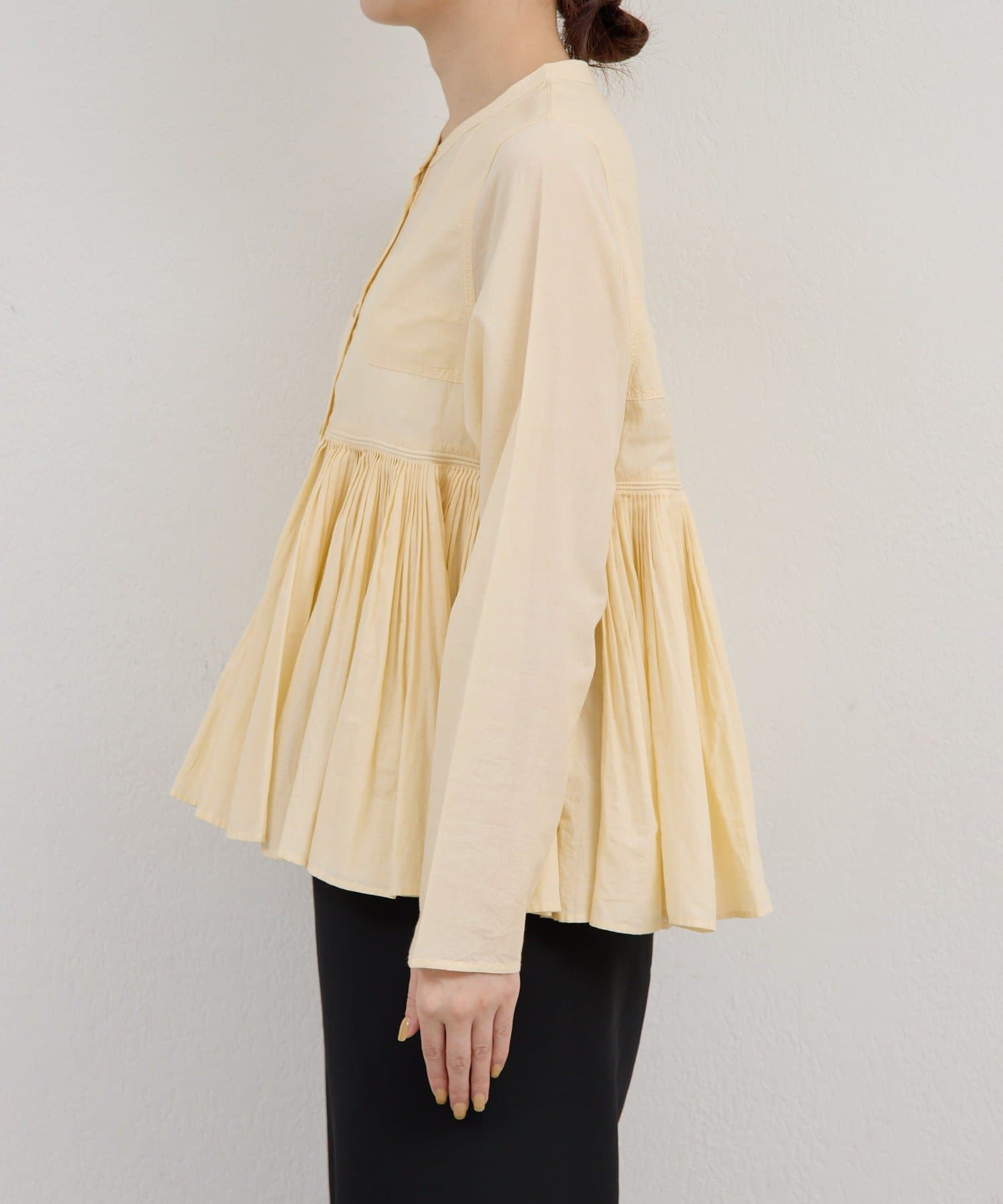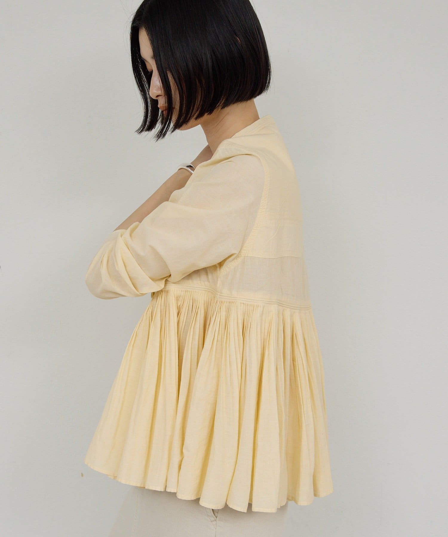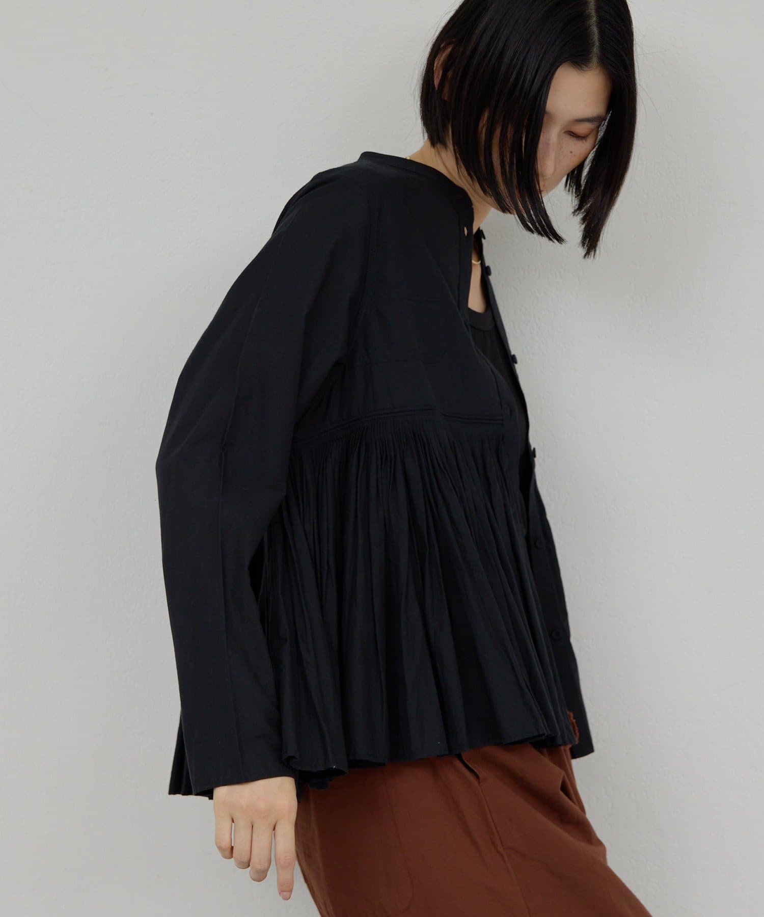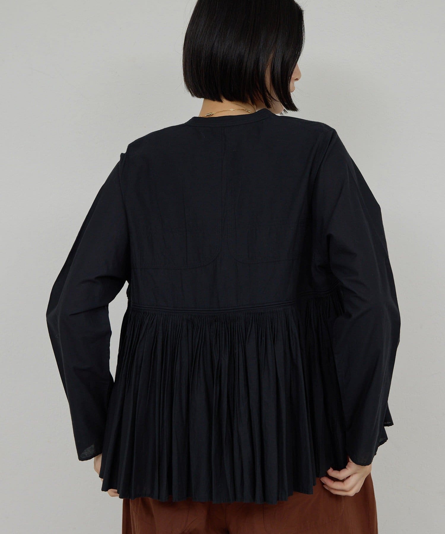 ●細やかなタックが施された、モードなブラウス。