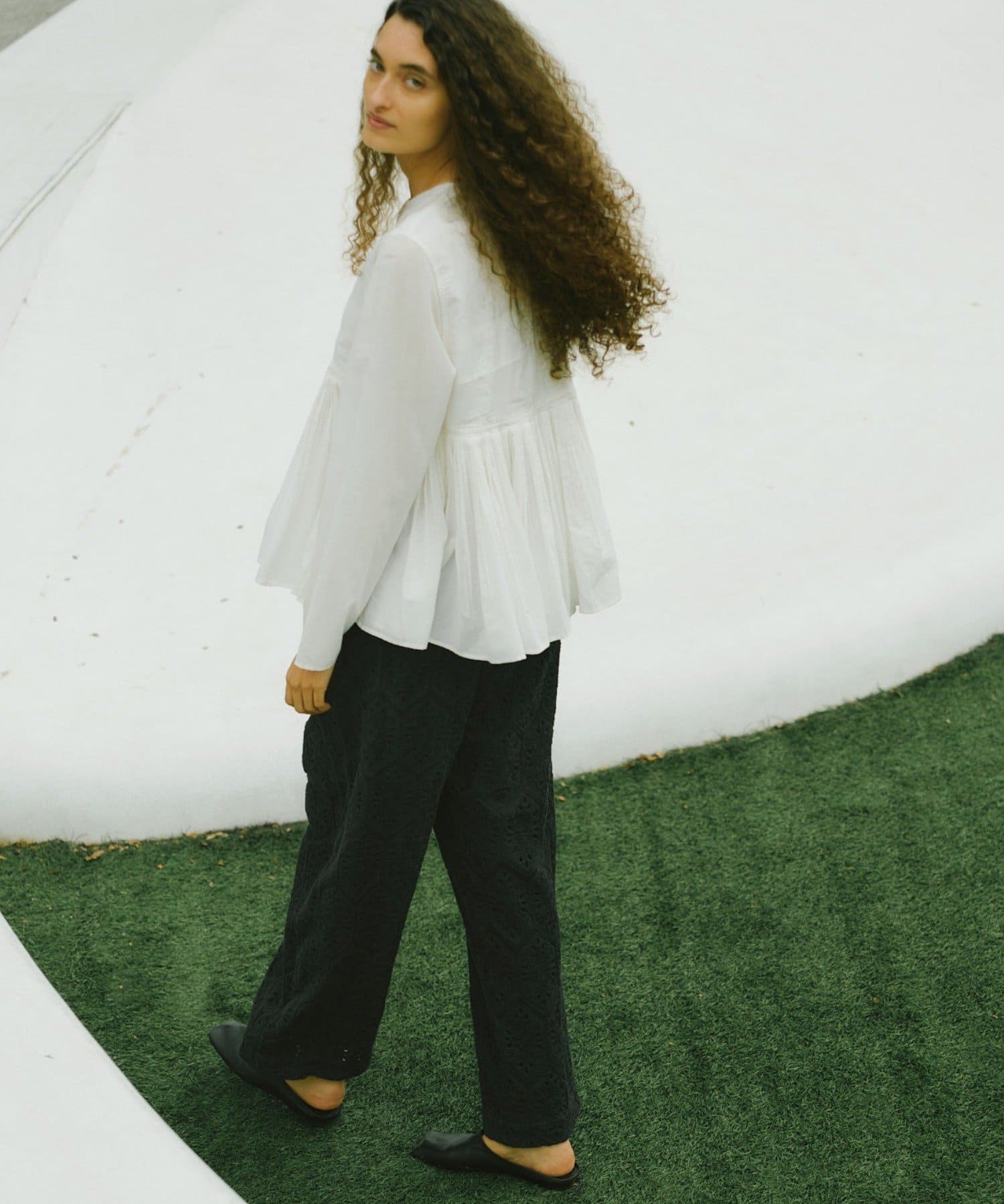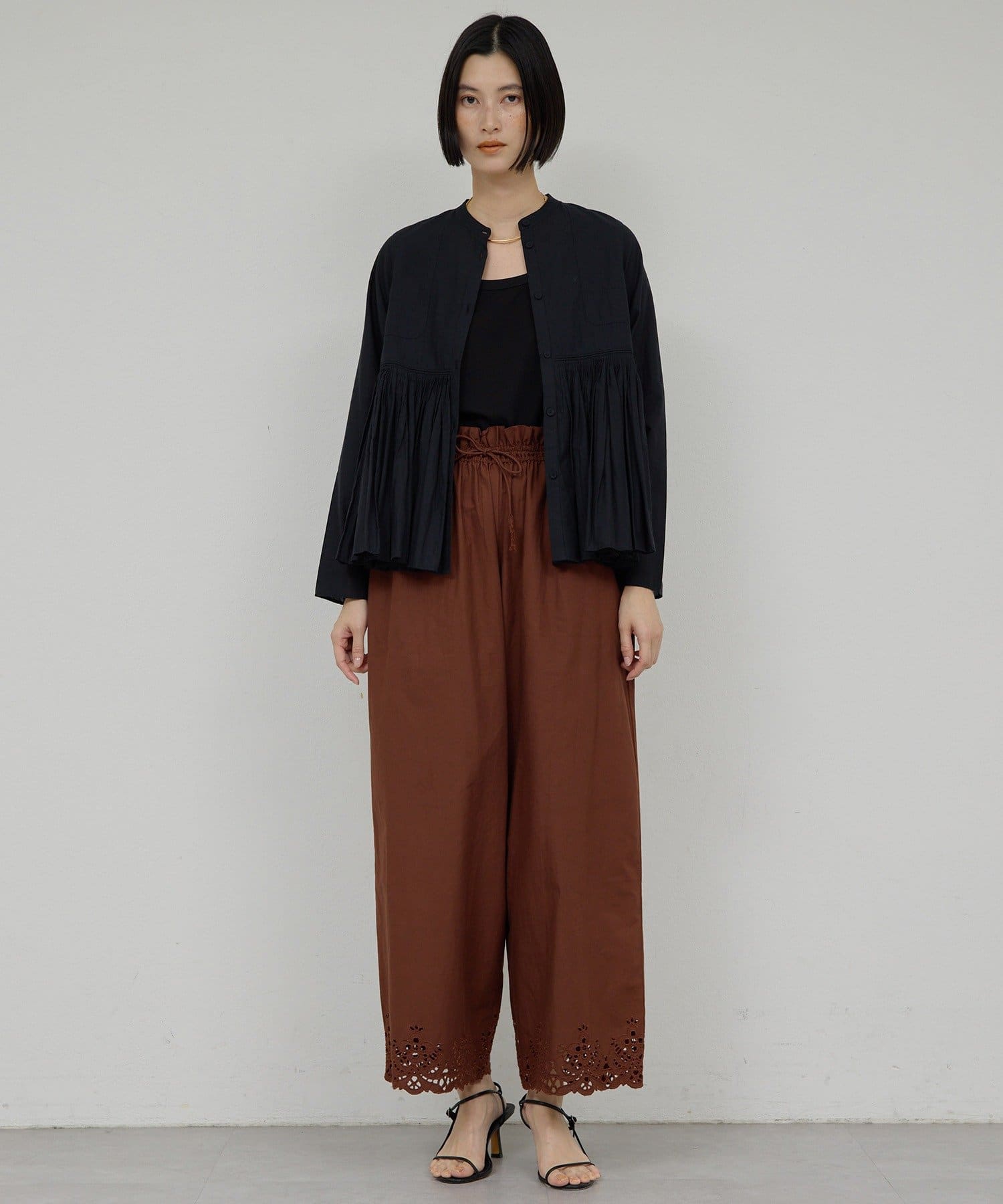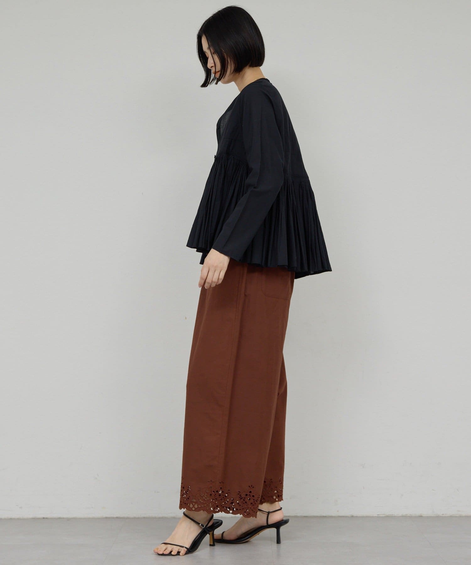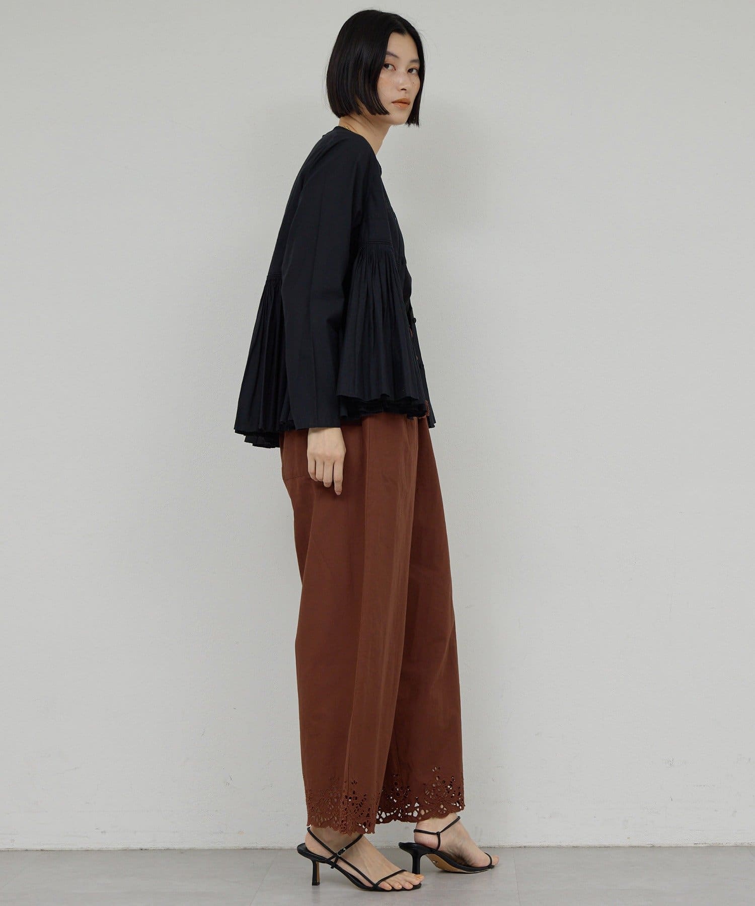 ●細やかなタックが施された、モードなブラウス。