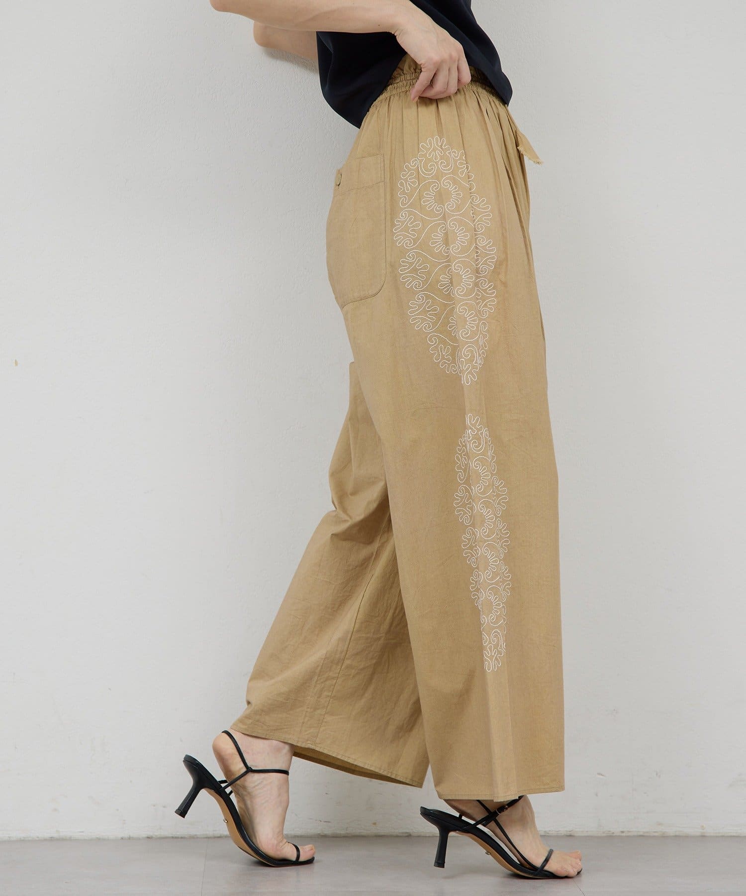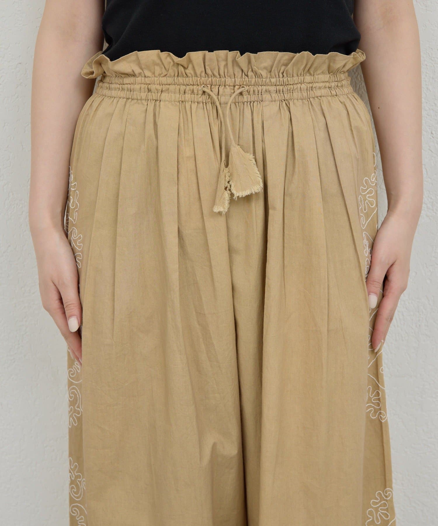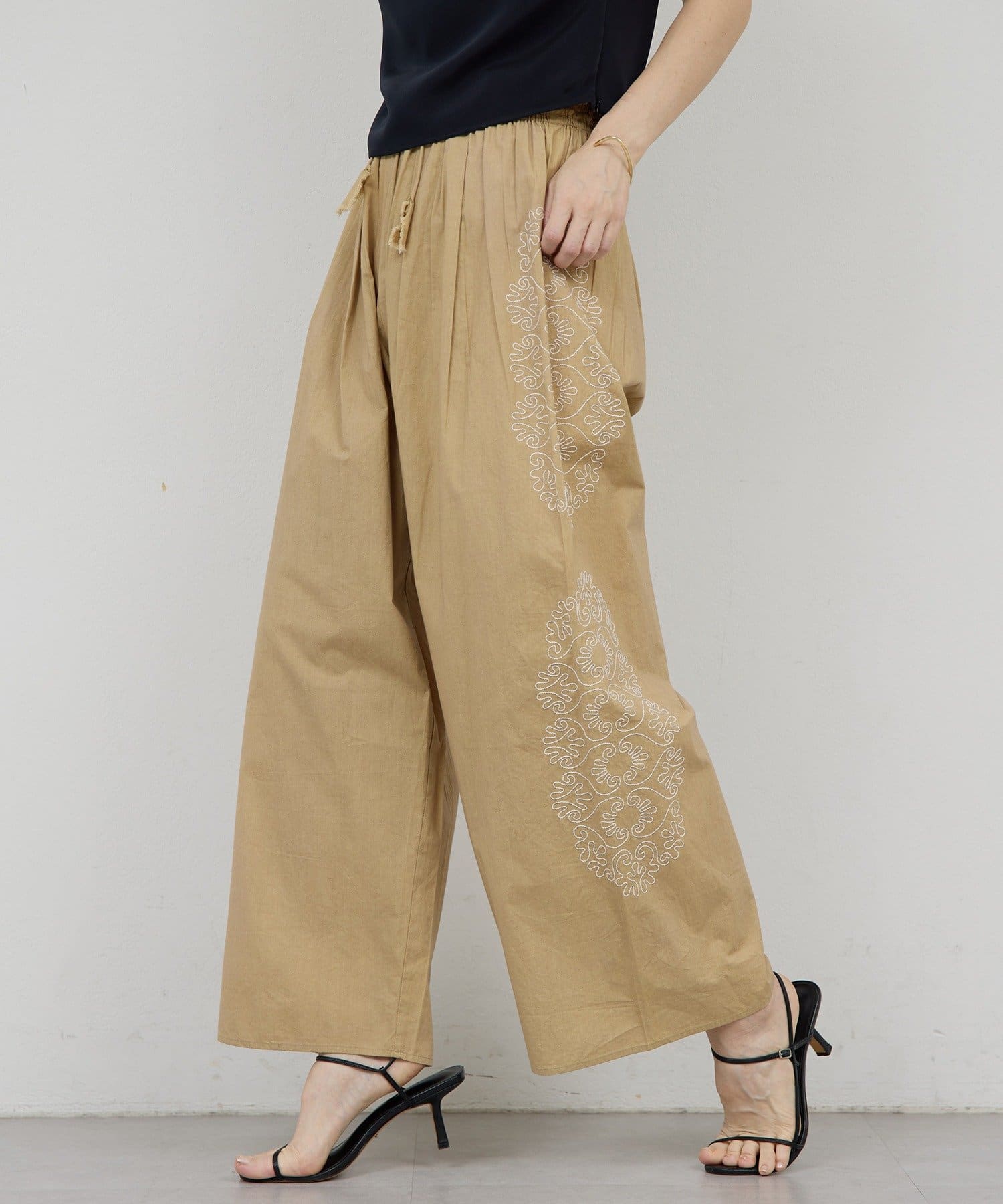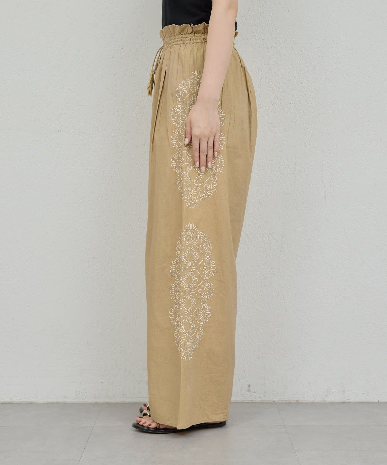 サイドに広がる刺繍が美しいワイドパンツ