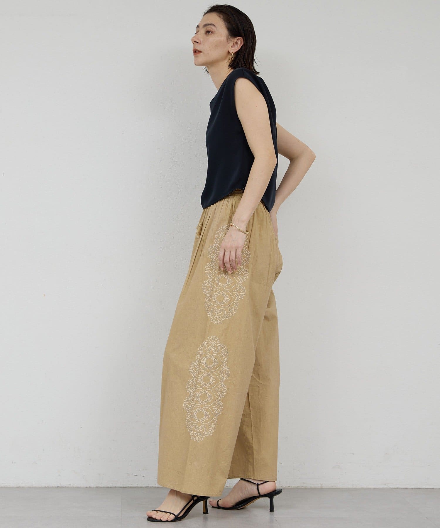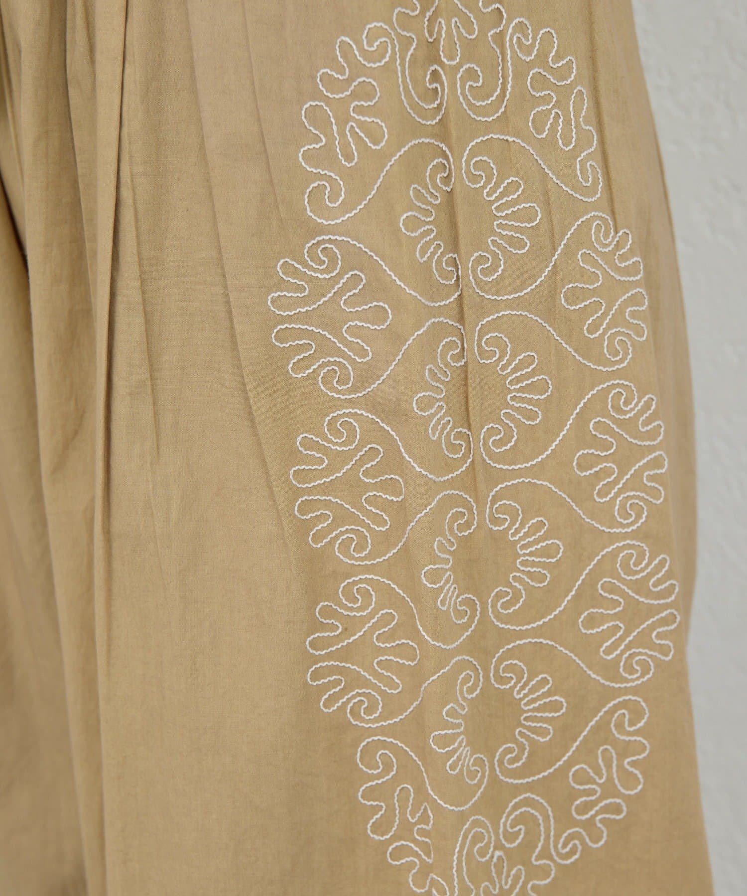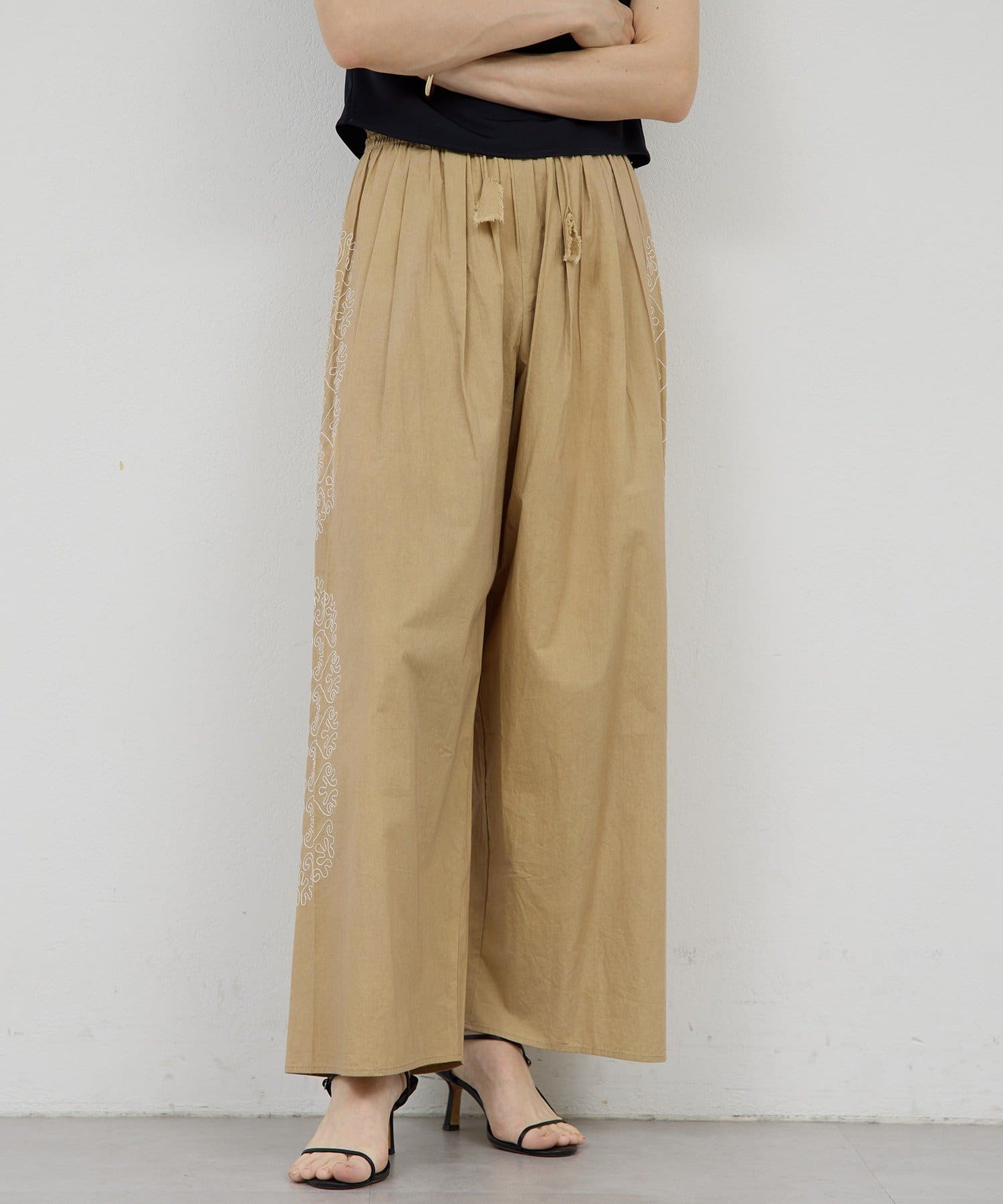 サイドに広がる刺繍が美しいワイドパンツ