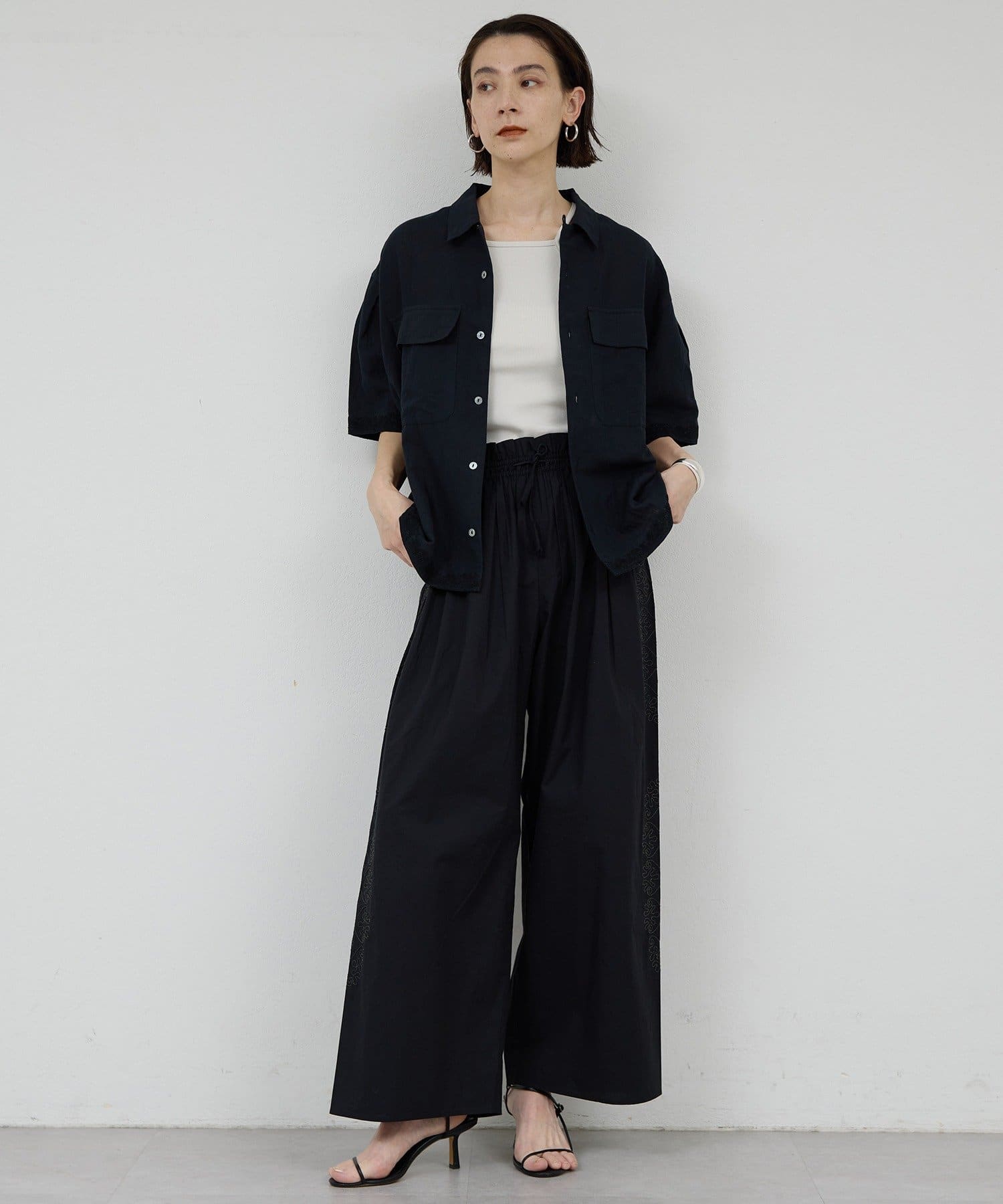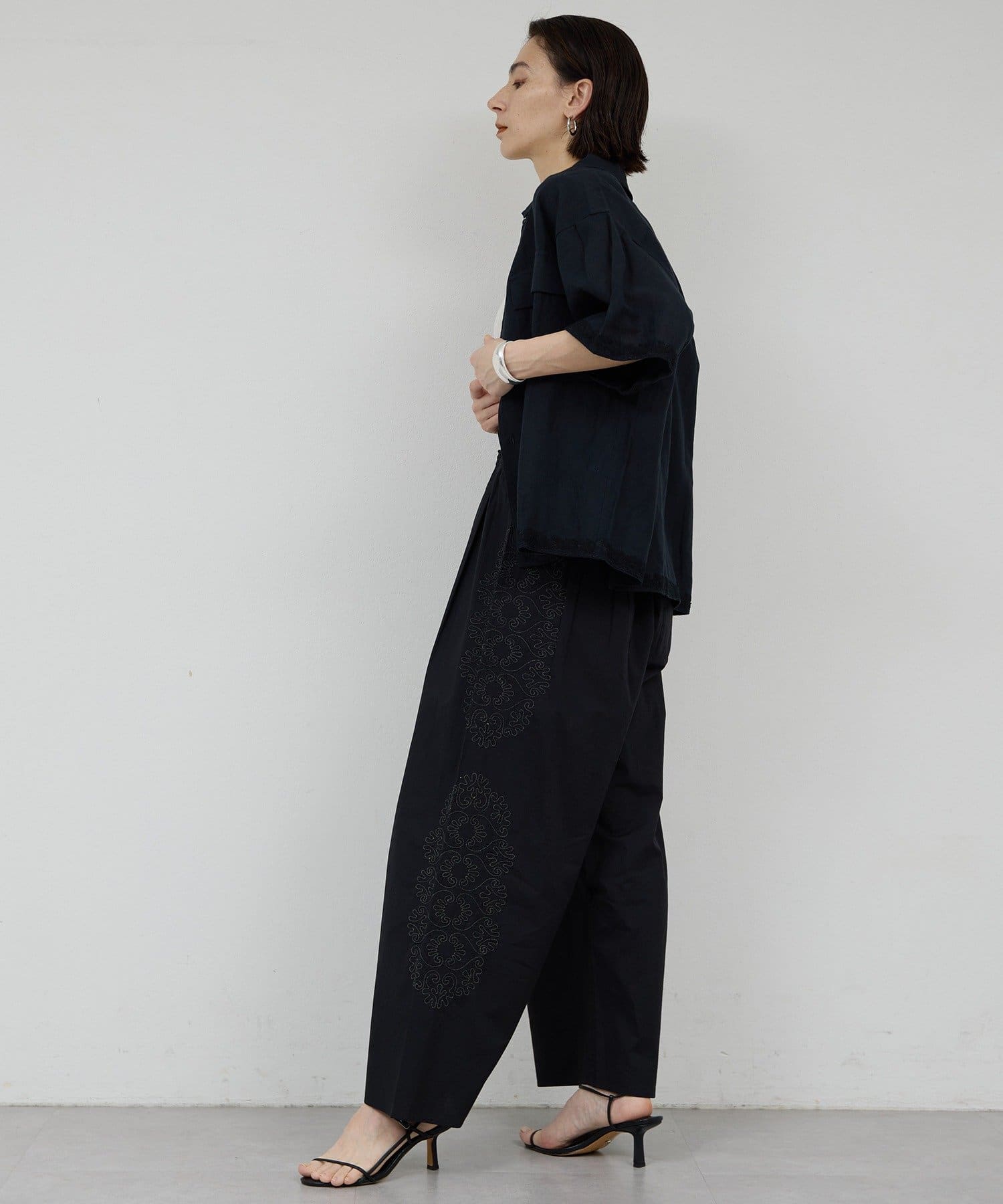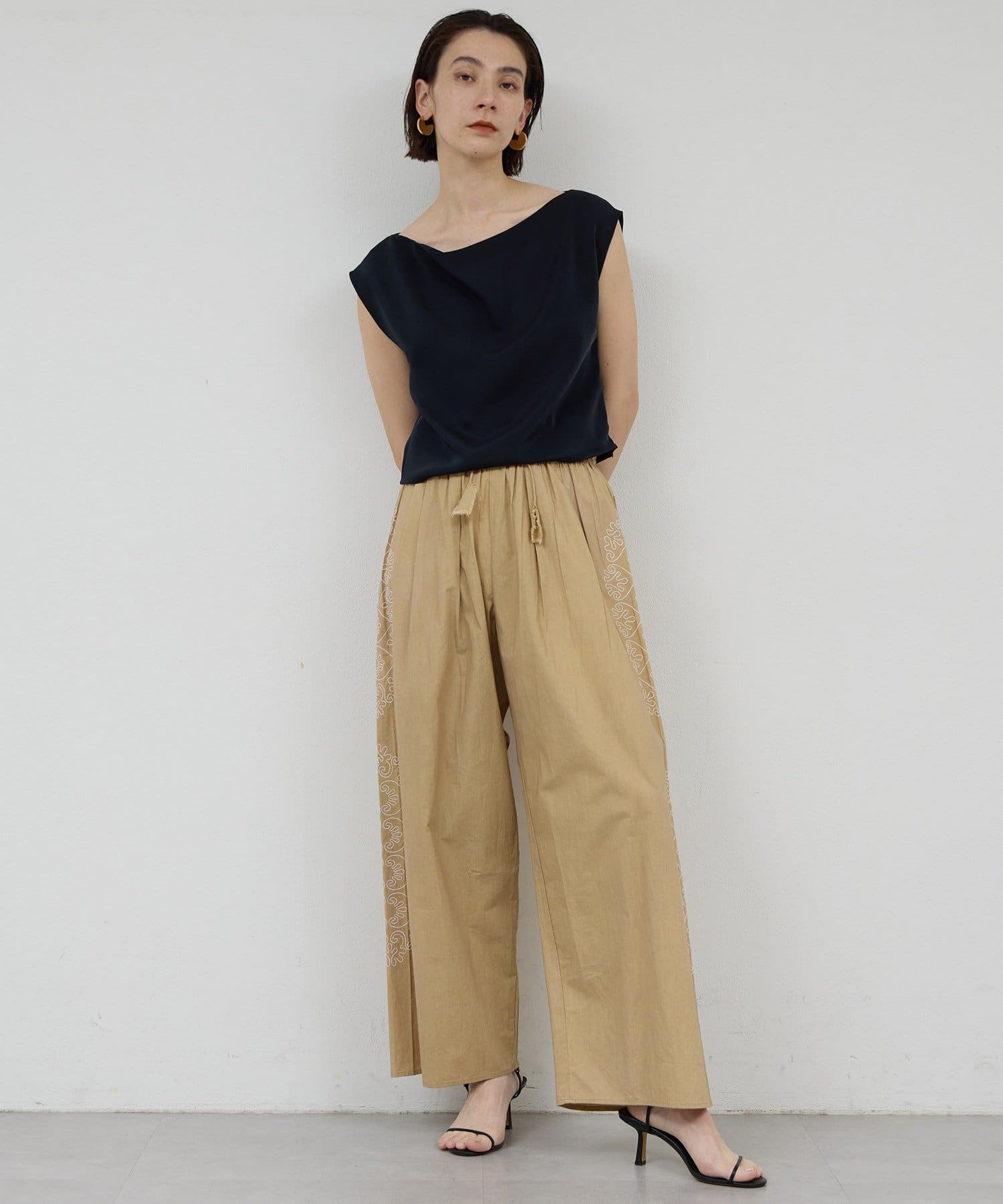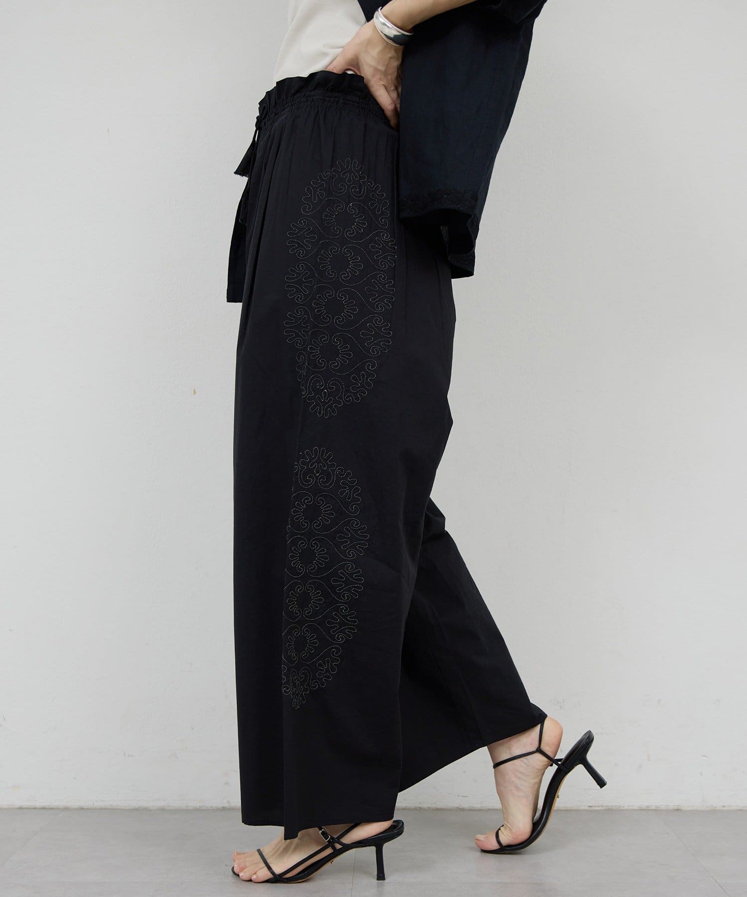 サイドに広がる刺繍が美しいワイドパンツ