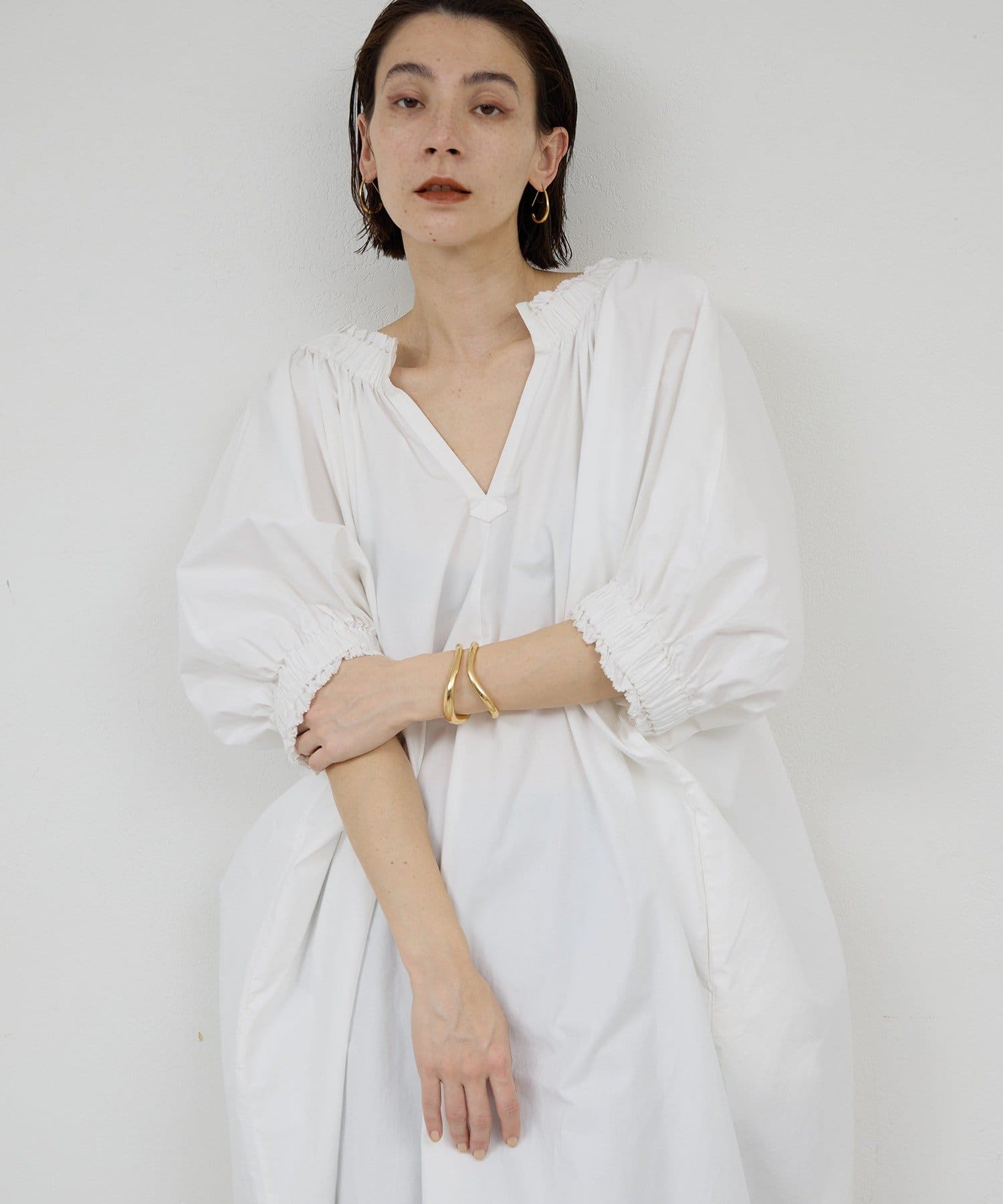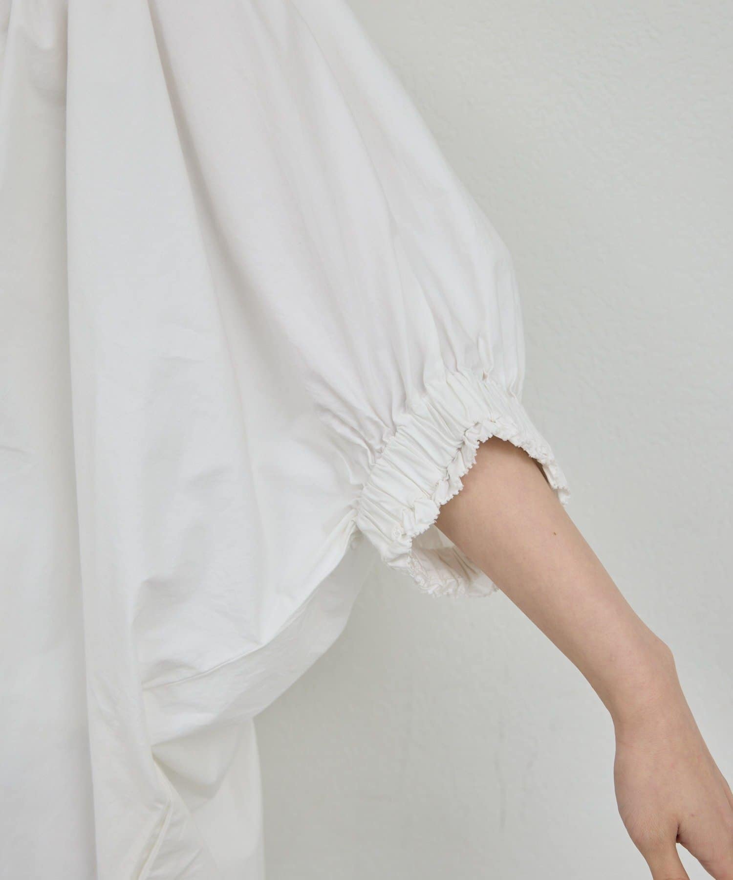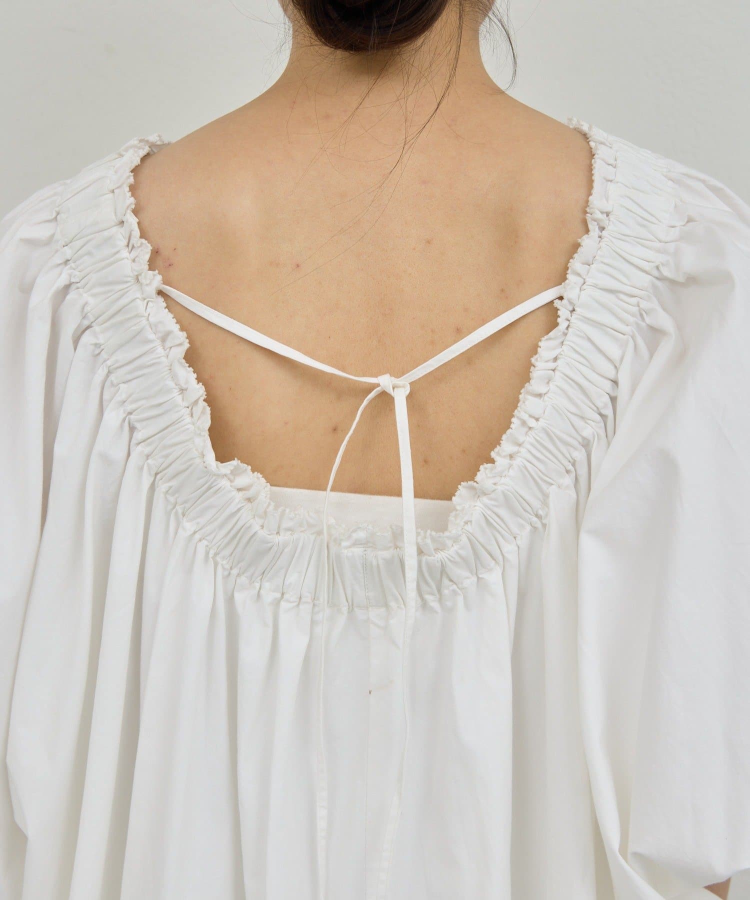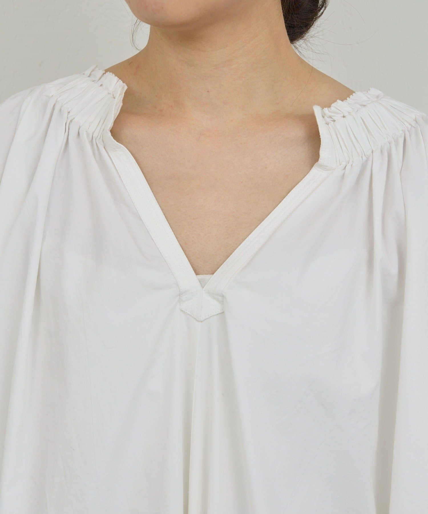 ●ネック周りと袖口にギャザーを施した、立体的な美しいシルエット。