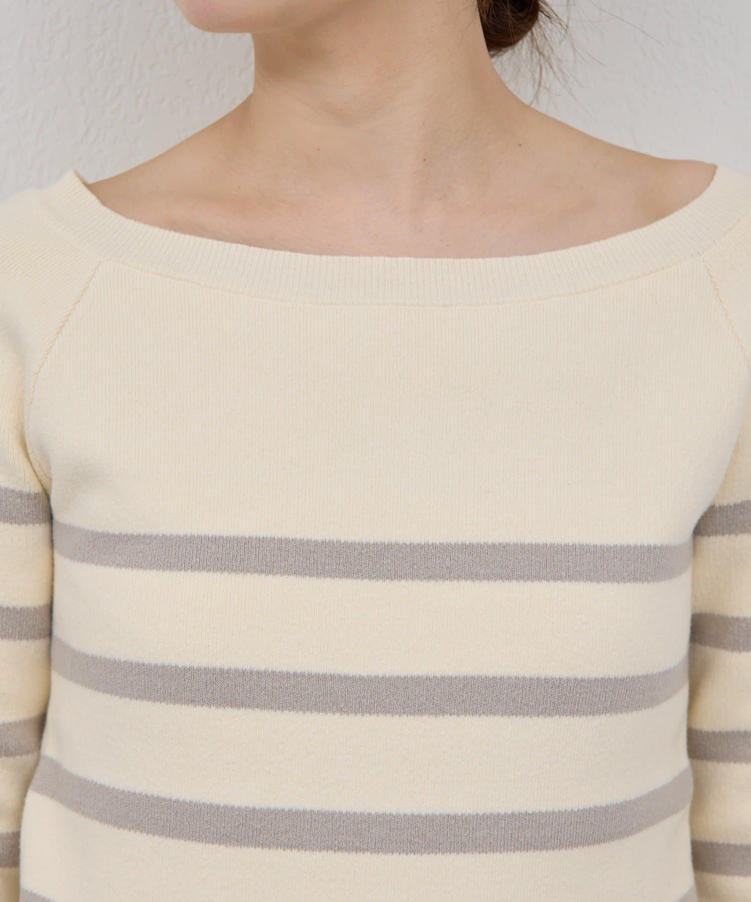 ●女性らしい印象を与えるボートネック。