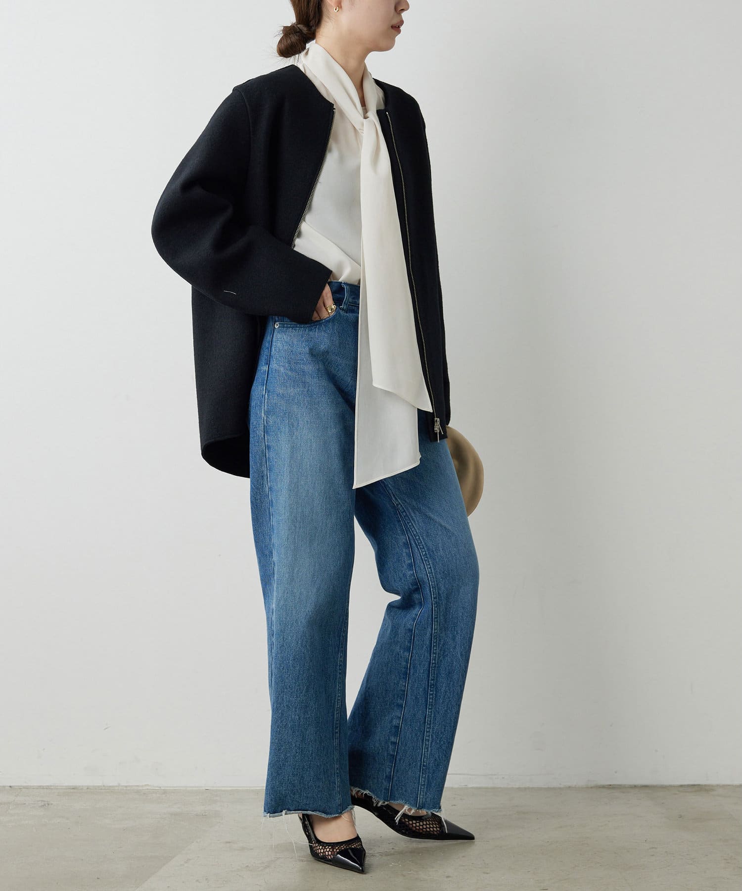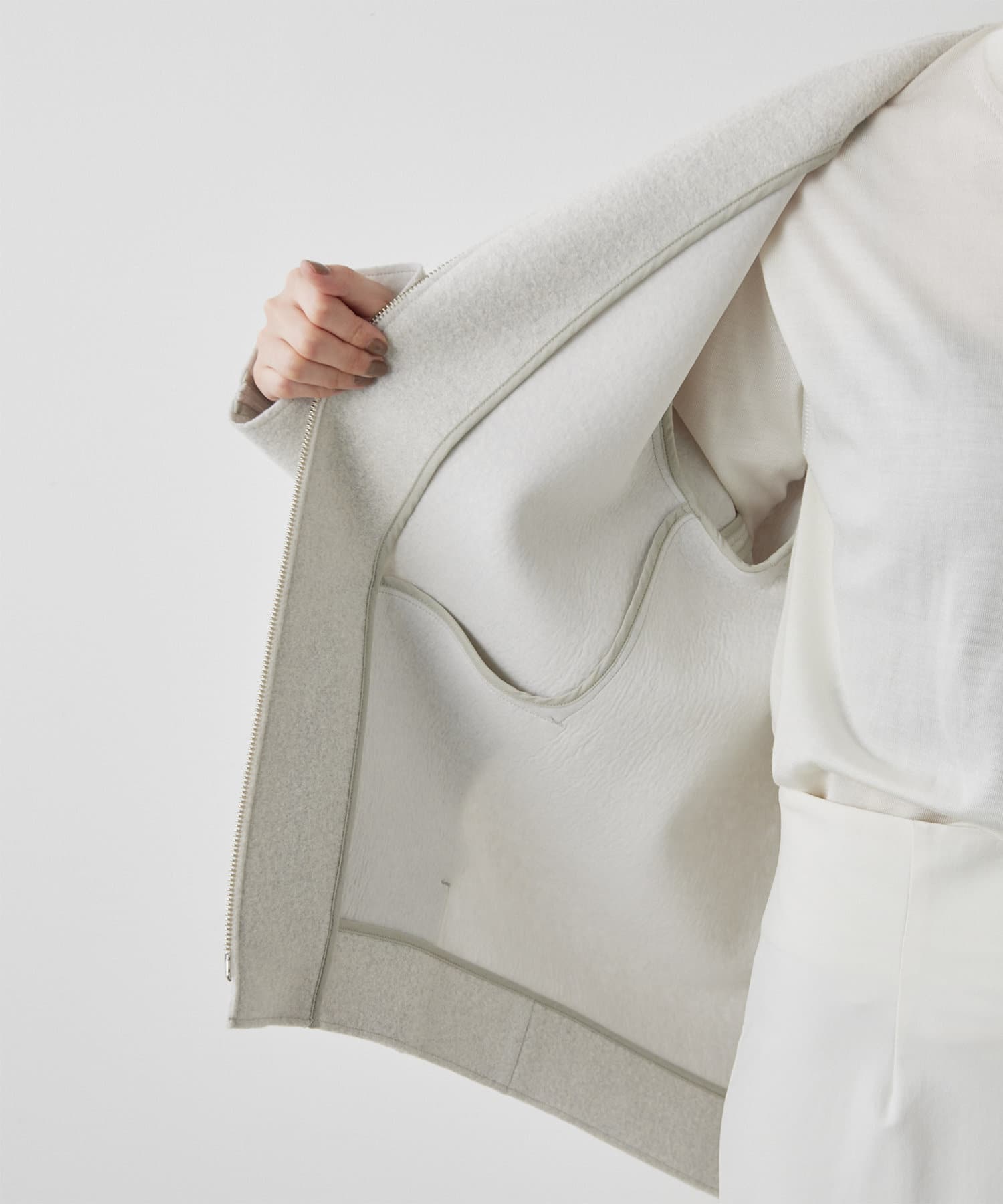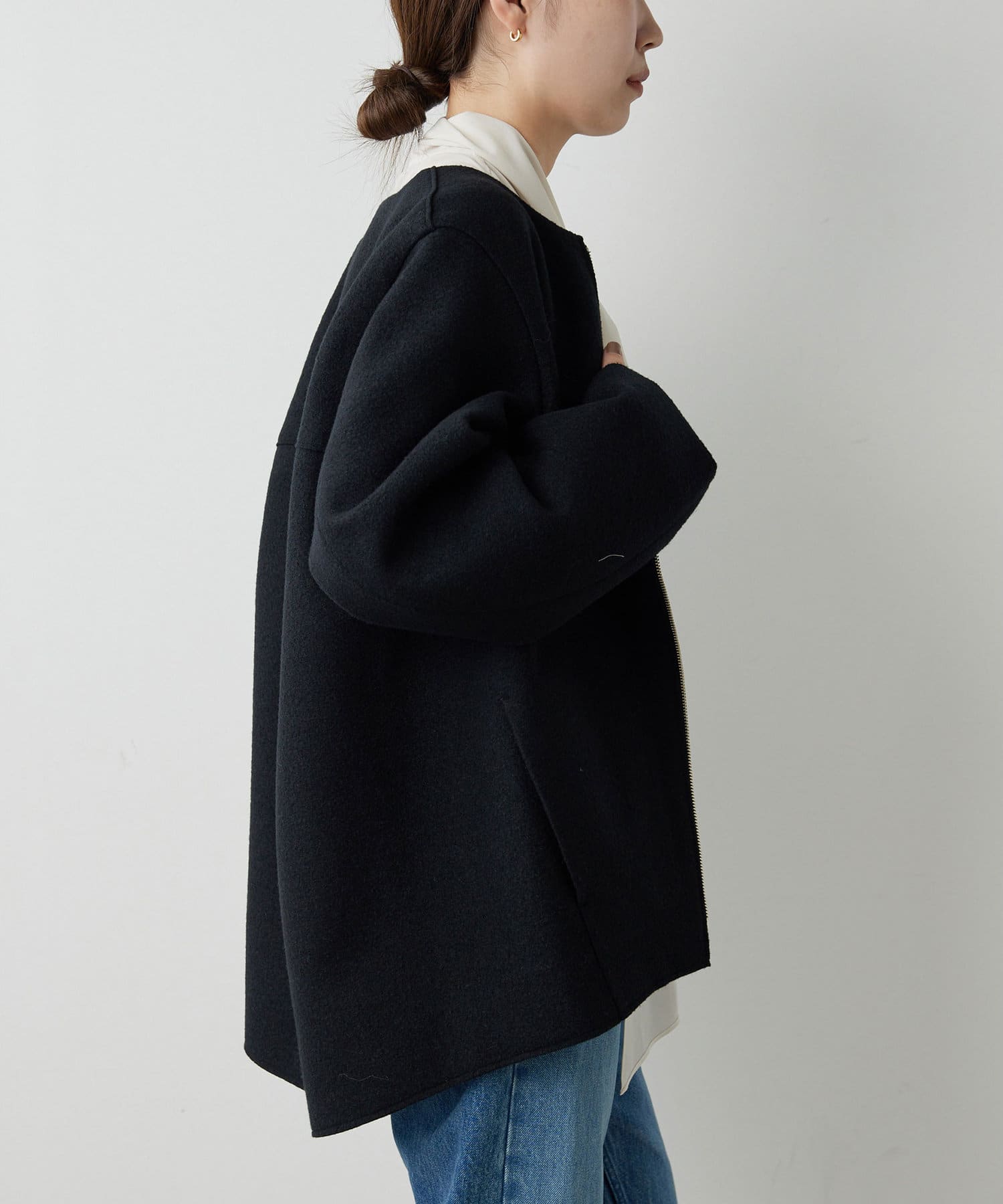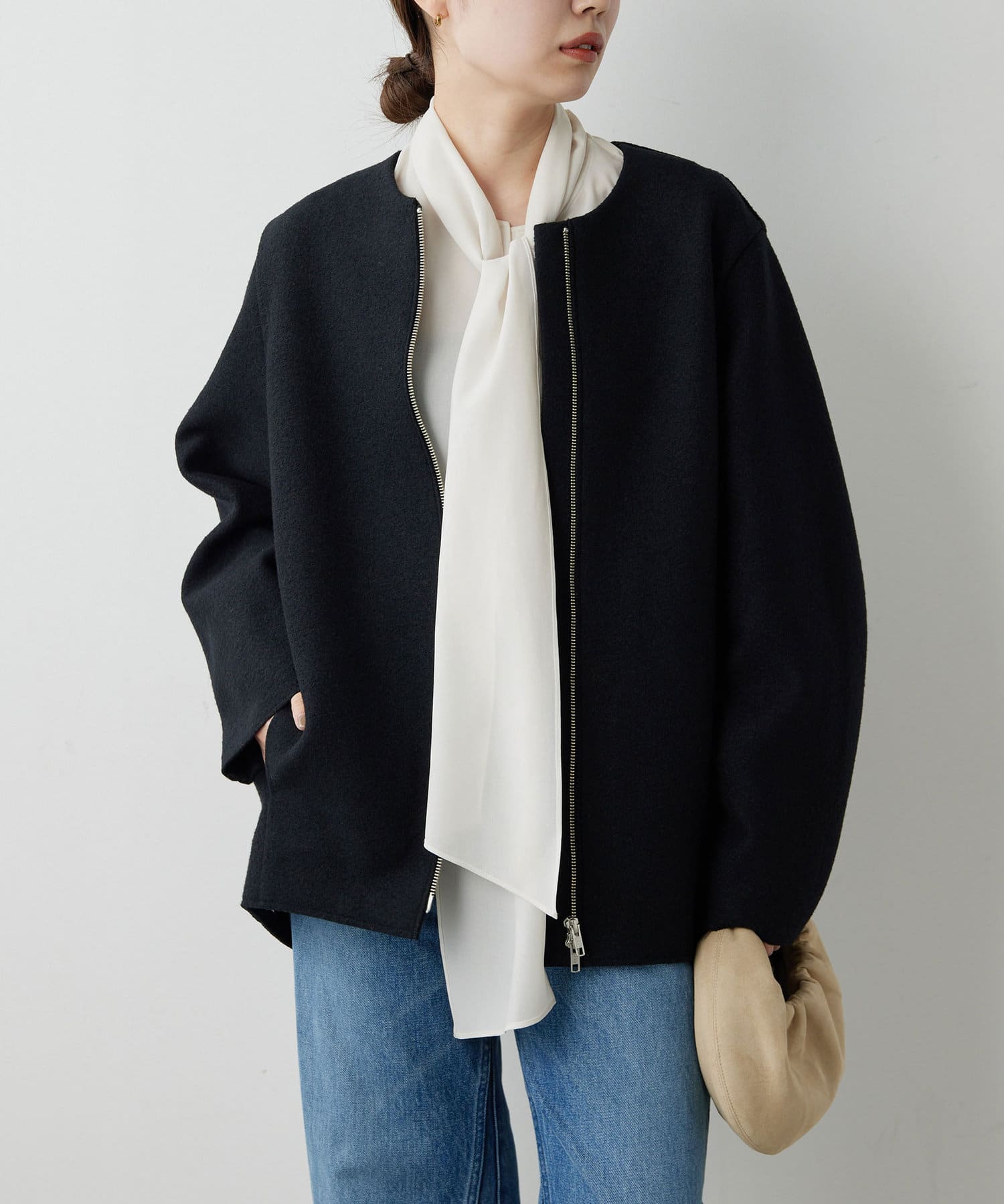 ●ミニマルなデザインが長く着られるノーカラーコート。