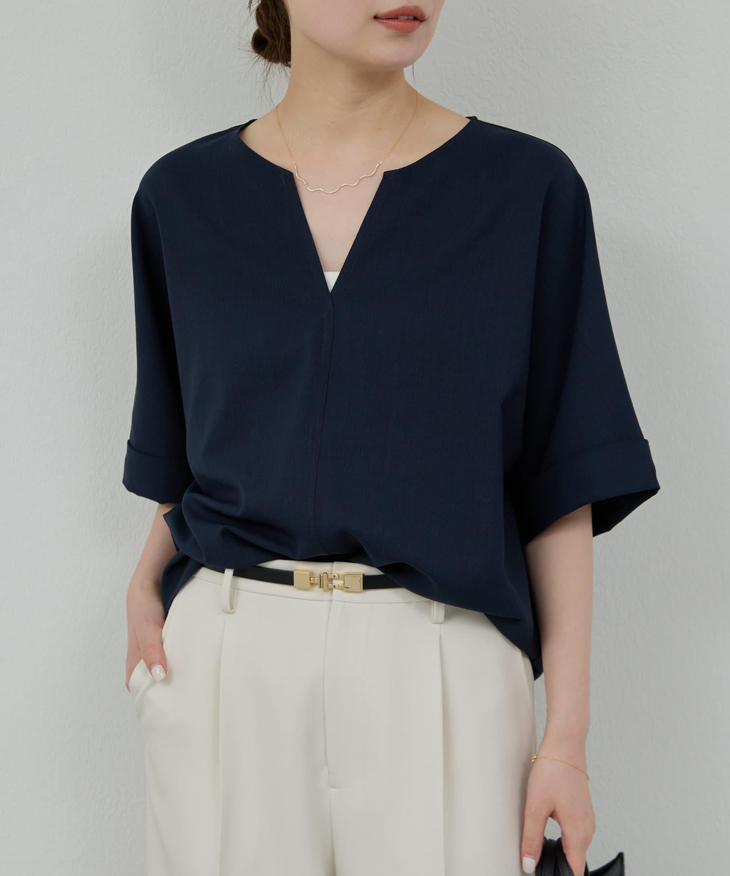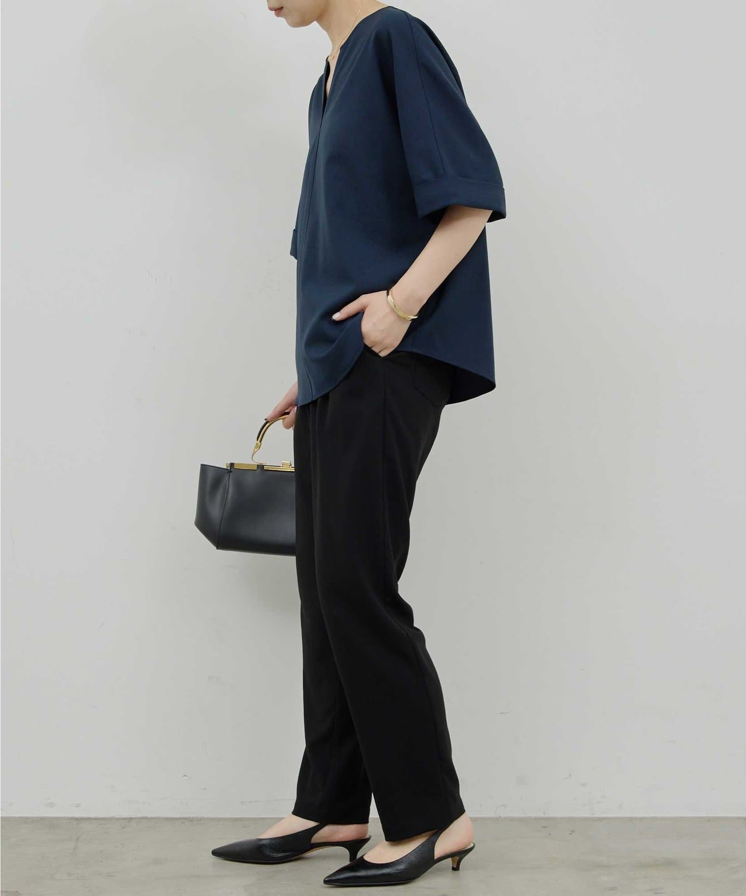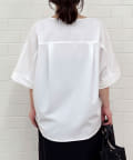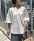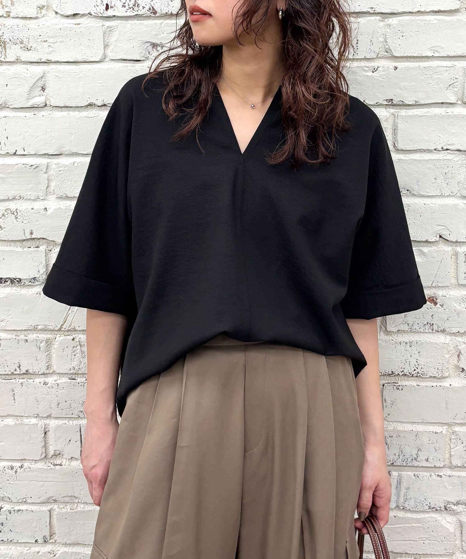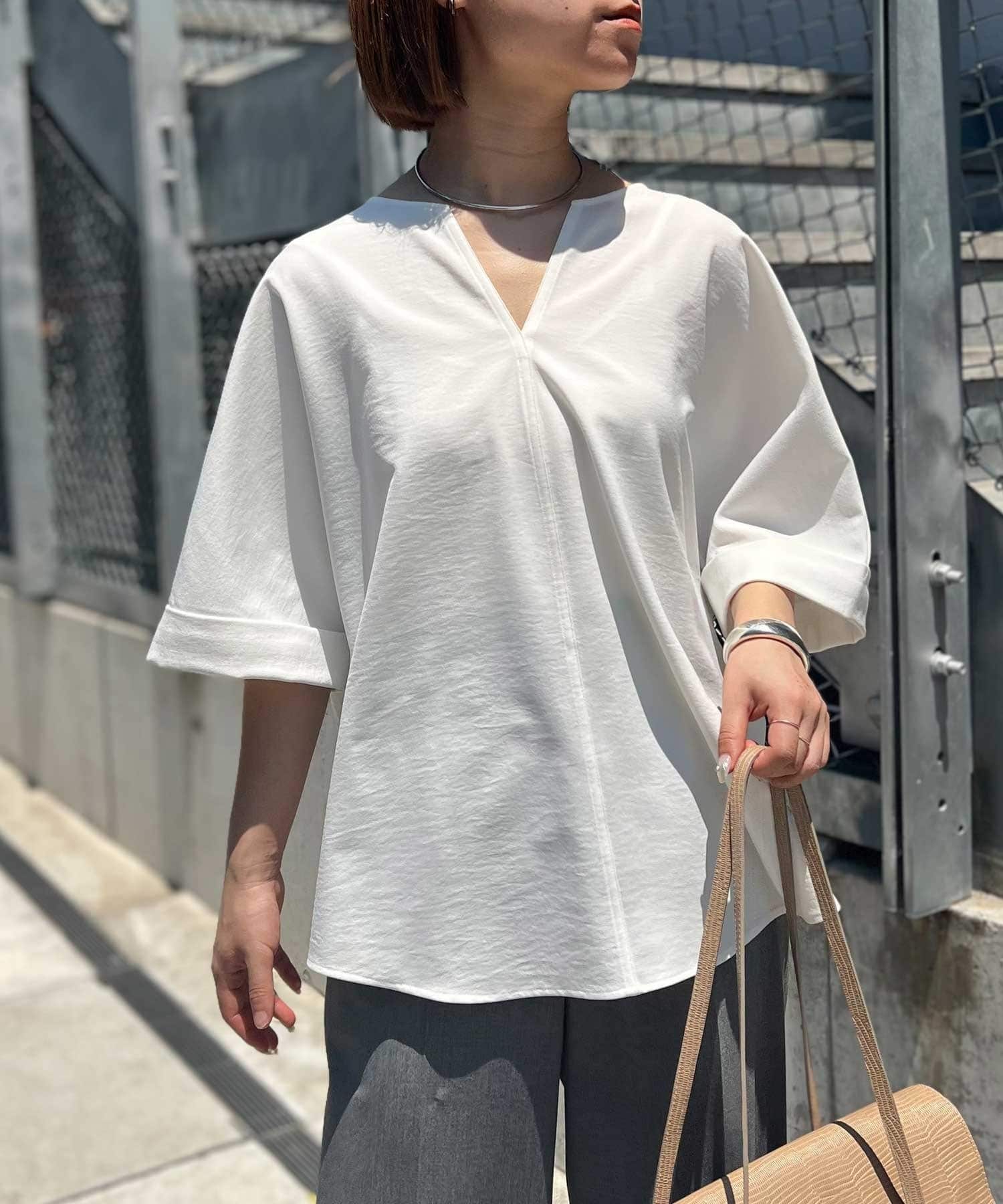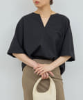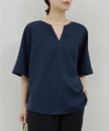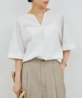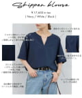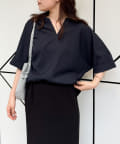 ●顔まわりがシャープに見えるスキッパーデザインのブラウス。