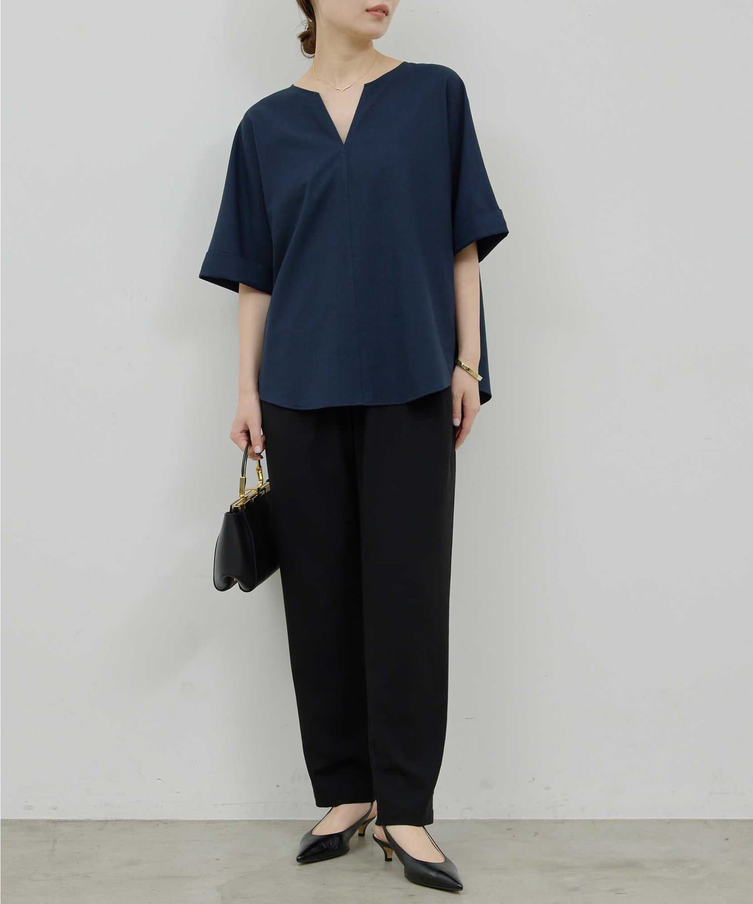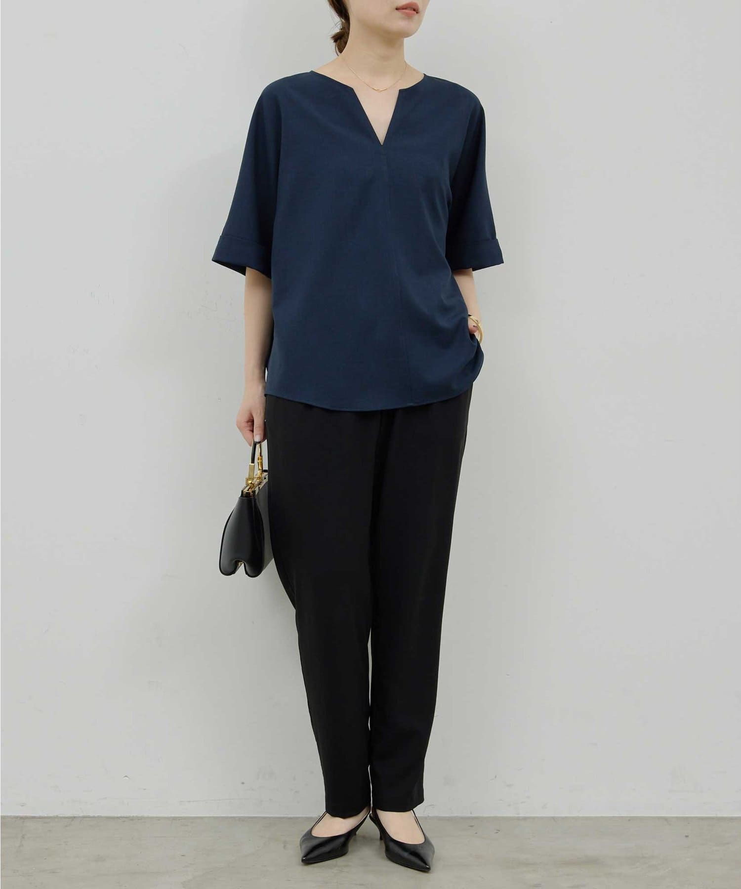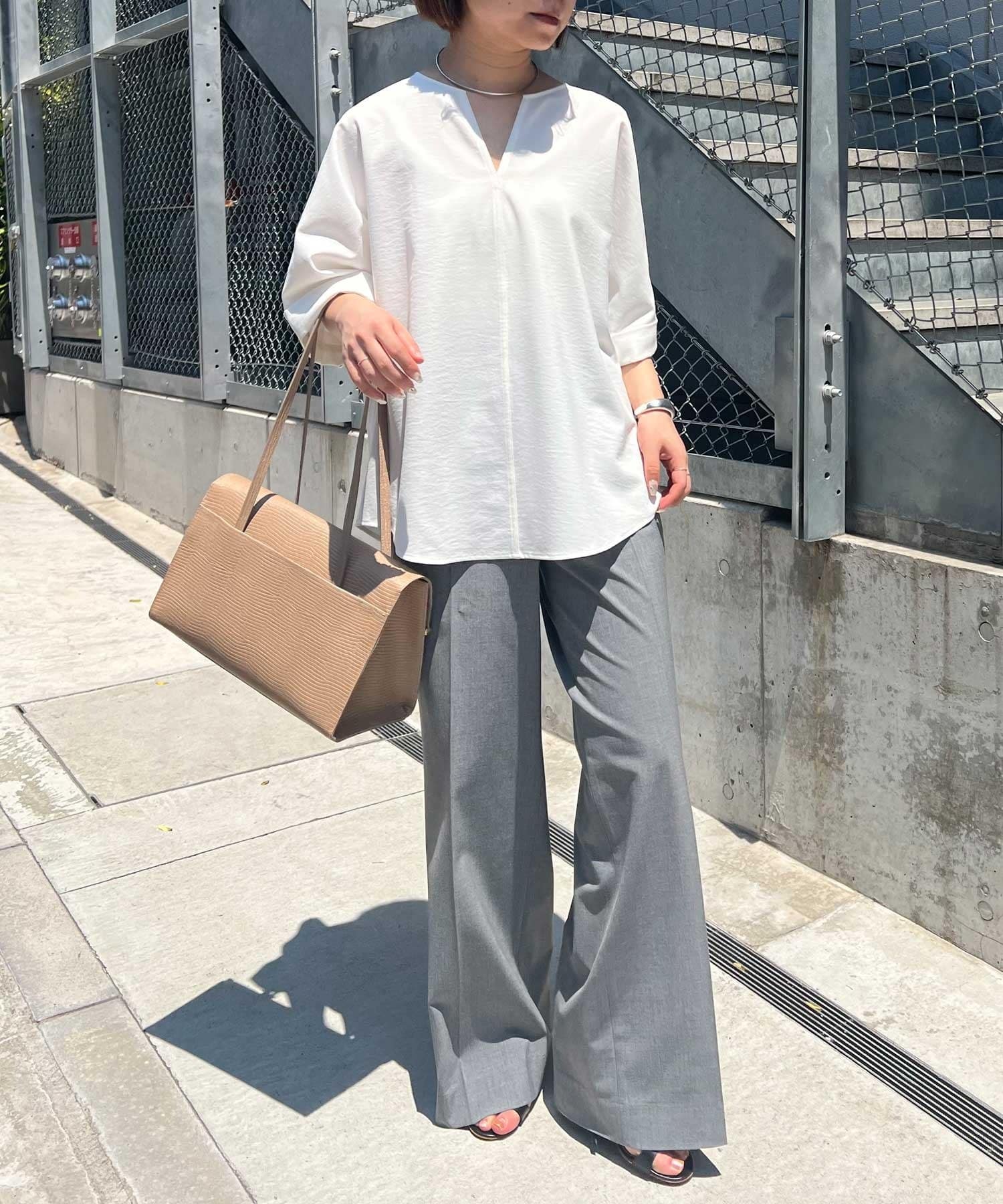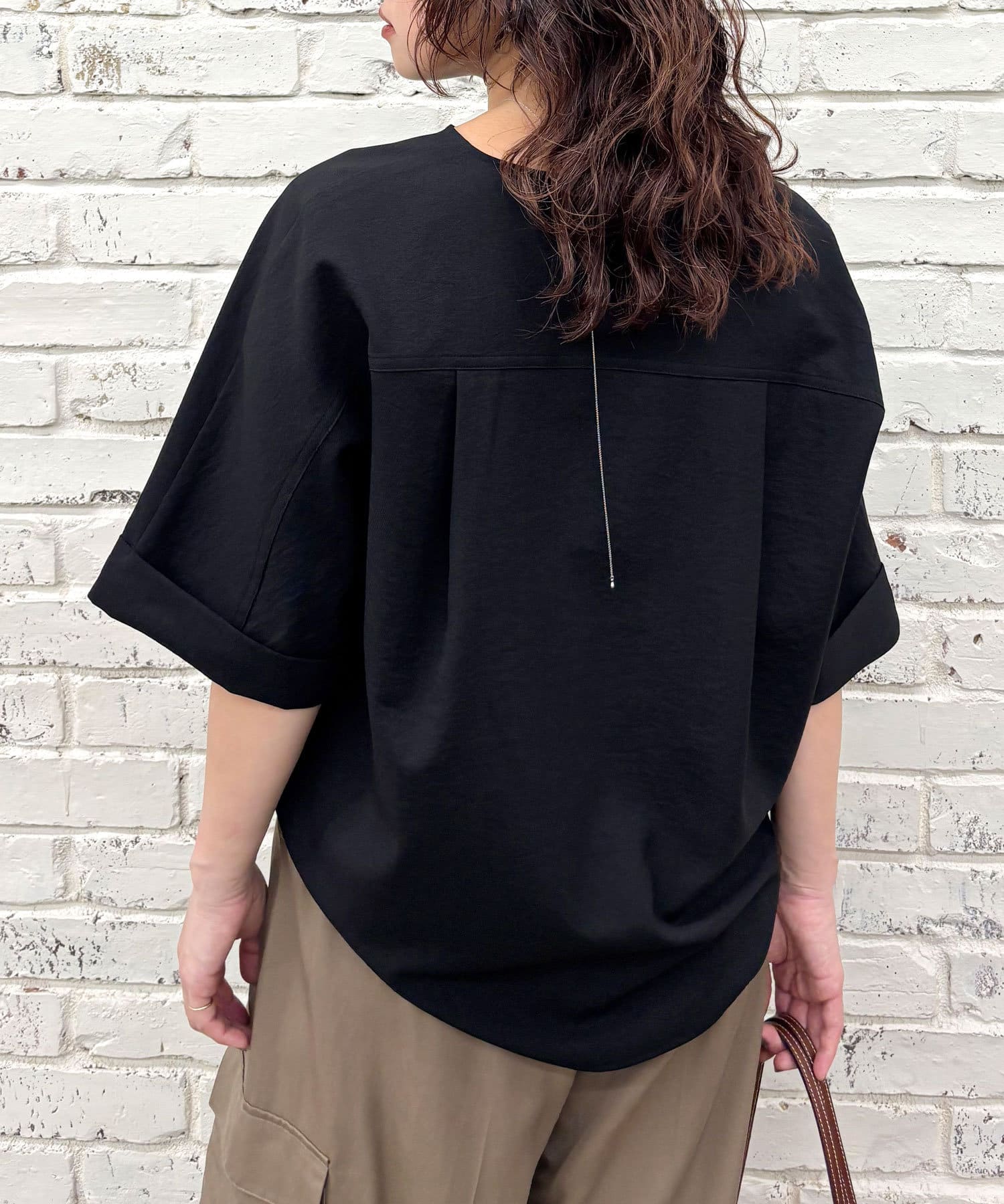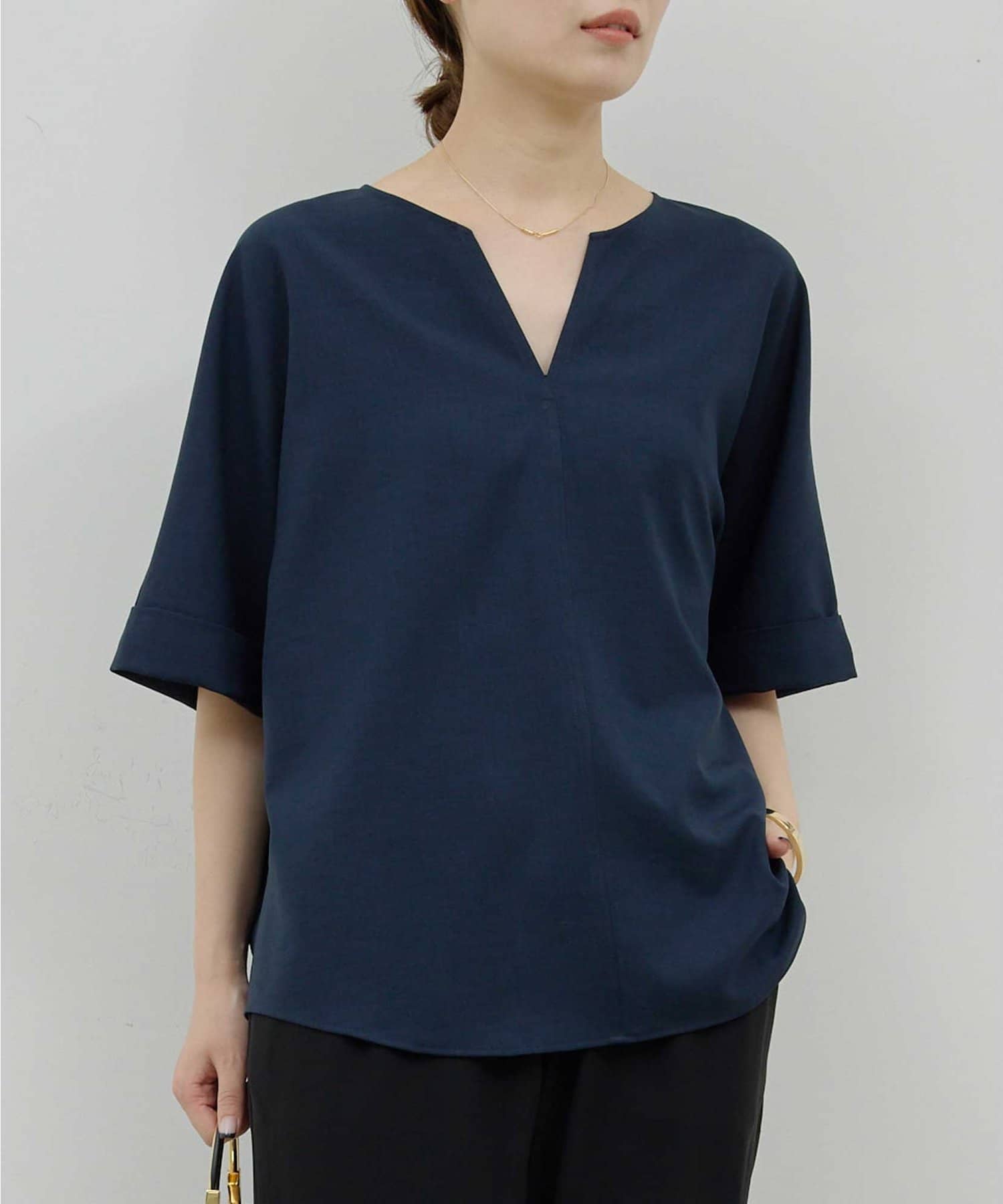 ●顔まわりがシャープに見えるスキッパーデザインのブラウス。