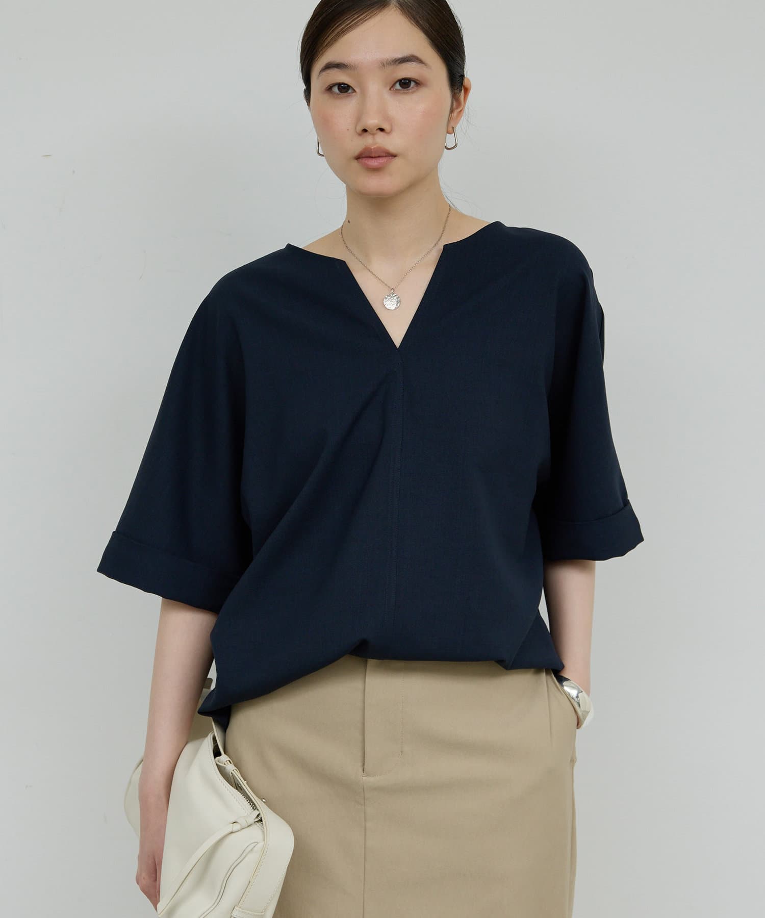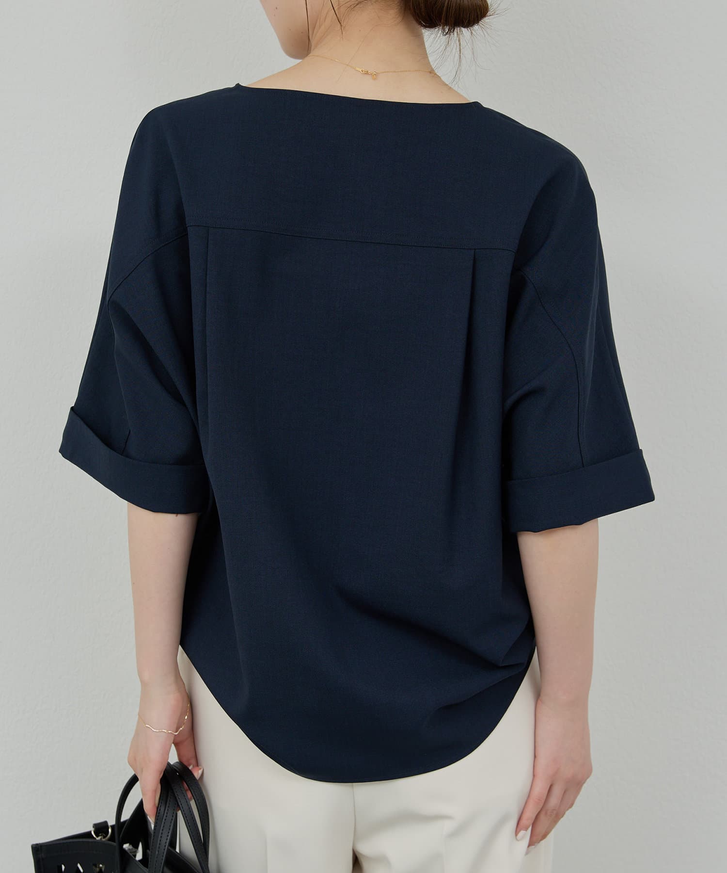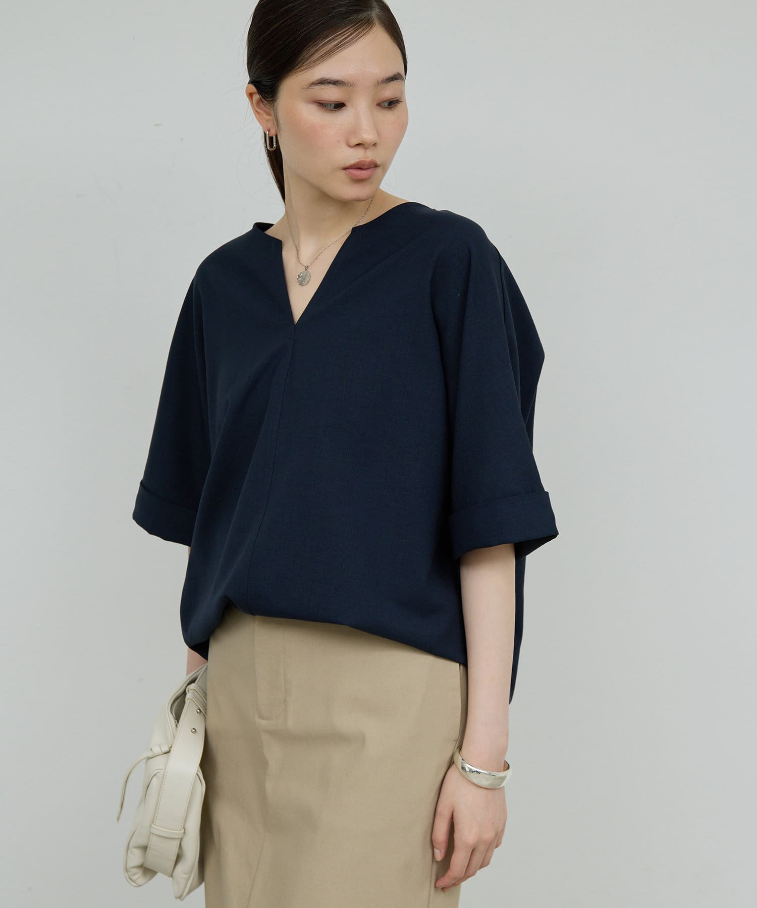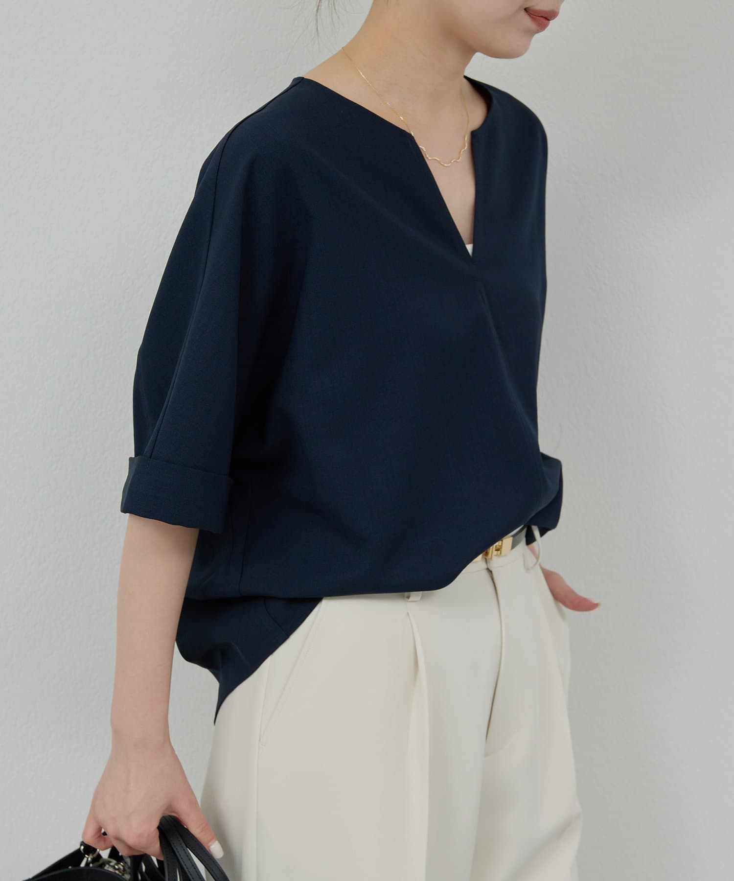 ●顔まわりがシャープに見えるスキッパーデザインのブラウス。