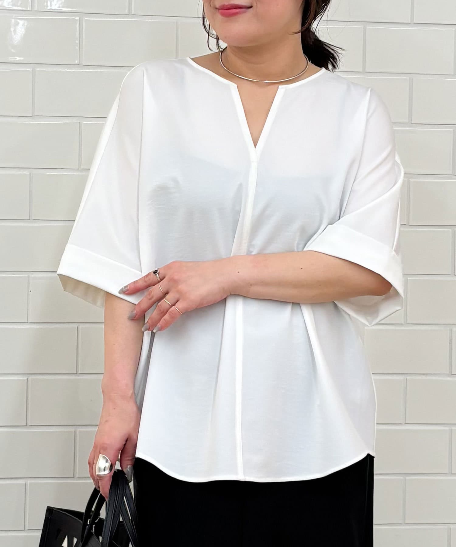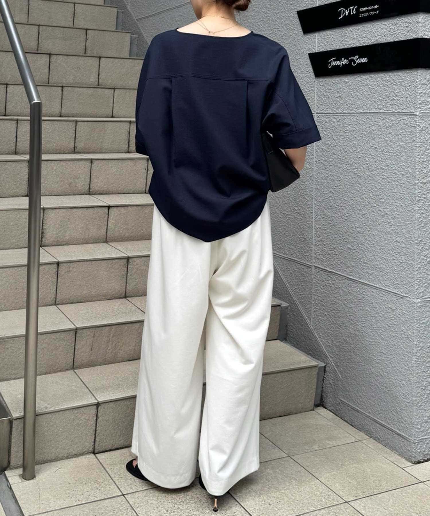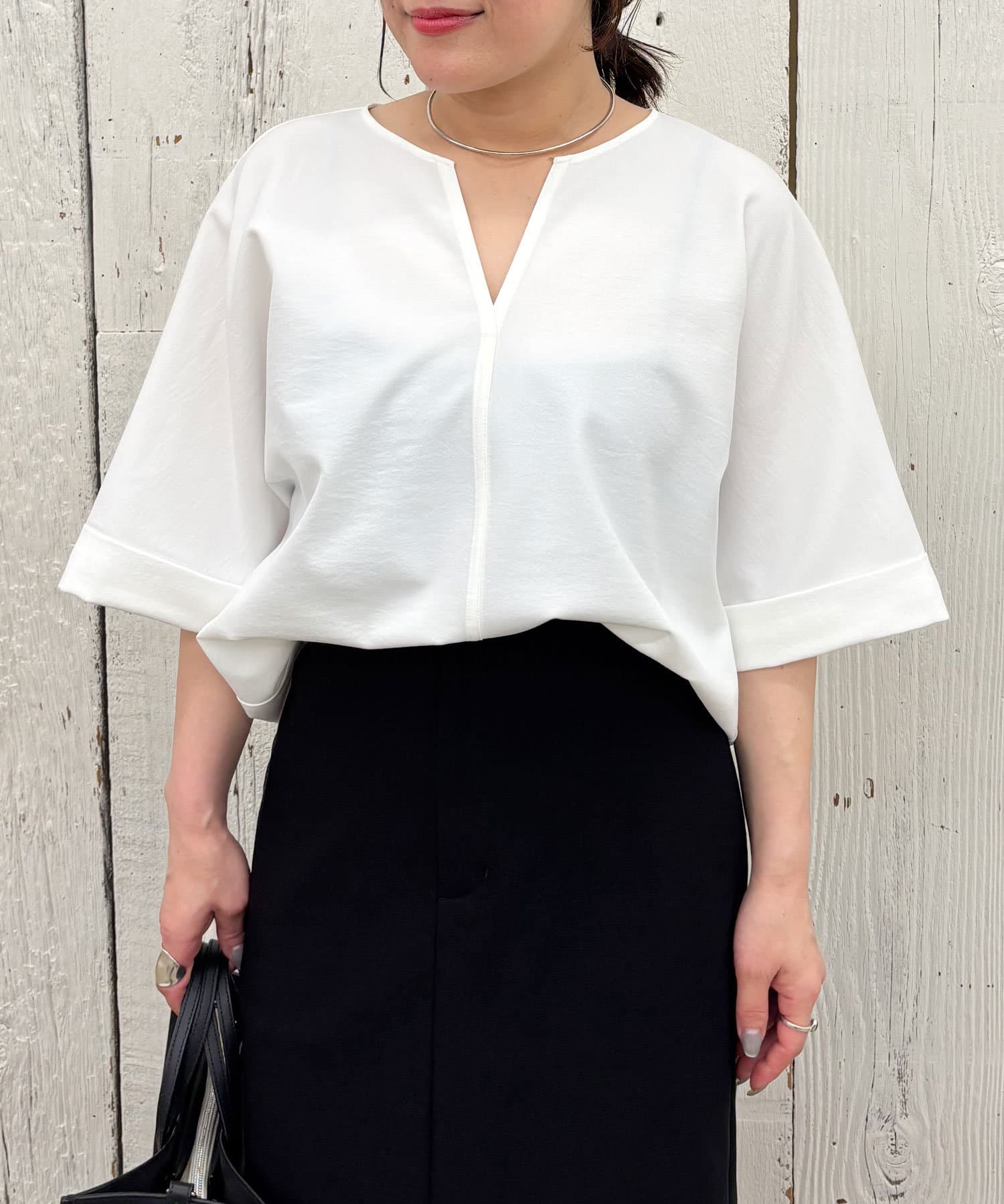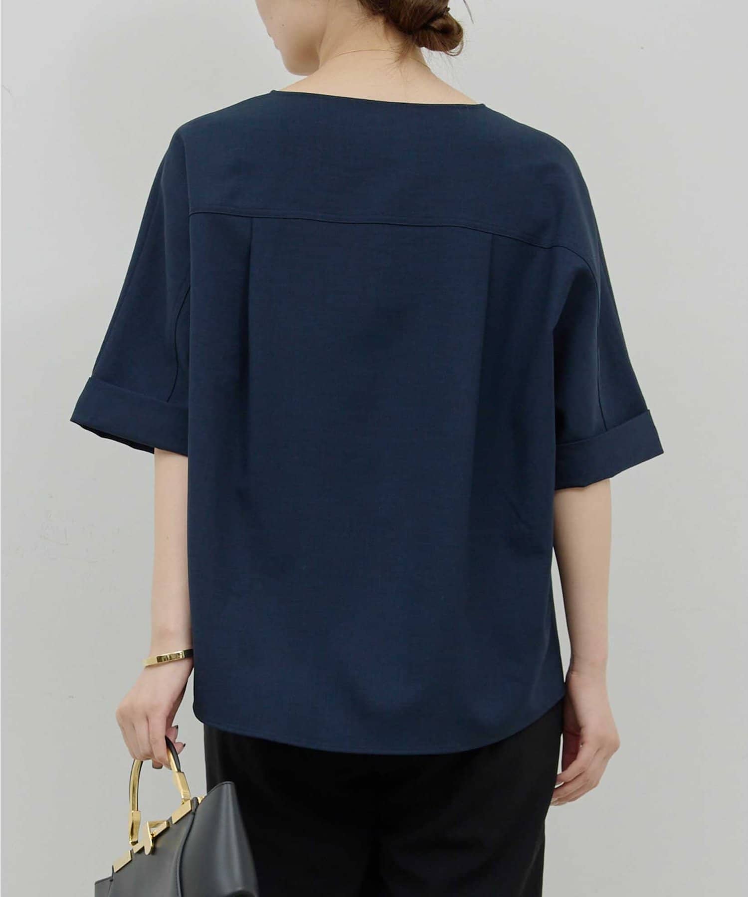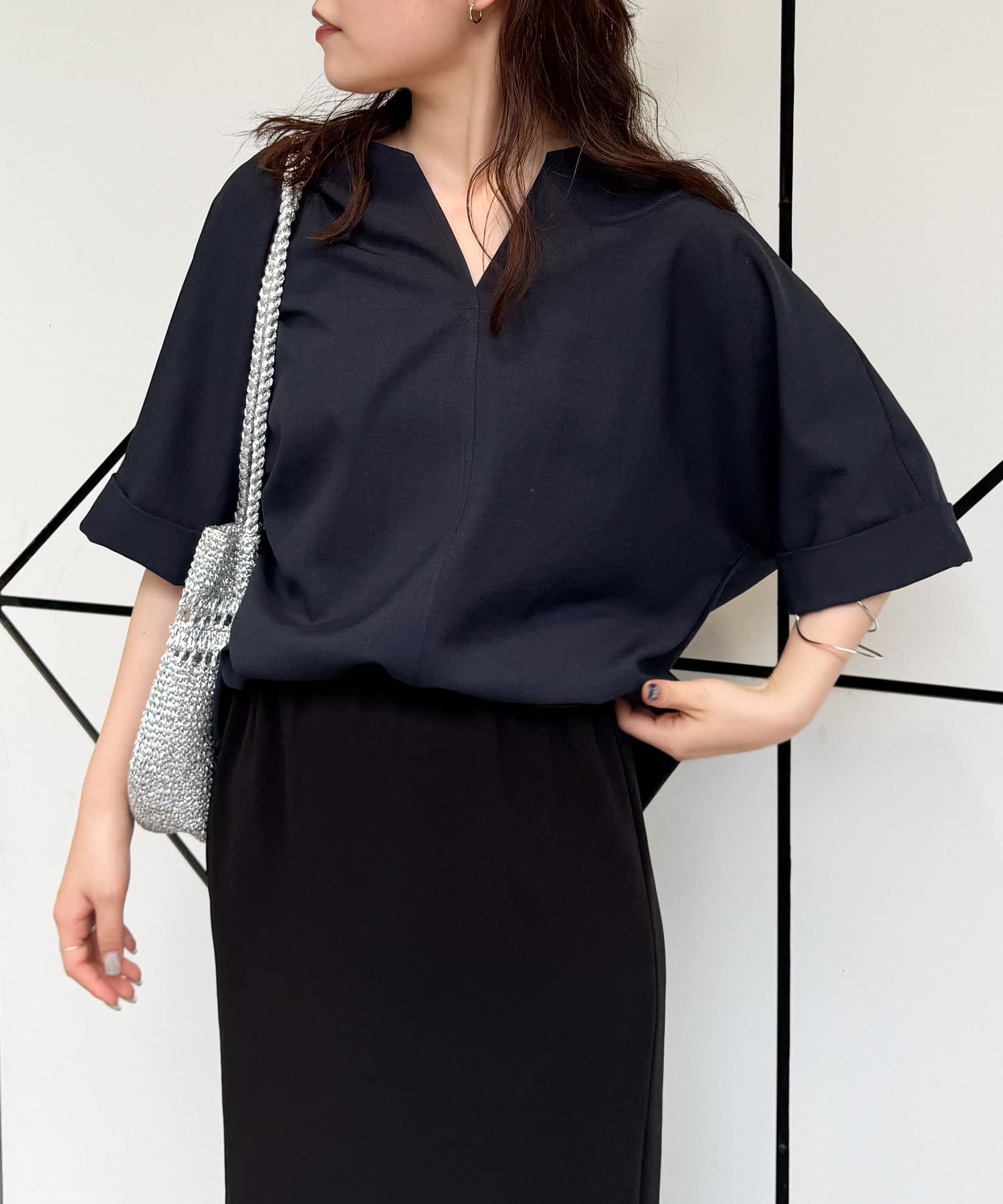 ●顔まわりがシャープに見えるスキッパーデザインのブラウス。