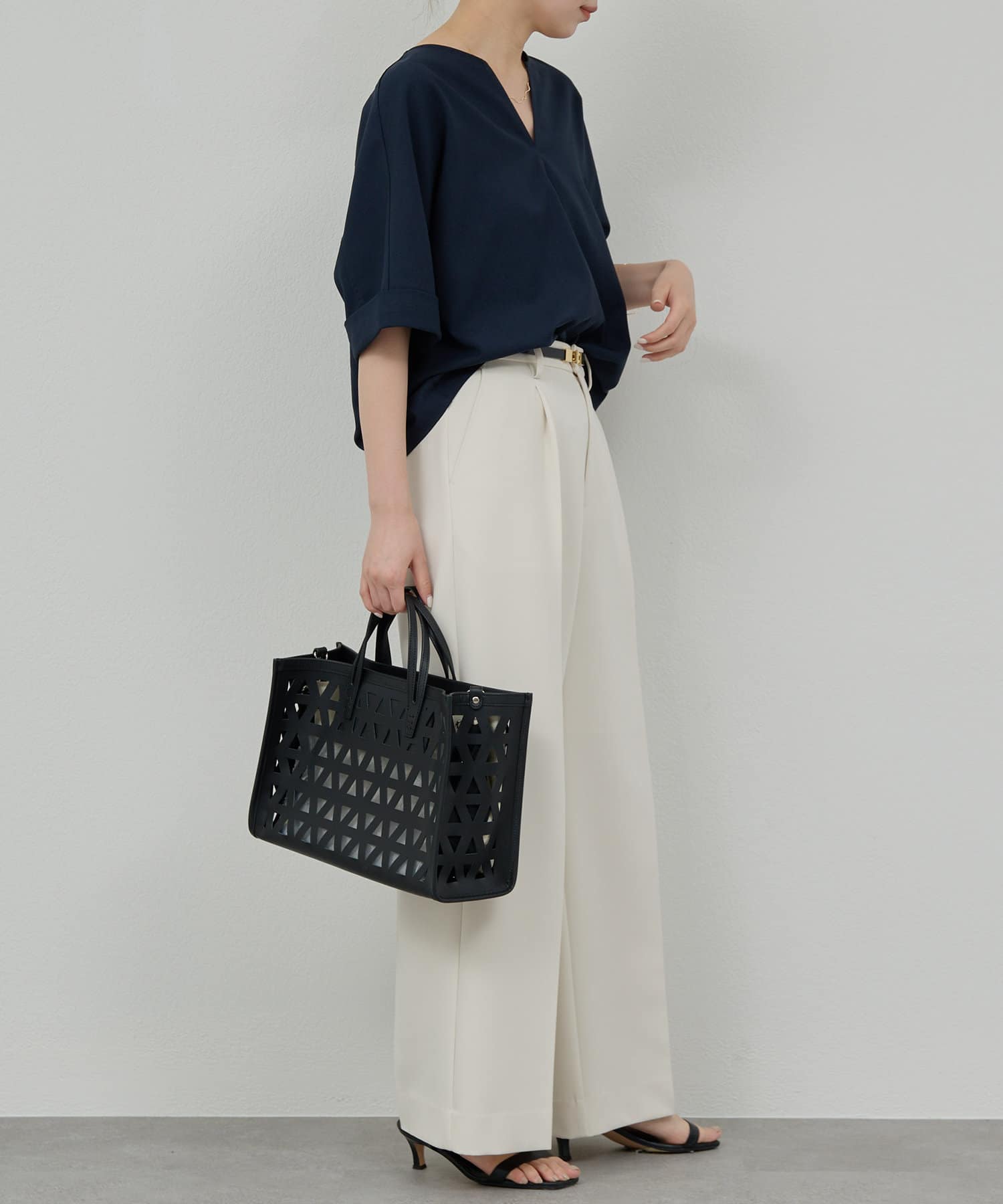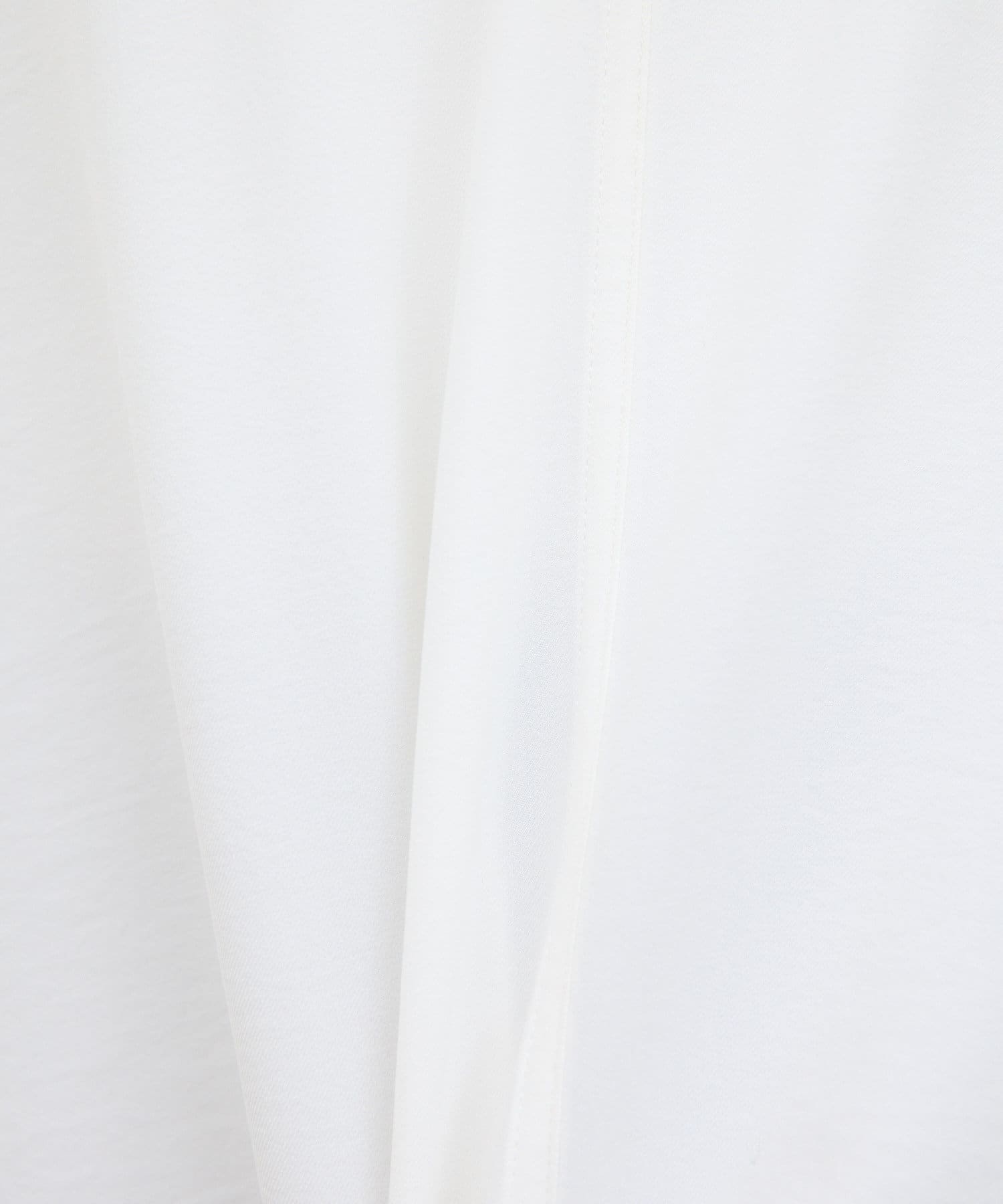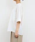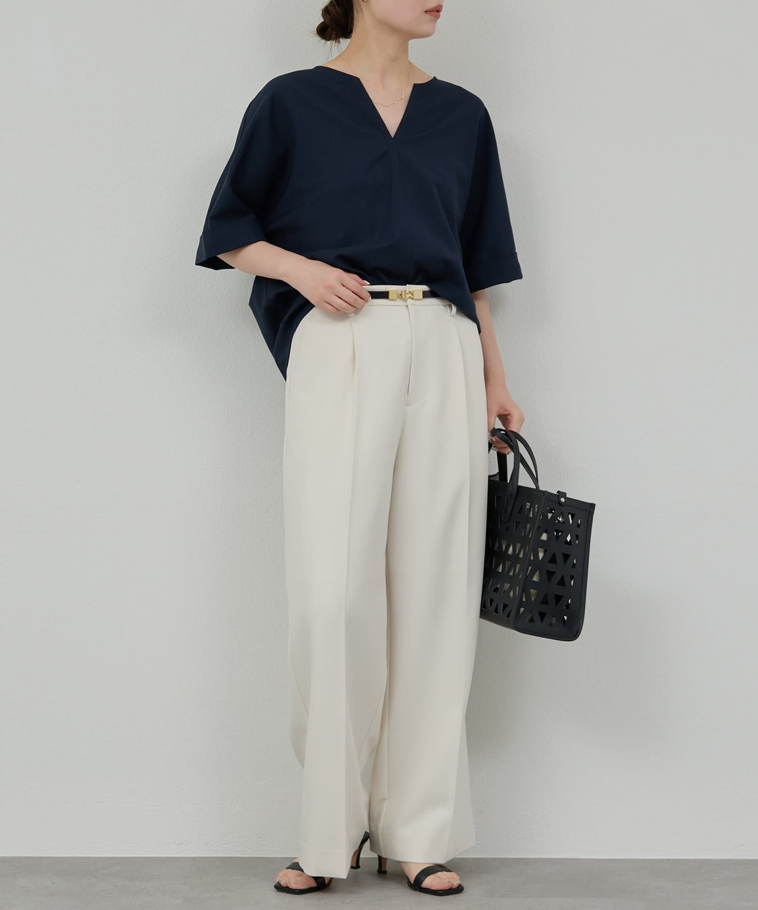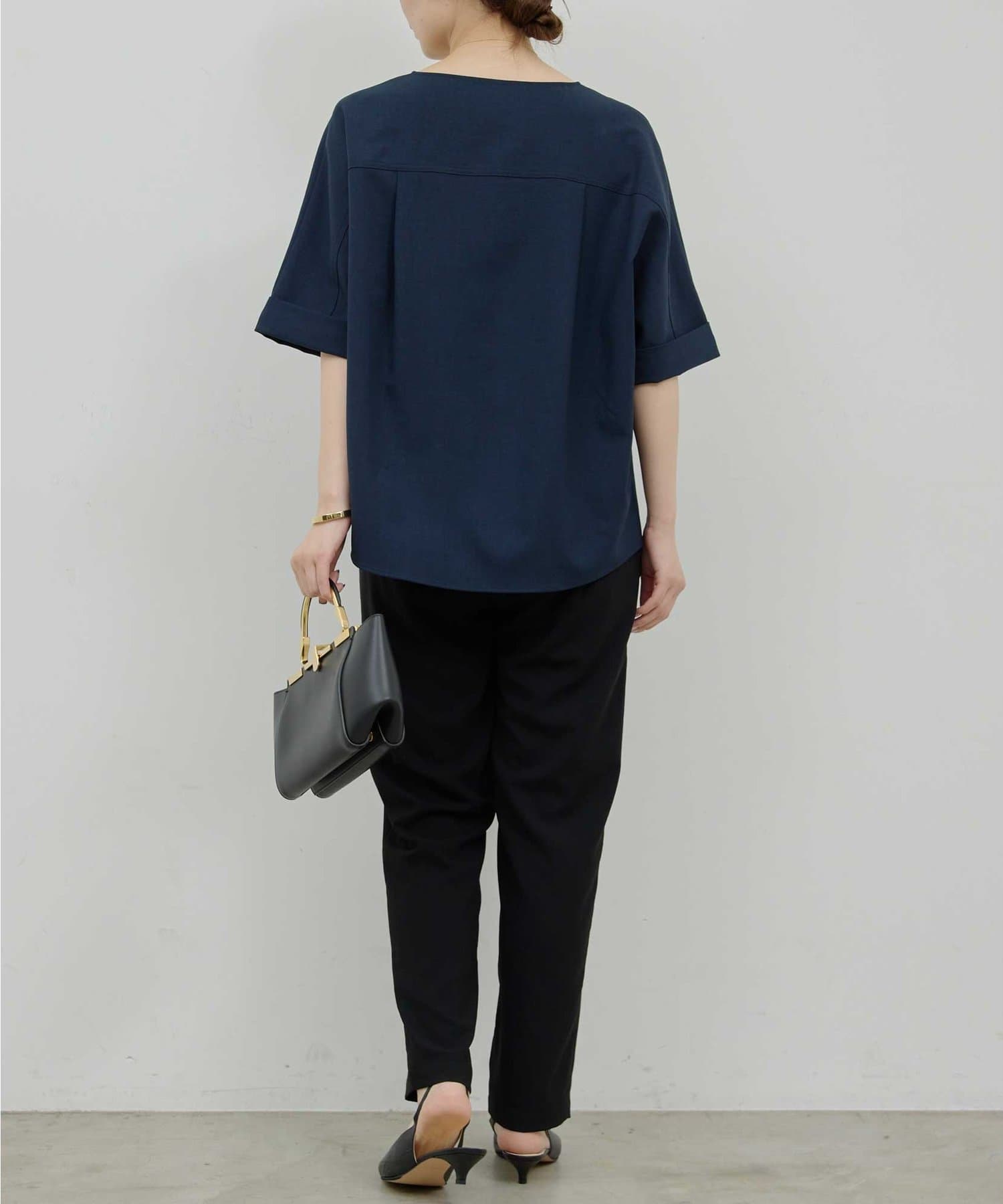 ●顔まわりがシャープに見えるスキッパーデザインのブラウス。