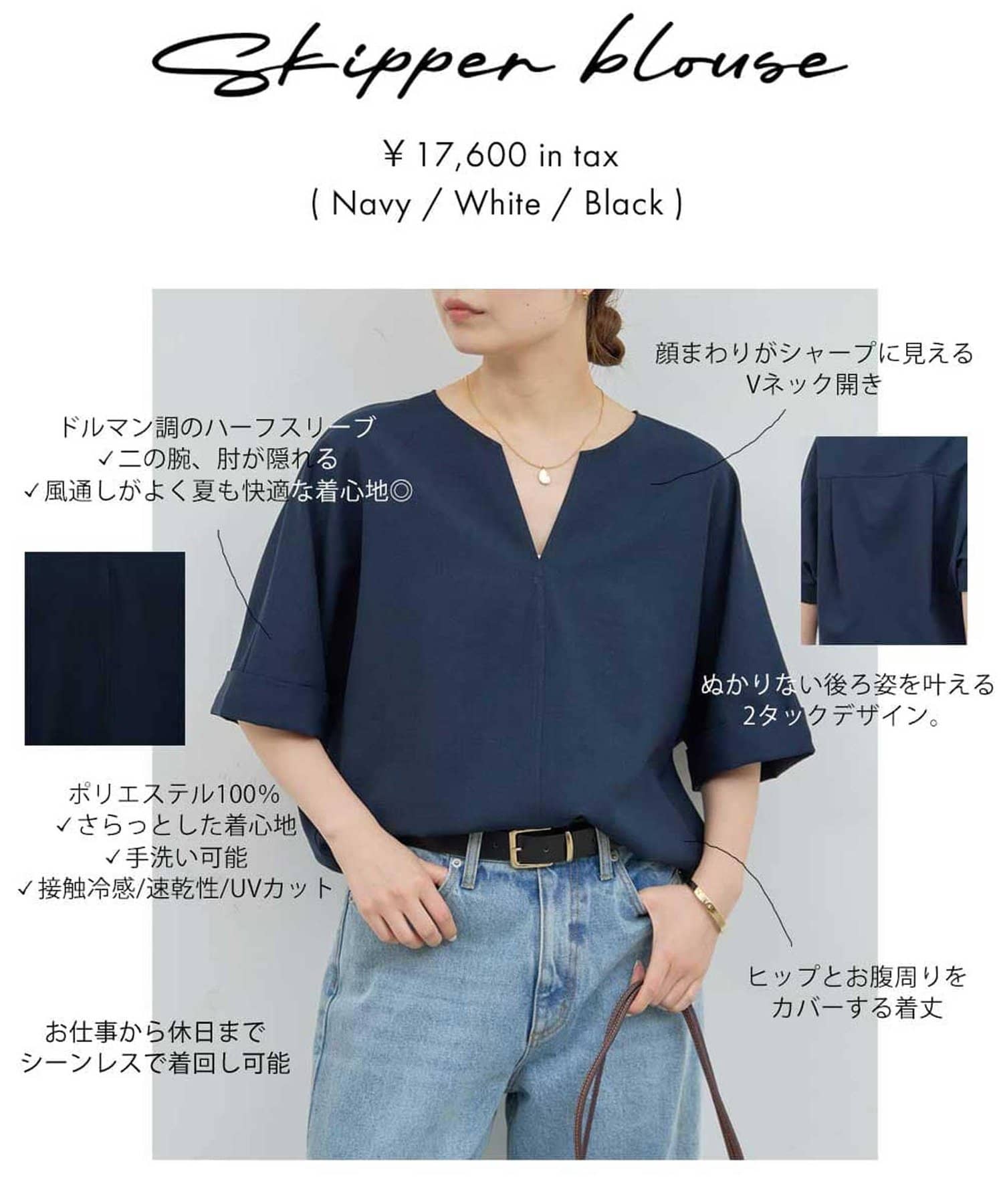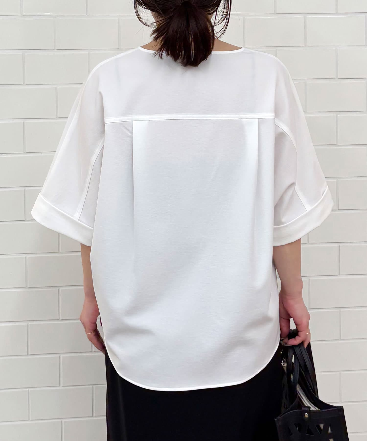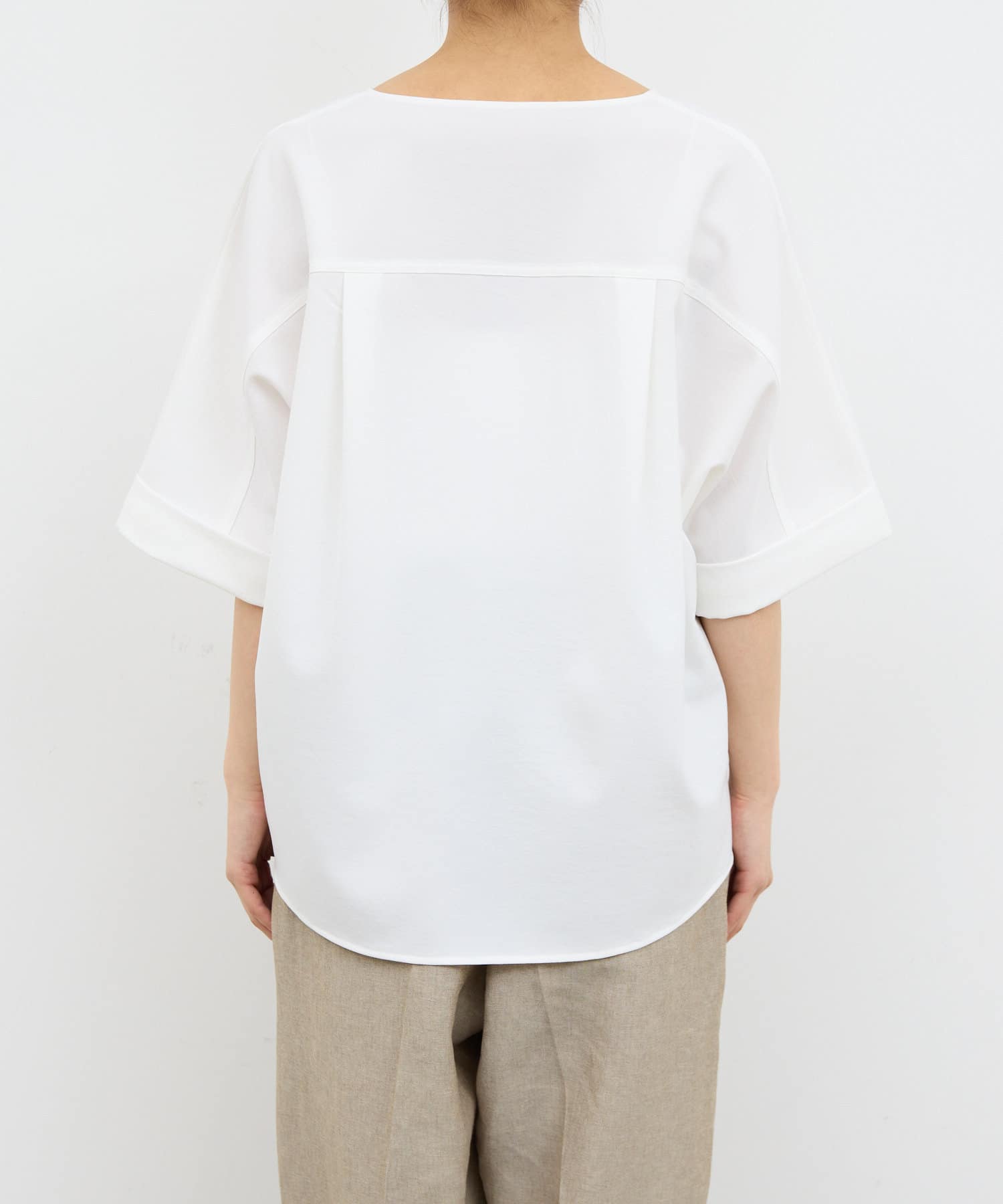 ●肩幅や二の腕、肘を自然にカバーしつつ、風通しの良いドルマンハーフスリーブ。