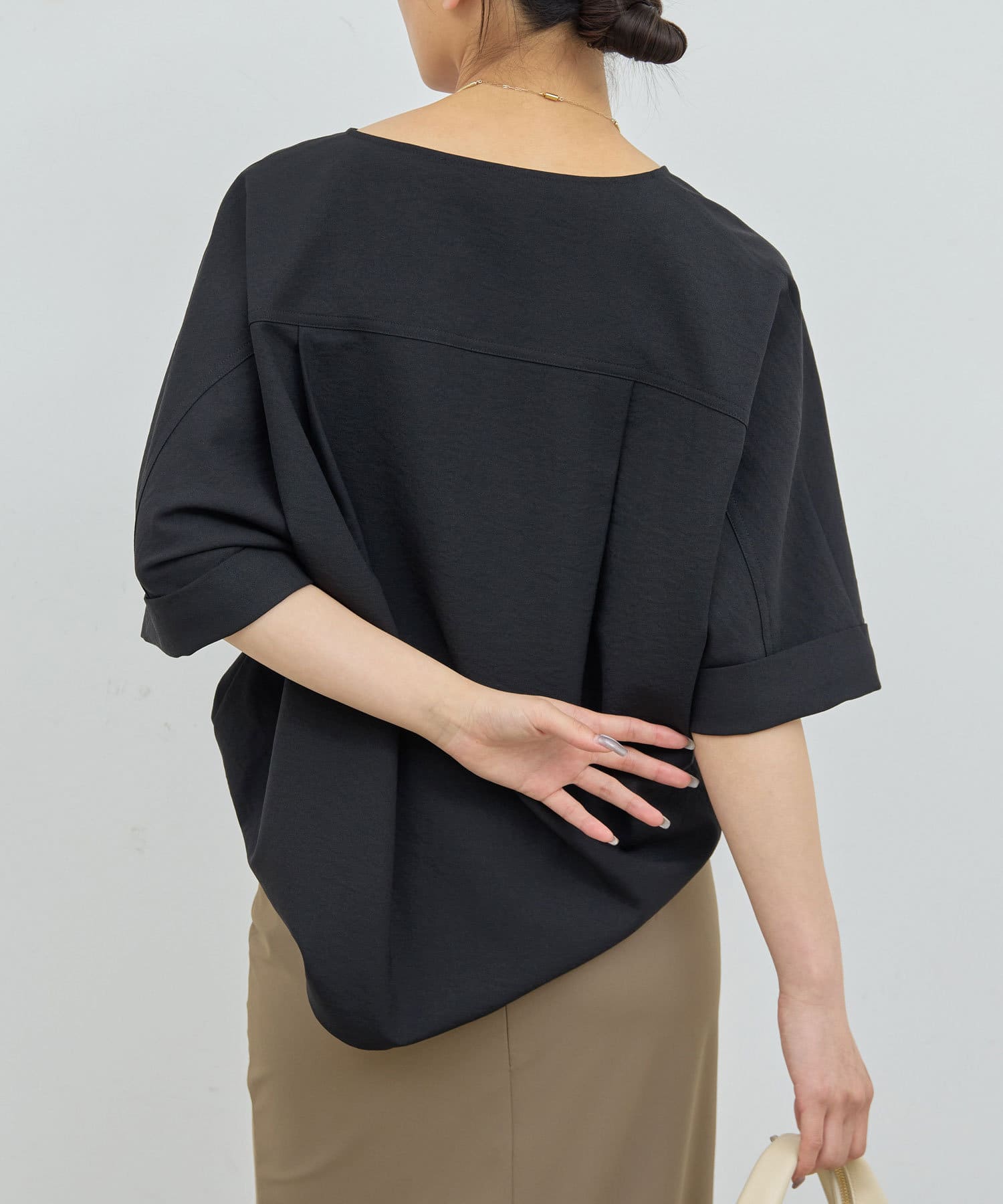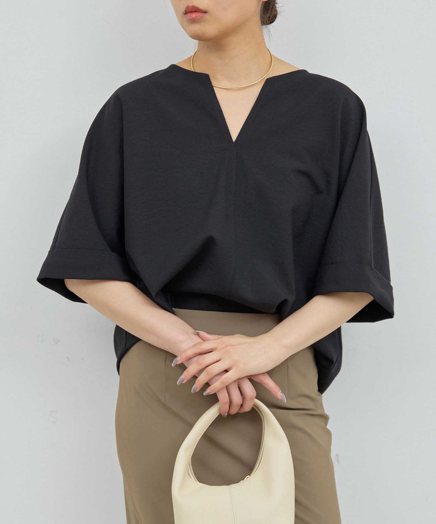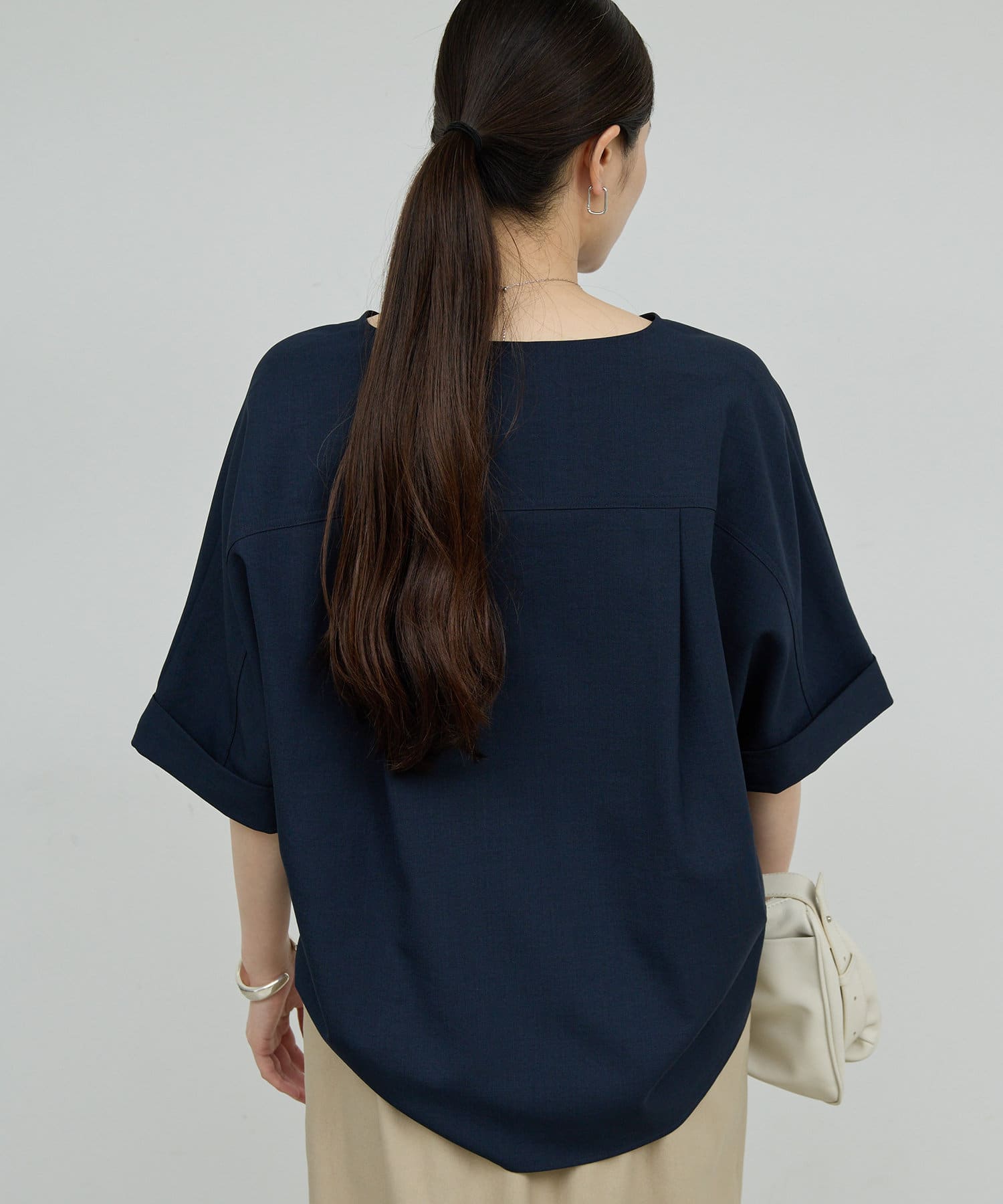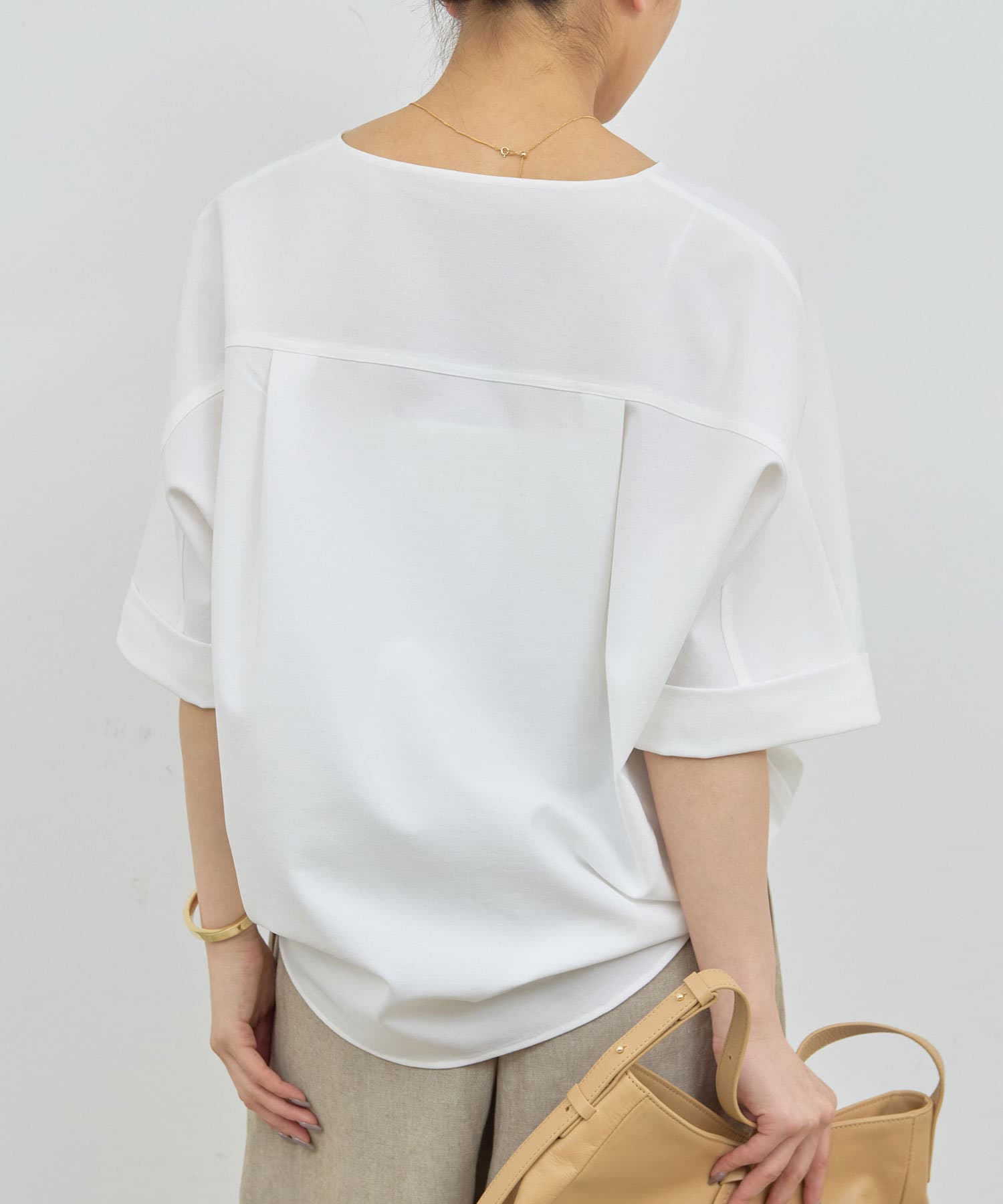 ●肩幅や二の腕、肘を自然にカバーしつつ、風通しの良いドルマンハーフスリーブ。
