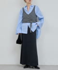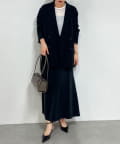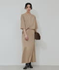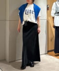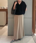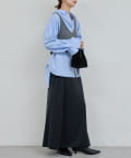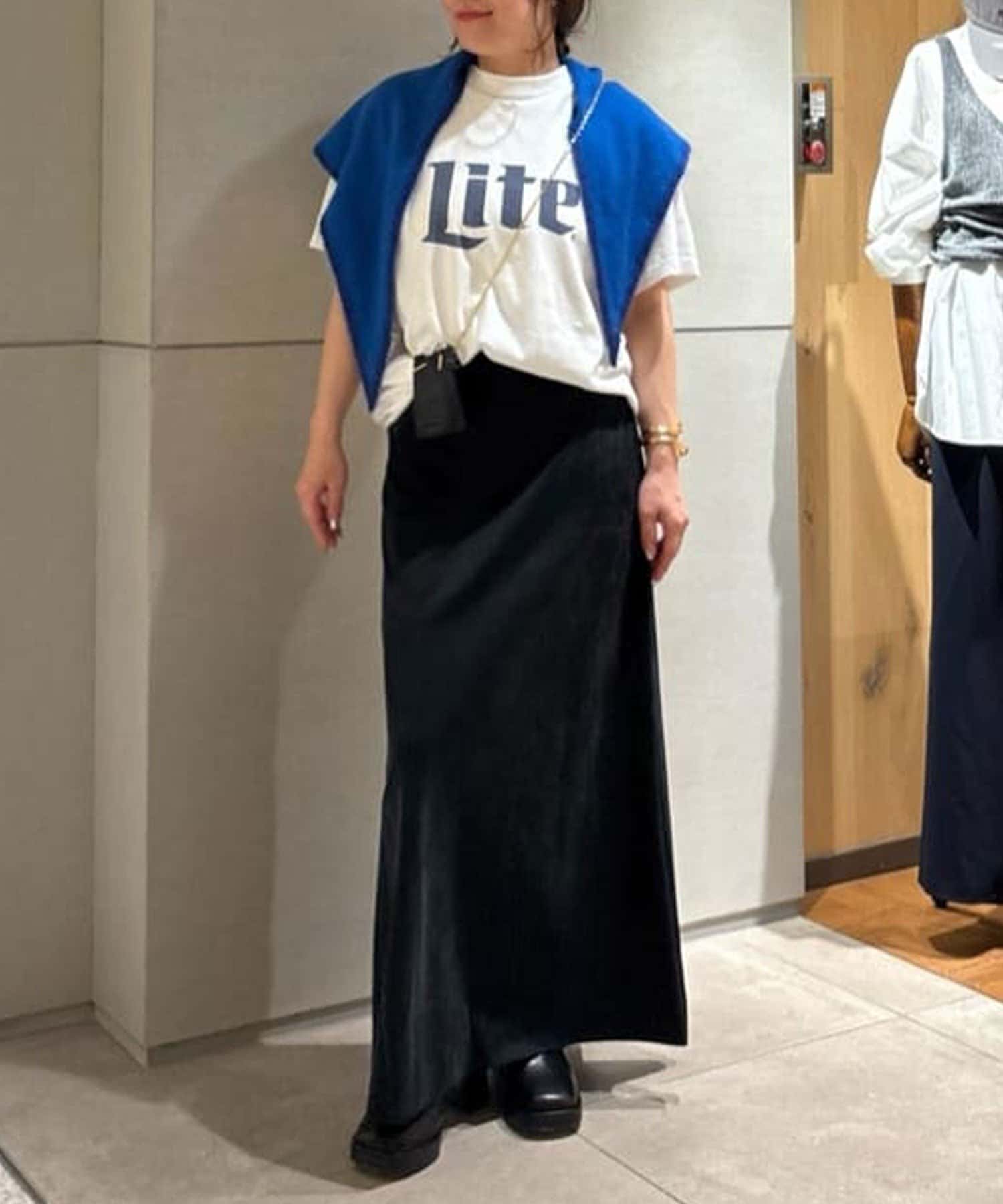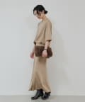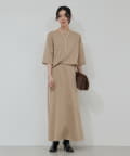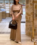 ●同素材のトップスとのセットアップスタイルもおすすめ。
