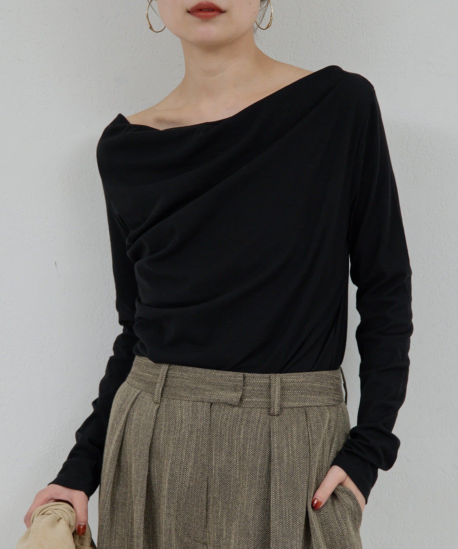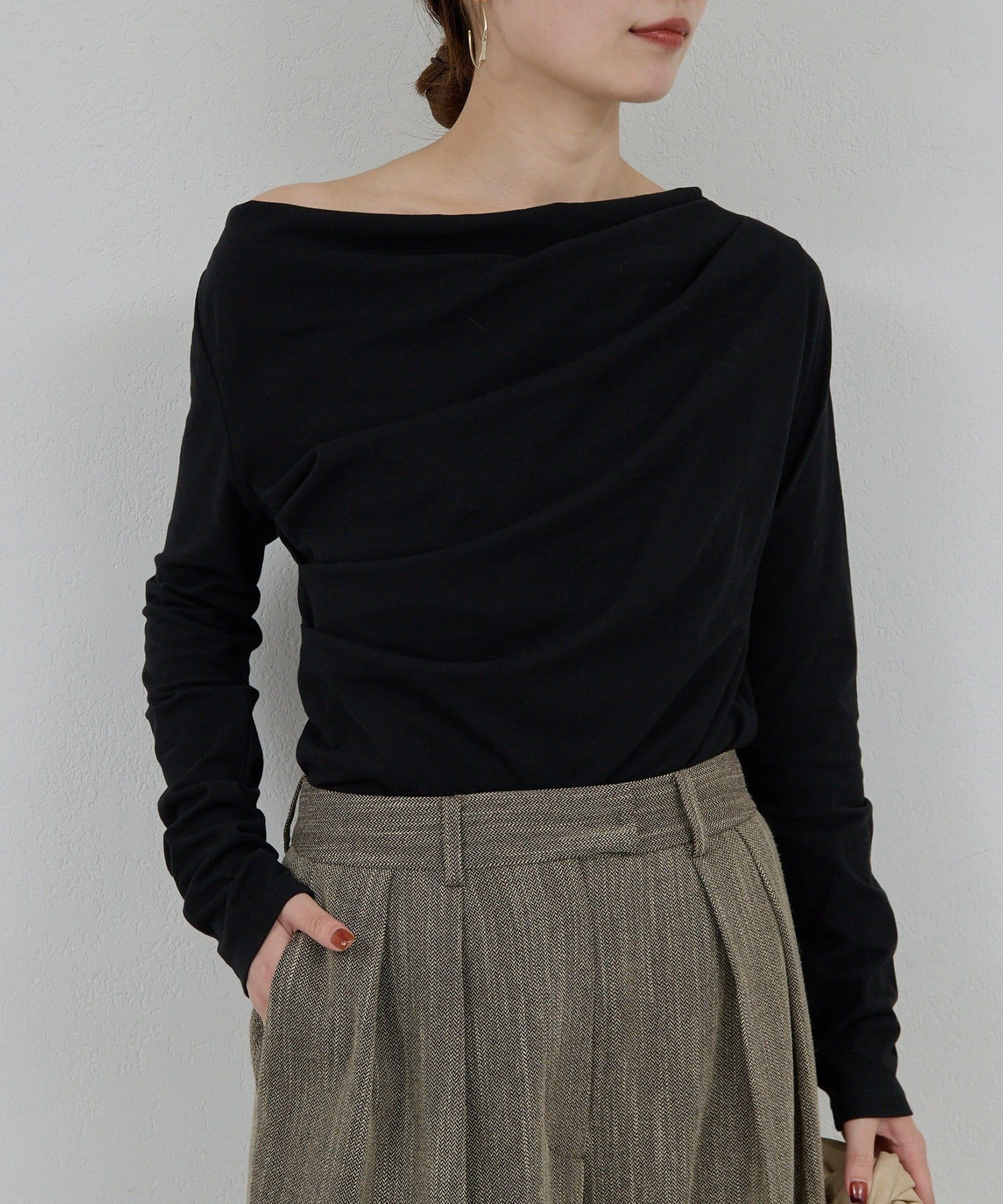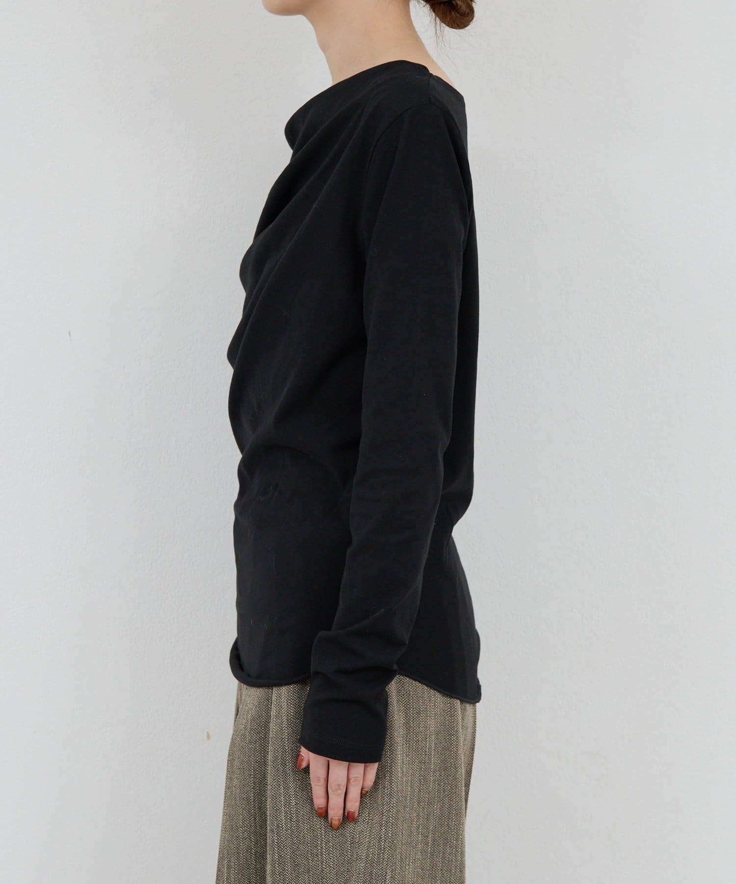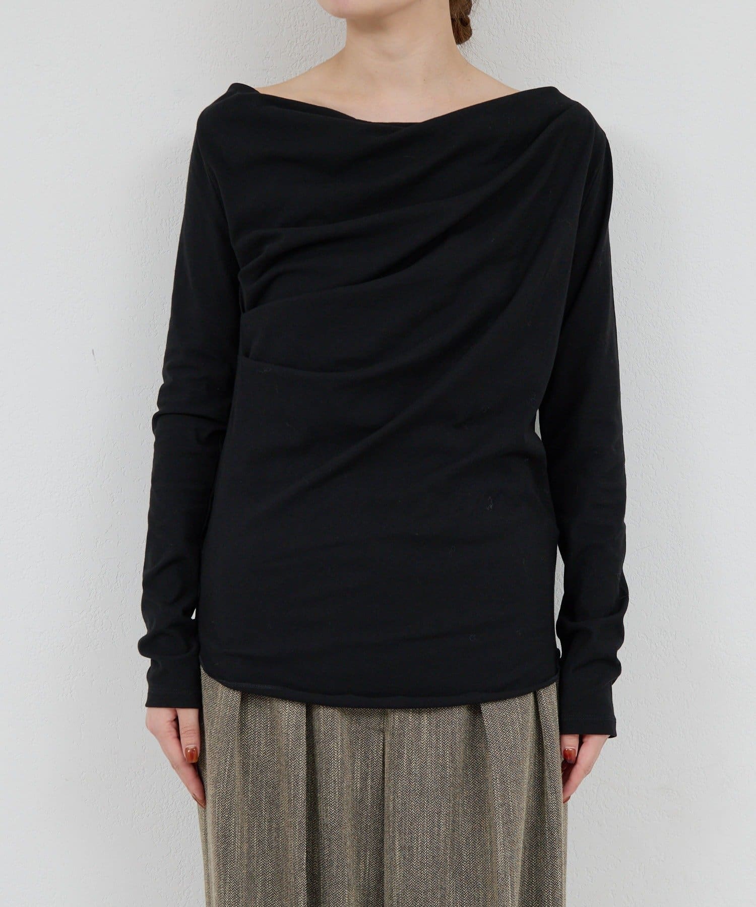 ●女性らしいドレープデザインが魅力のロングスリーブカットソー。