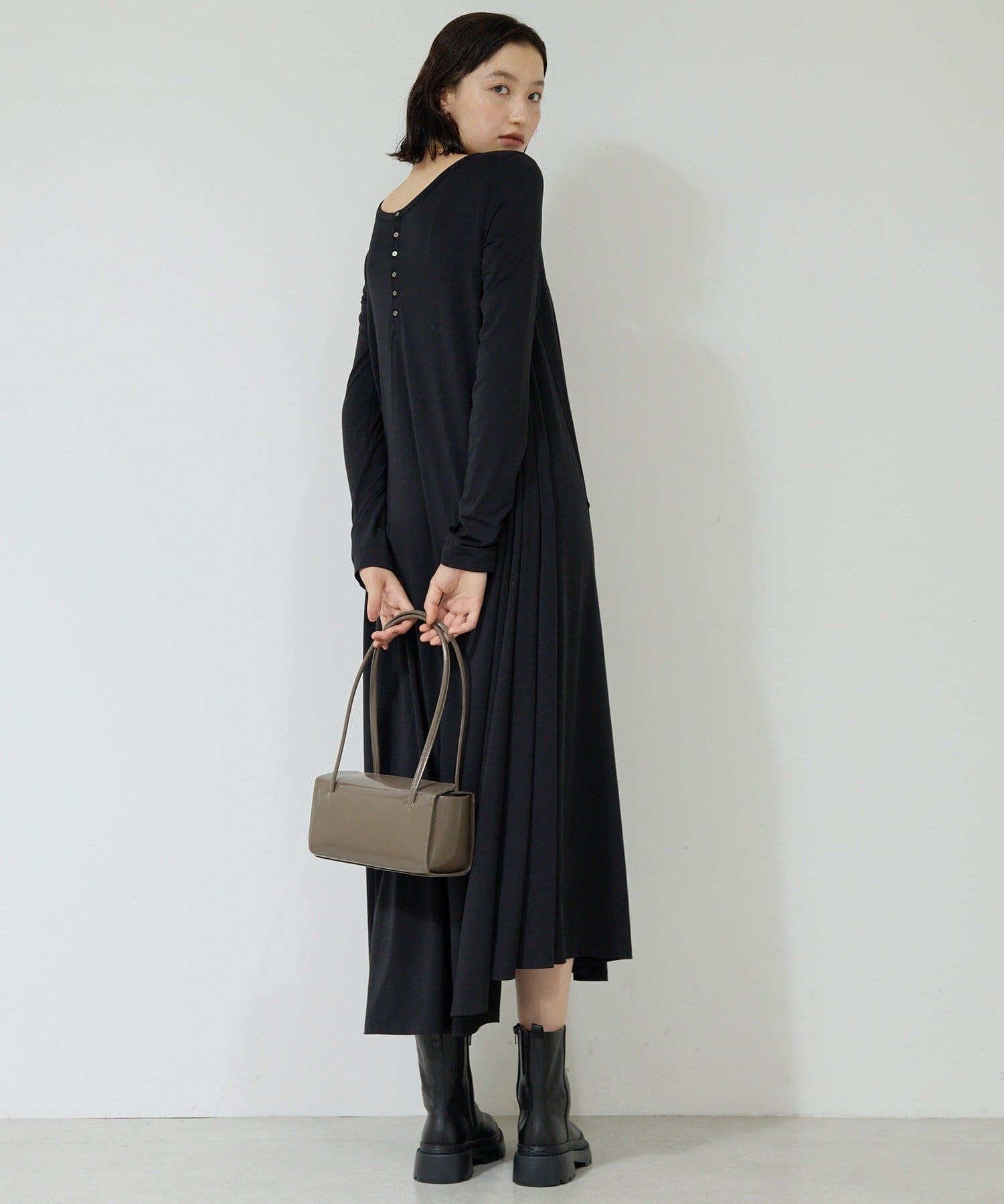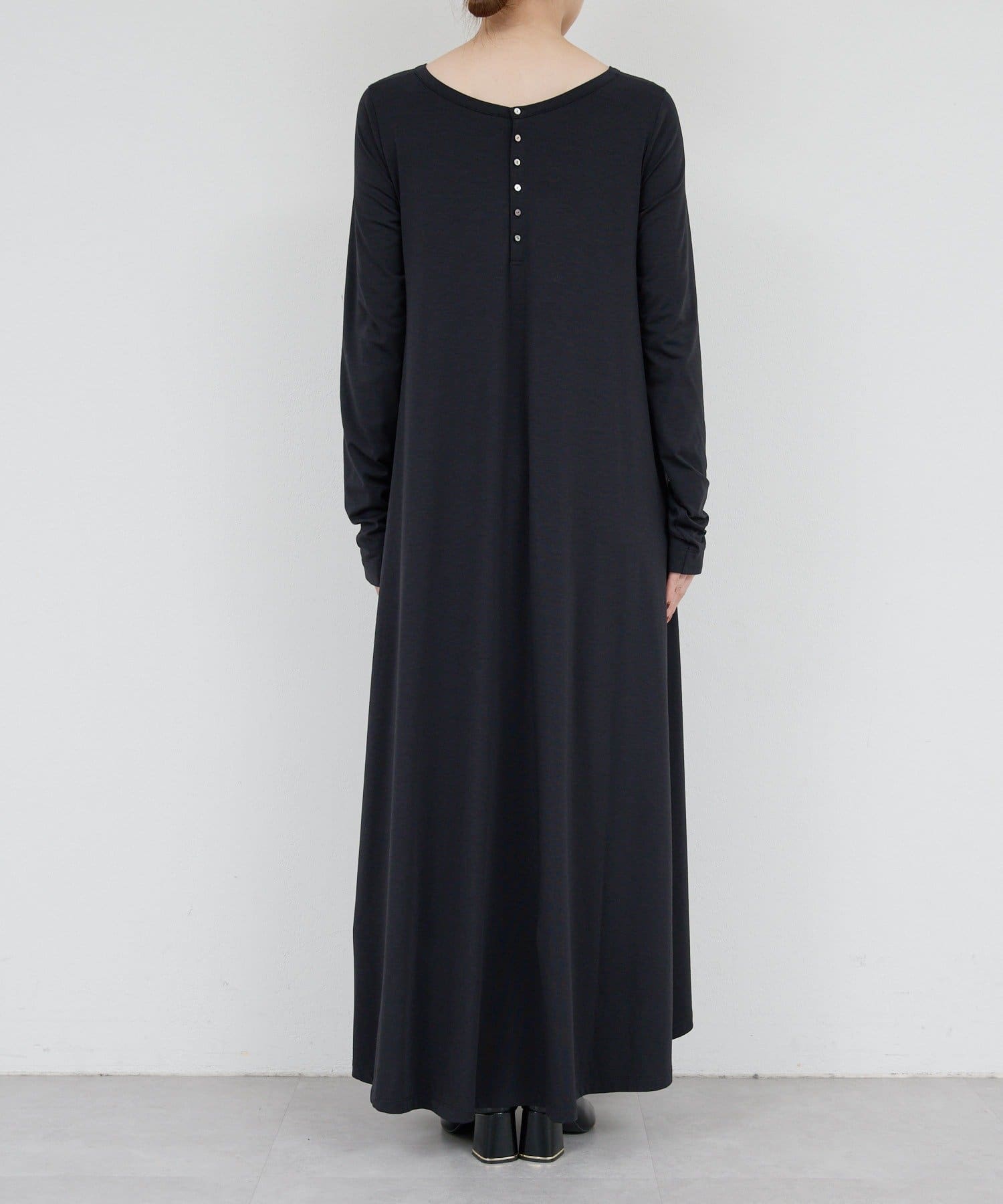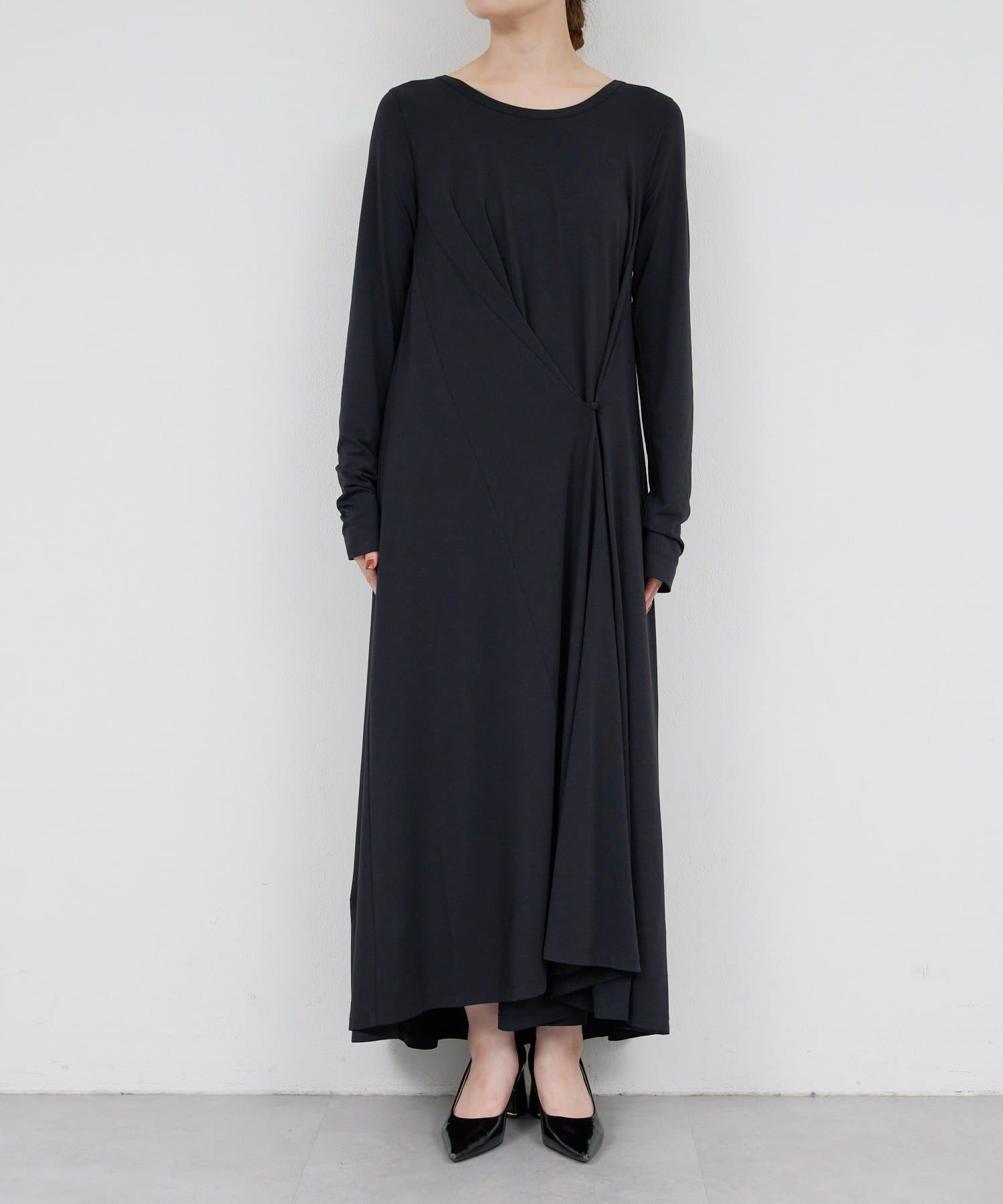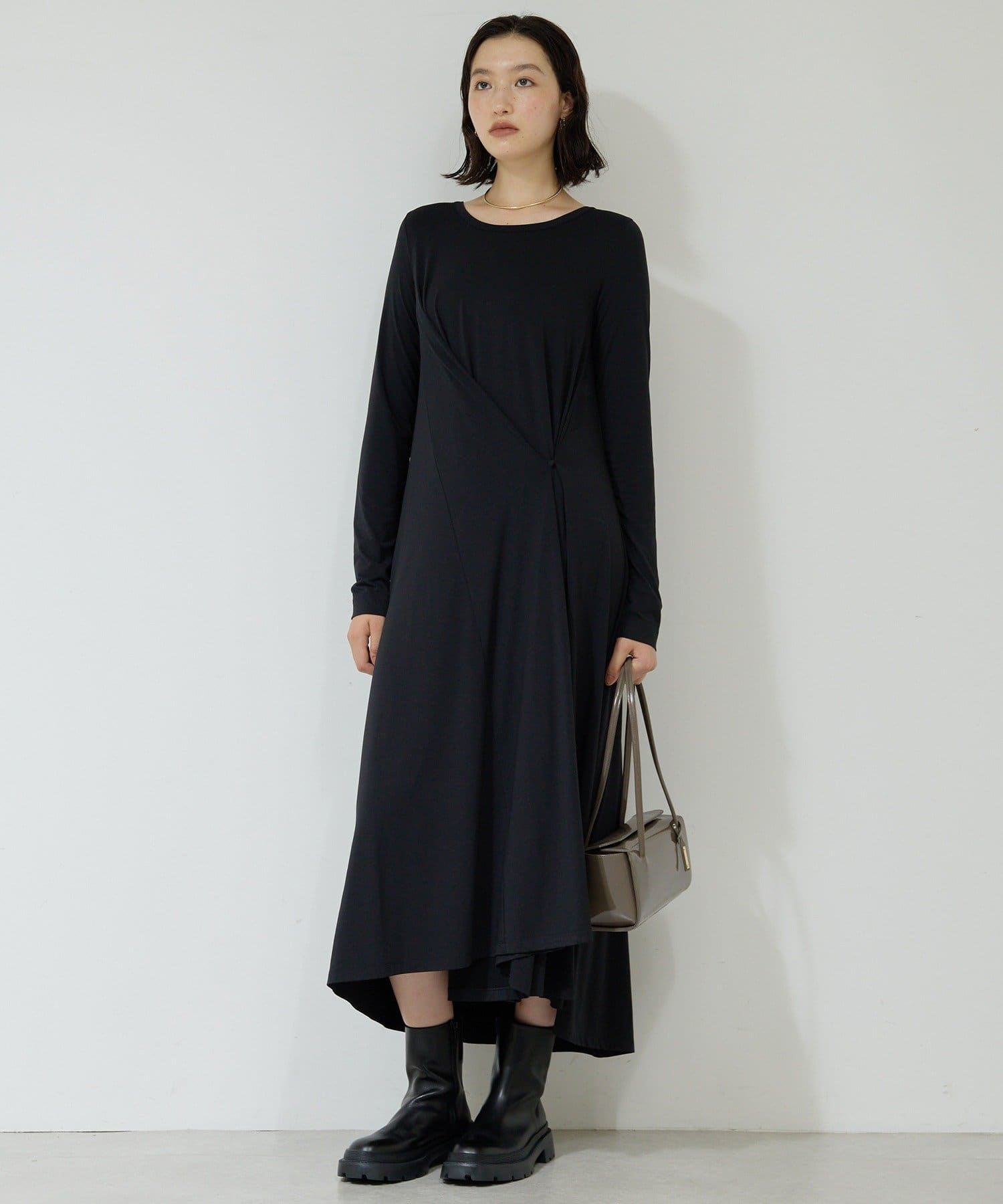 ●前後2wayとサイドボタンを留めてアシンメトリーなデザインにもと、シルエットが楽しめるワンピース。