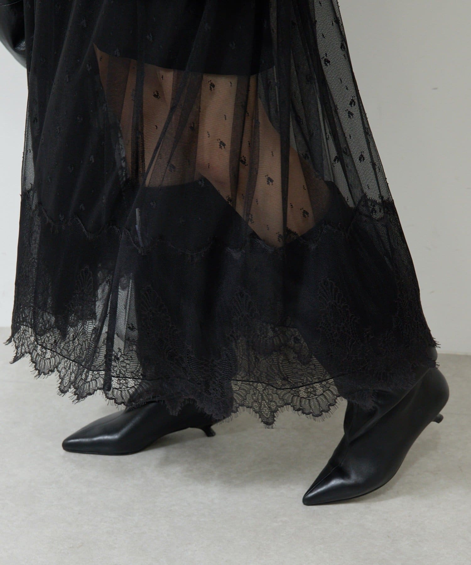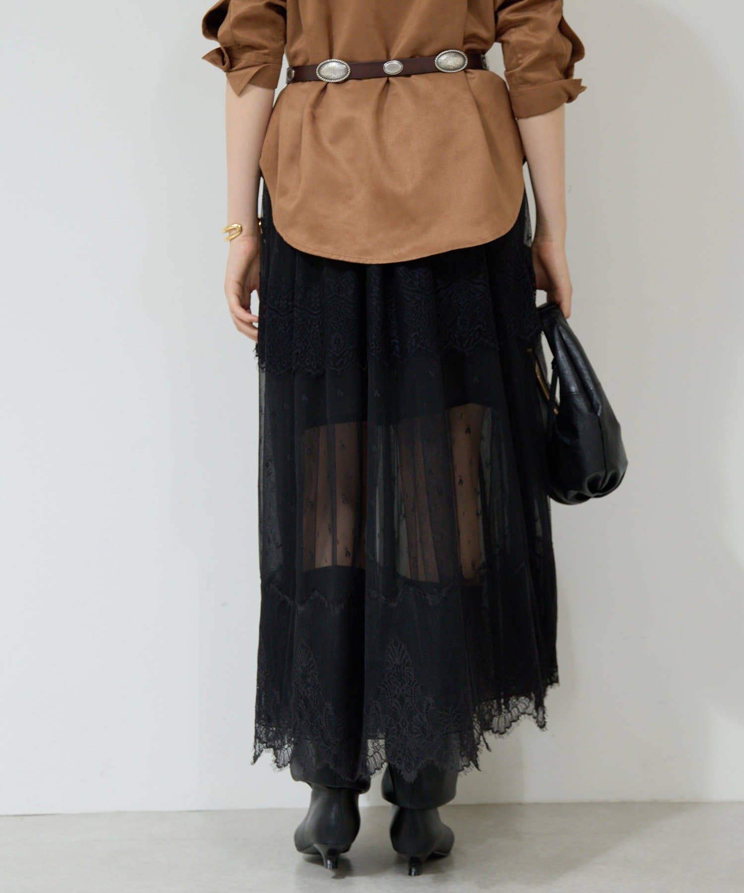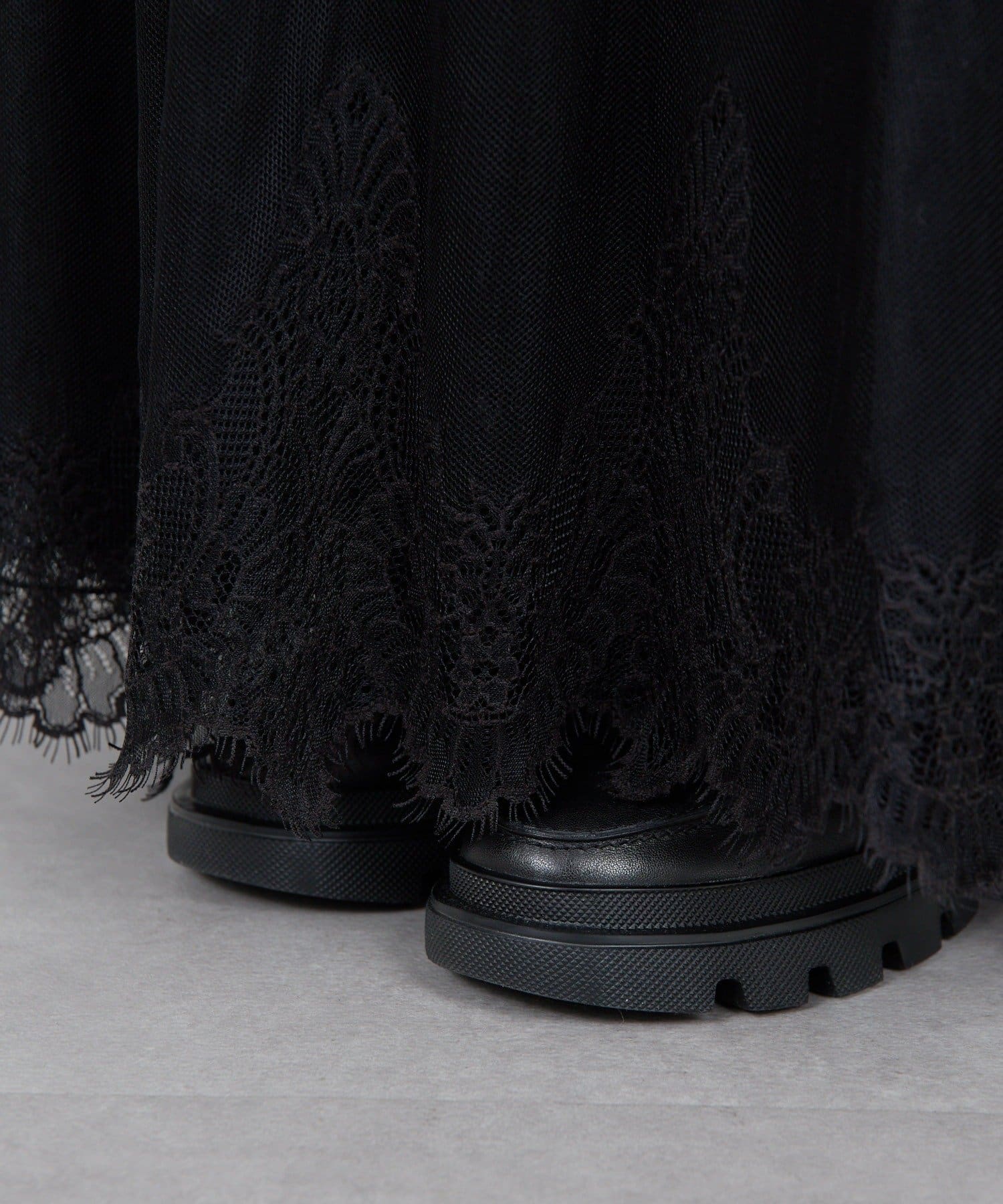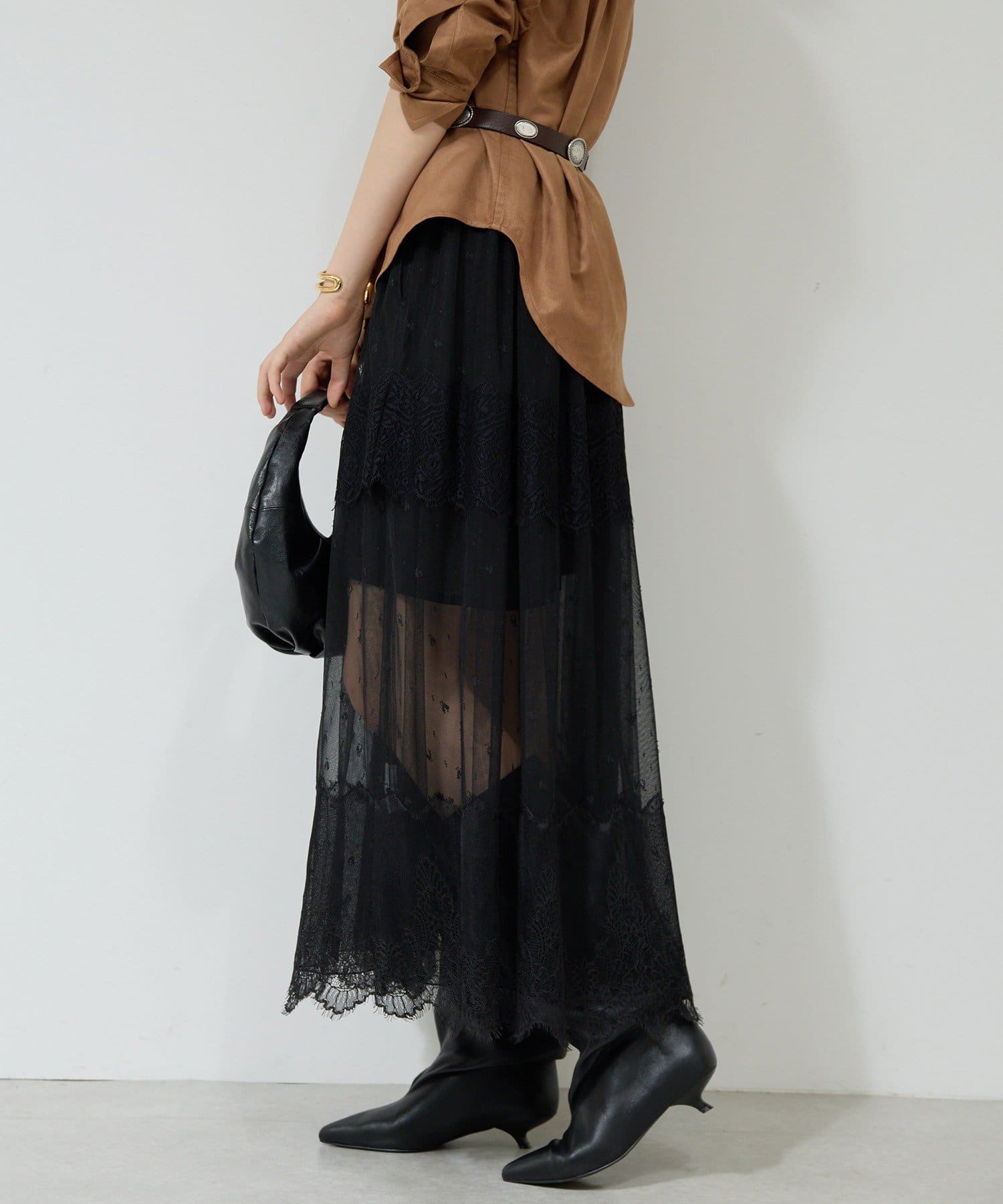 ●歩くたびにふわりとなびく柔らかなレースは、スタイリングを華やかな印象に。