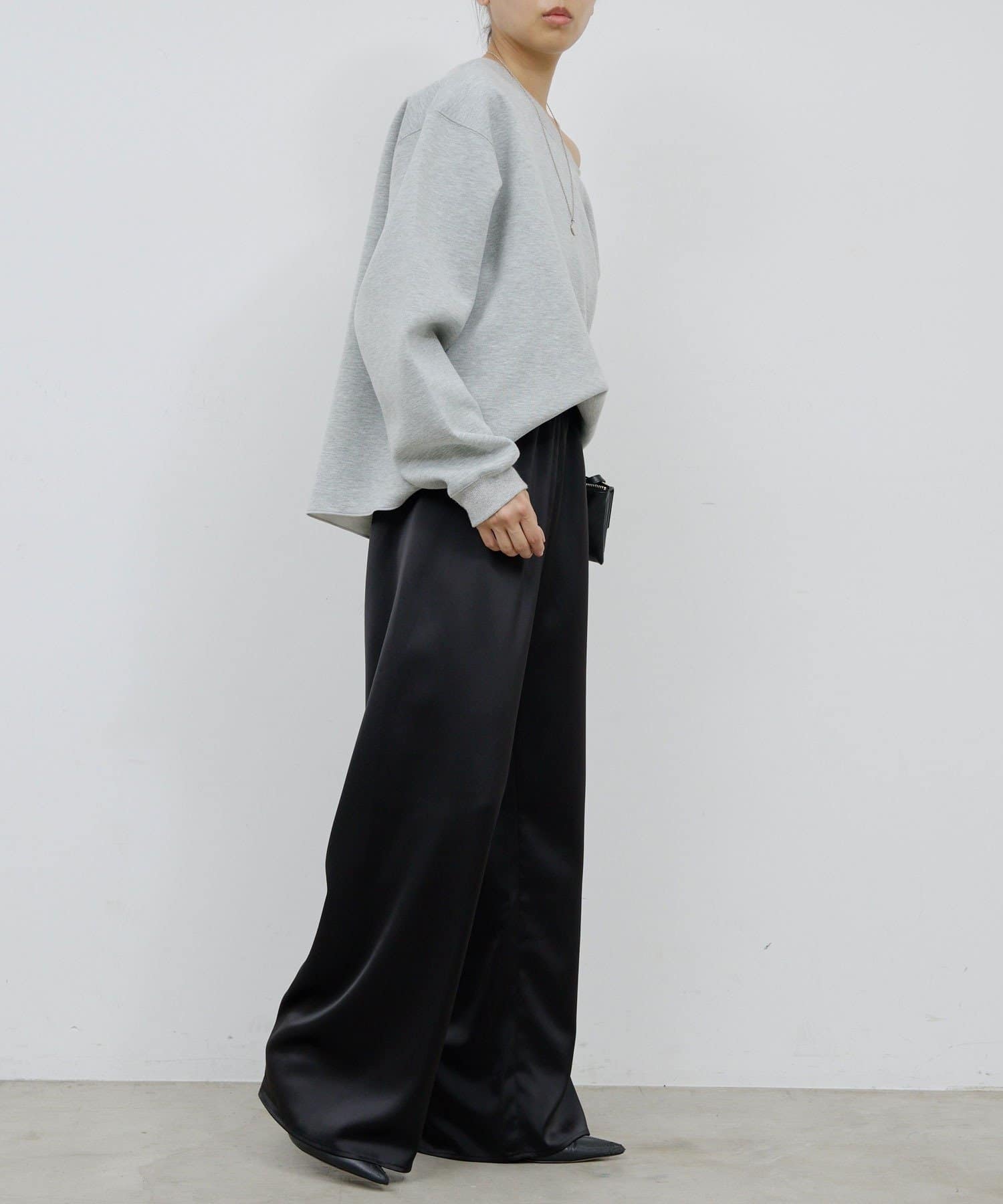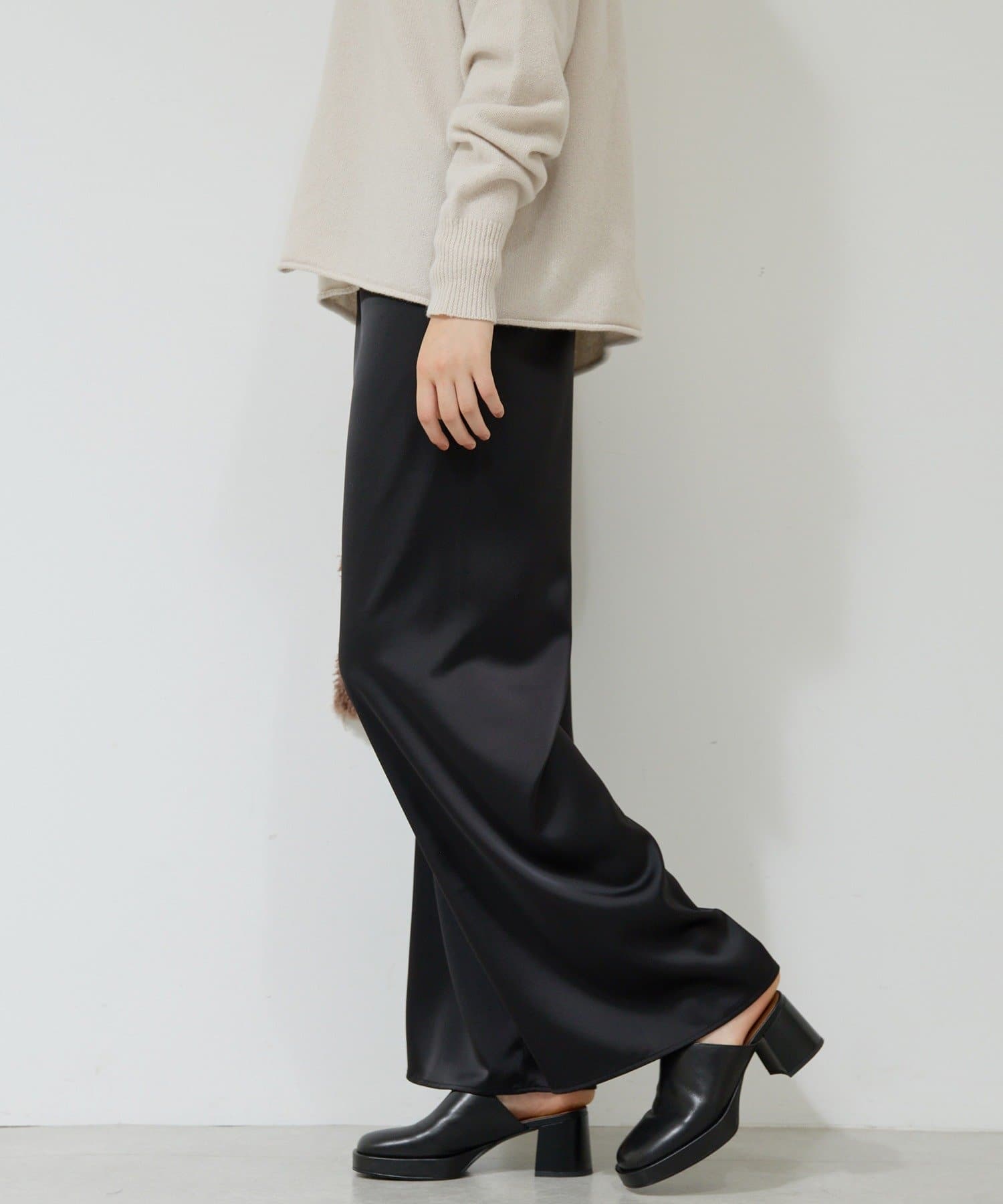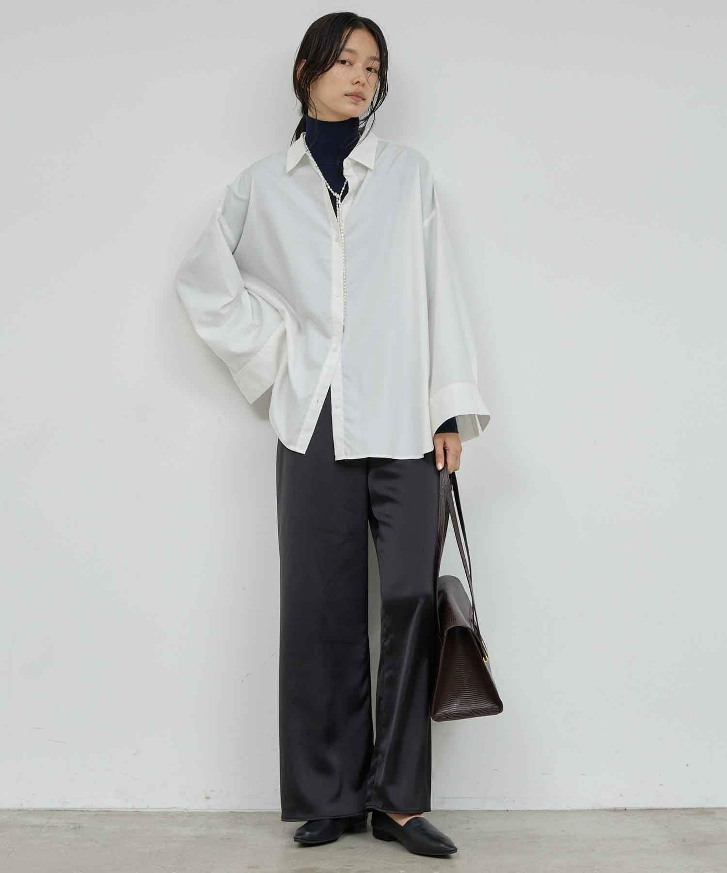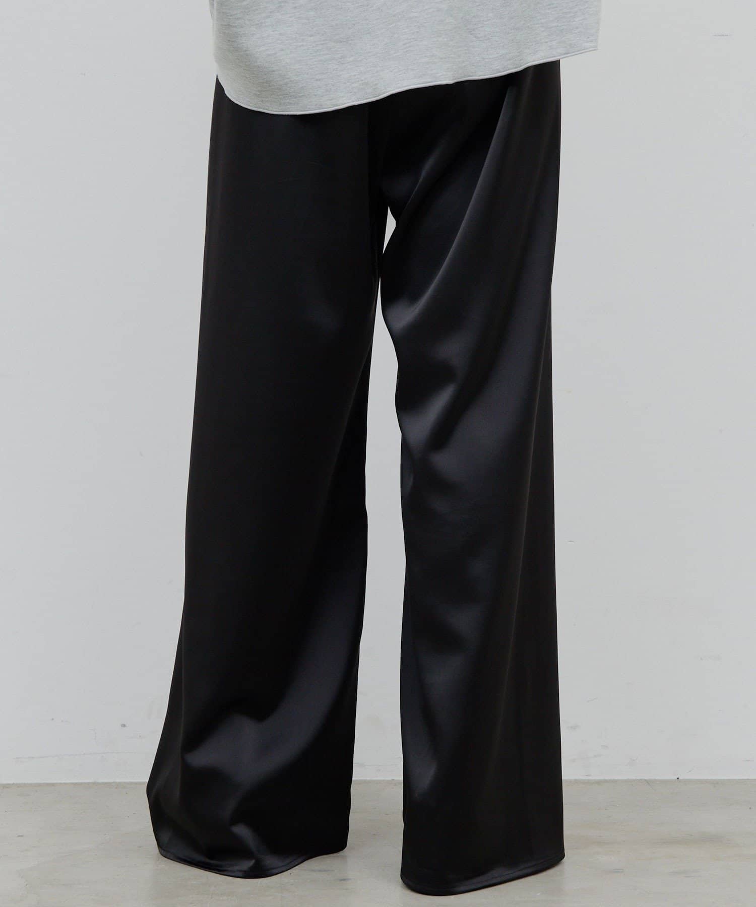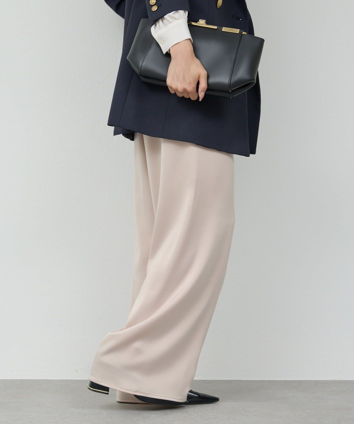 ●美脚パンツこと”ワイドドロストパンツ”と同型のサテンパンツ。