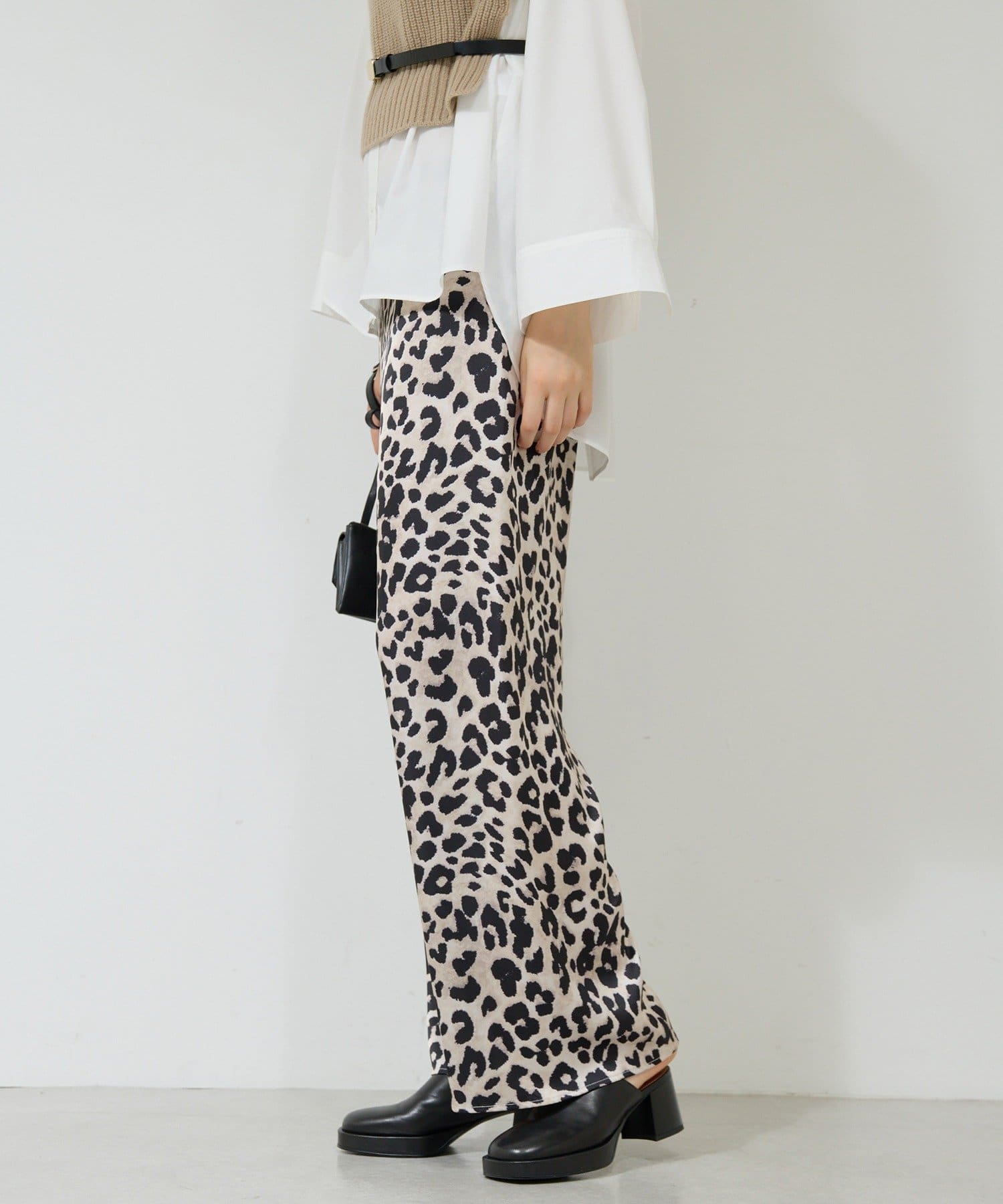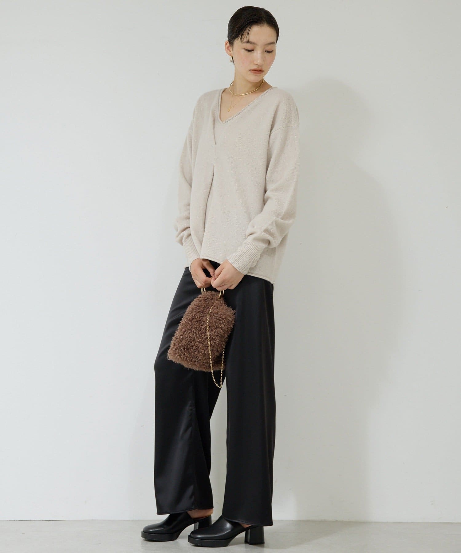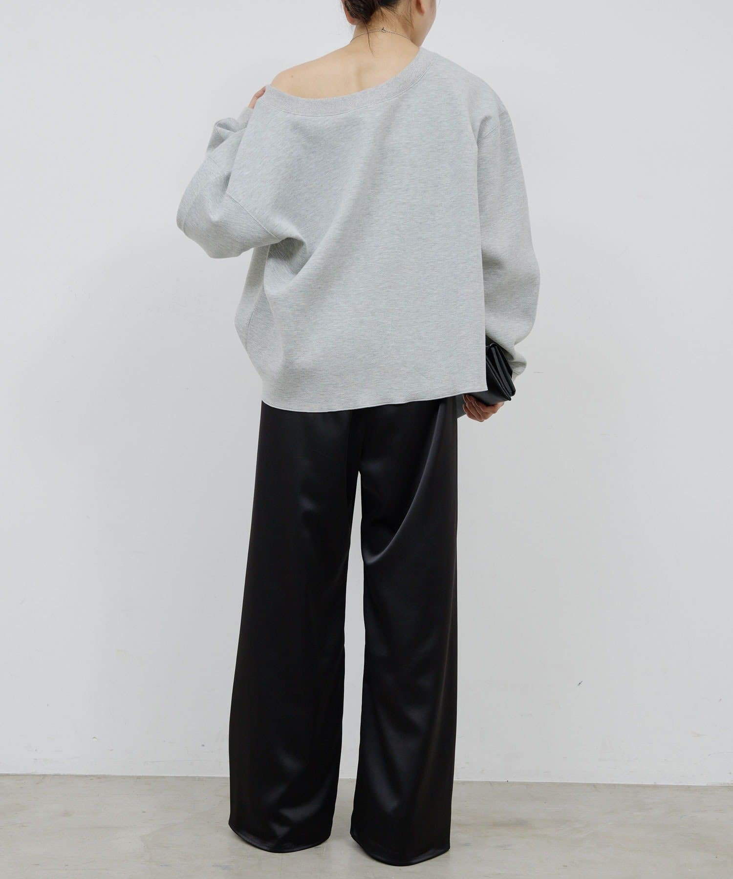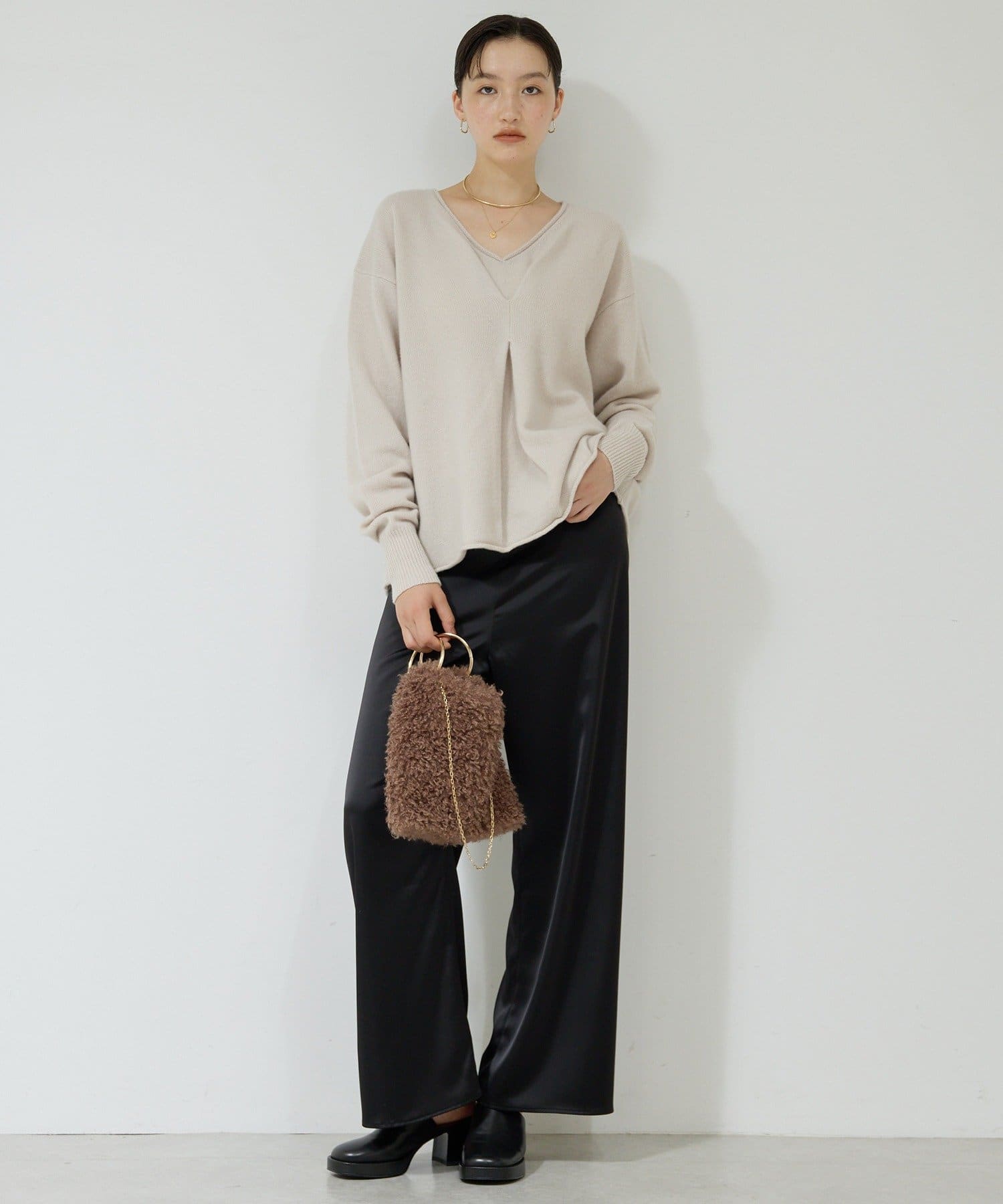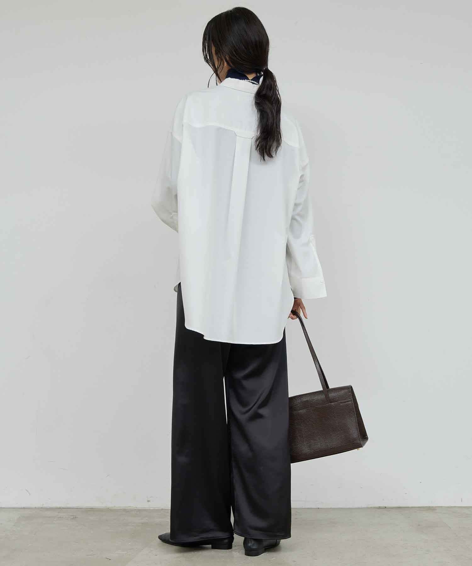 ●美脚パンツこと”ワイドドロストパンツ”と同型のサテンパンツ。