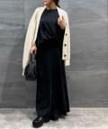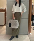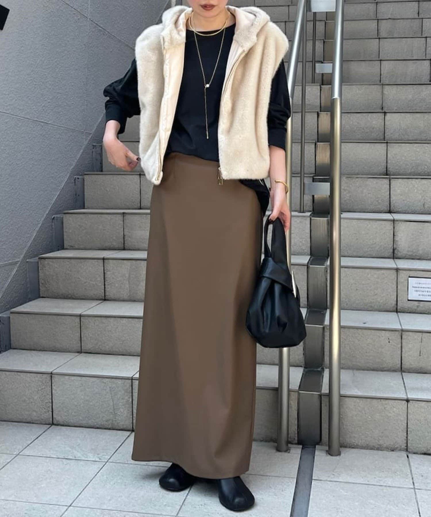 ●同素材のスカートと合わせたエレガントなスタイルもおすすめ。