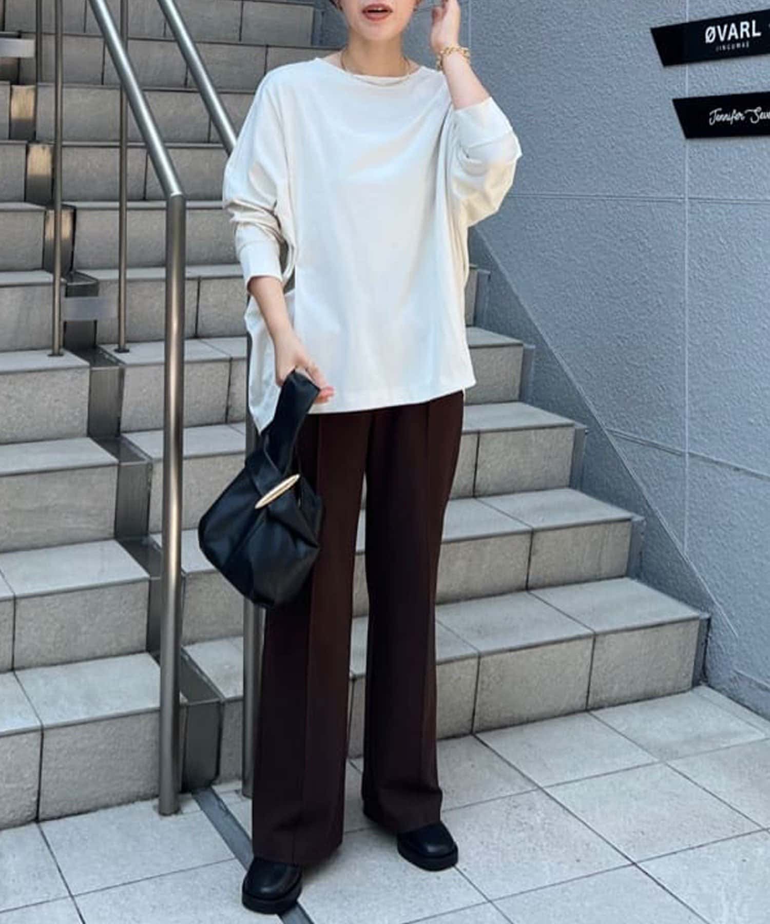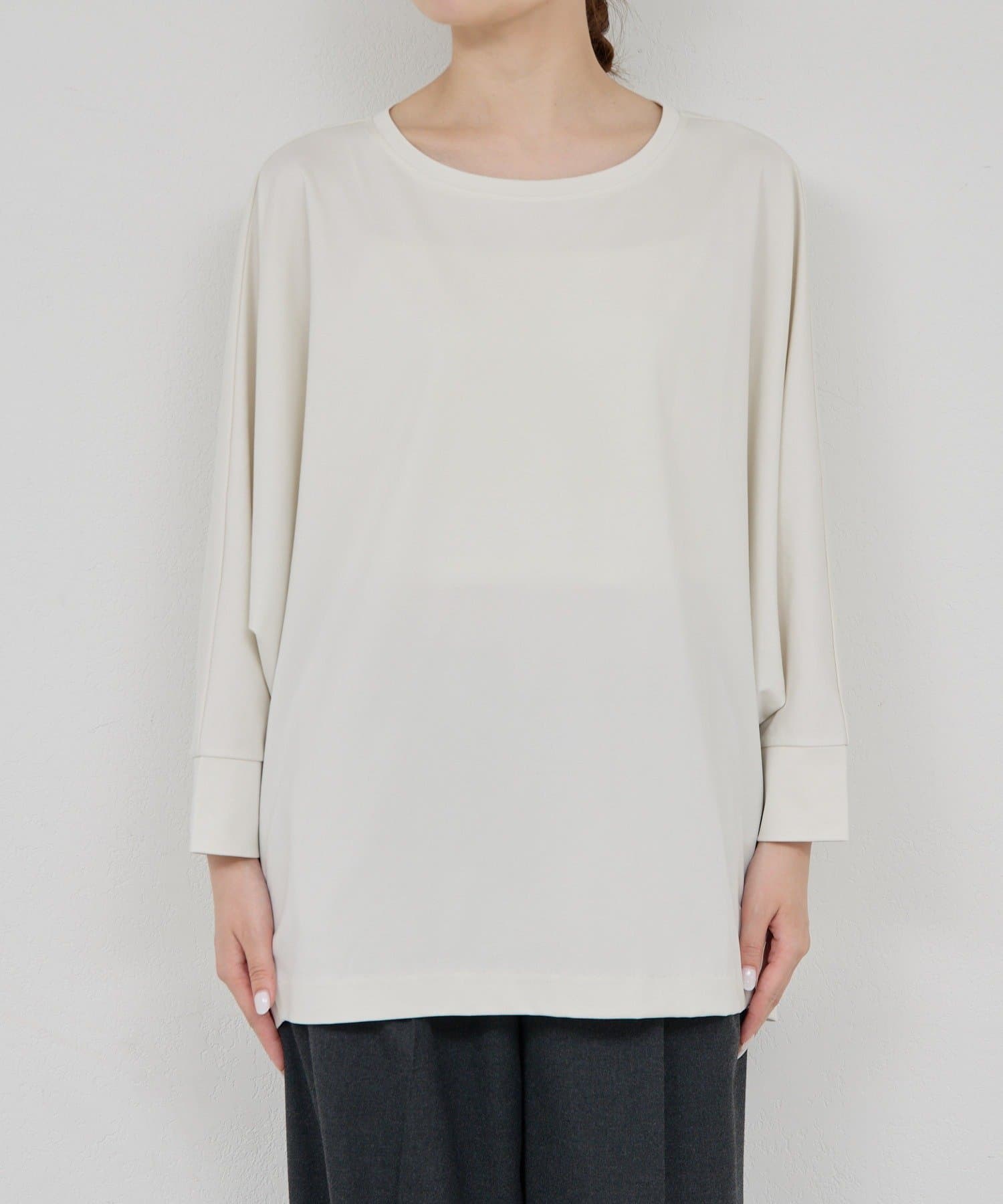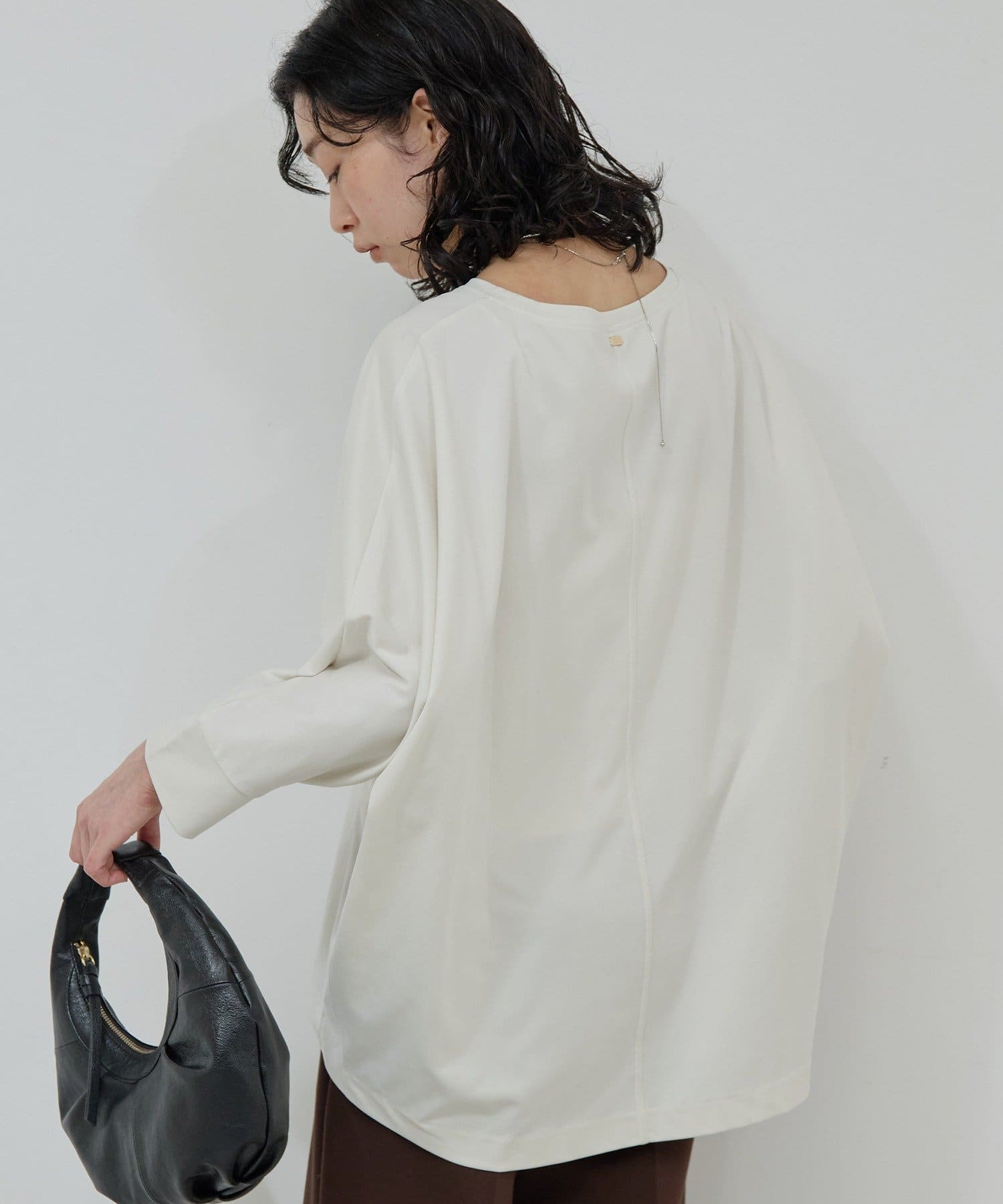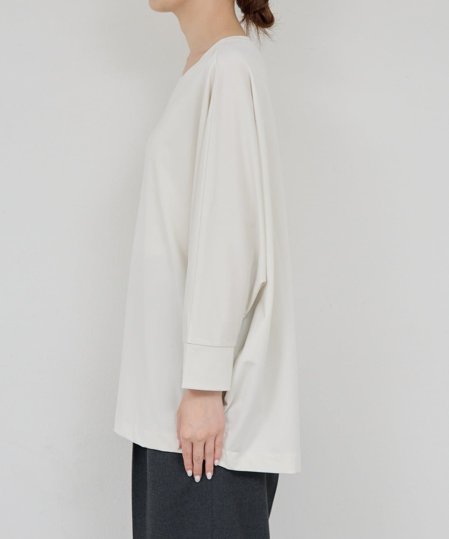 ●落ち感のある素材感で、ゆったりシルエットながらもすっきりとした印象に。