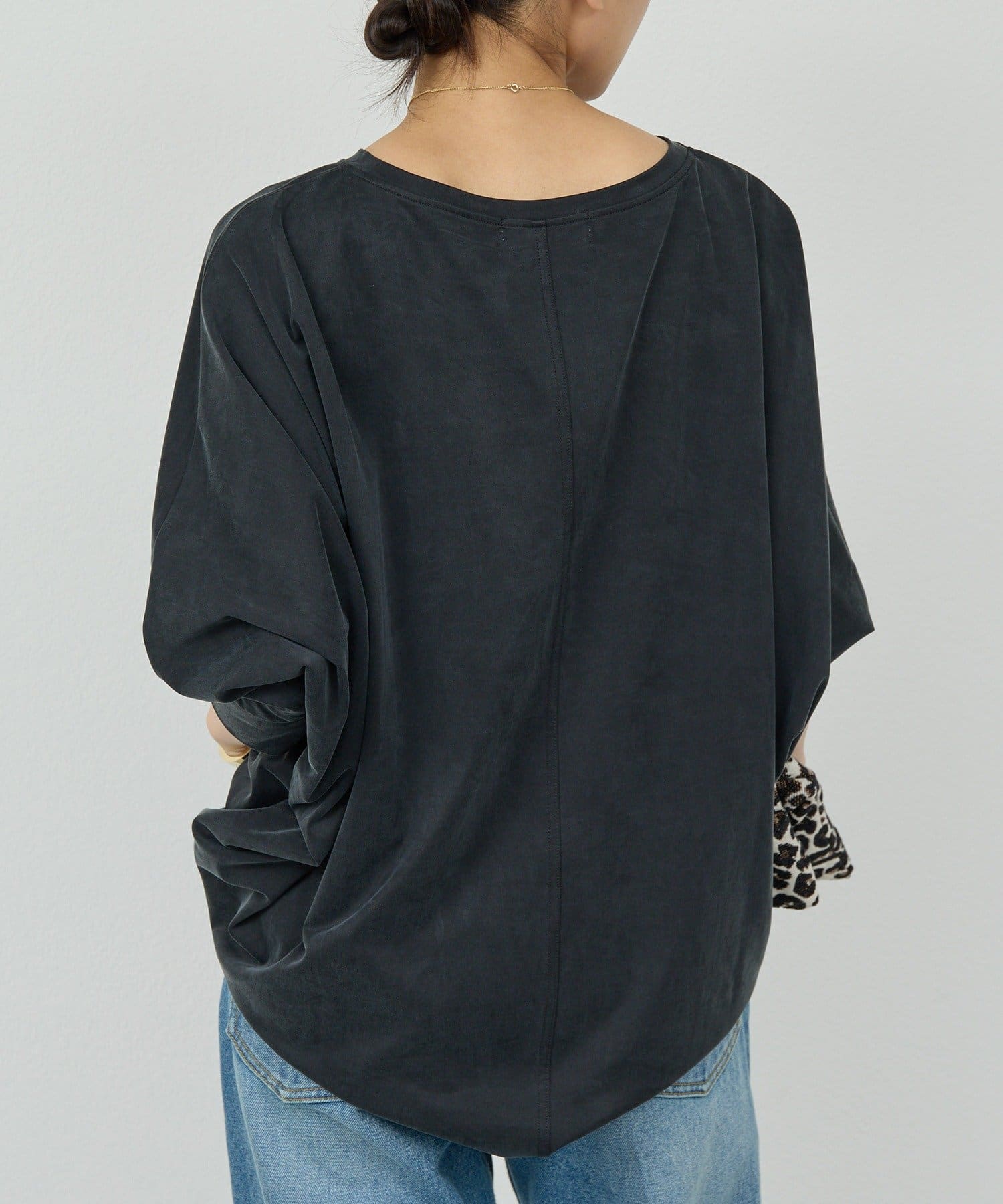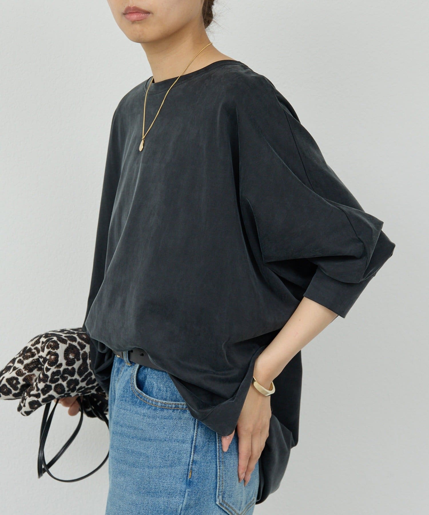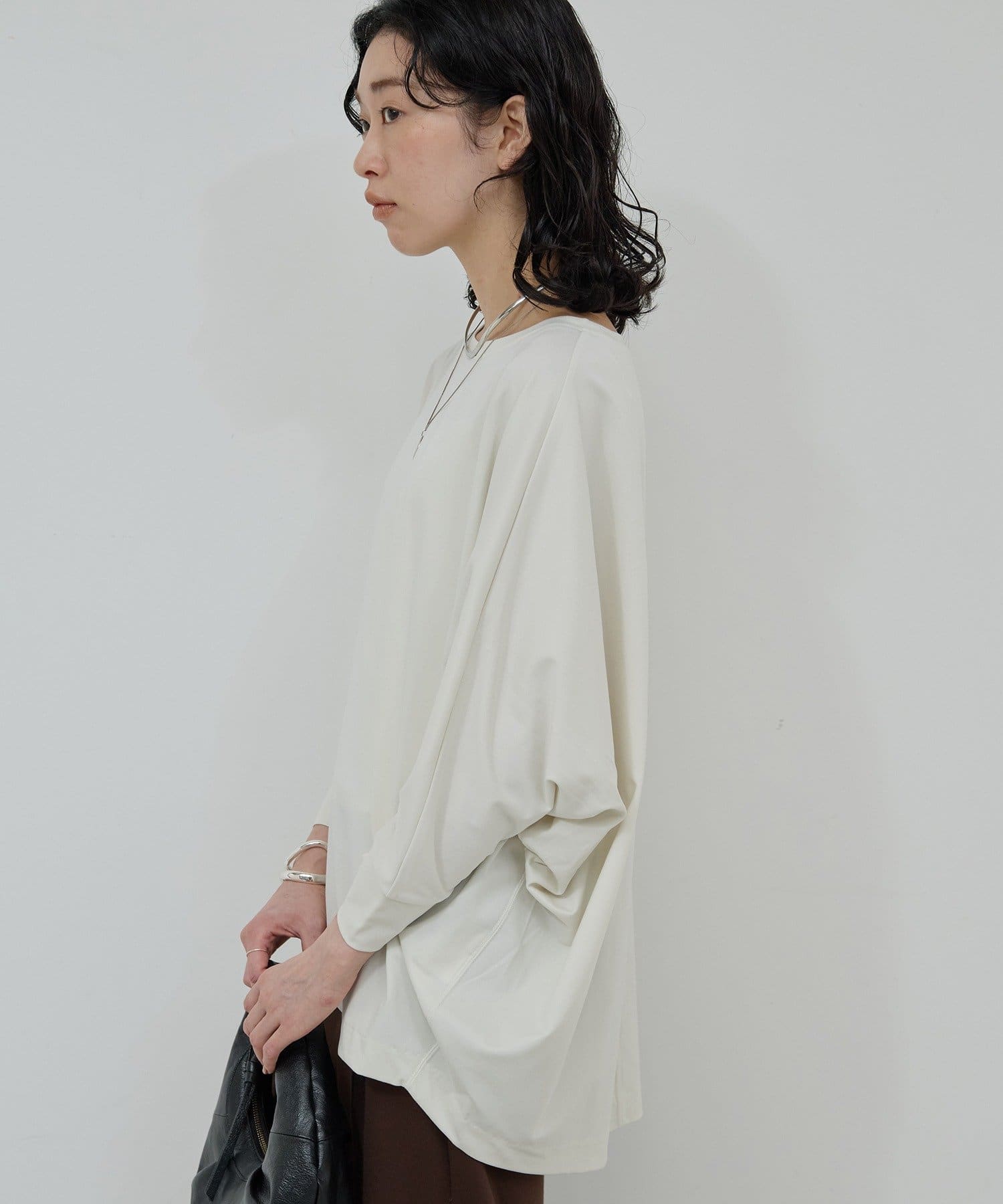 ●ドルマンスリーブとヒップまである着丈が気になる部分を自然とカバー。