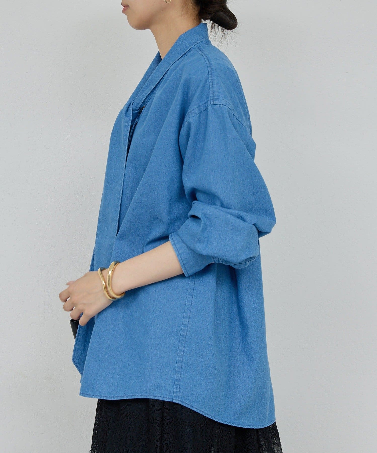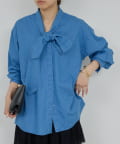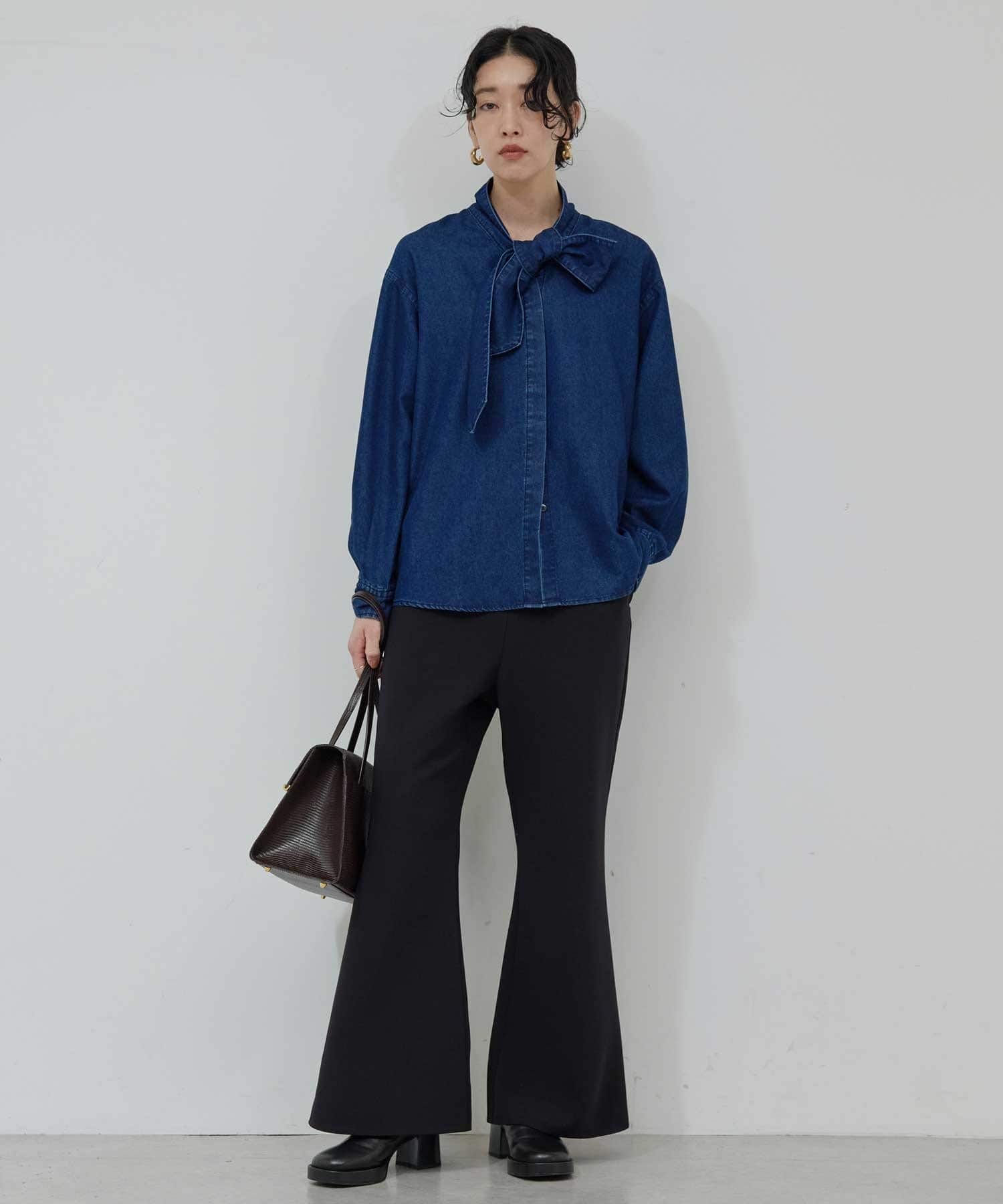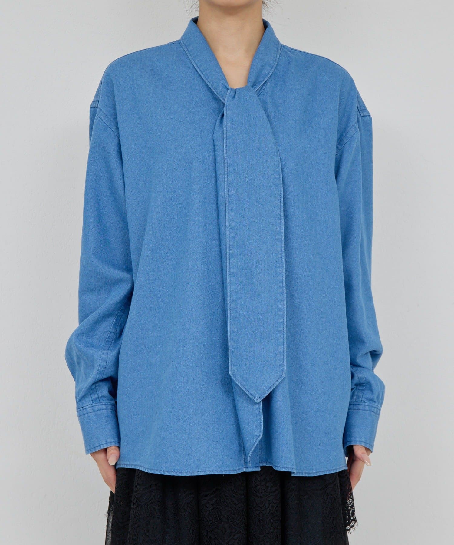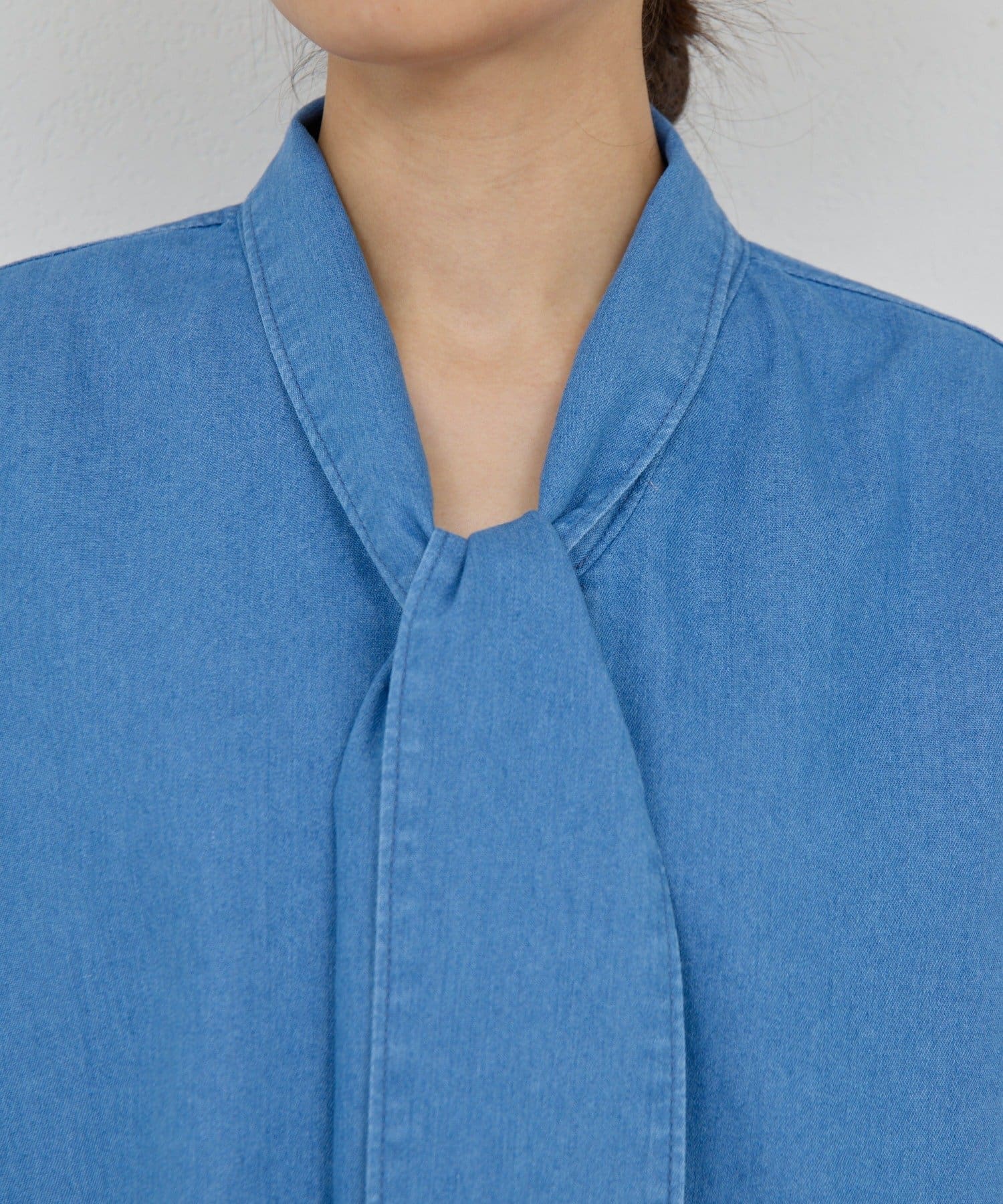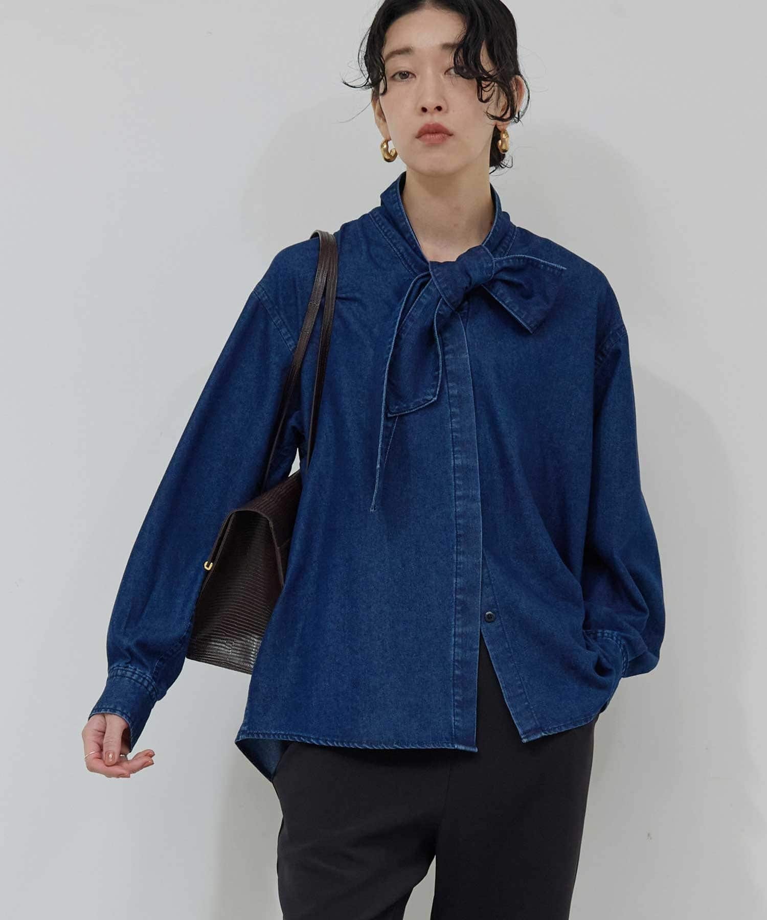 ●カジュアル過ぎず上品見えするデニム素材のボウタイブラウス。
