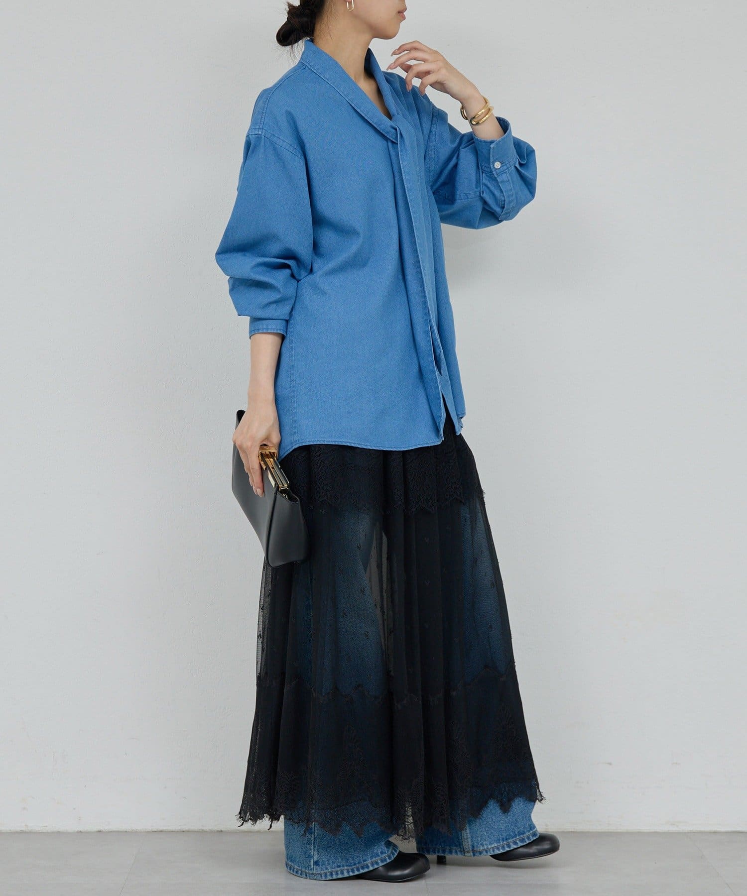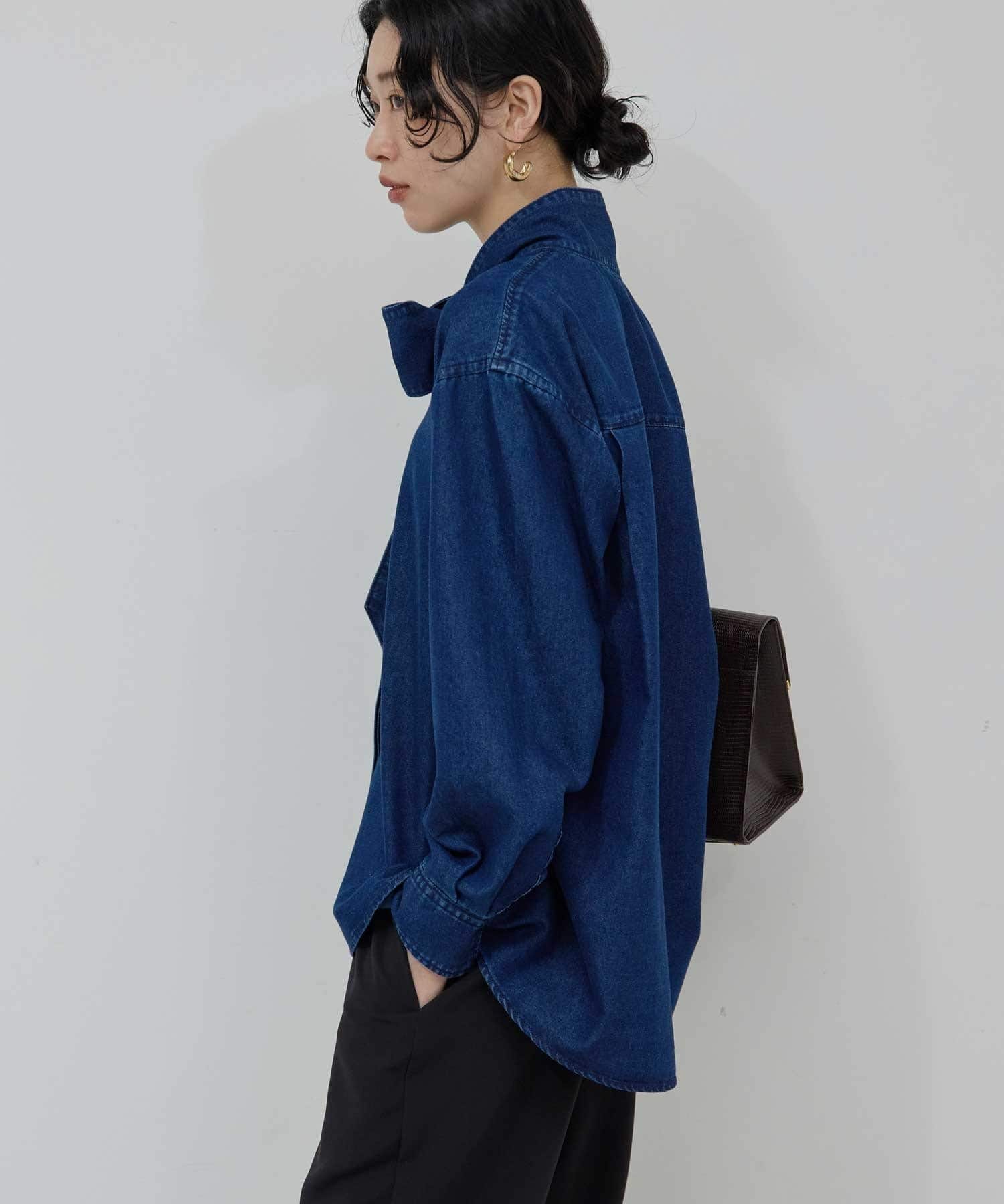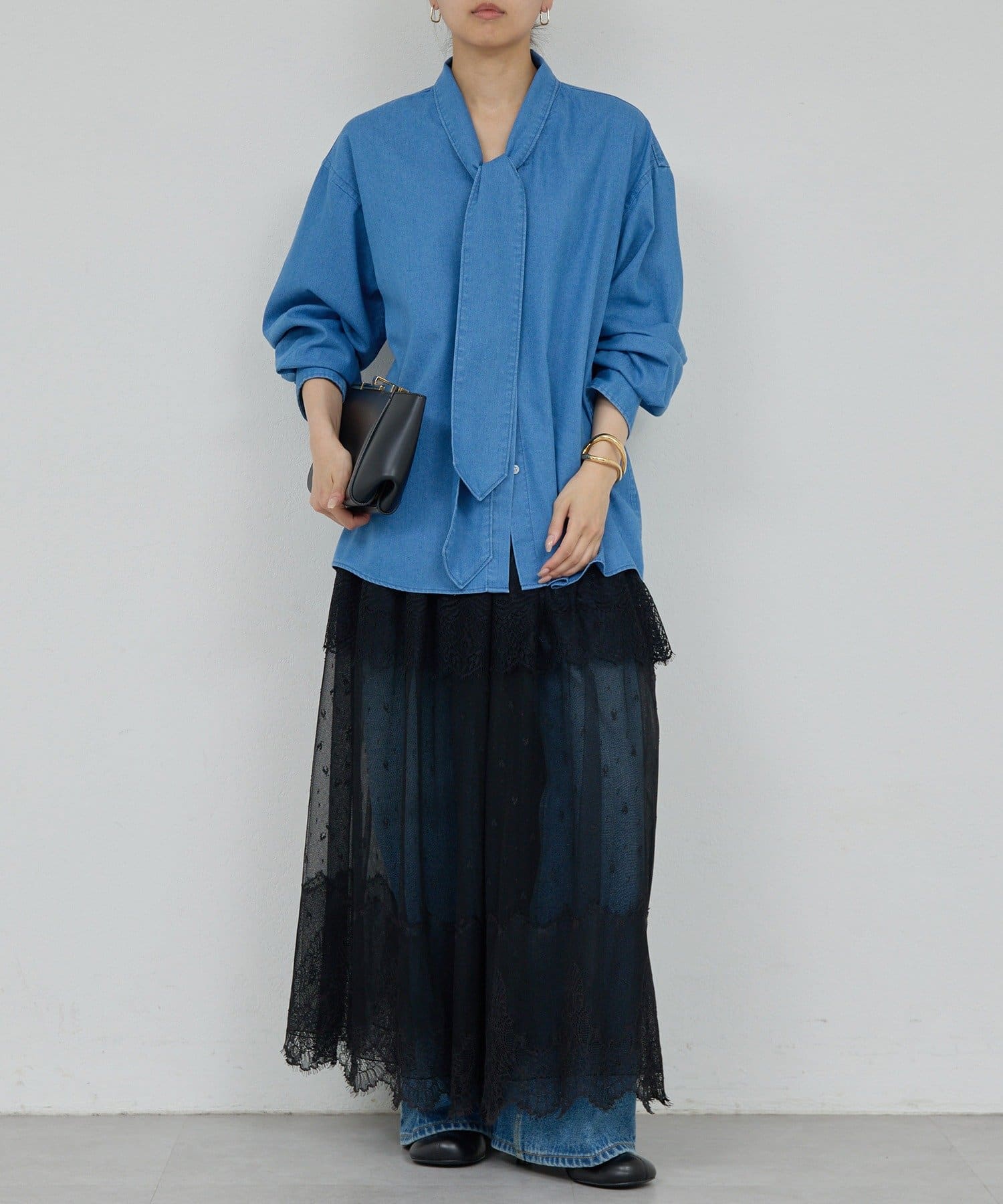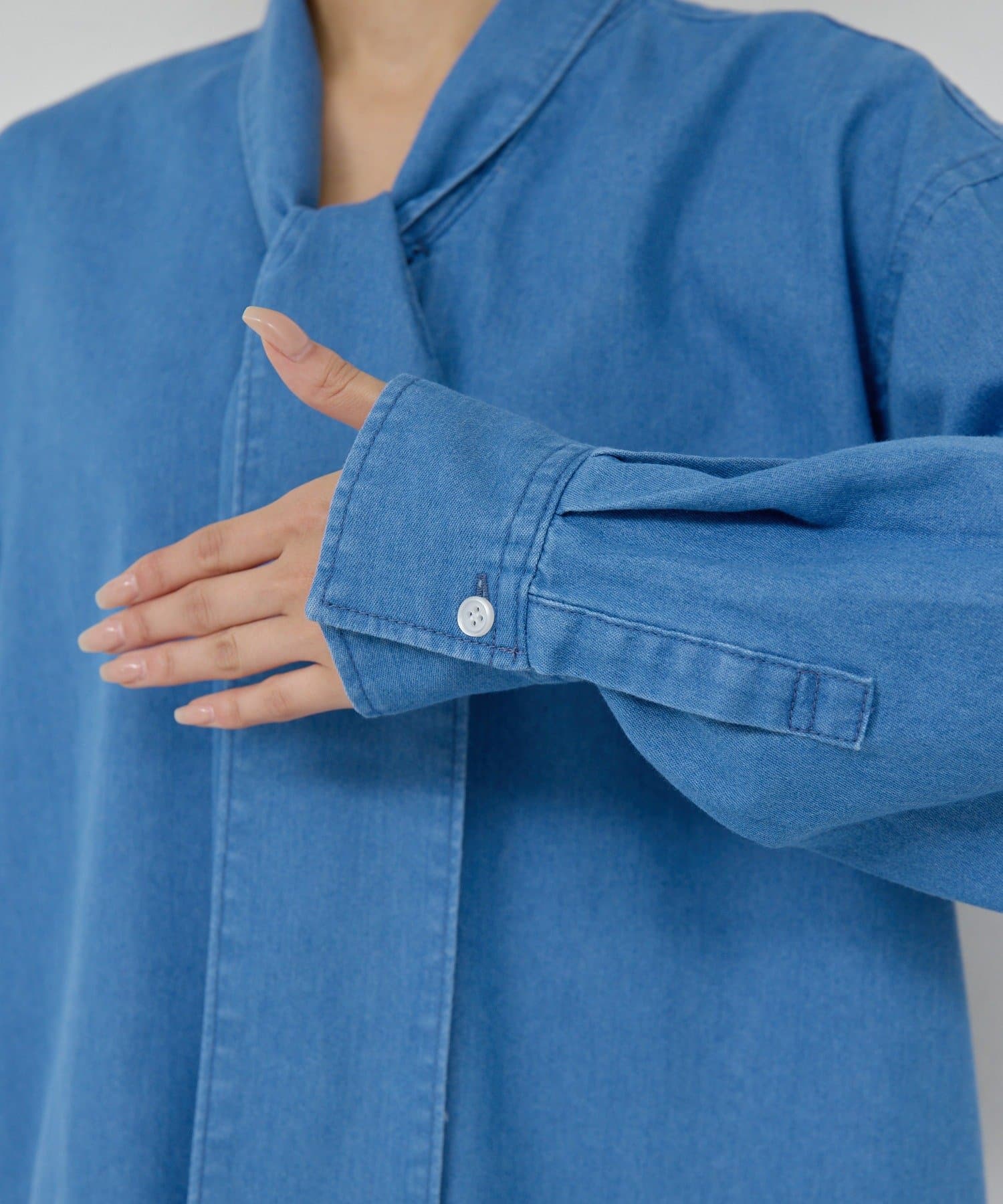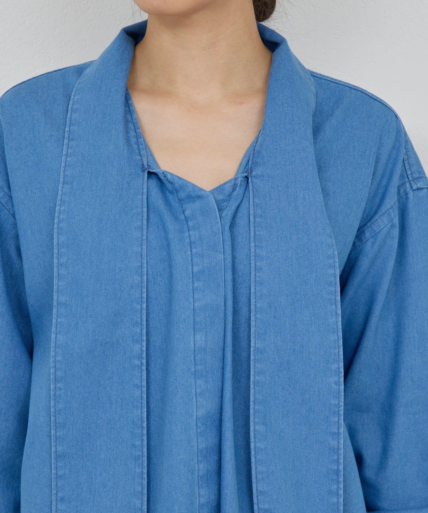 ●カジュアル過ぎず上品見えするデニム素材のボウタイブラウス。